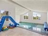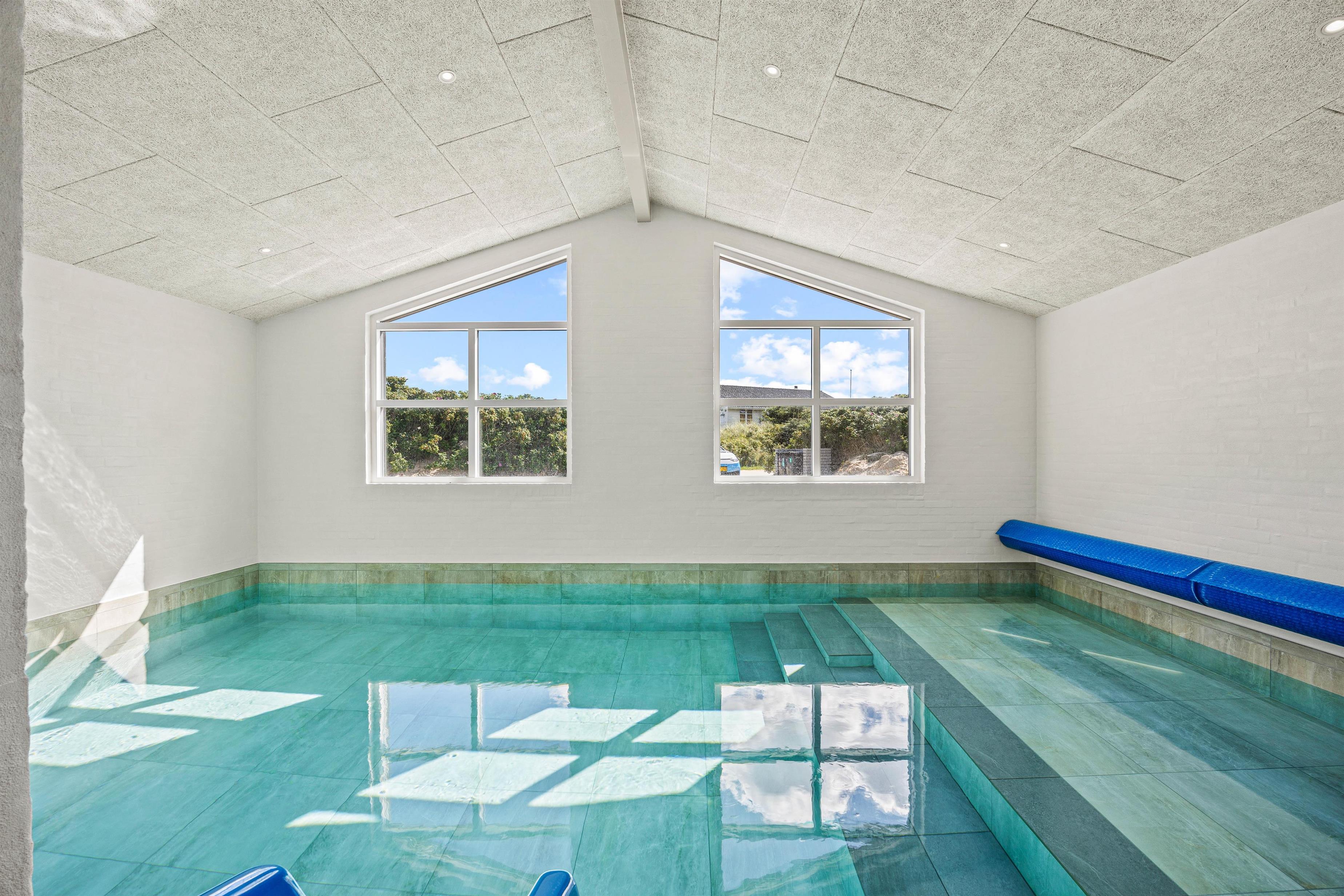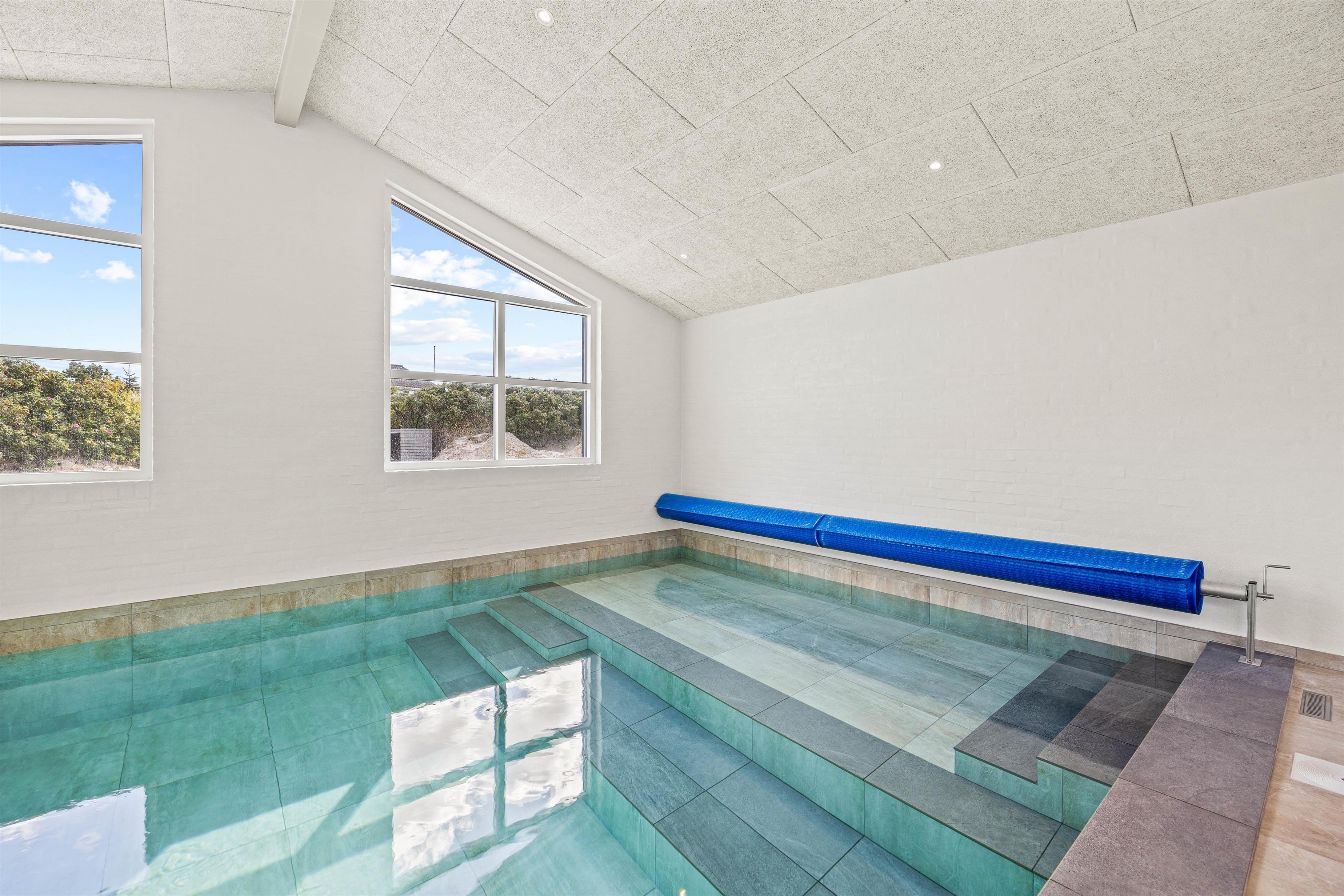 Om I ønsker at tilbringe dagen med afslapning eller aktivitet, kan I her finde det perfekte afsæt. Sommerhusets højdepunkt er den 27m2 store pool med svømmetræner, som inviterer både børn og voksne til en forfriskende dukkert. Efter en dag med svømning kan I slappe af i saunaen eller nyde en stund i den udendørs spa. En udebruser er også tilgængelig*.