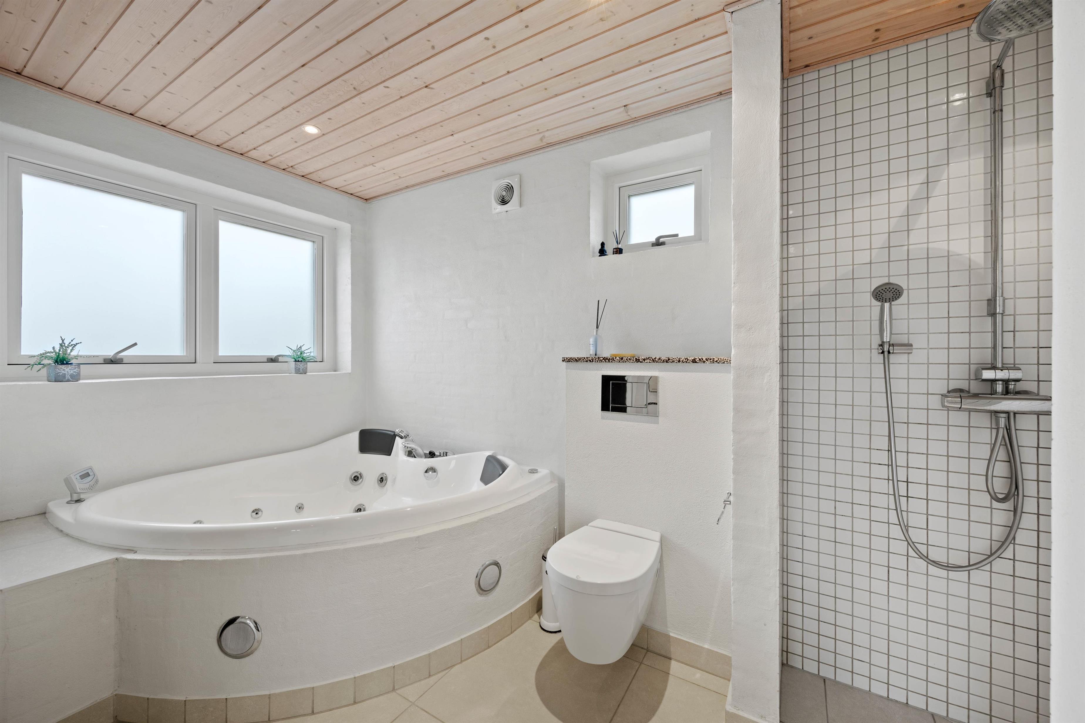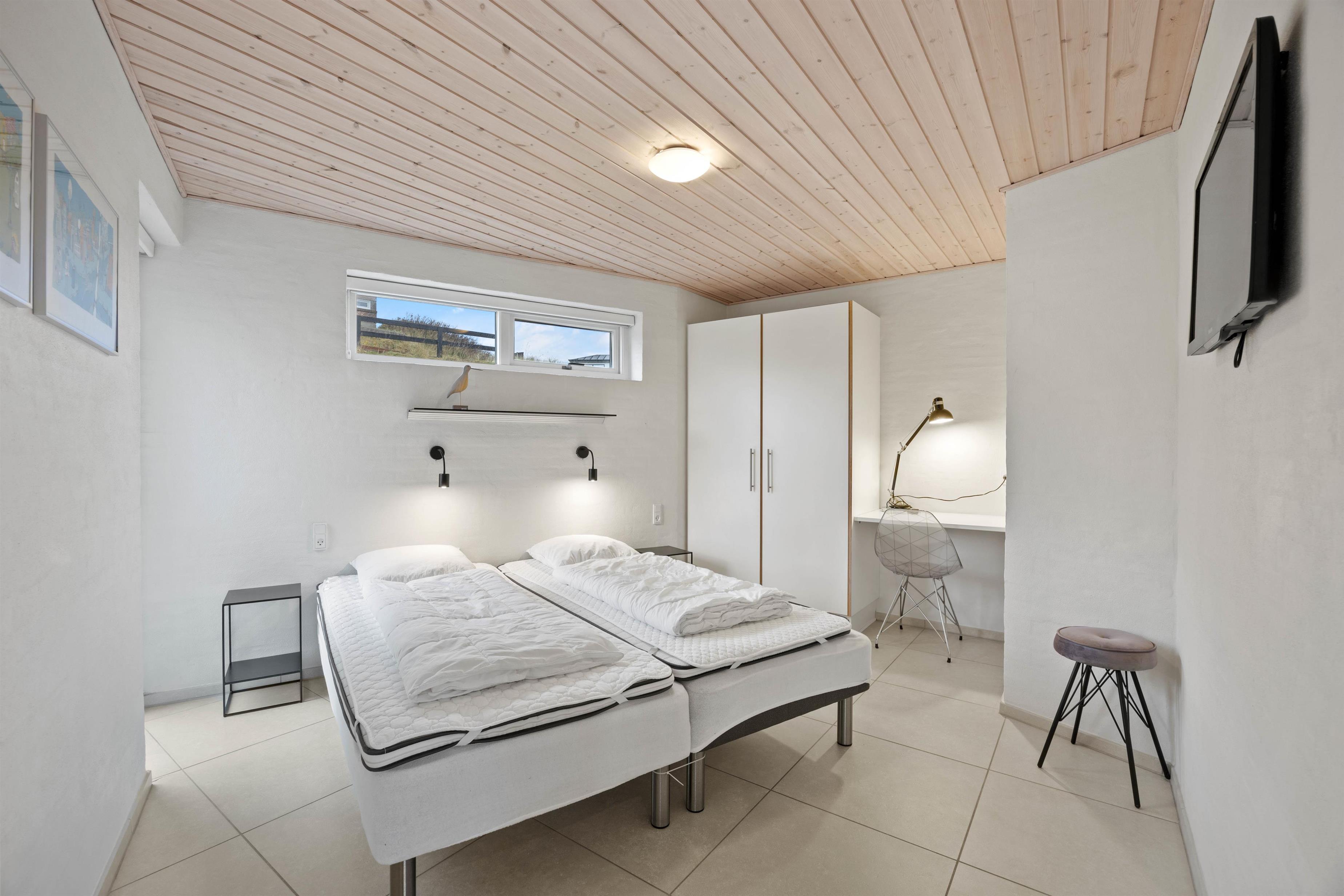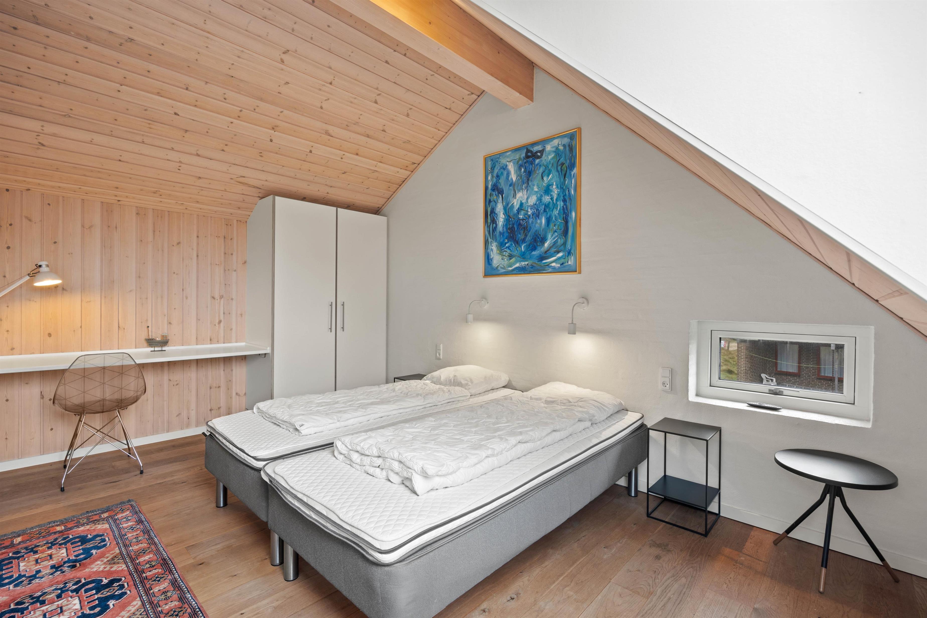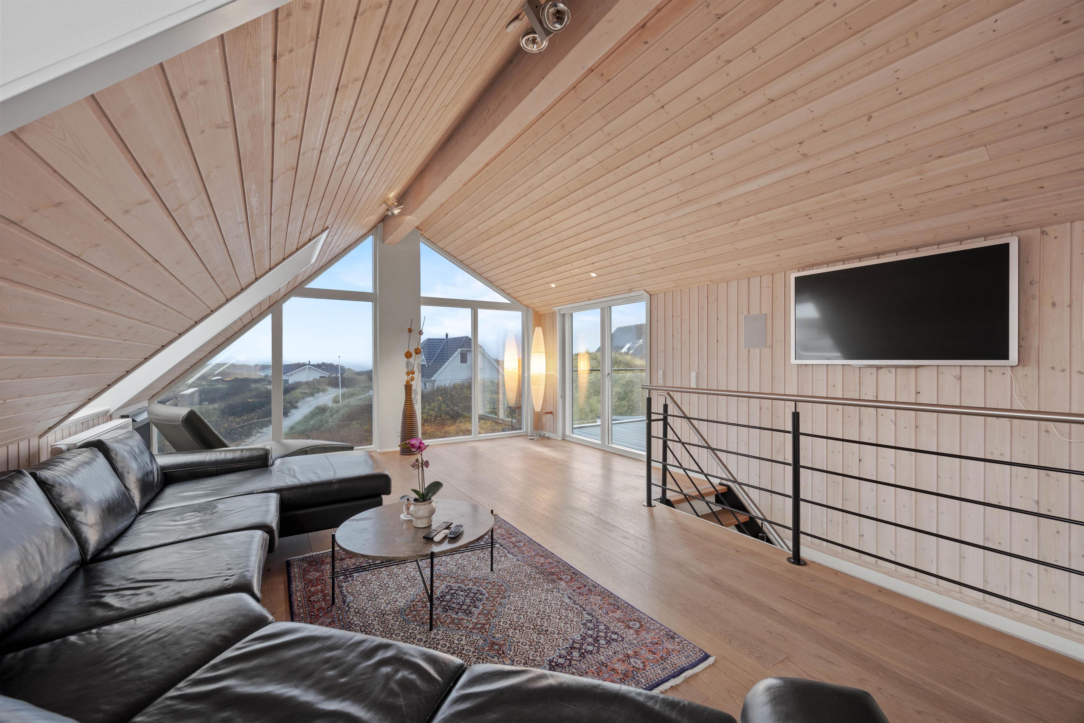 På første sal finder I en hyggelig stue med biopejs, og på den store sofa er der plads til alle - og gennem vinduesfronterne kan I se helt til havet. På det ene af to badeværelser har I også jeres helt egen wellnessoase med sauna og spabad. Hvad mere har man brug for?