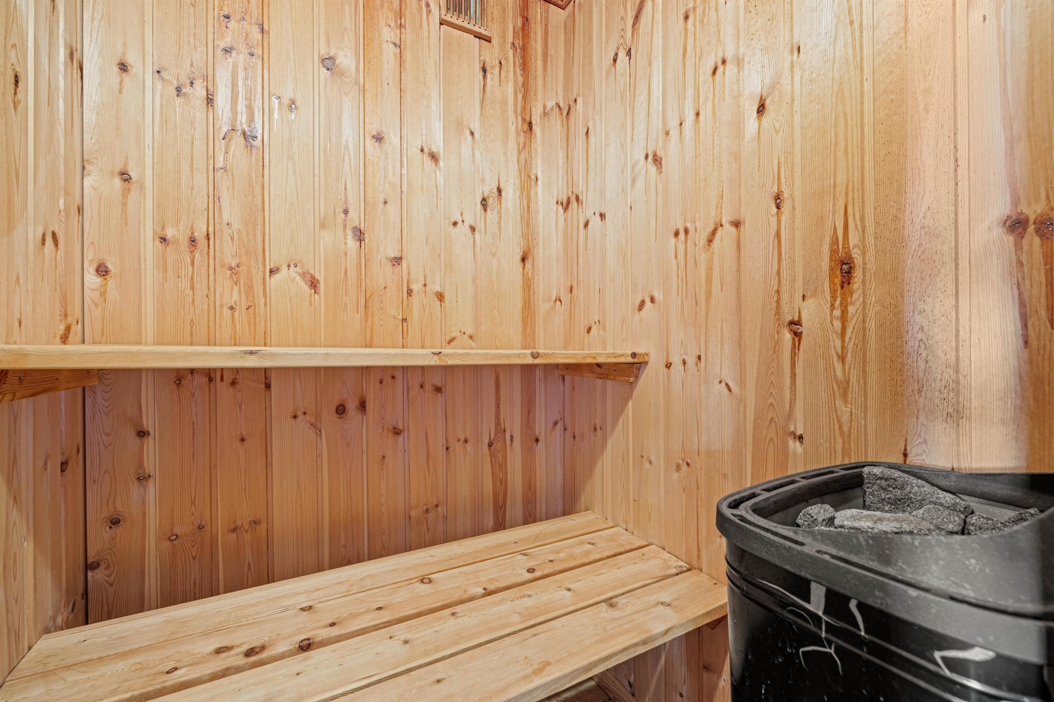 Feriehuset på 82 m2 er holdt i klassisk stil med naturlige træpaneler. Her er plads til seks feriegæster samt familiens firbenede ven. Planløsningen byder på tre værelser, et badeværelse med gulvvarme og adgang til lille sauna samt et åbent køkken, der sammen med stuen udgør et hyggeligt opholdsrum med brændeovn.