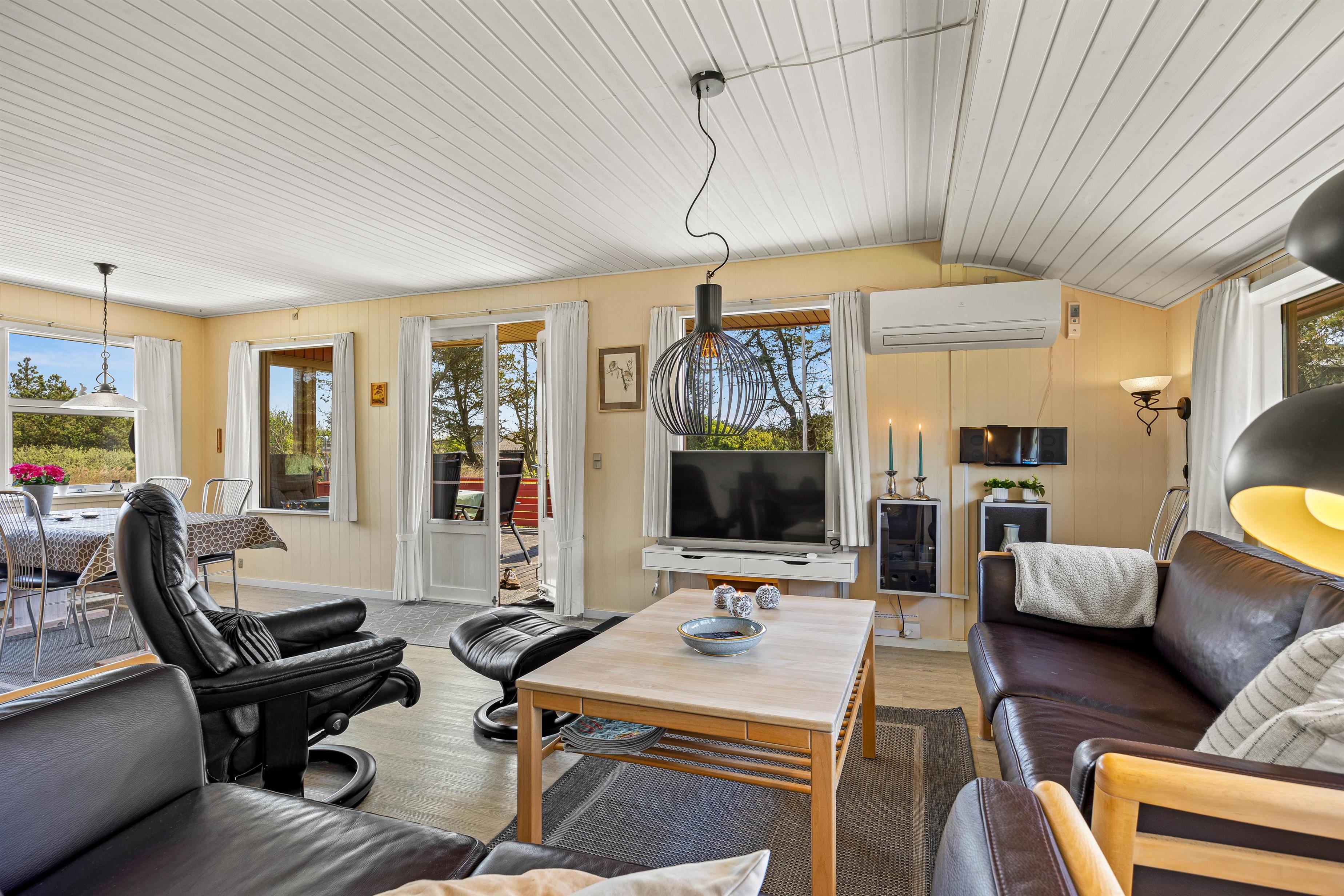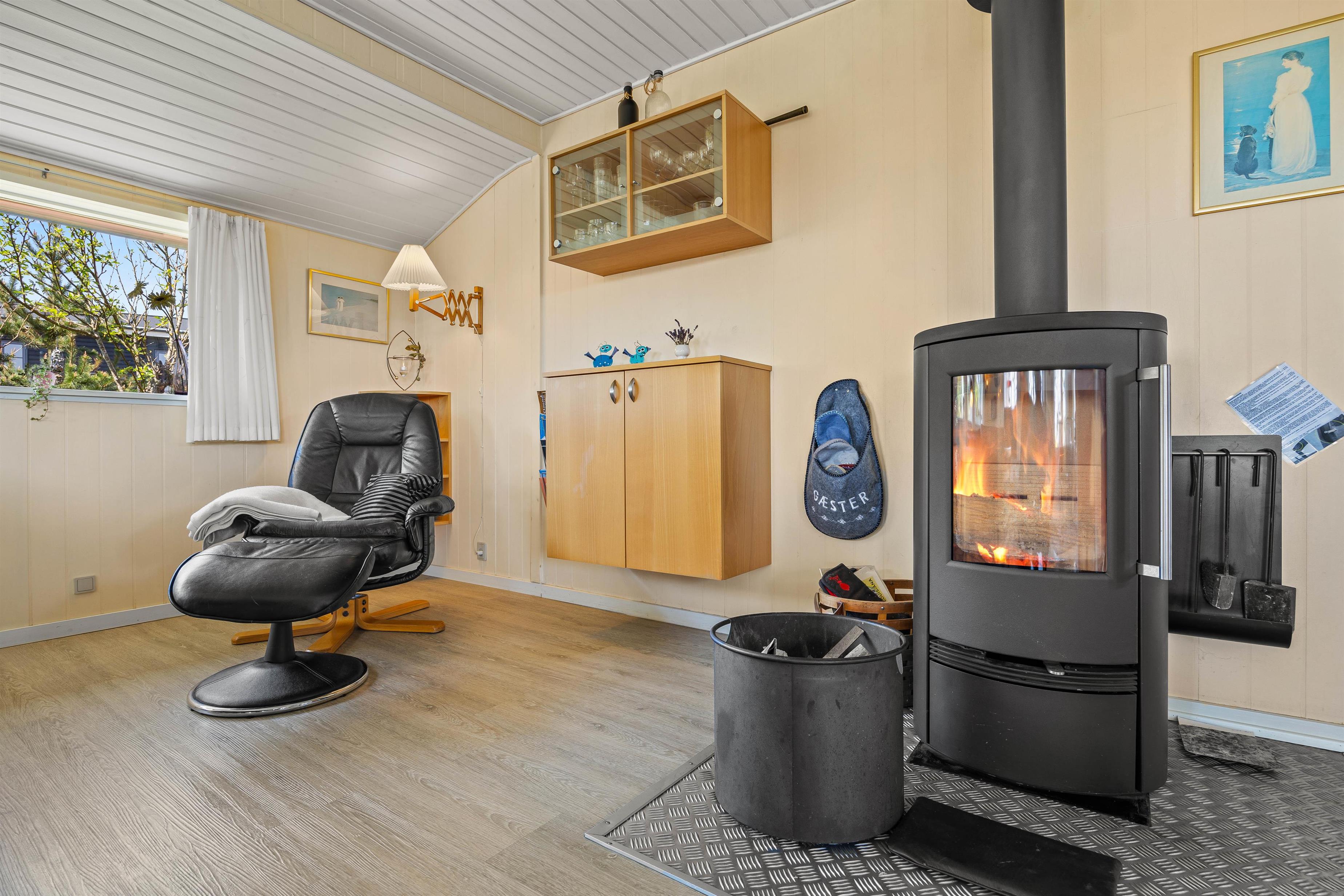 Hjerterummet er opholdsstuen, der ligger i åben forbindelse med spisepladsen og det veludstyrede køkken. Stuen er komfortabelt møbleret, udstyret med en energivenlig varmepumpe og har brændeovn til de køligere aftener. Her kan du læne dig tilbage i lænestolen med en god bog og friskbrygget kop kaffe, mens brændeovnens varme breder sig. Omkring spisebordet kan I samles til lækre retter og holde hyggelige brætspilsaftner.