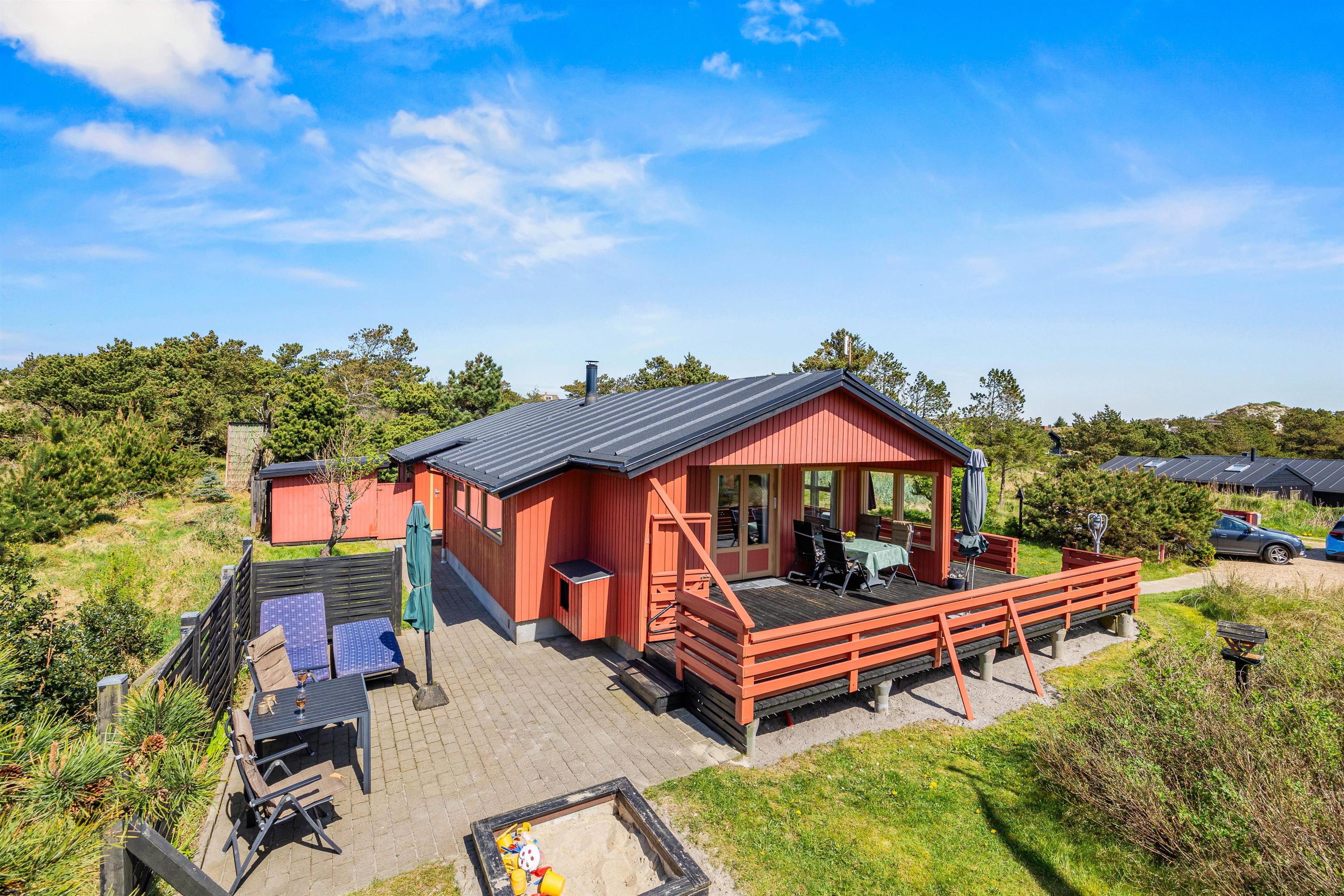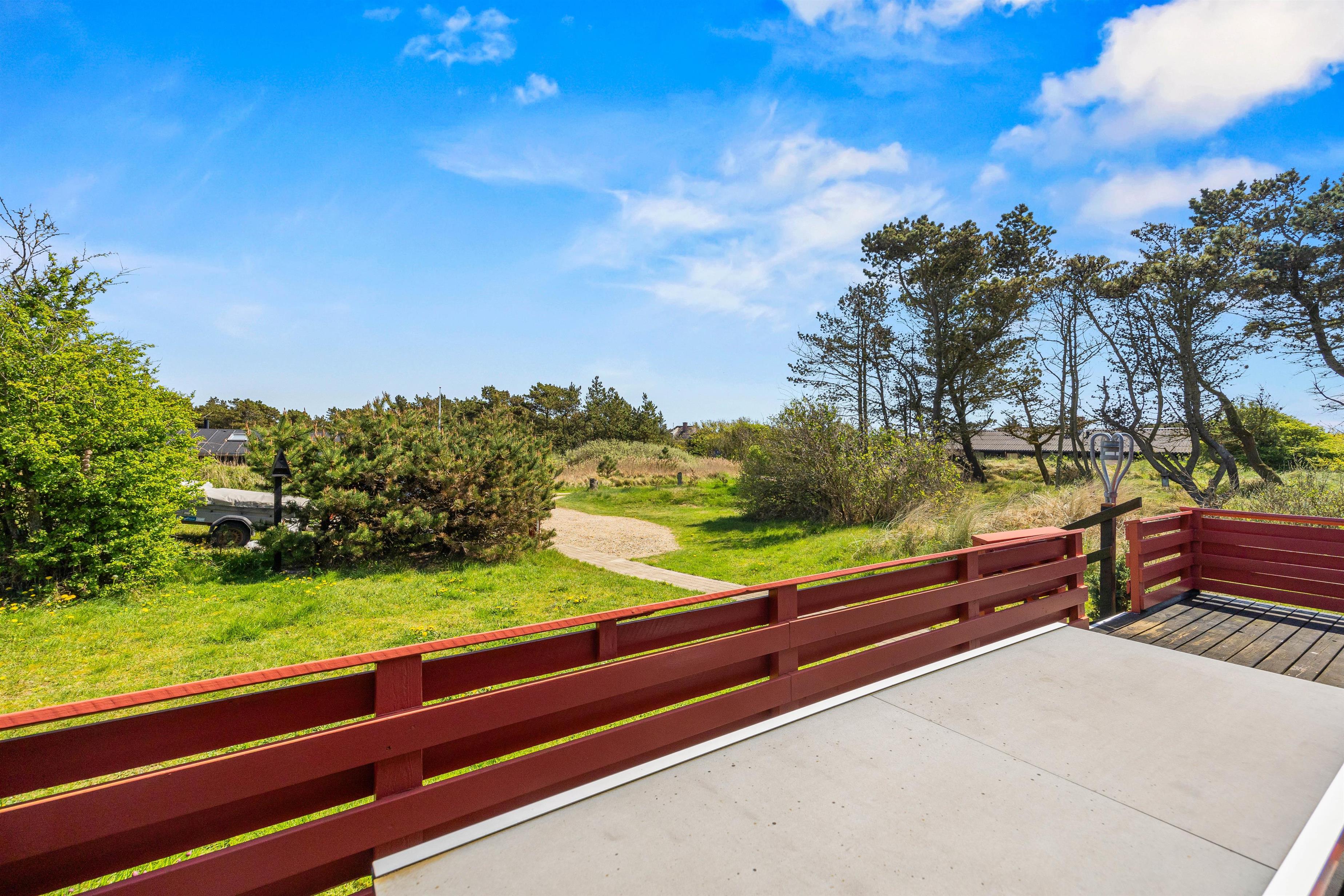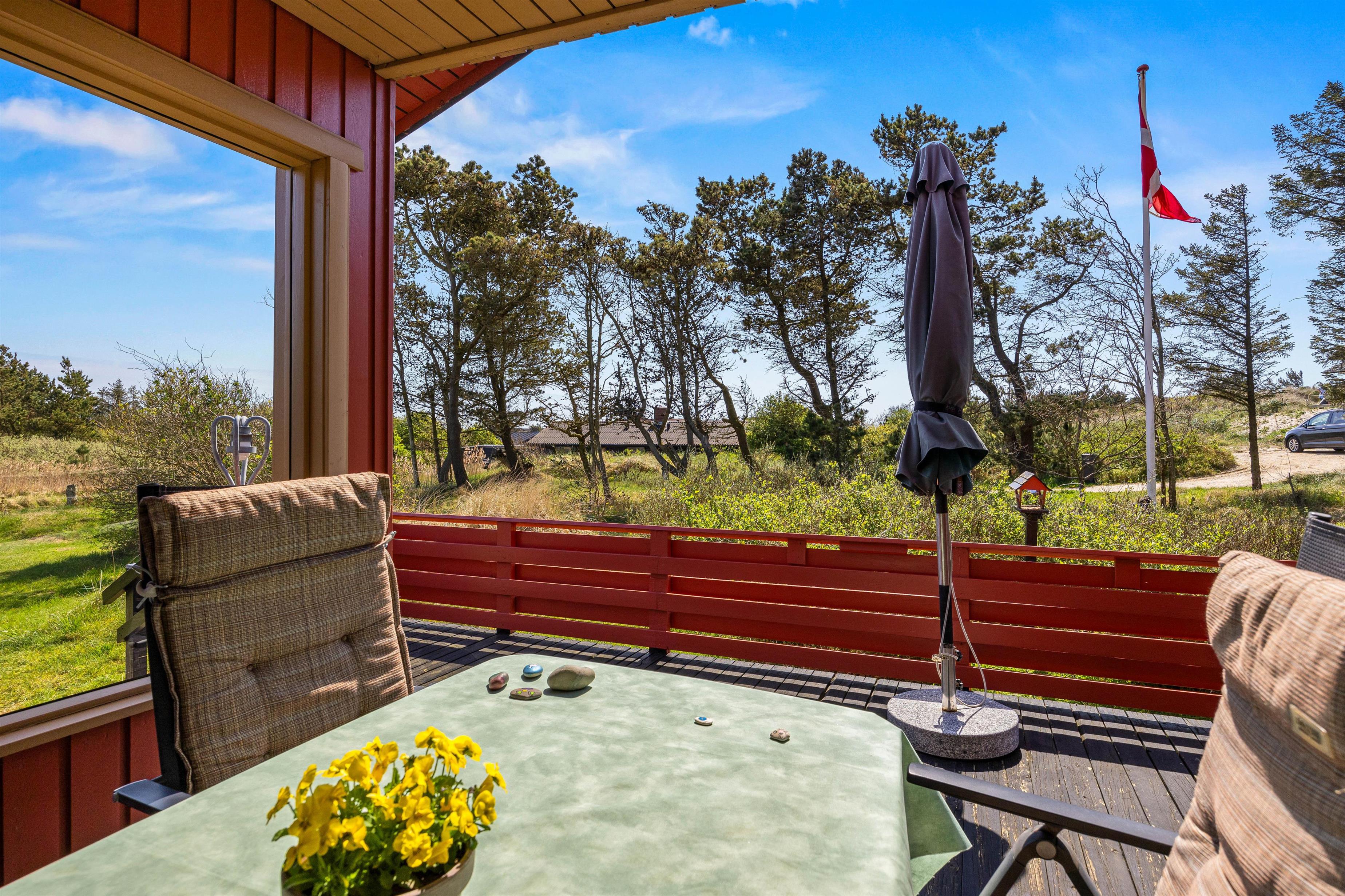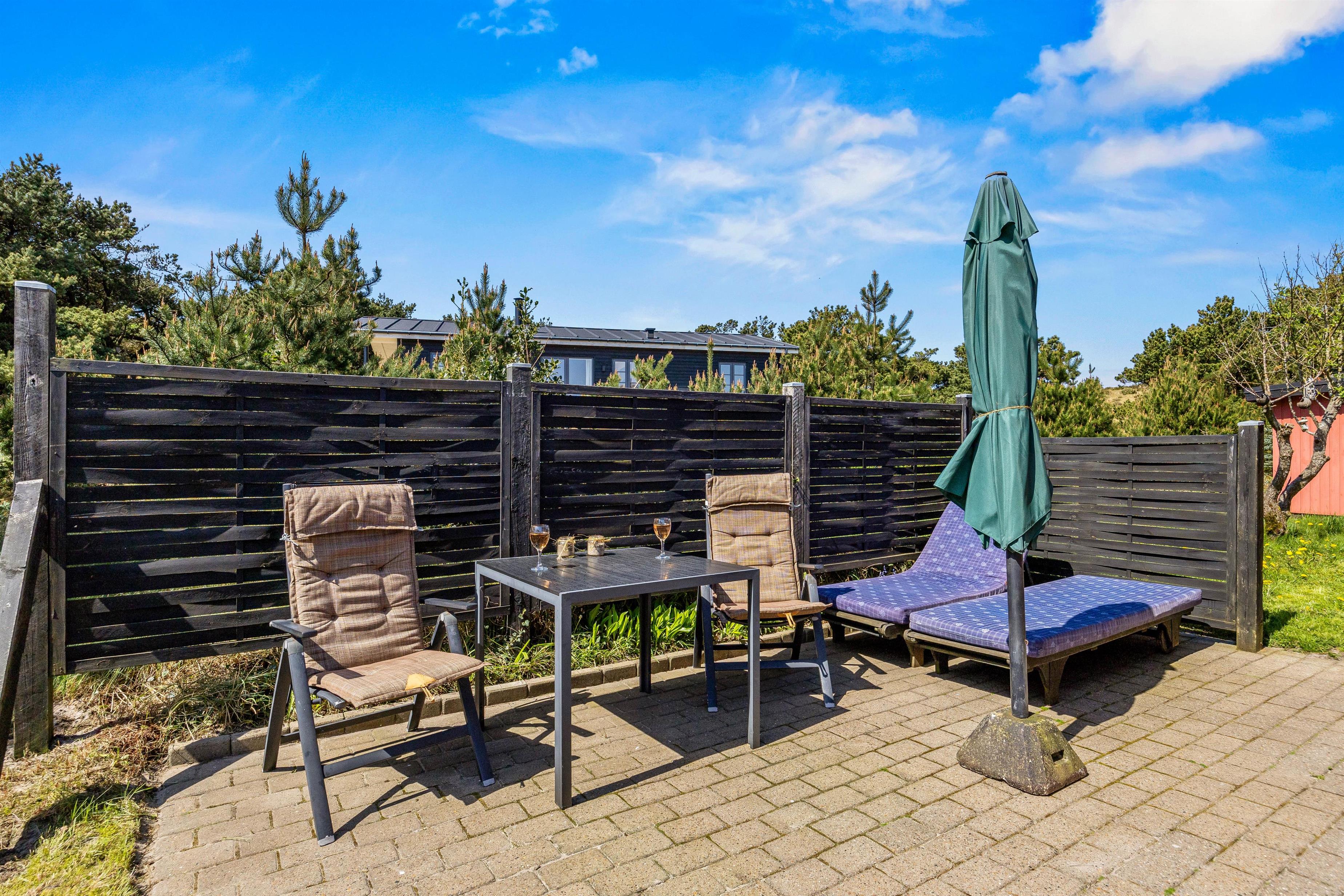 Feriehuset er beliggende på en grøn naturgrund, hvor fyrtræerne skærmer for den værste vind. Her er plads til boldspil og leg på den grønne plæne, mens havemøblerne venter på terrassen. Terrassen, som omgiver det meste af feriehuset, kan tilgås fra stuen og er indhegnet. Nyd solskinstimerne og tænd op i grillen. Tilbered en lækker sommermenu og slut aftenen af i godt selskab med et køligt glas rosé. Mens grillen varmer, kan I spille kort eller nyde et glas vin i fred og ro. Afslut den lune sommeraften ved stranden, hvor I kan se solnedgangen bade himlen i farver. Vesterhavet er nemlig kun små 500 meter herfra.