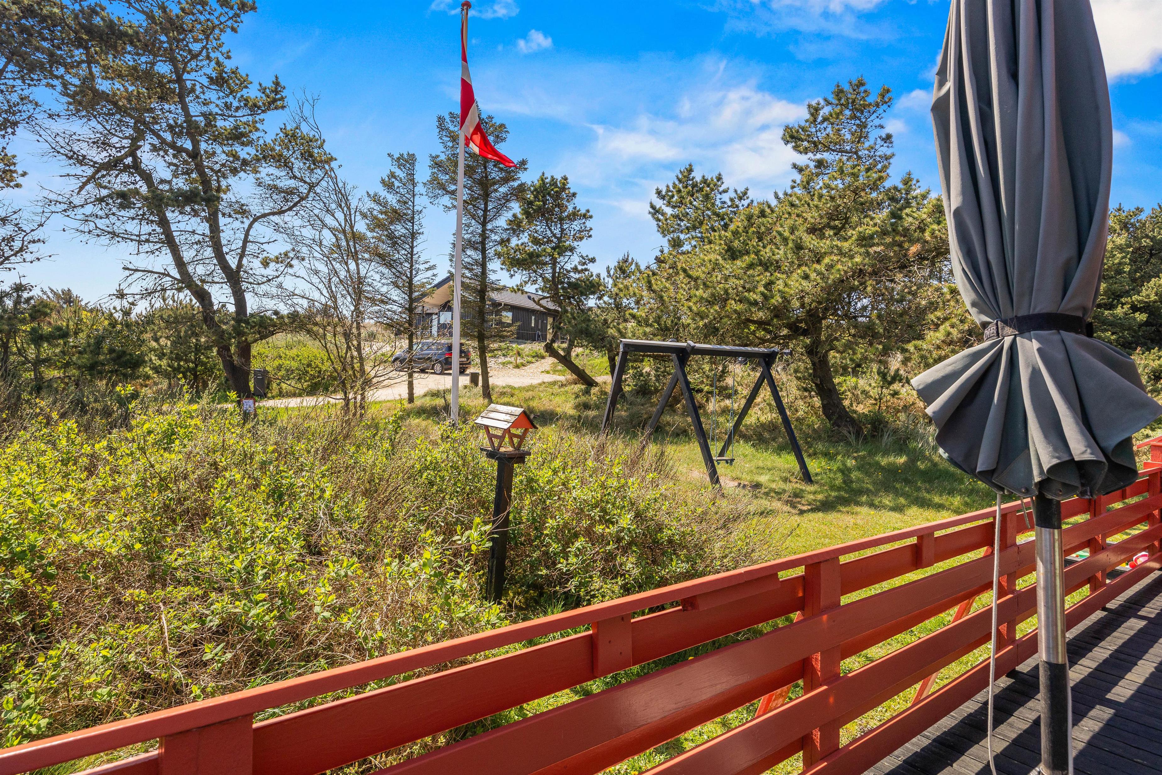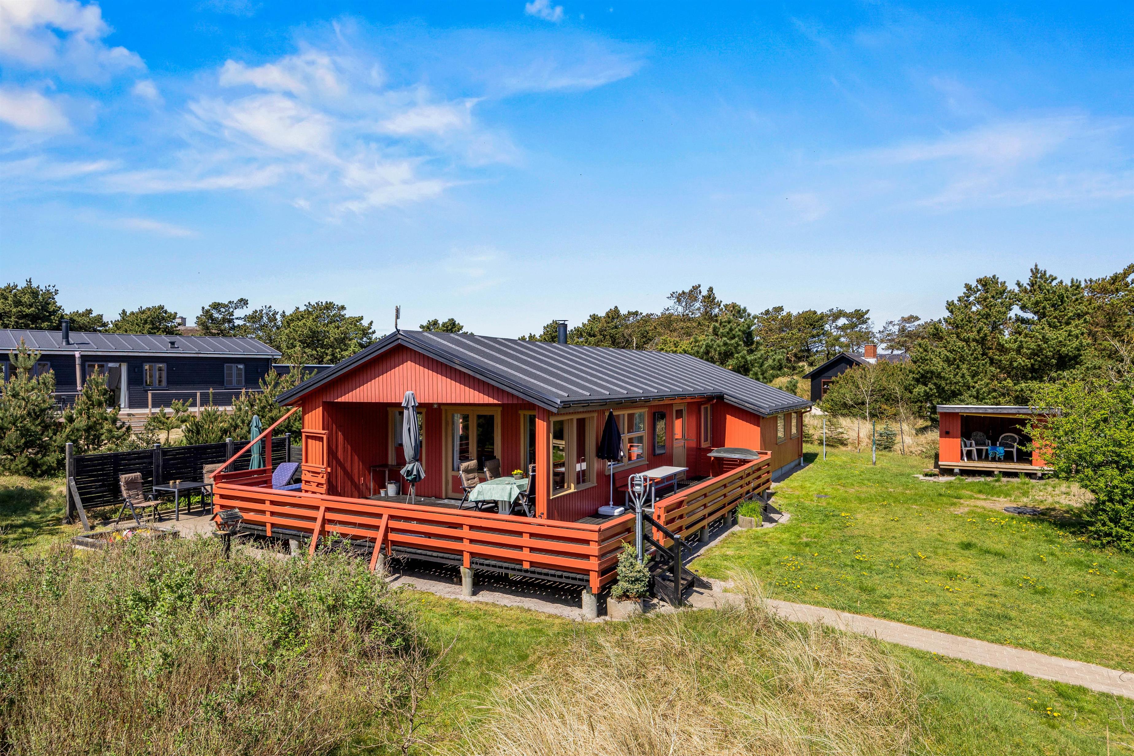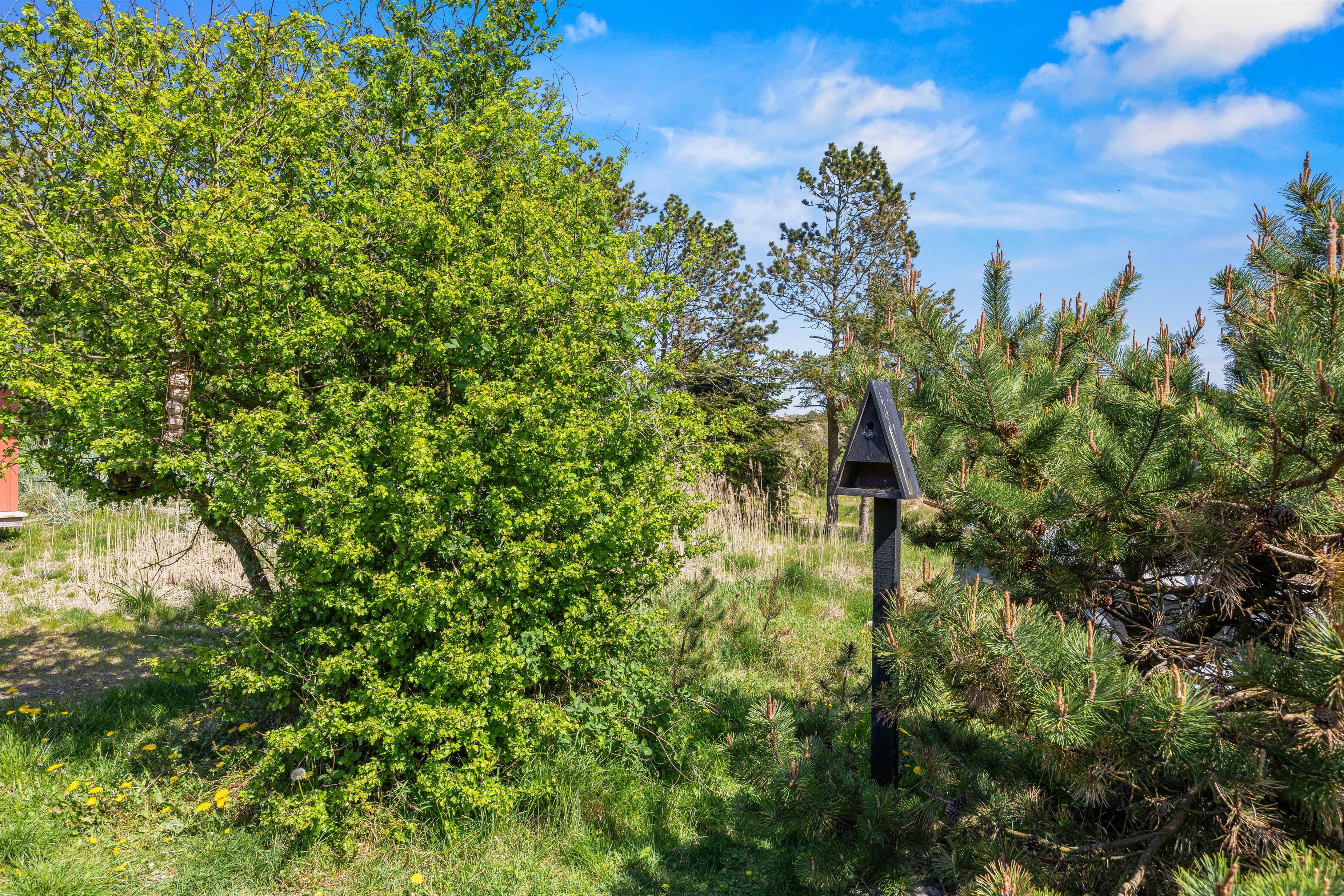 Feriehuset er beliggende på en grøn naturgrund, hvor fyrtræerne skærmer for den værste vind. Her er plads til boldspil og leg på den grønne plæne, mens havemøblerne venter på terrassen. Terrassen, som omgiver det meste af feriehuset, kan tilgås fra stuen og er indhegnet. Nyd solskinstimerne og tænd op i grillen. Tilbered en lækker sommermenu og slut aftenen af i godt selskab med et køligt glas rosé. Mens grillen varmer, kan I spille kort eller nyde et glas vin i fred og ro. Afslut den lune sommeraften ved stranden, hvor I kan se solnedgangen bade himlen i farver. Vesterhavet er nemlig kun små 500 meter herfra.
