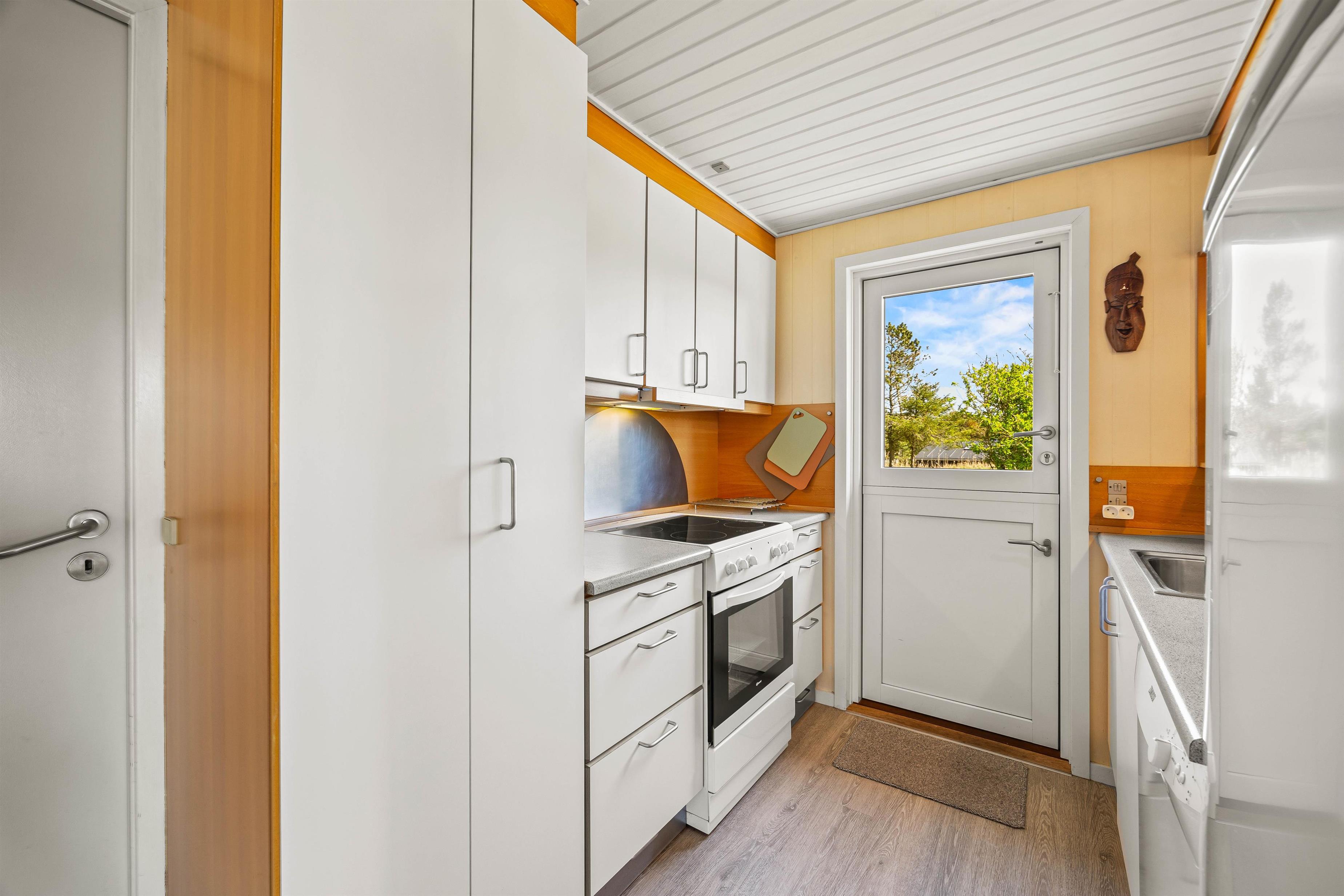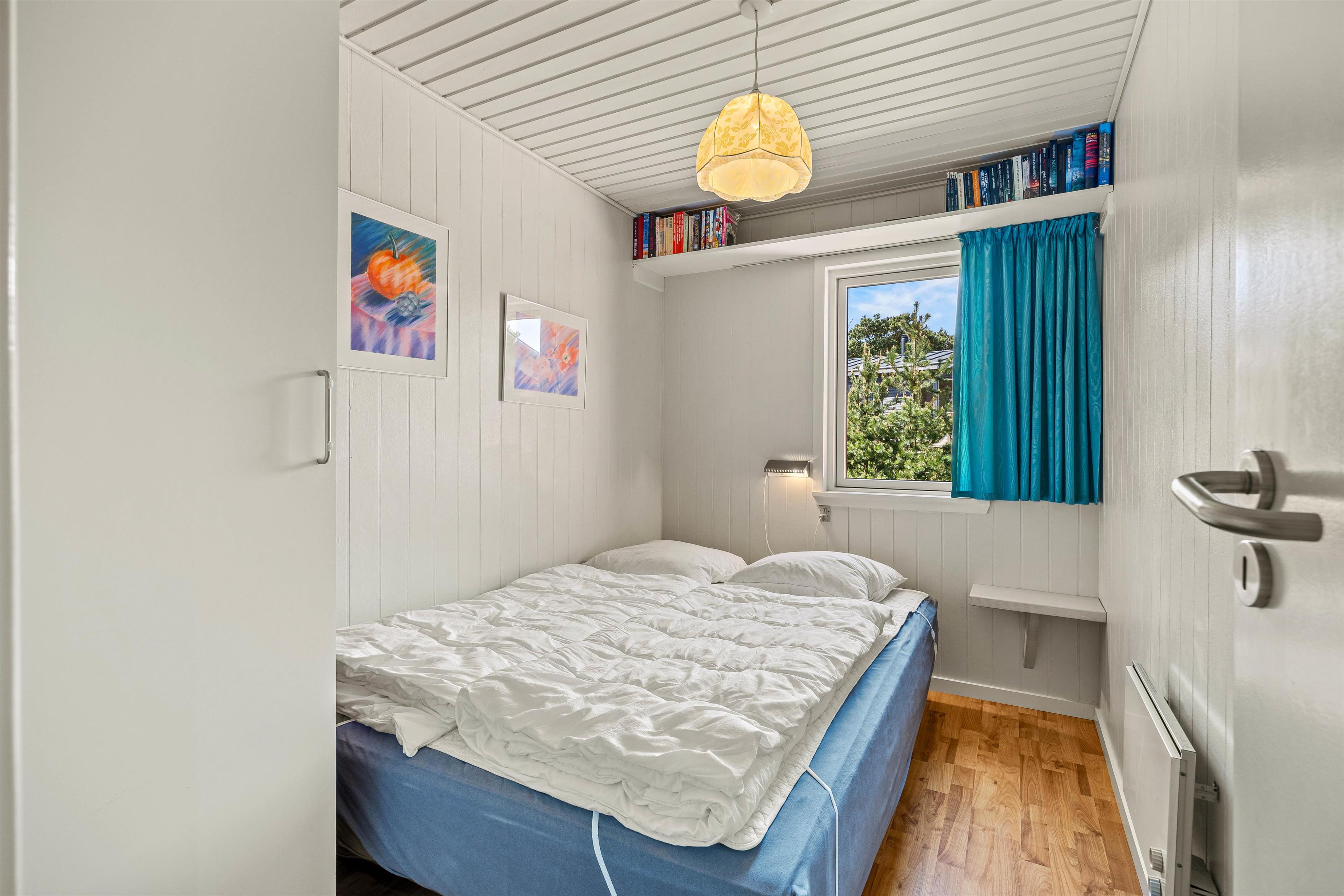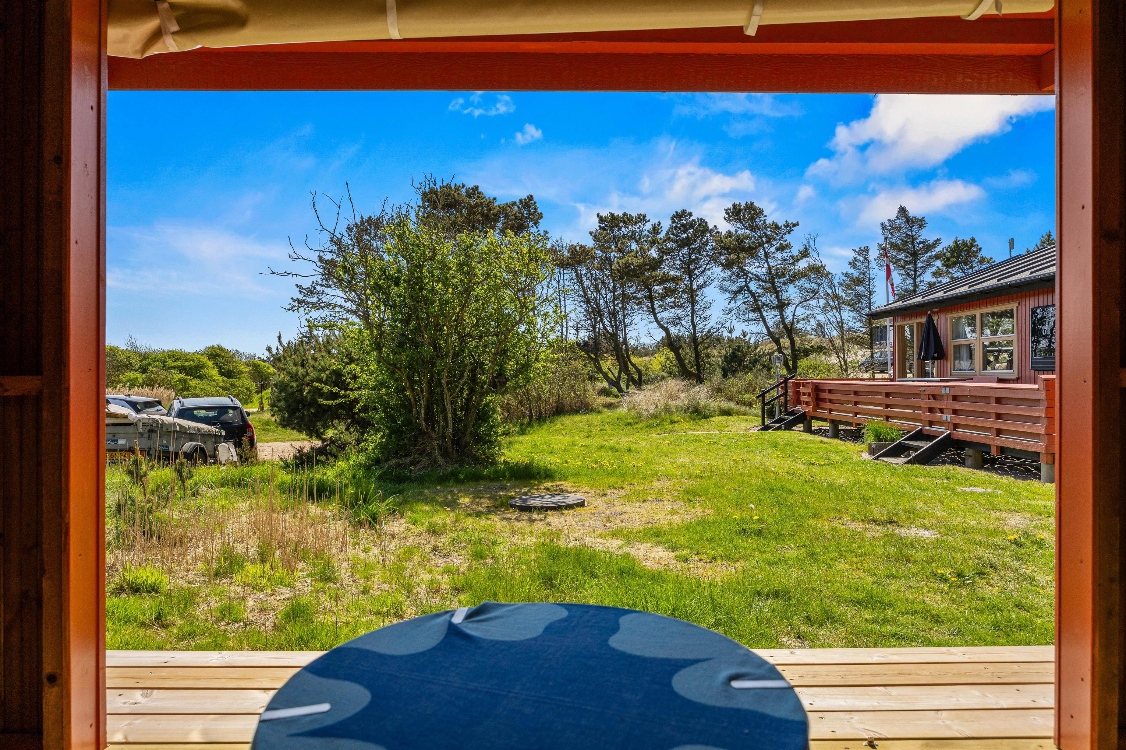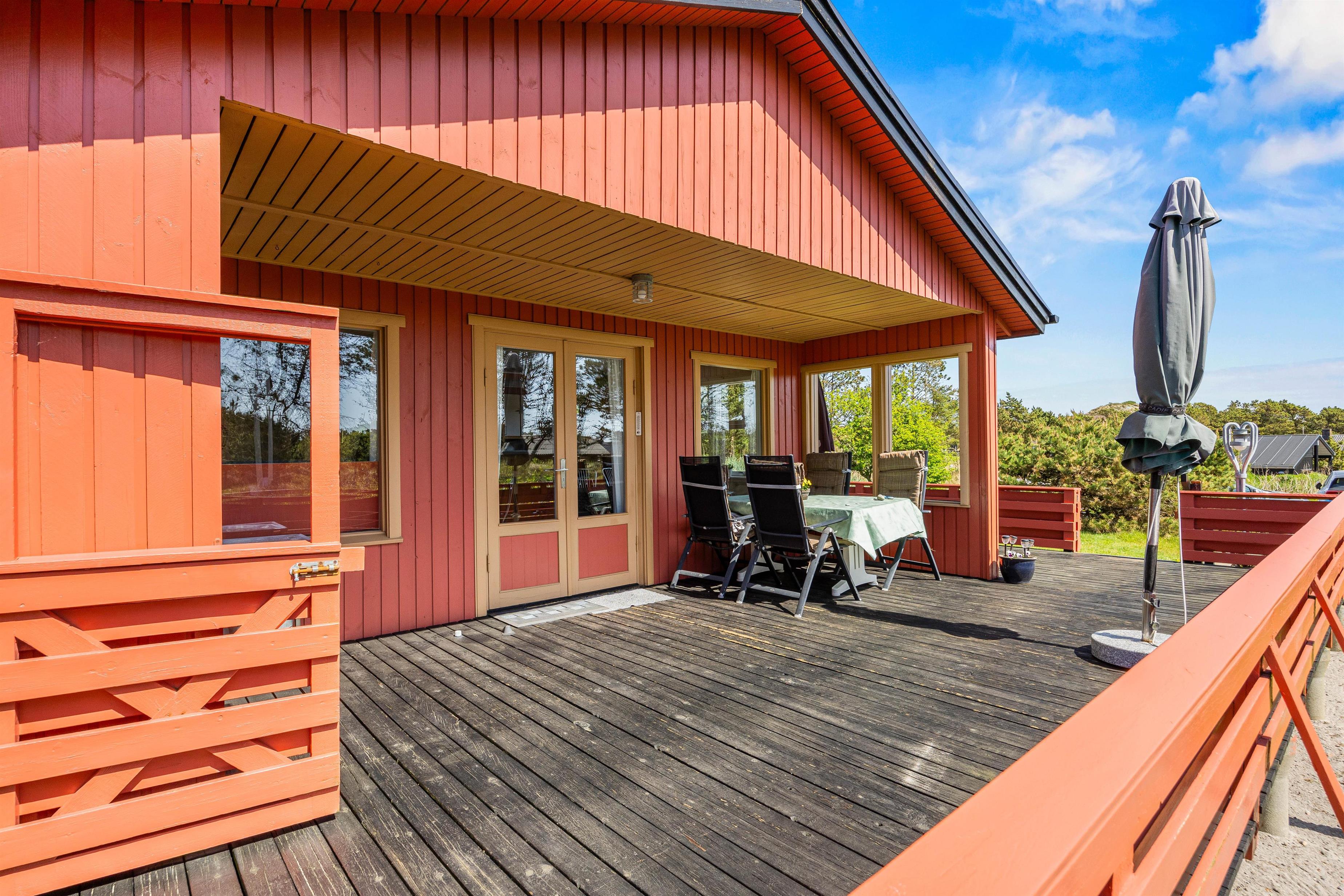 Feriehuset er beliggende på en grøn naturgrund, hvor fyrtræerne skærmer for den værste vind. Her er plads til boldspil og leg på den grønne plæne, mens havemøblerne venter på terrassen. Terrassen, som omgiver det meste af feriehuset, kan tilgås fra stuen og er indhegnet. Nyd solskinstimerne og tænd op i grillen. Tilbered en lækker sommermenu og slut aftenen af i godt selskab med et køligt glas rosé. Mens grillen varmer, kan I spille kort eller nyde et glas vin i fred og ro. Afslut den lune sommeraften ved stranden, hvor I kan se solnedgangen bade himlen i farver. Vesterhavet er nemlig kun små 500 meter herfra.