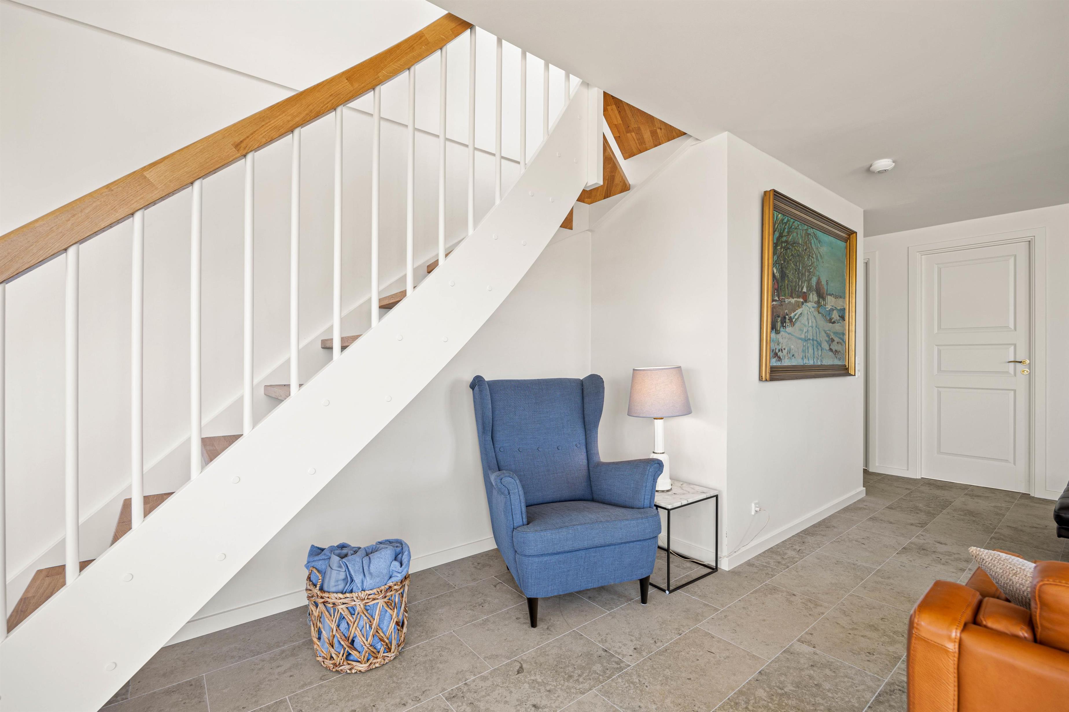 Den rummelige og stilet indrettede stue i stueplan har et klinkegulv, der er ideelt til familien at samles omkring i, enten for at hygge sammen eller for at kunne betragte områdets enestående natur igennem de flotte vinduer: panoramaudsigten over det smukke landskab kan nydes fra både stueplan og første sal, som er udstyret med laminatgulve.