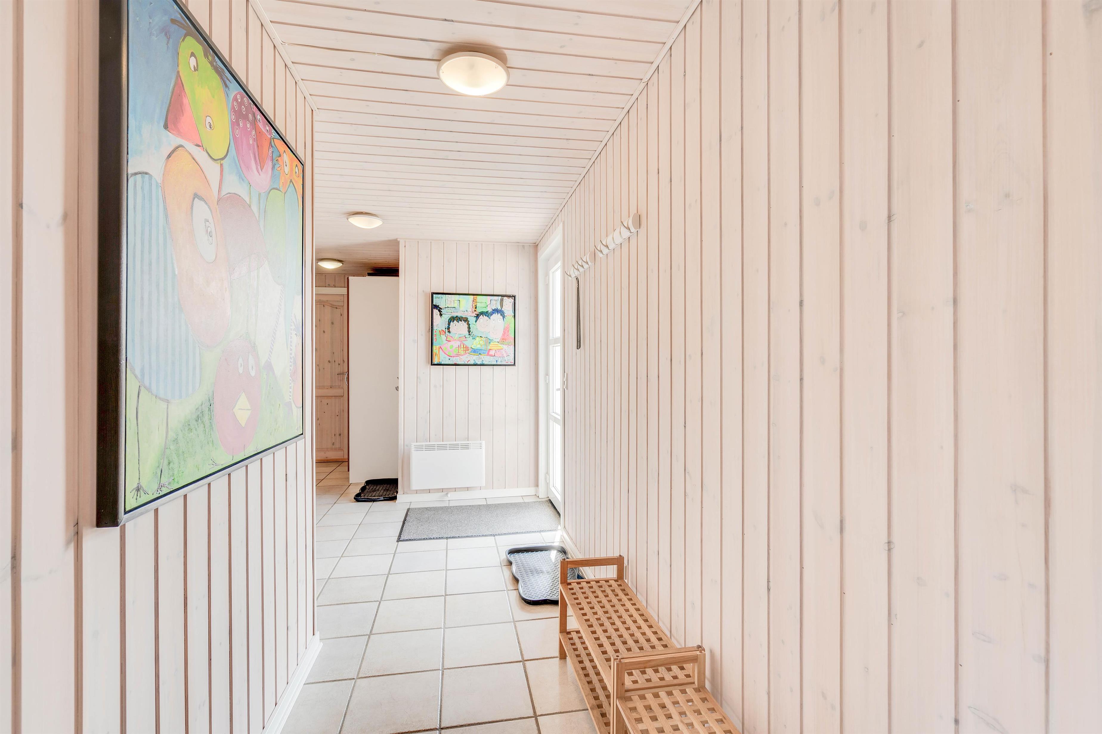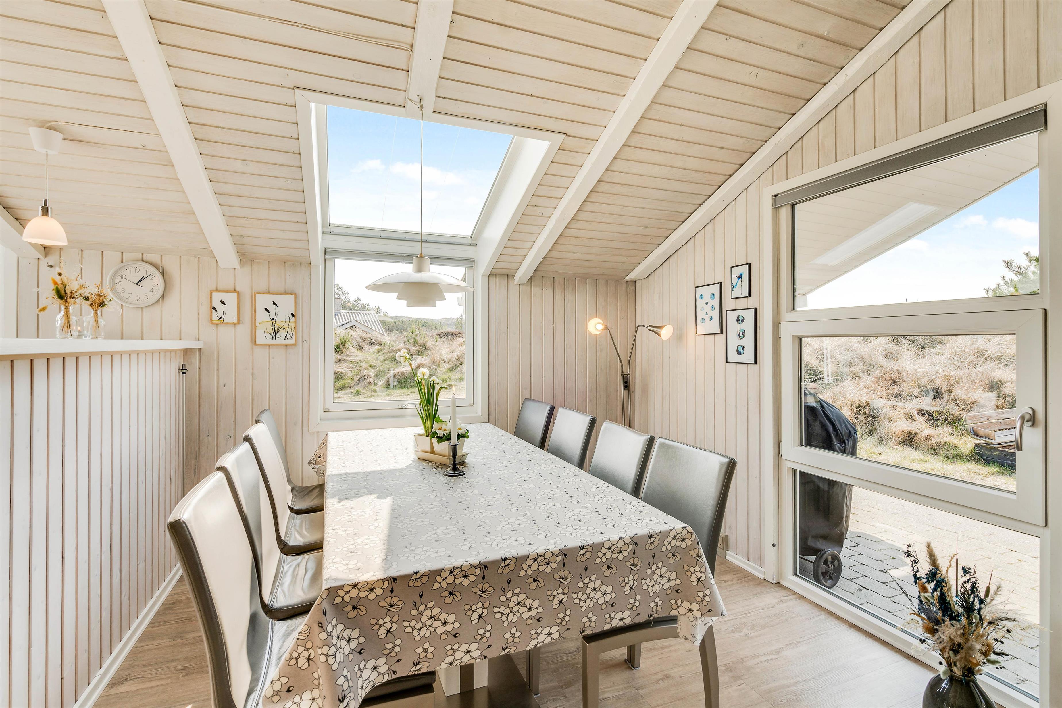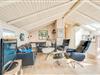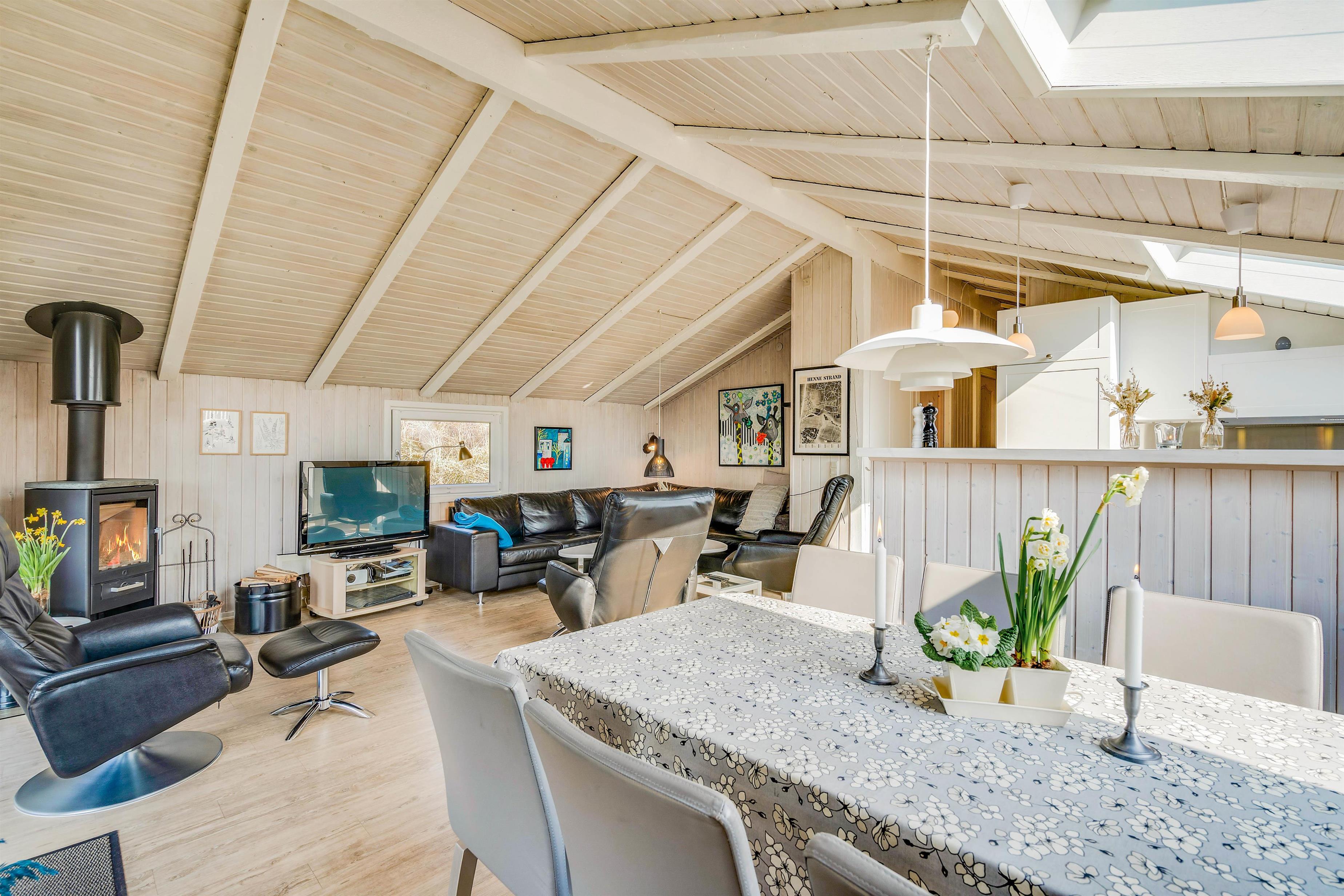 Feriehyggen starter allerede, så snart I træder indenfor. Dette sommerhus emmer nemlig af rolige omgivelser, hvor I ikke skal tænke på andet end at nyde hinandens samvær. Foran brændeovnen kan I se en film på fladskærms-tv’et eller måske spille et brætspil. Køkkenet ligger i forlængelse, så I kan være sammen, uanset om I hygger i sofaen eller tilbereder maden.