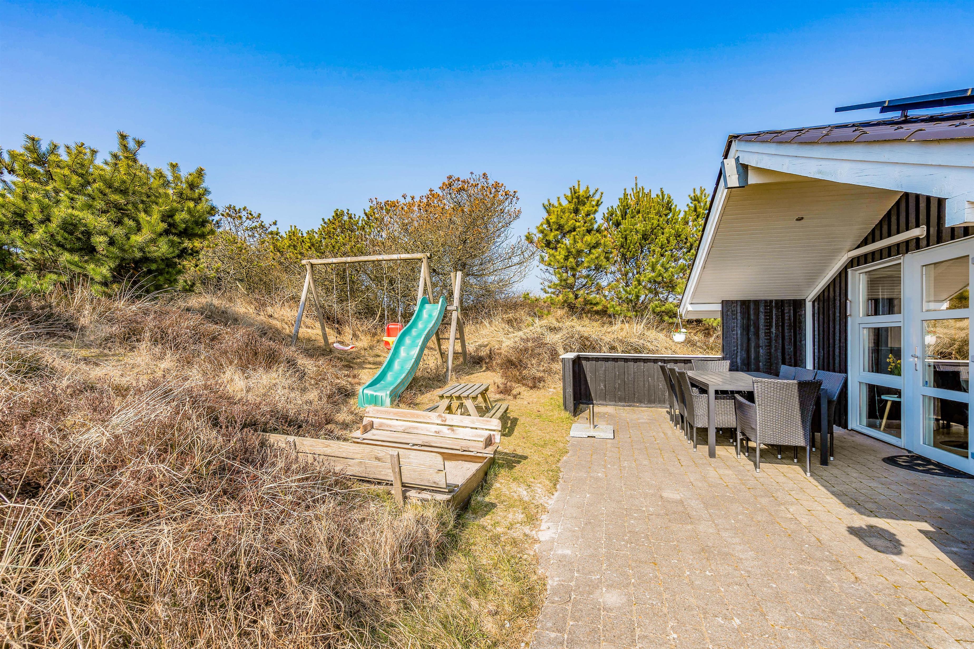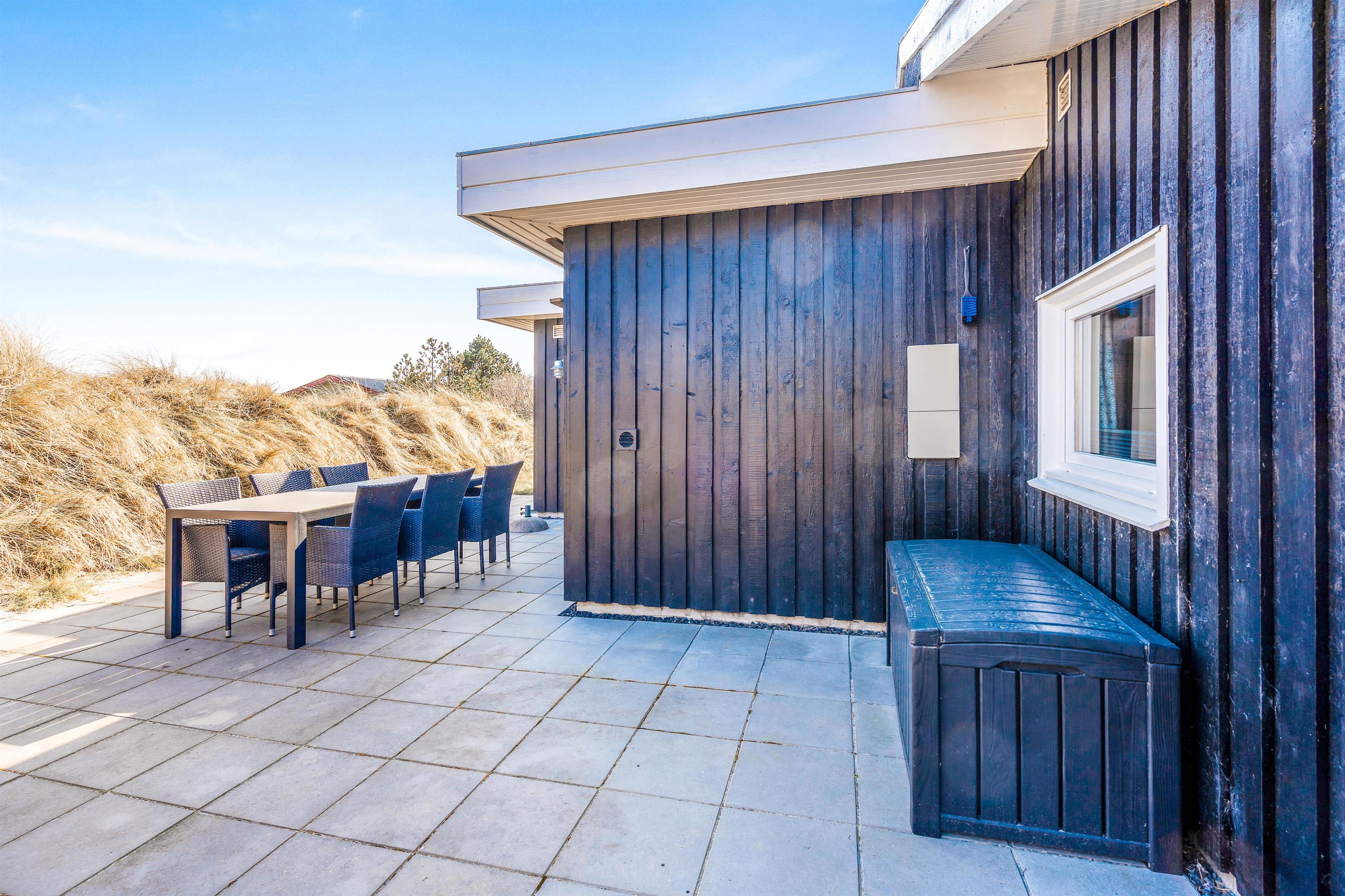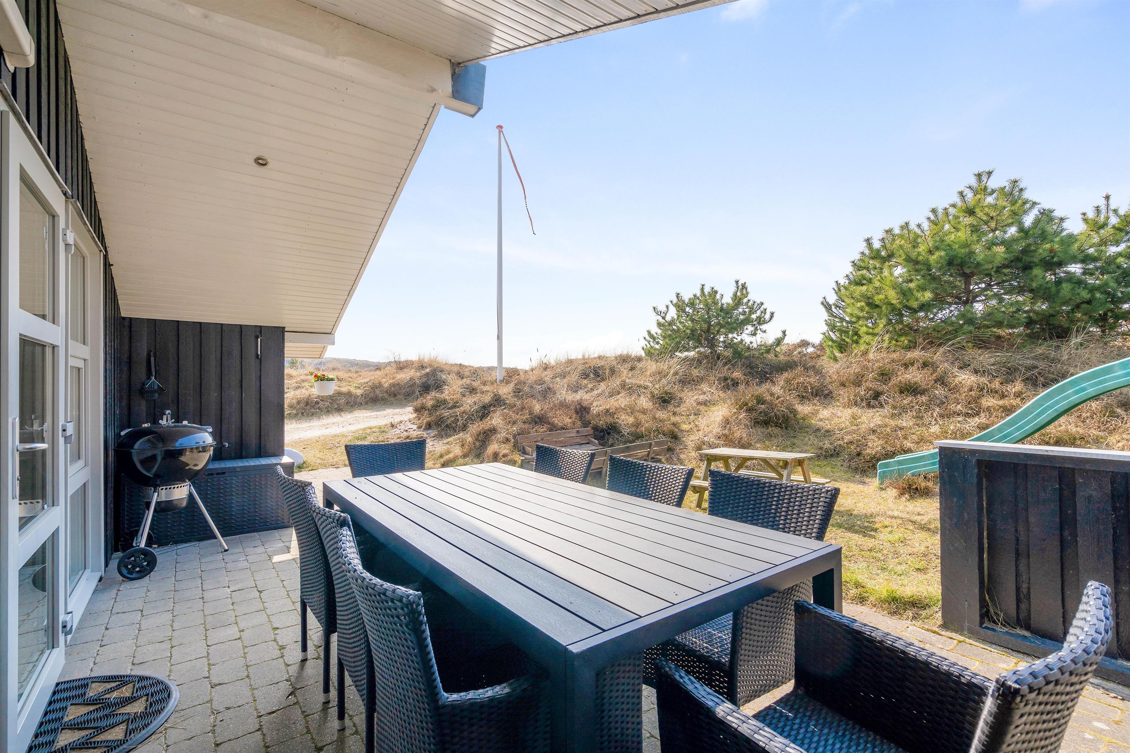 Med dette sommerhus får I også en dejlig beliggenhed, hvor I kun har 800 meter til stranden. Det kræver derfor kun en lille gåtur, og så er vandhundene allerede hoppet i vandet. Og hvis I har fået nok af stranden, så kan I også nyde solen på terrassen. Her finder I både liggestole, havemøbler og en grill. Terrassen er også delvist overdækket, hvis I trænger til lidt skygge.