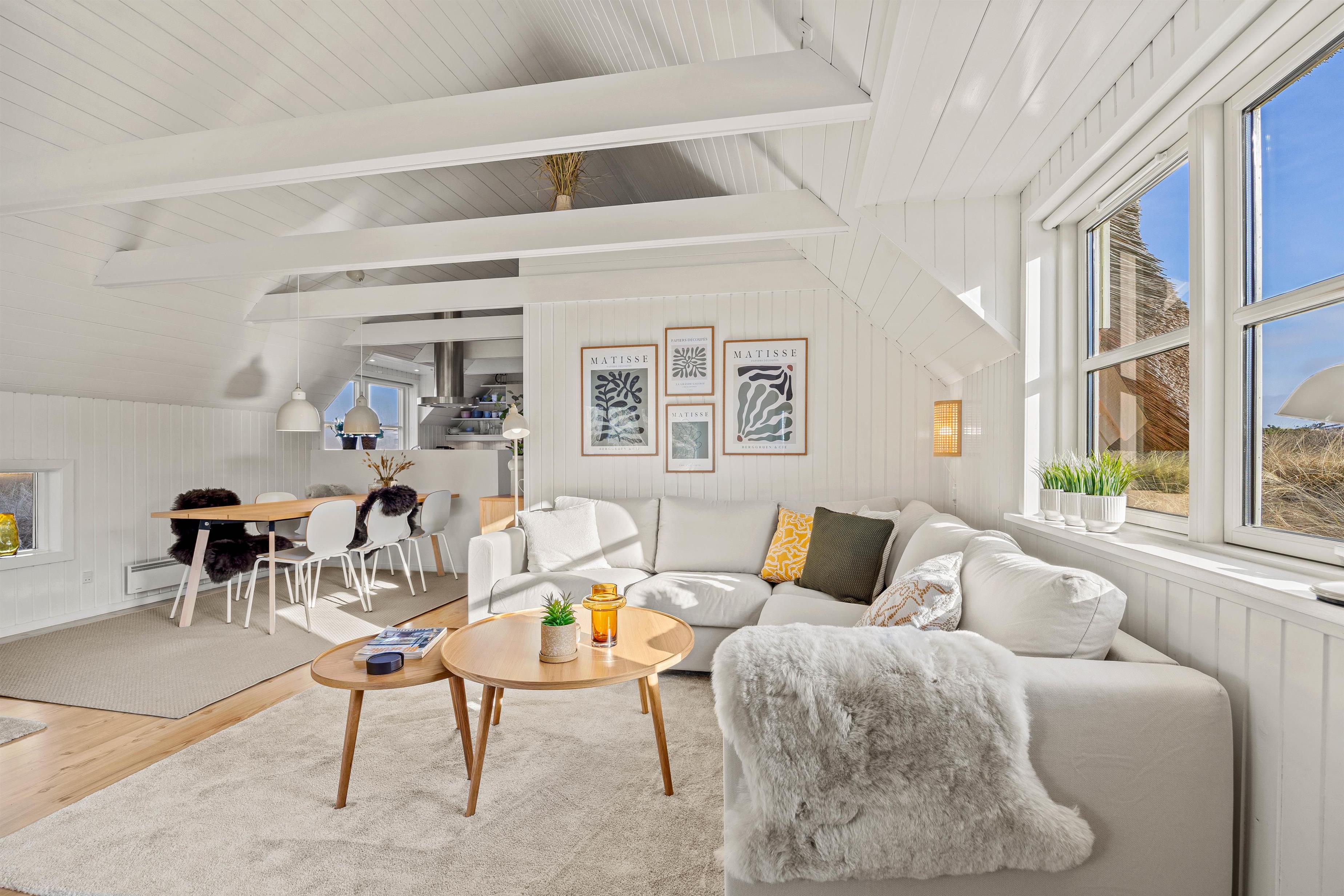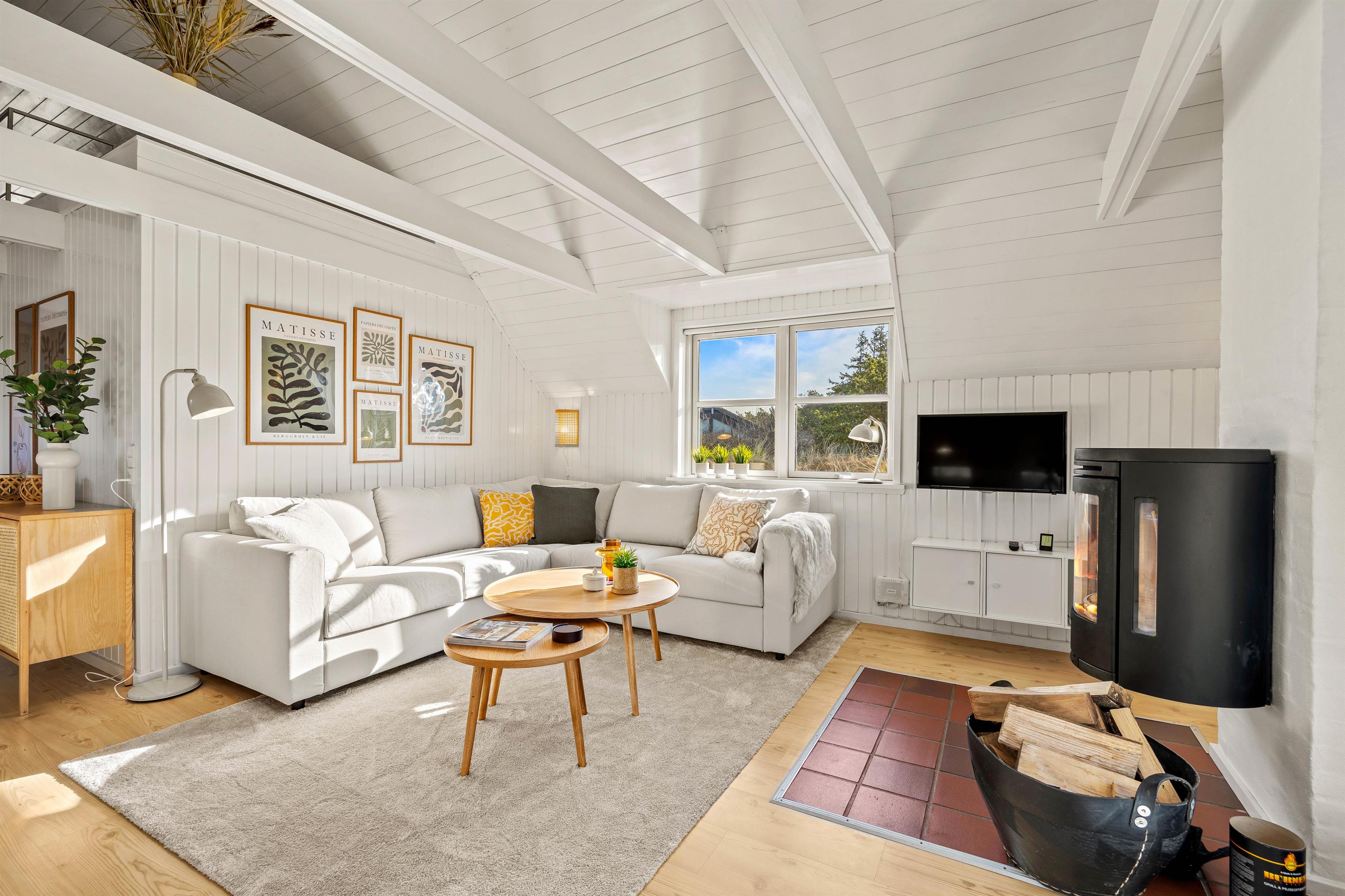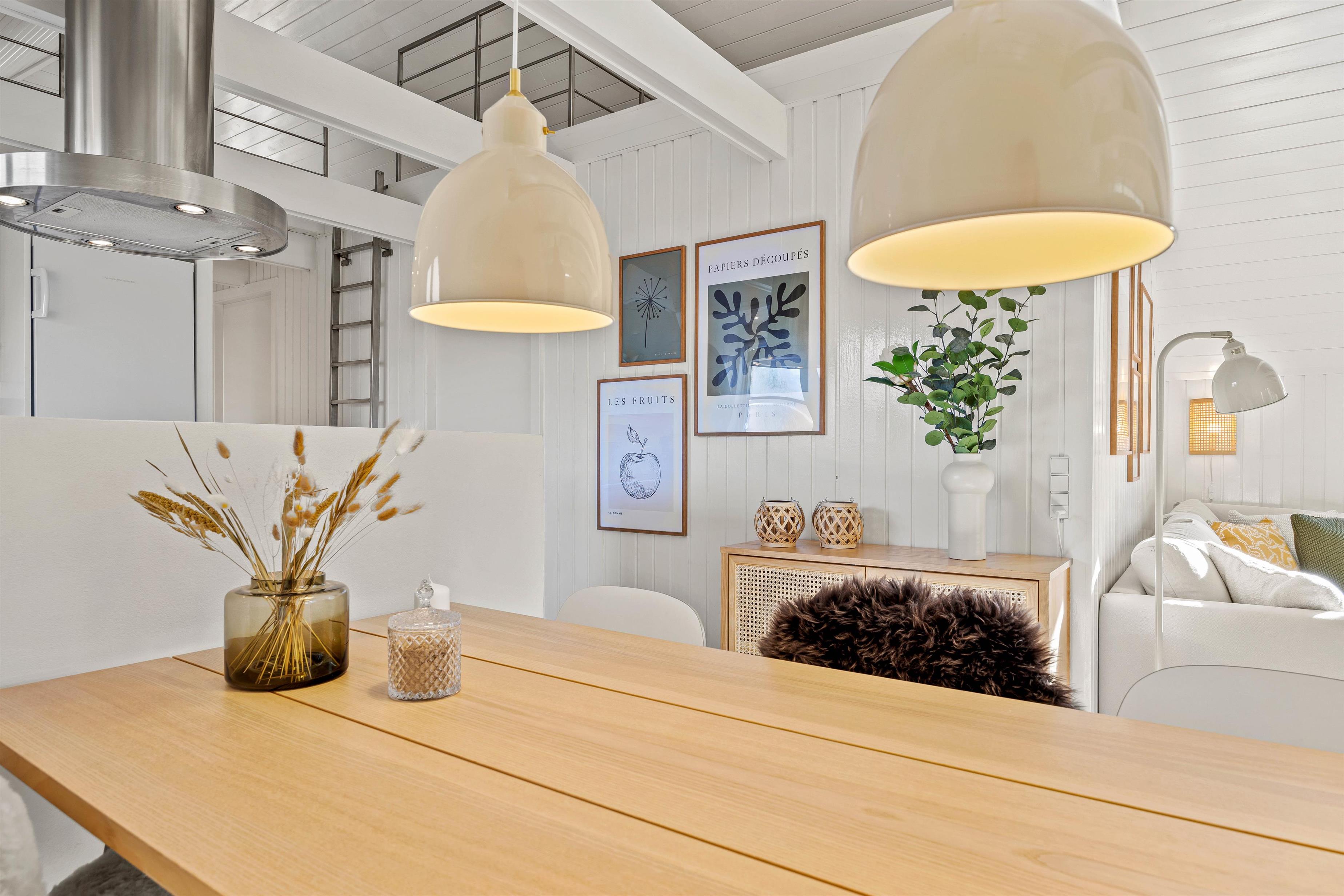 I den åbne opholdsstue sørger komfortable møbler og en brændeovn for ægte feriestemning, hvor I kan samle jer med en god bog, spille brætspil eller bare nyde roen foran de knitrende flammer. Rummets store vinduer lader dagslyset strømme ind og skaber en behagelig atmosfære, der inviterer til afslapning.