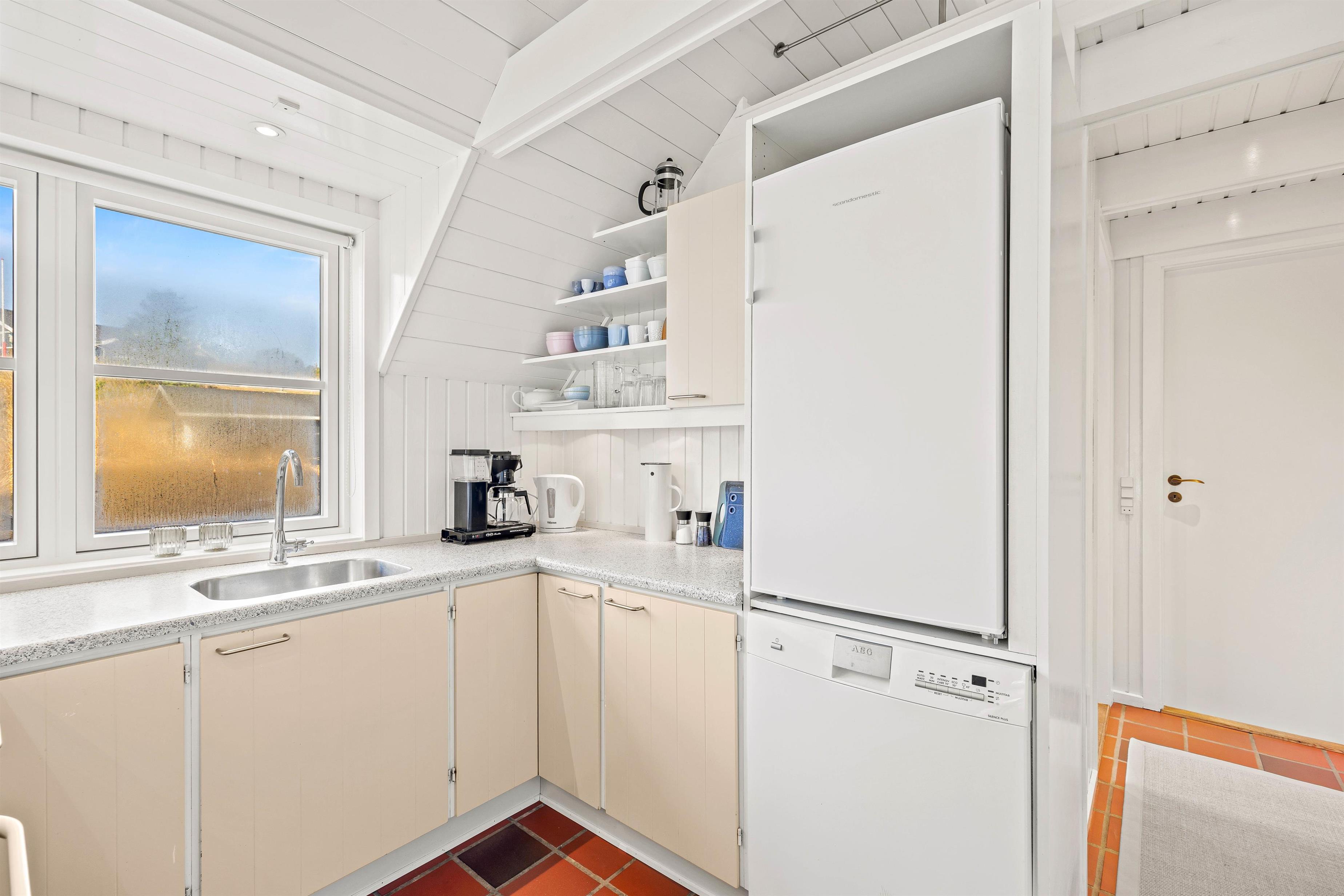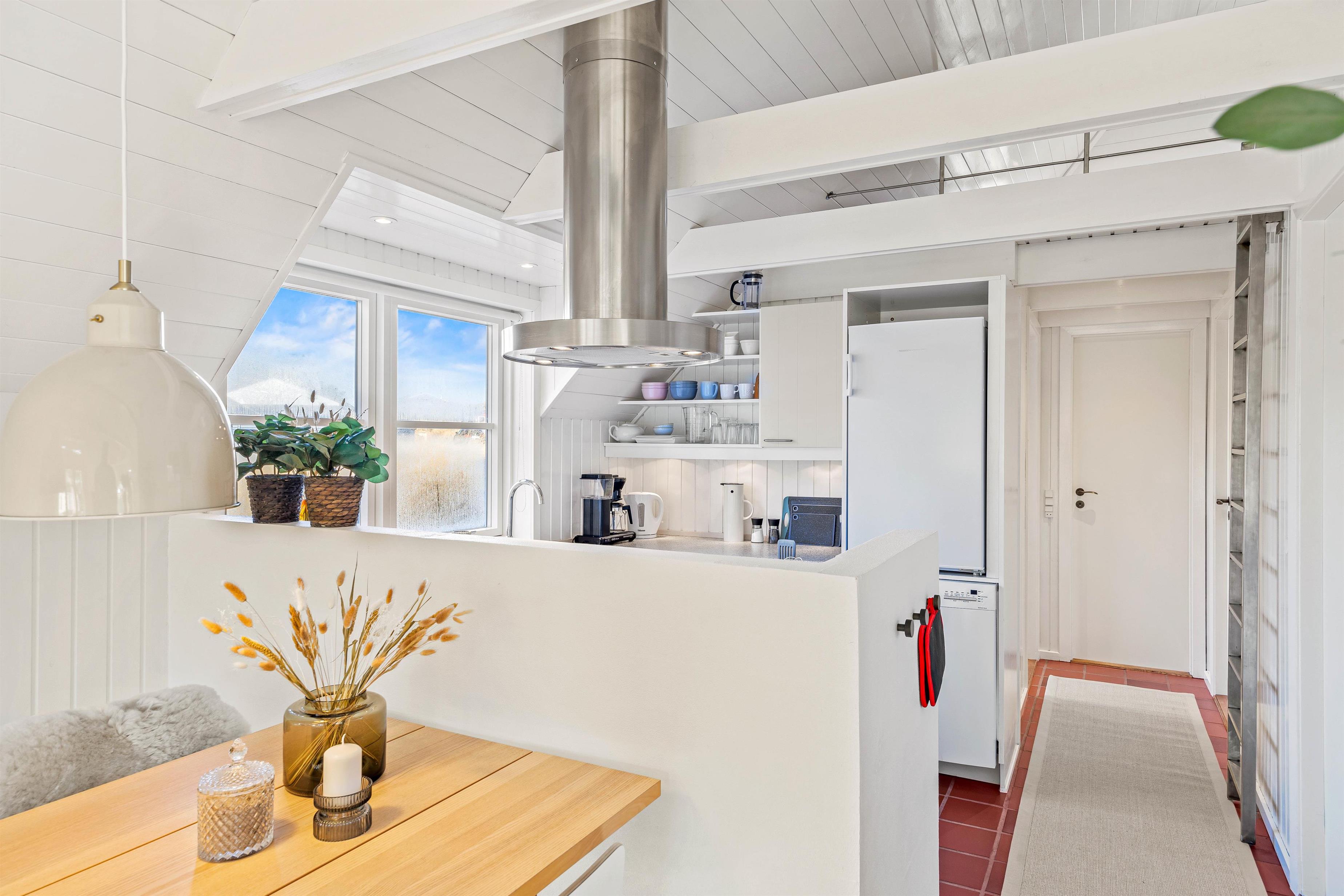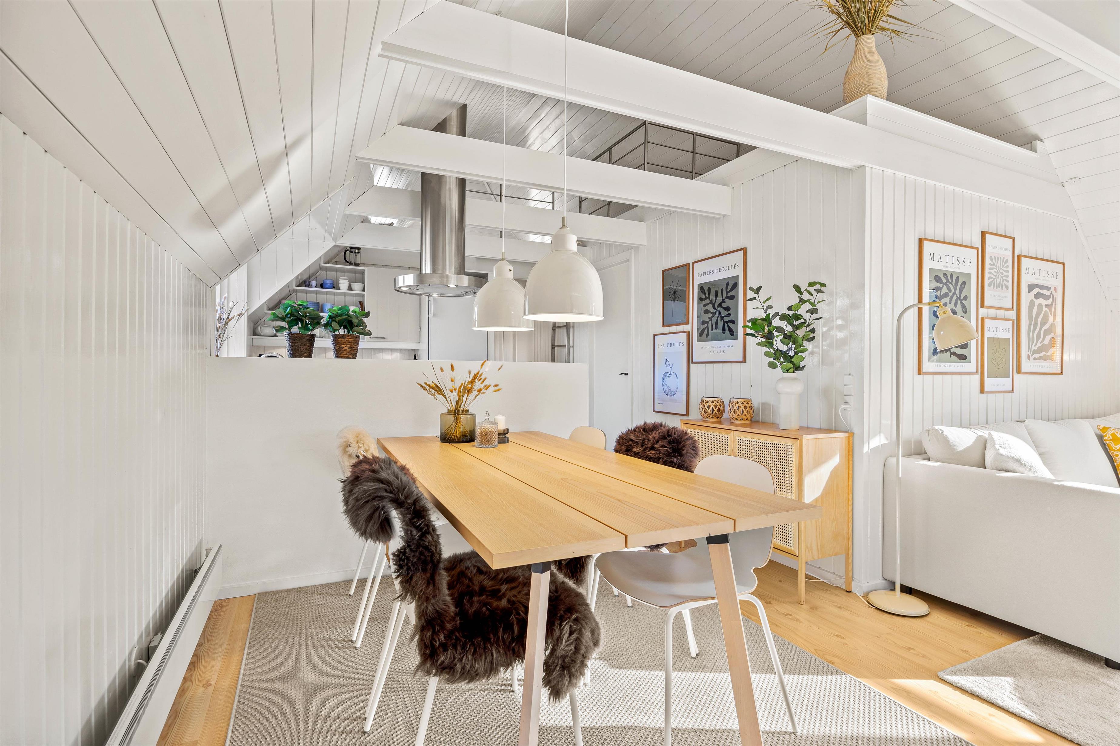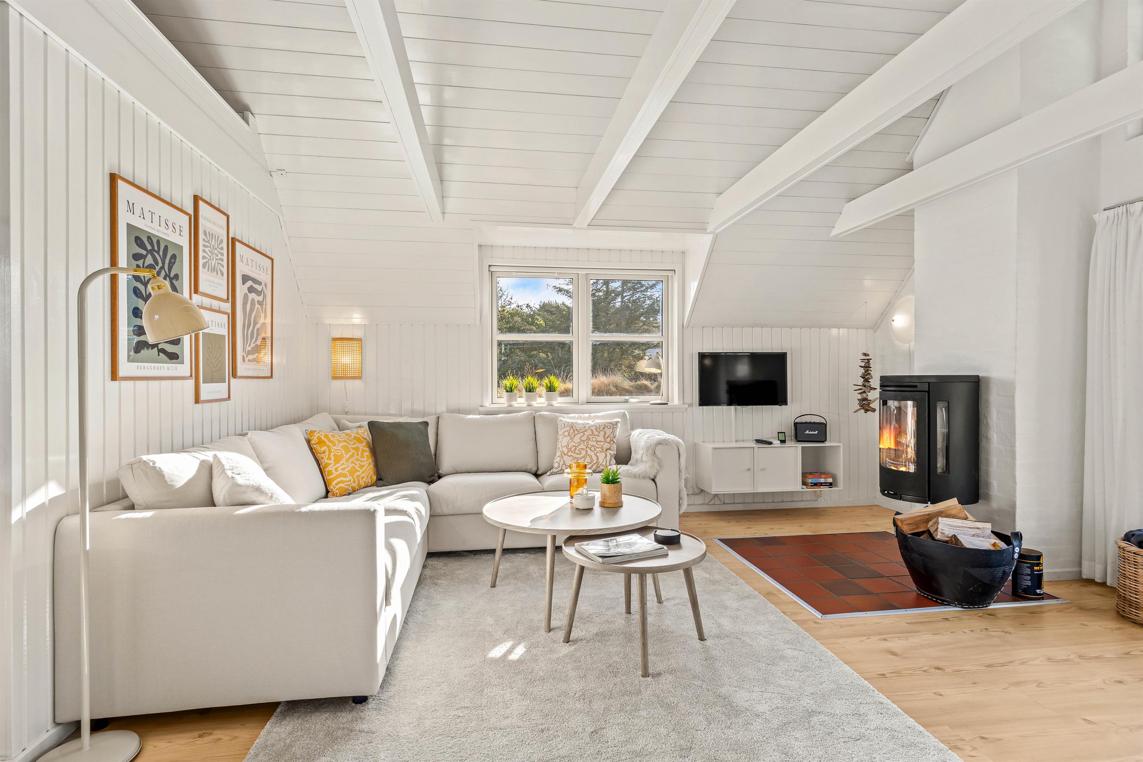 I den åbne opholdsstue sørger komfortable møbler og en brændeovn for ægte feriestemning, hvor I kan samle jer med en god bog, spille brætspil eller bare nyde roen foran de knitrende flammer. Rummets store vinduer lader dagslyset strømme ind og skaber en behagelig atmosfære, der inviterer til afslapning.