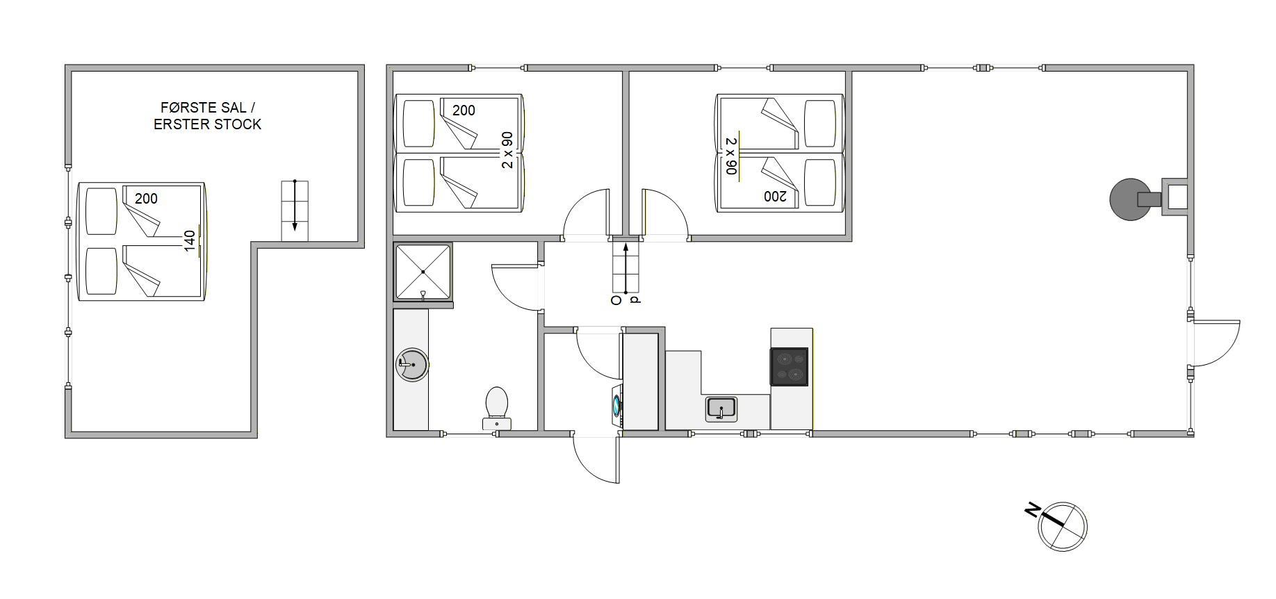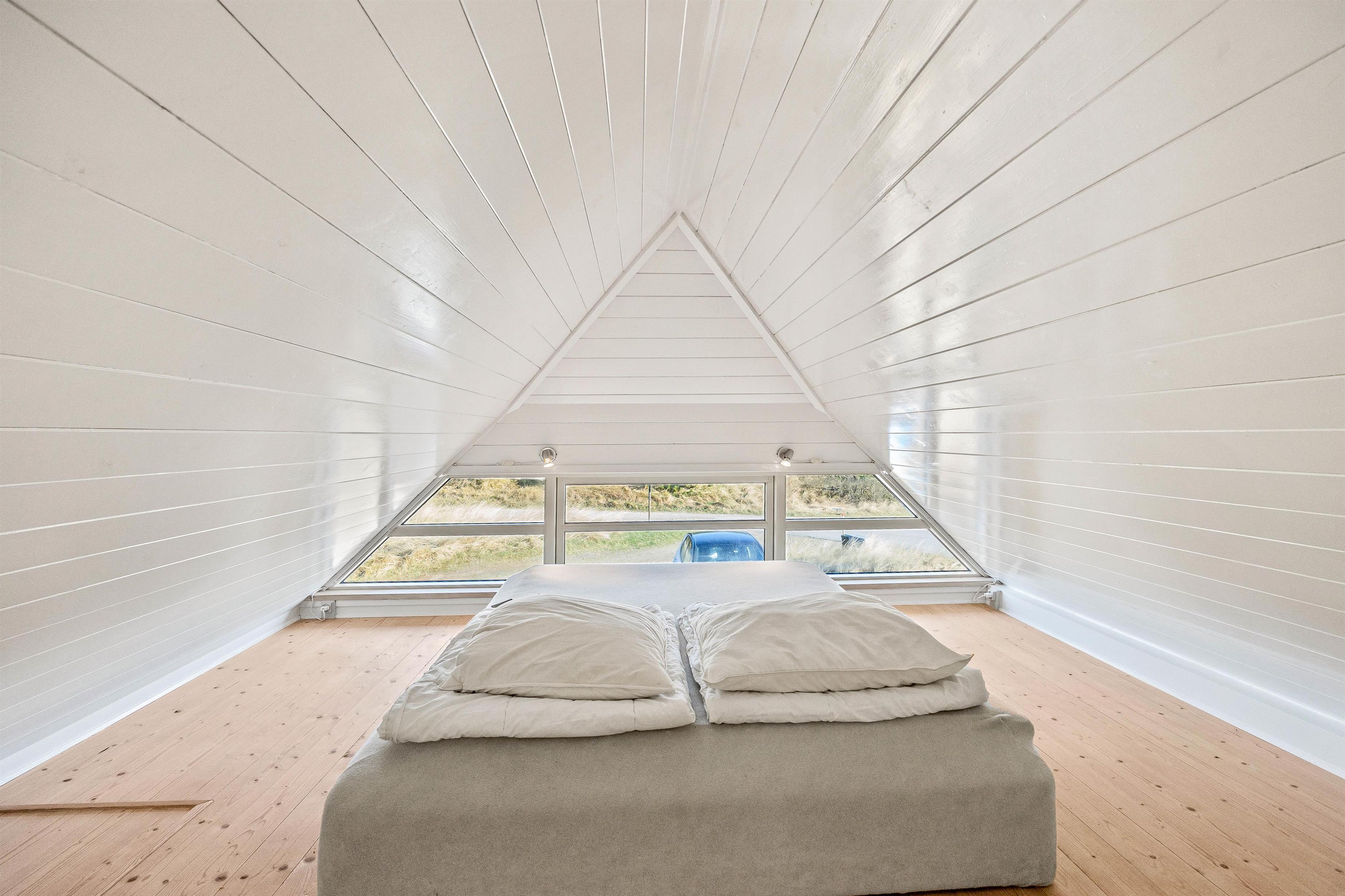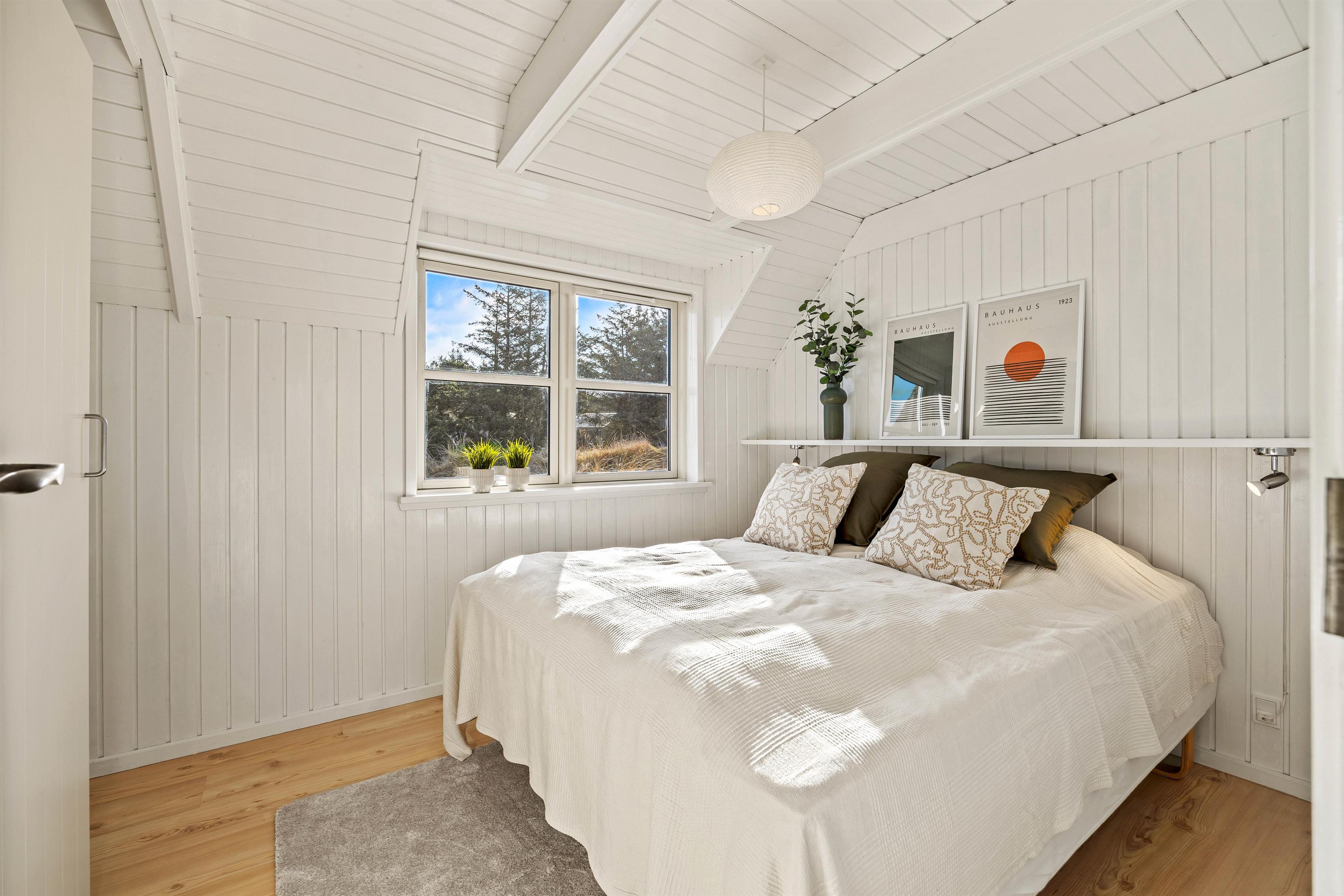 Sommerhuset byder på 2 rummelige soveværelser med dobbeltsenge samt en hyggelig hems med yderligere 2 sovepladser: Hemsen, som ligger lidt afskærmet over stuen, er især populær blandt familiens yngste, der elsker at have deres egen hyggelige soveplads. Vær opmærksom på, at stigen til hemsen er stejl.