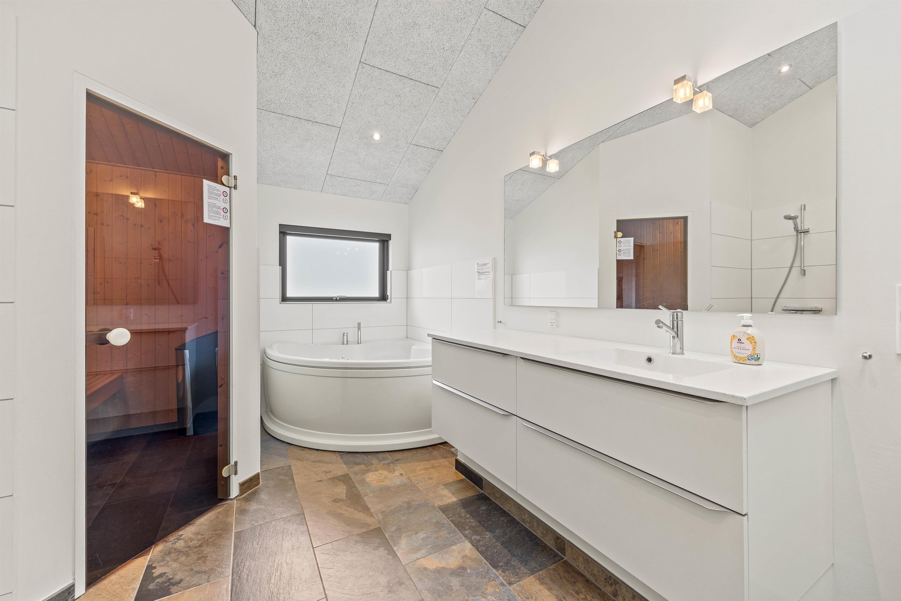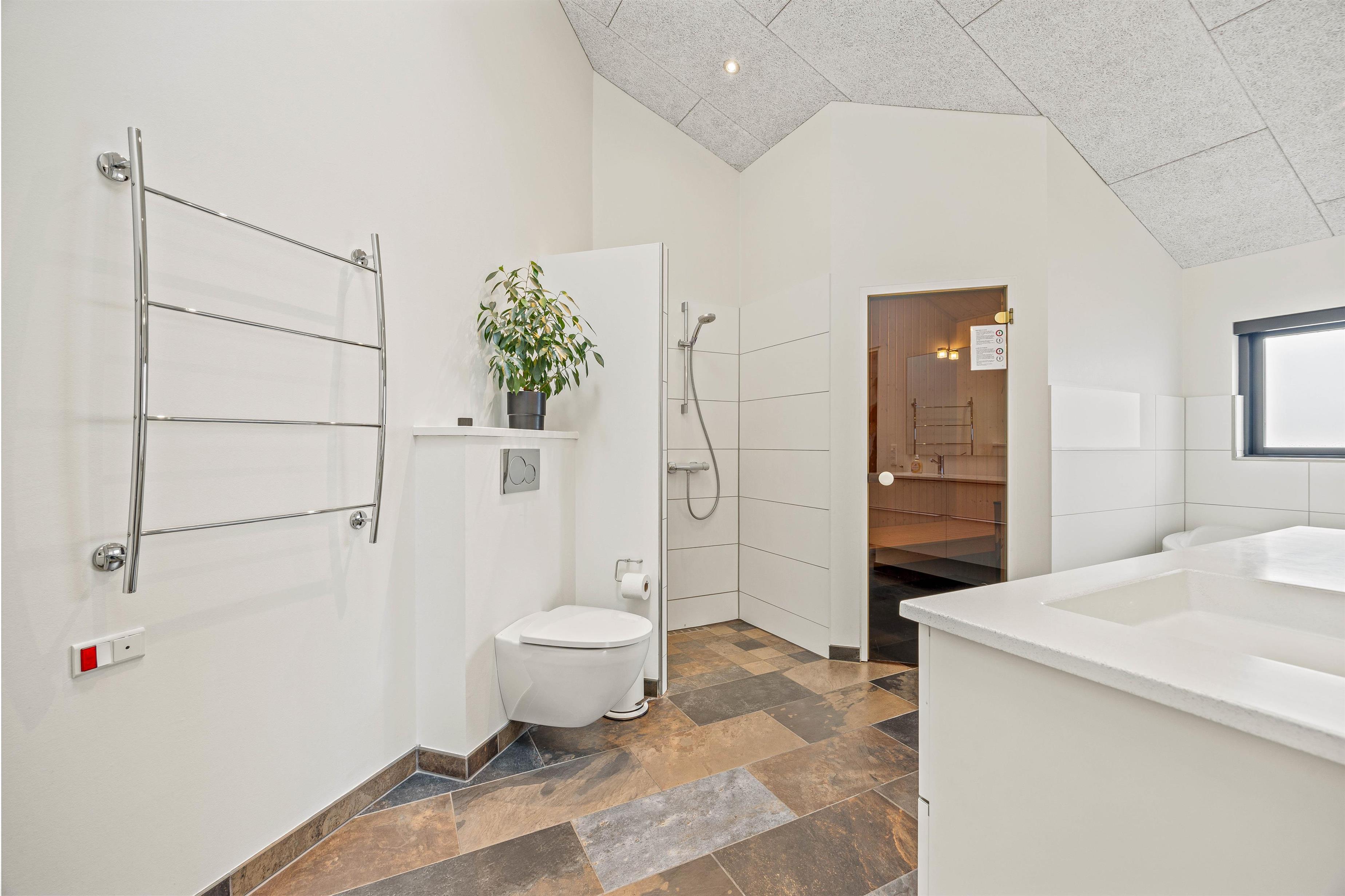 I det ene af de 2 flotte badeværelser, som begge er udstyret med gulvvarme, står der vaskemaskine og tørretumbler til rådighed, og kan I holde jeres tøj og håndklæder frisk under hele opholdet. For dem, der ønsker lidt ekstra luksus, tilbyder dette skønne sommerhus også en sauna samt en spa, perfekt til afslapning og nydelse efter en aktiv dag.