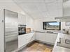 Det stilrene køkken, som er i åben forbindelse med stuen, er veludstyret, og indeholder en opvaskemaskine og en 80 L separat fryser. Det åbne opholdsområde er indrettet med moderne møbler og en hyggelig brændeovn, hvor I nemt kan samles efter en dag ved stranden. Desuden byder både danske og tyske tv-kanaler, en masse underholdning indendørs.