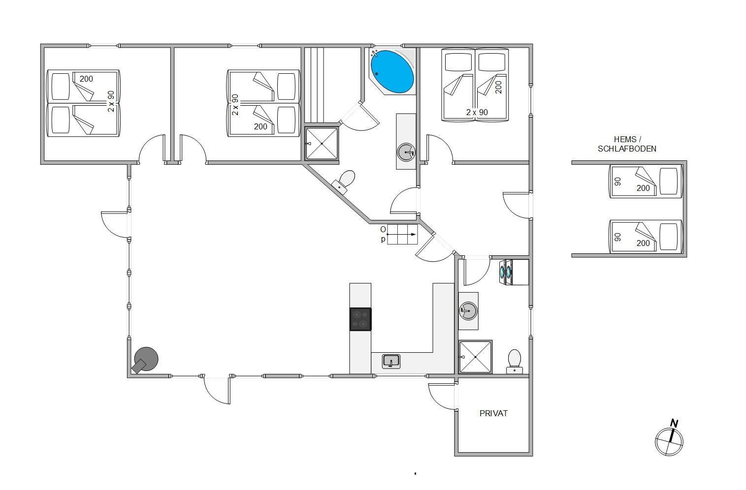 Dette sommerhus byder på en lang række faciliteter, der gør jeres ophold her behagelig og afslappet. Sovepladserne er fordelt over 3 soveværelser og en hems. De 3 rummelige værelser er alle udstyret med dobbeltsenge og fladskærms tv. På hemsen er der desuden 2 enkeltmadrasser – et ideelt sted for børnene at opholde sig.