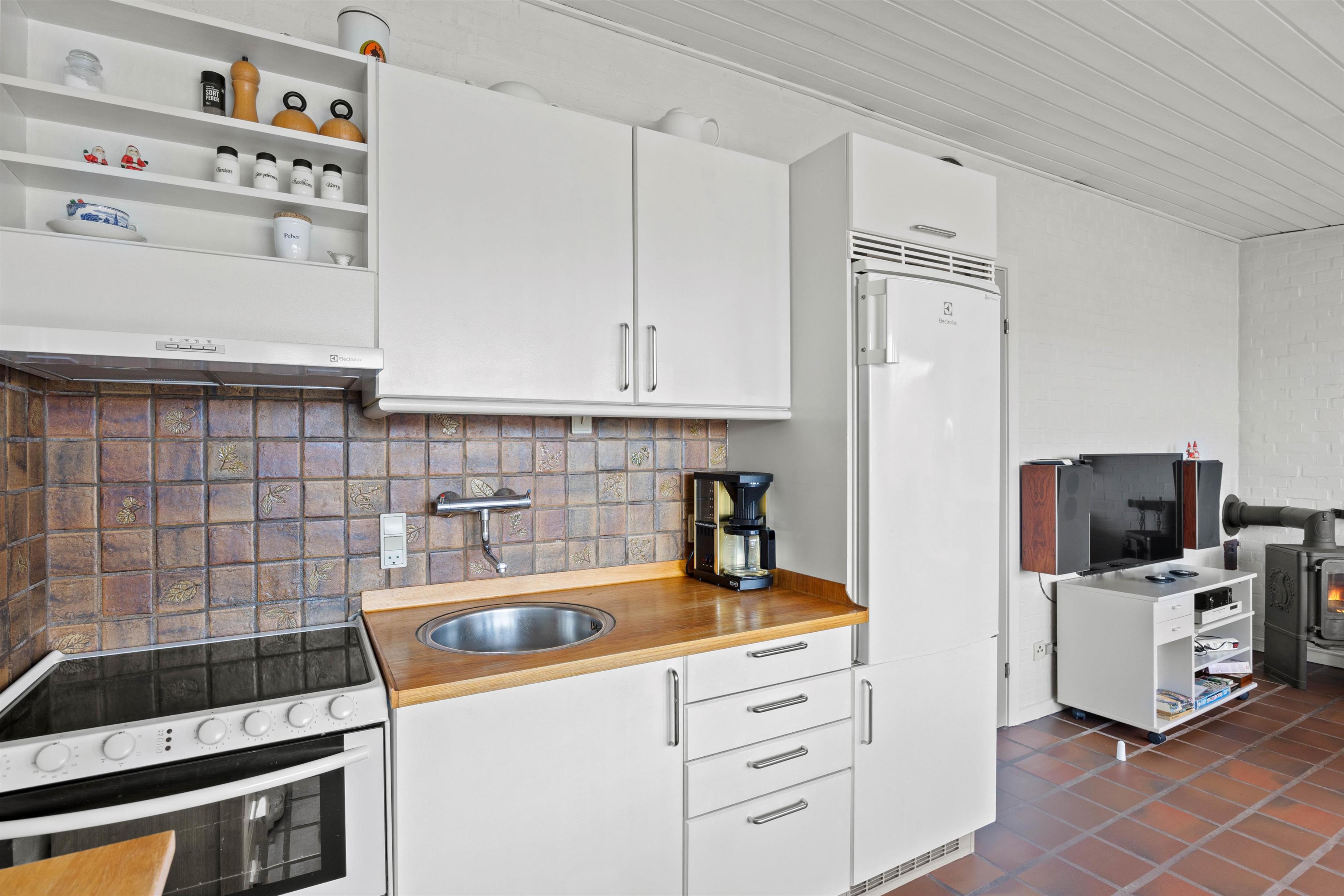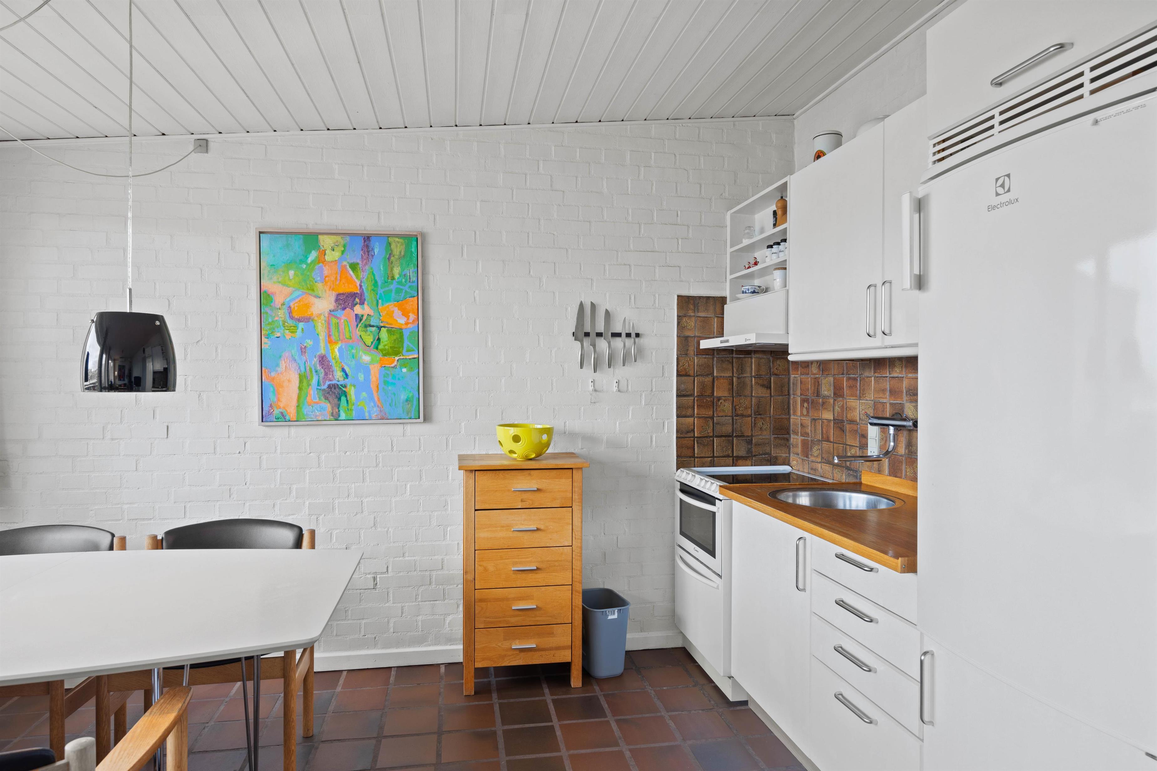 Fra den hyggeligt indrettede stue med det åbne køkken har I direkte udgang til terrassen. Køkkenet er udstyret med alt, der er brug for til tilberedelsen af lækre måltider. Rækkehuset er blandt andet indrettet med opvaskemaskine. Selvfølgelig har I også gratis Wlan i huset.