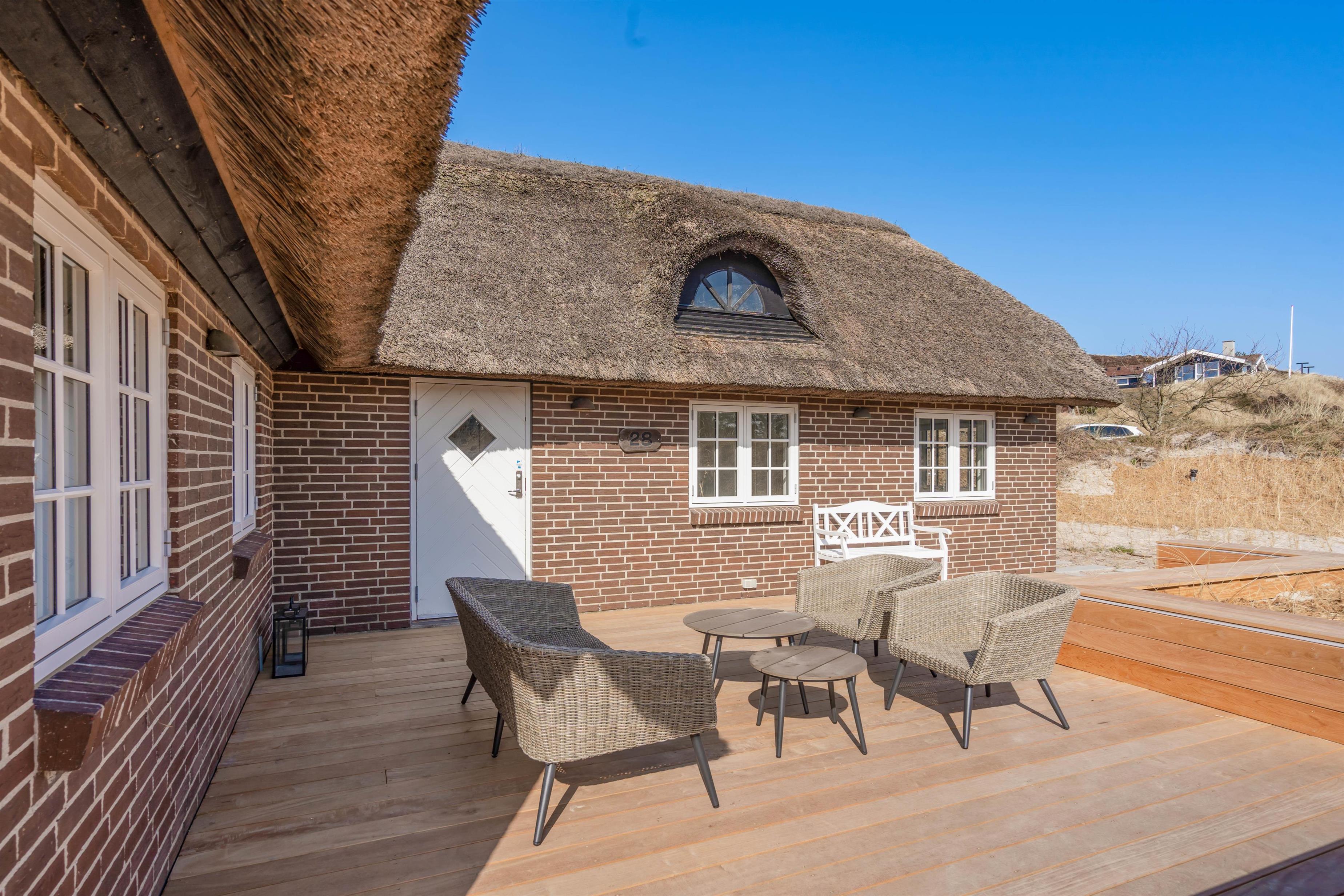 I 2021/22 moderniseret, står dette skønne stråtækte feriehus på Tyttebærvej 28 klar til at byde sine gæster velkommen. Det røde stenhus er indrettet med 3 gode soverum, 2 badeværelser og et moderne og lyst køkken. Det egner sig fantastisk, ikke kun til familieferien, men også til en skøn ferie ved Henne Strand sammen med op til 2 vennepar. Skulle I have jeres el-bil med, kan den lades op ved hjælp af feriehusets ladestander - eget kabel medbringes (type 2).