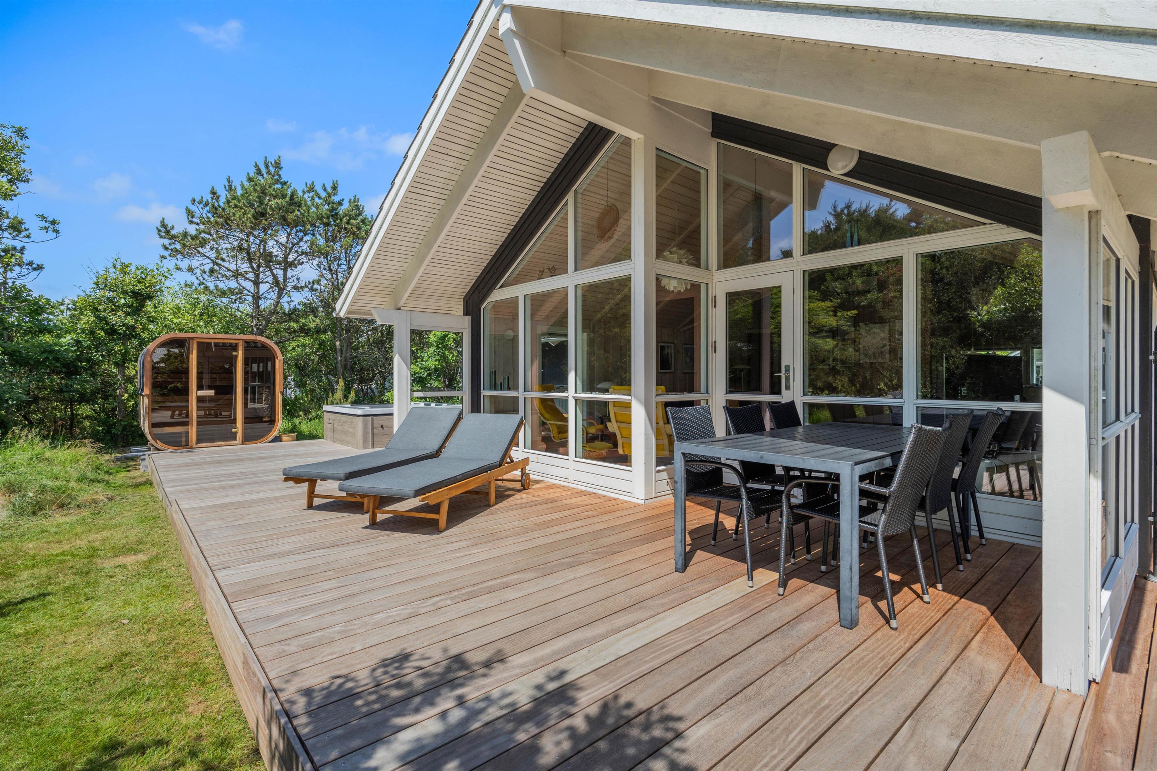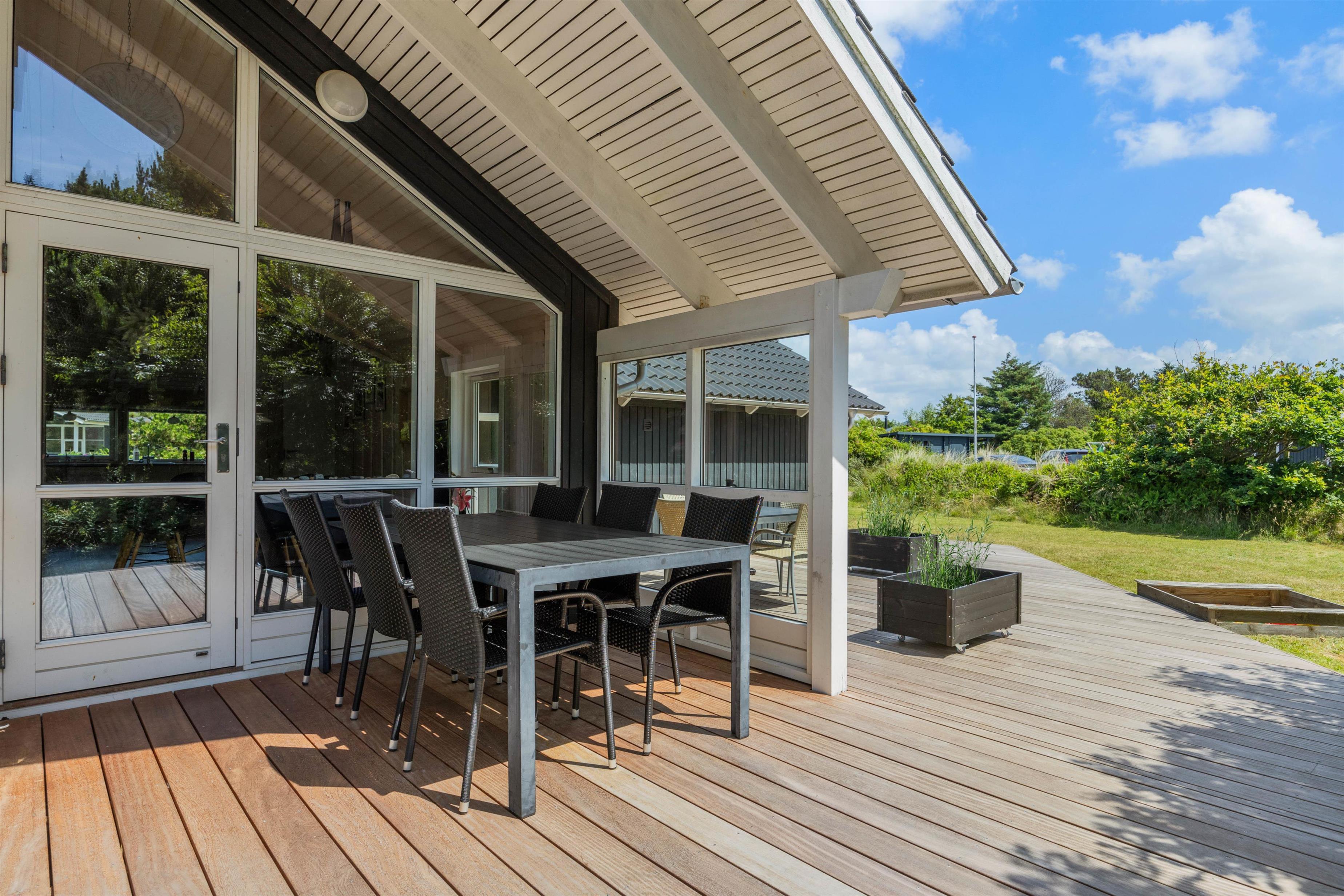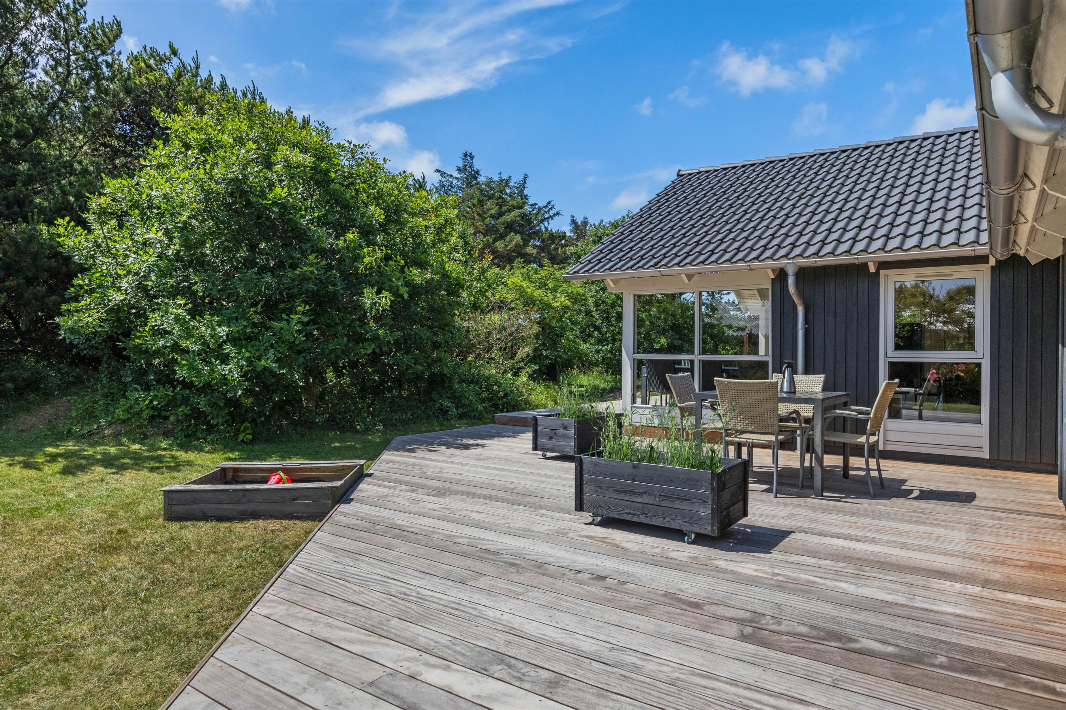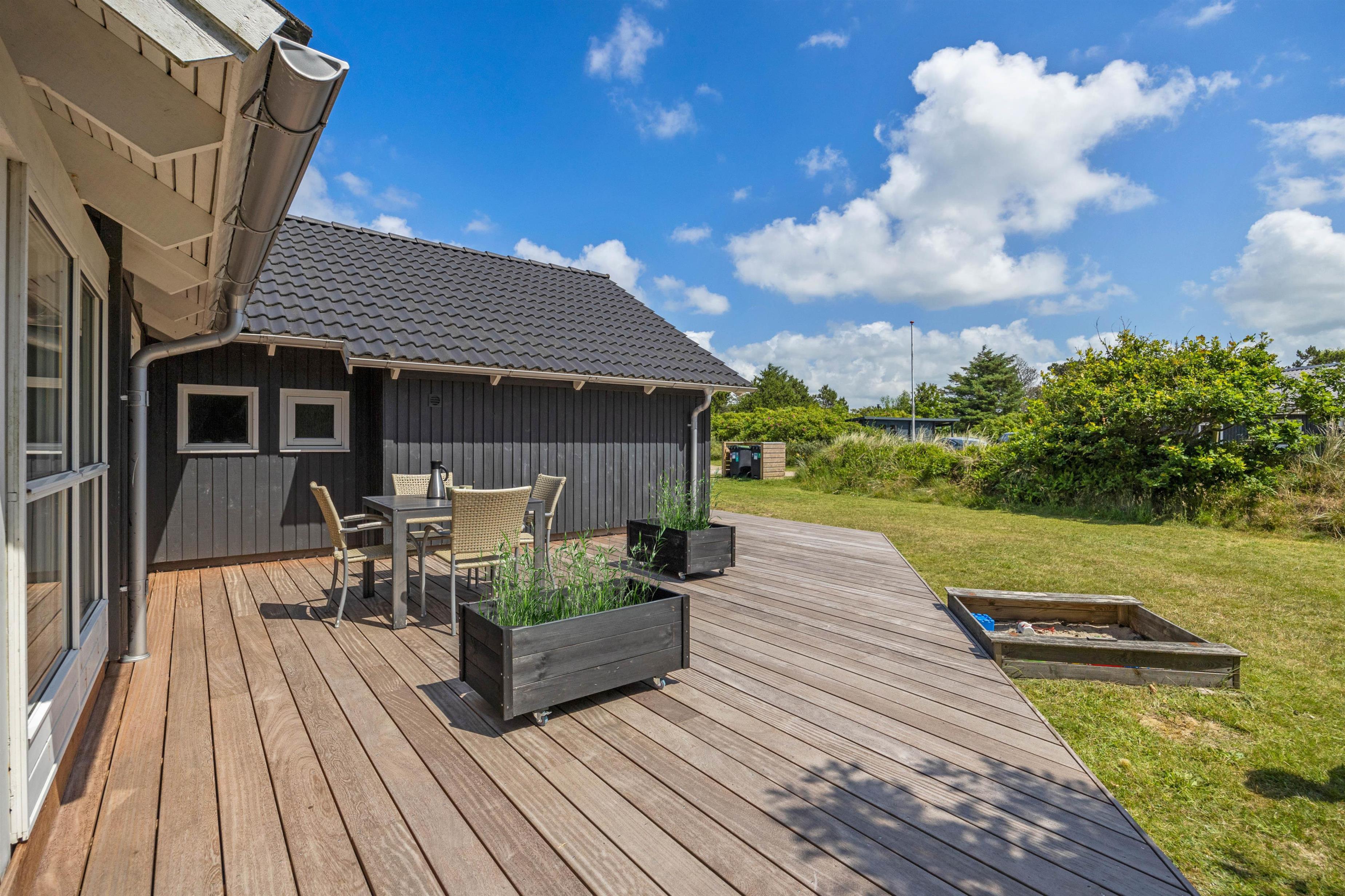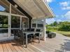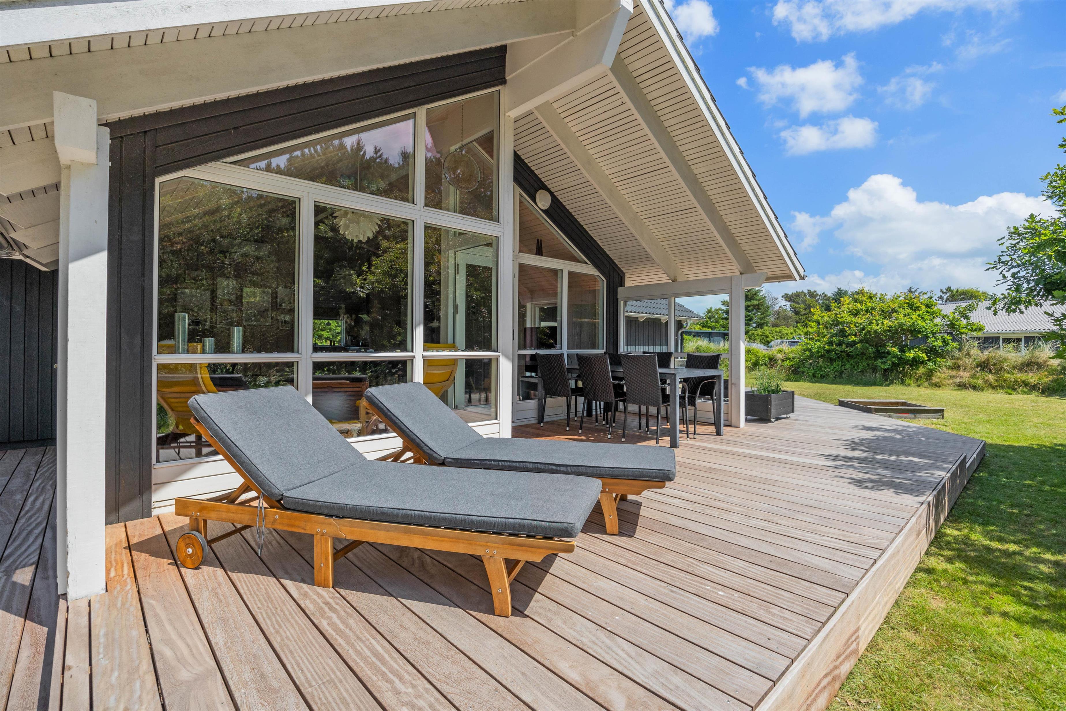 Allerede ved ankomsten til dette fine sommerhus, vil I straks møde feriestemningen. Den flotte træterrasse med dens forskellige lækroge rundt omkring ligger i den grad op til, at I kan nyde udelivet dagen lang. Her, på sommerhusets skønne og delvis overdækkede træterrasse, står gode havemøbler og solvogne til rådighed, så terrasserne kan nydes både dag og aften. Og når aftenens måltid skal tilberedes, kan I blot benytte sommerhusets grill.