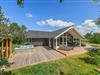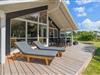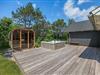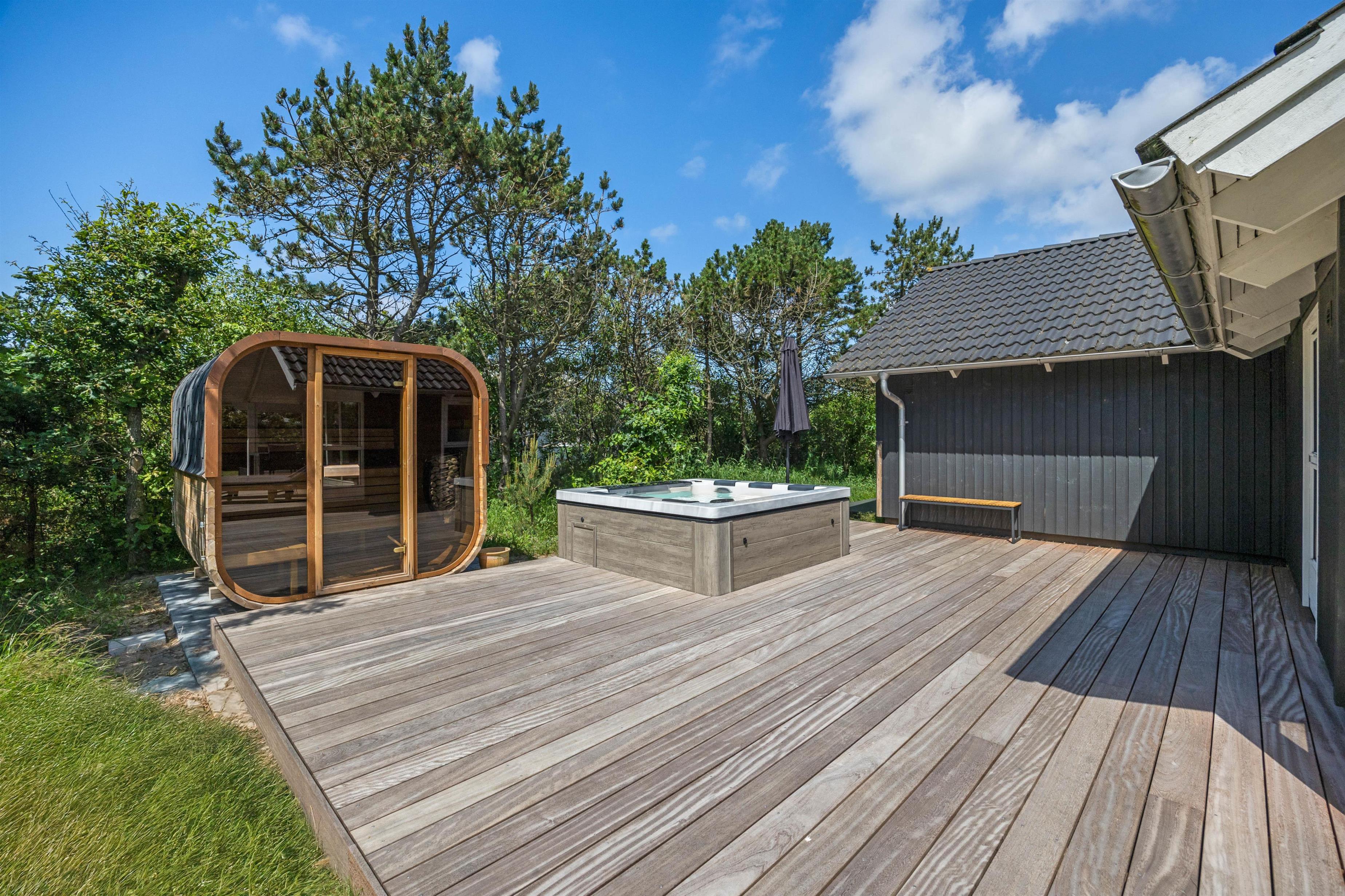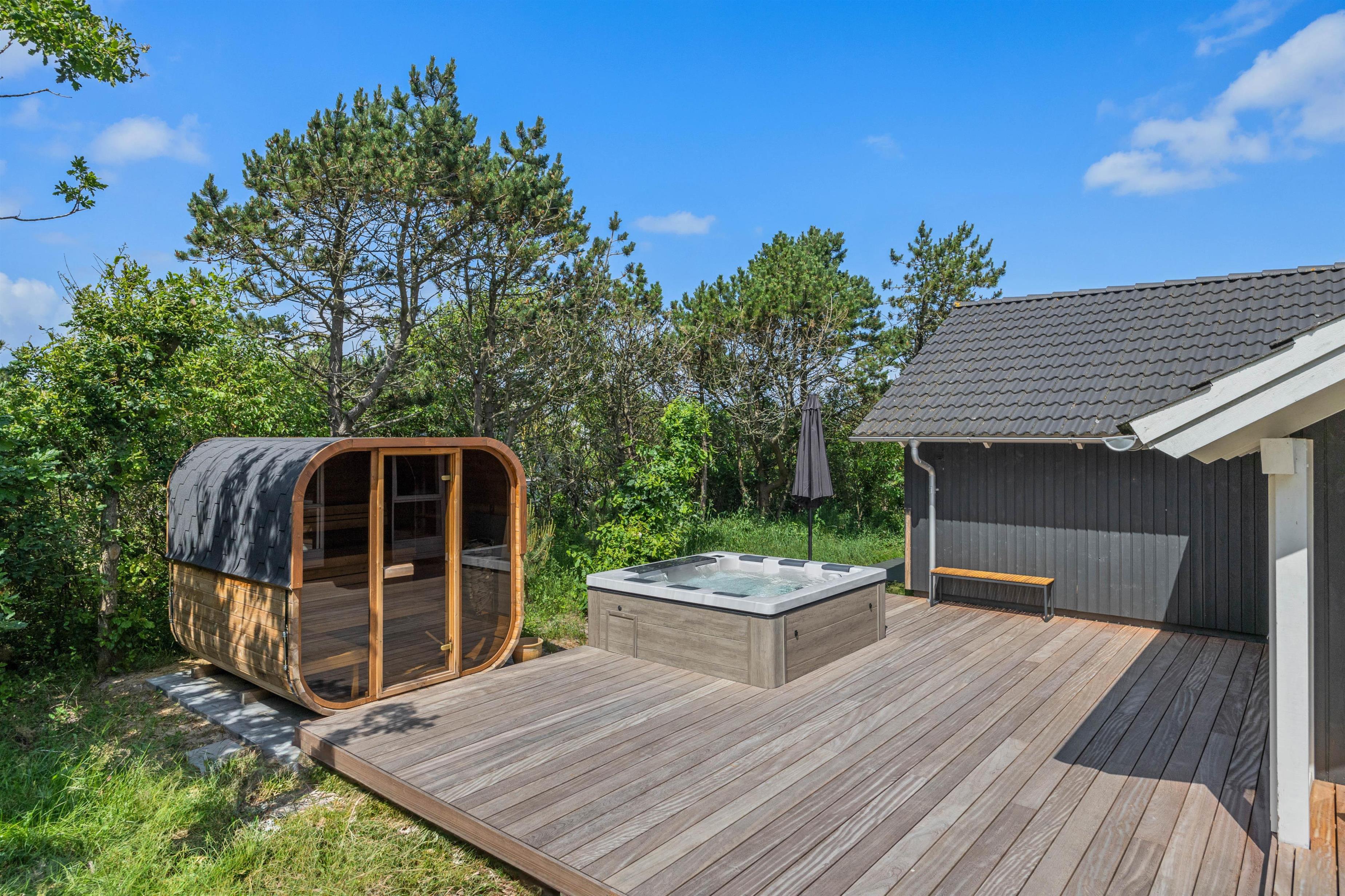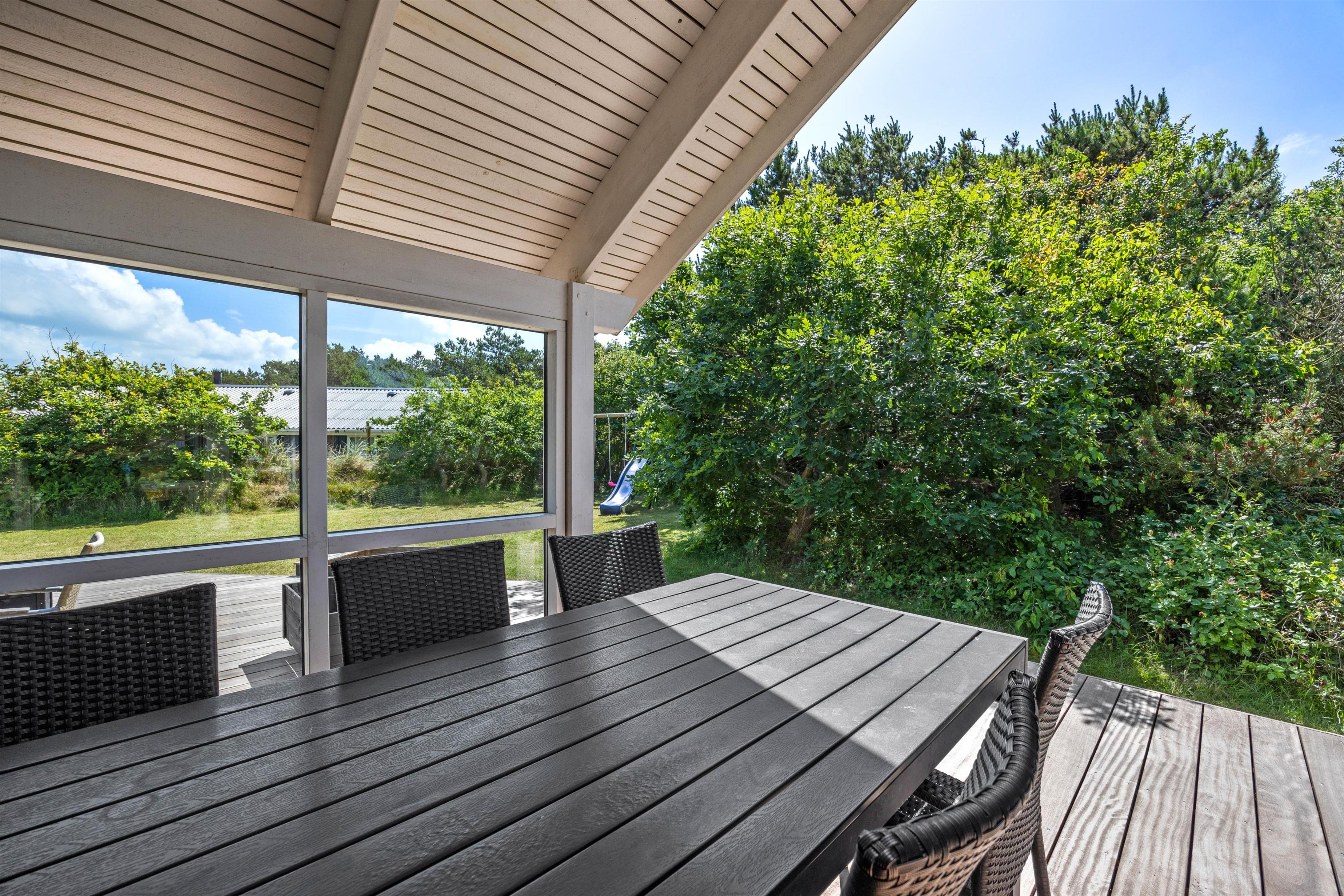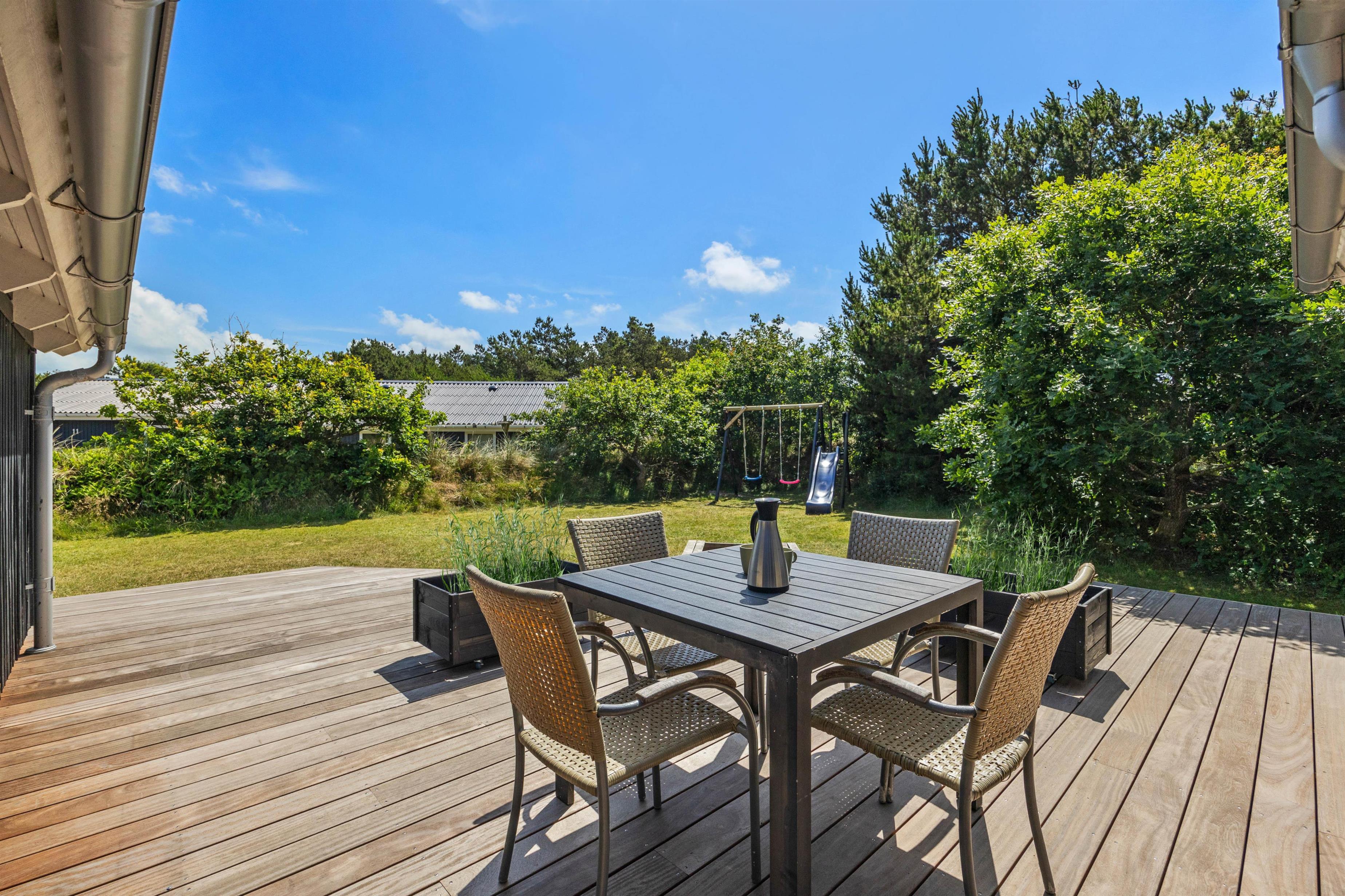 Allerede ved ankomsten til dette fine sommerhus, vil I straks møde feriestemningen. Den flotte træterrasse med dens forskellige lækroge rundt omkring ligger i den grad op til, at I kan nyde udelivet dagen lang. Her, på sommerhusets skønne og delvis overdækkede træterrasse, står gode havemøbler og solvogne til rådighed, så terrasserne kan nydes både dag og aften. Og når aftenens måltid skal tilberedes, kan I blot benytte sommerhusets grill.