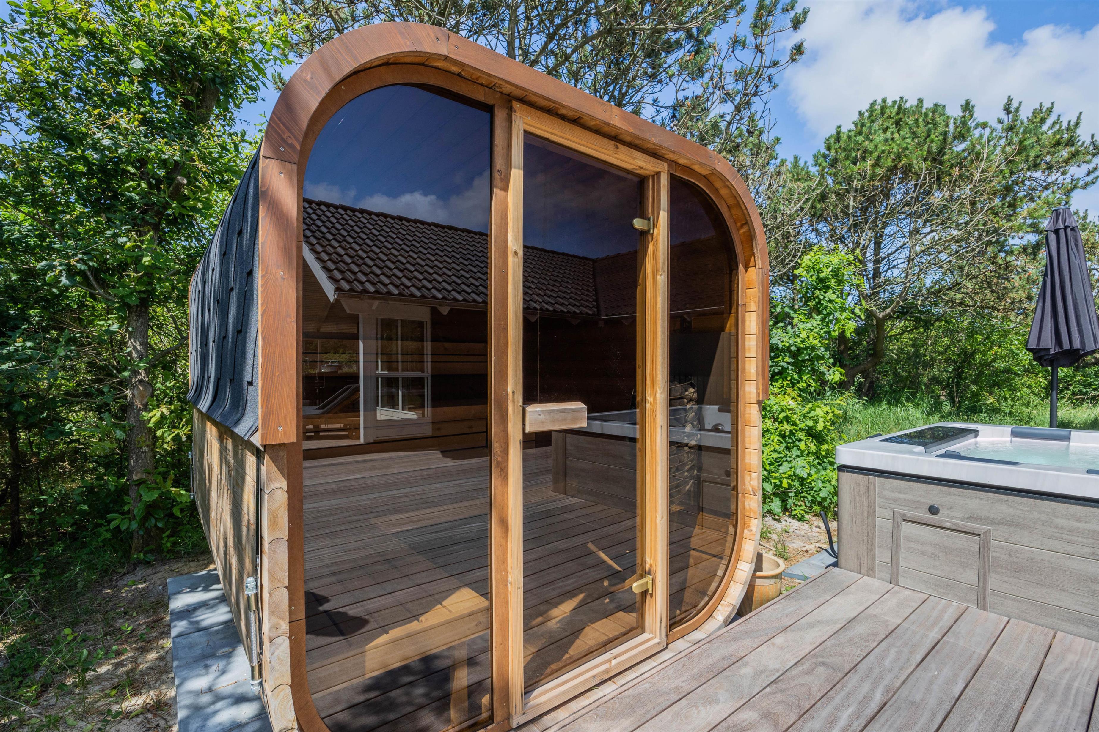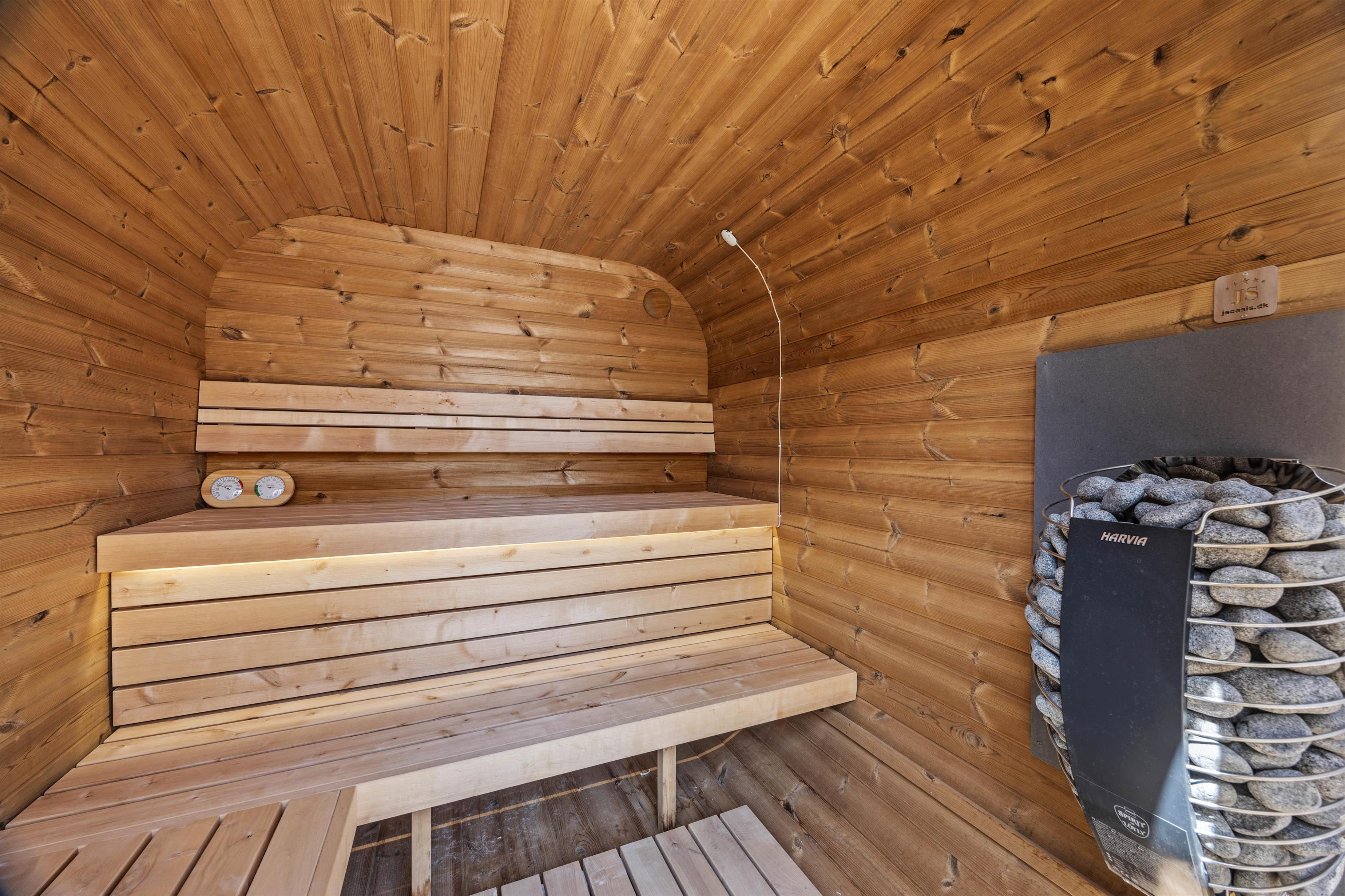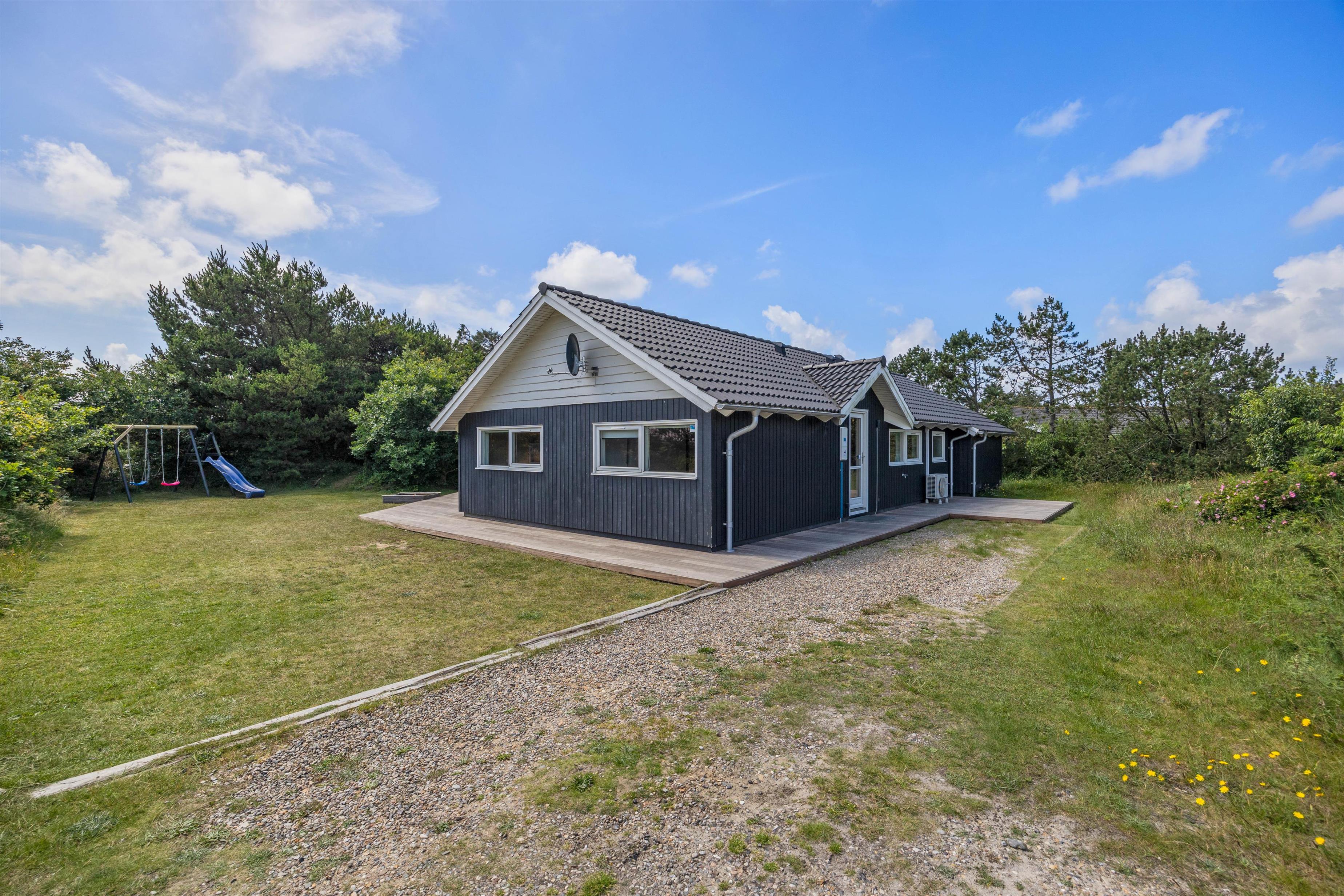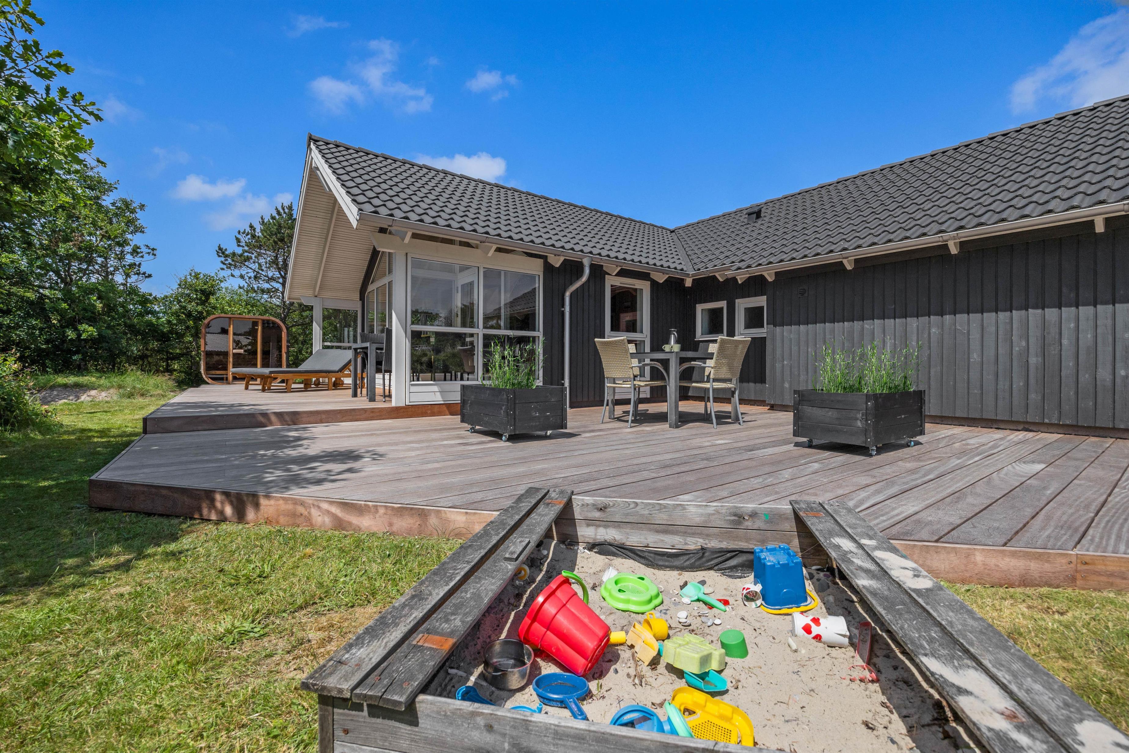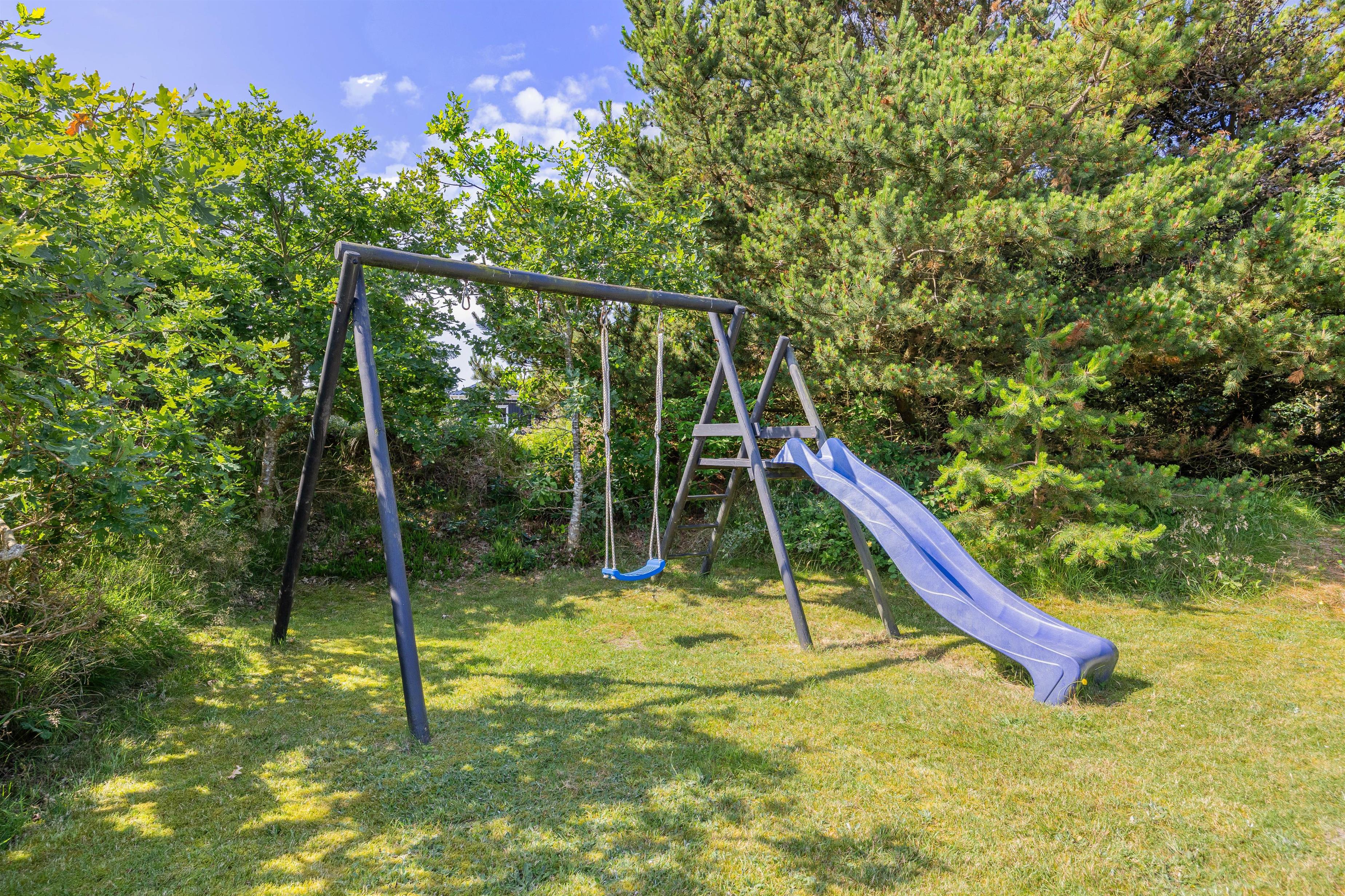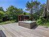 Godt afskærmet af træer og buske vil I på din store plænegrund kunne nyde afslappende feriedage - med både sandkasse og et legestativ med gynge er der rigeligt plads for også de mindste at boltre sig på. I kan også nyde en skøn udesauna ved dette sommerhus.