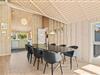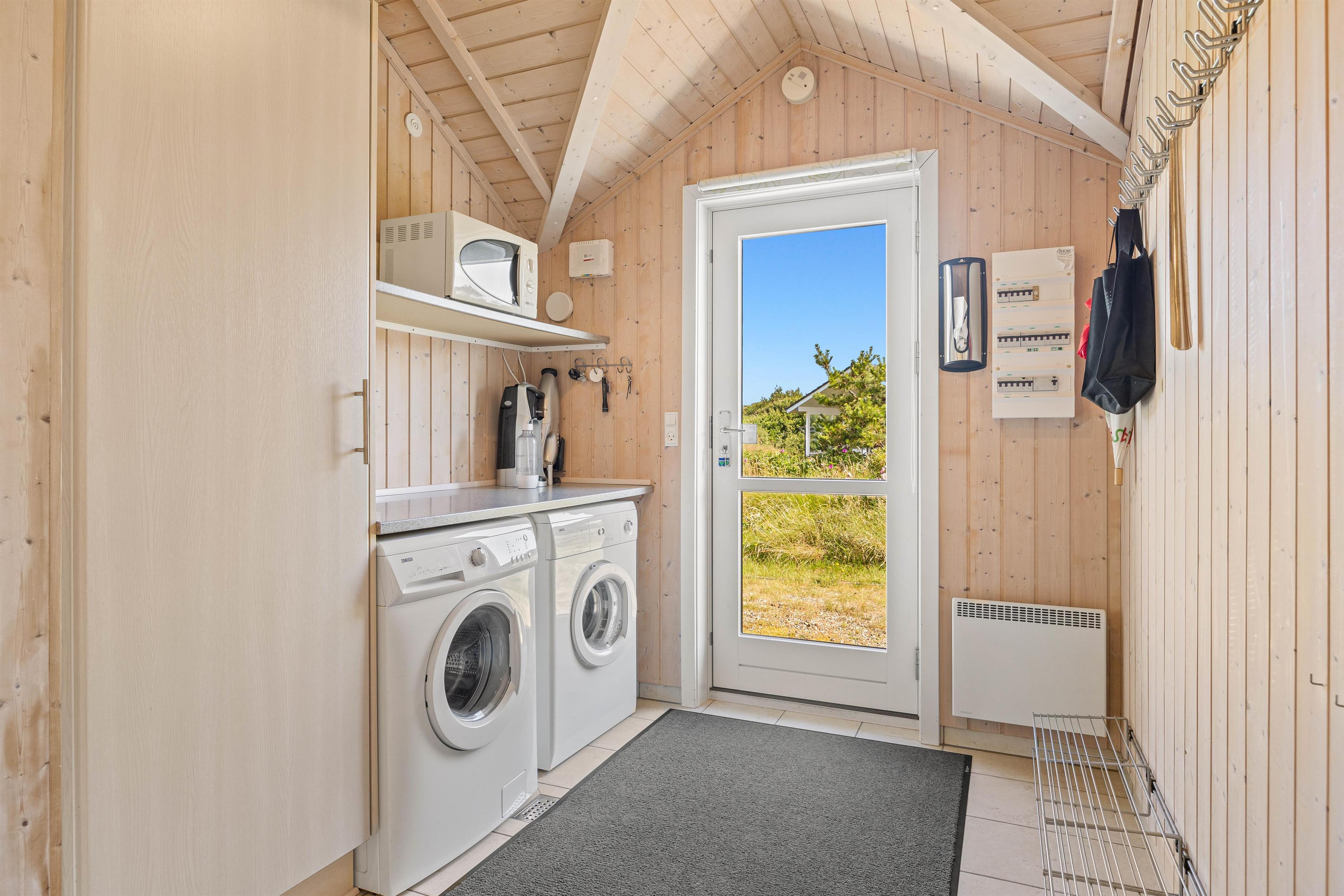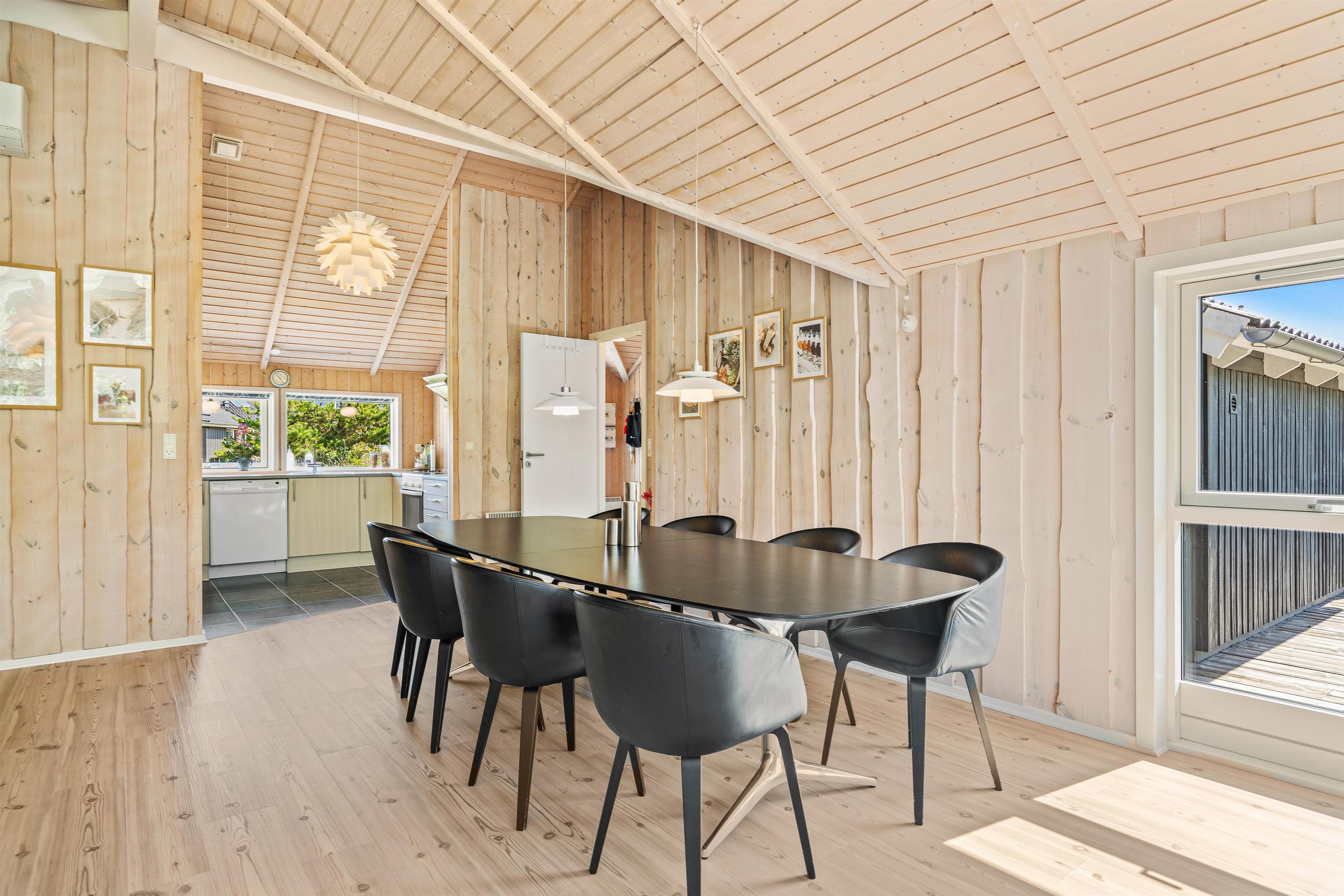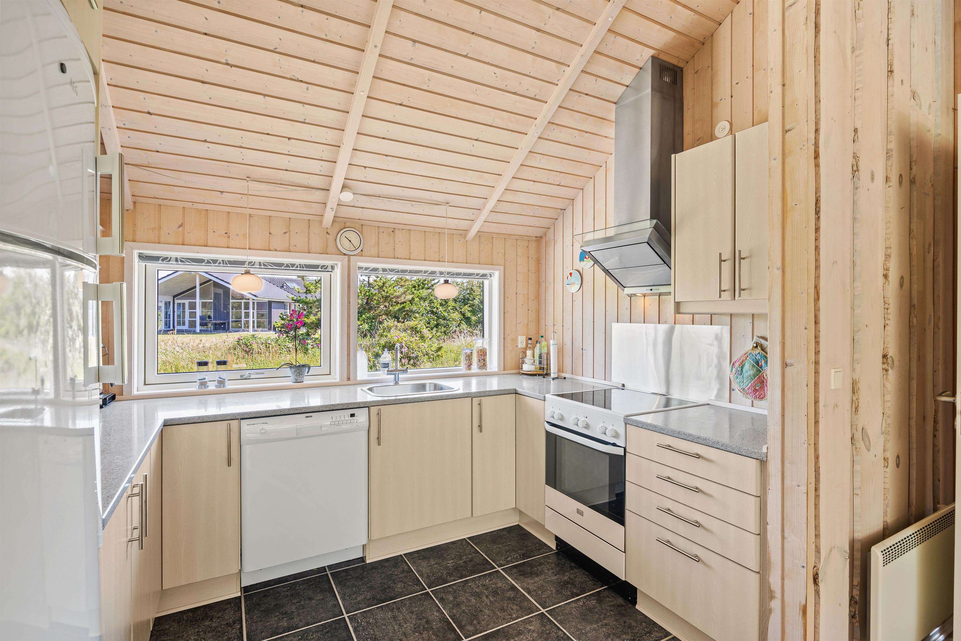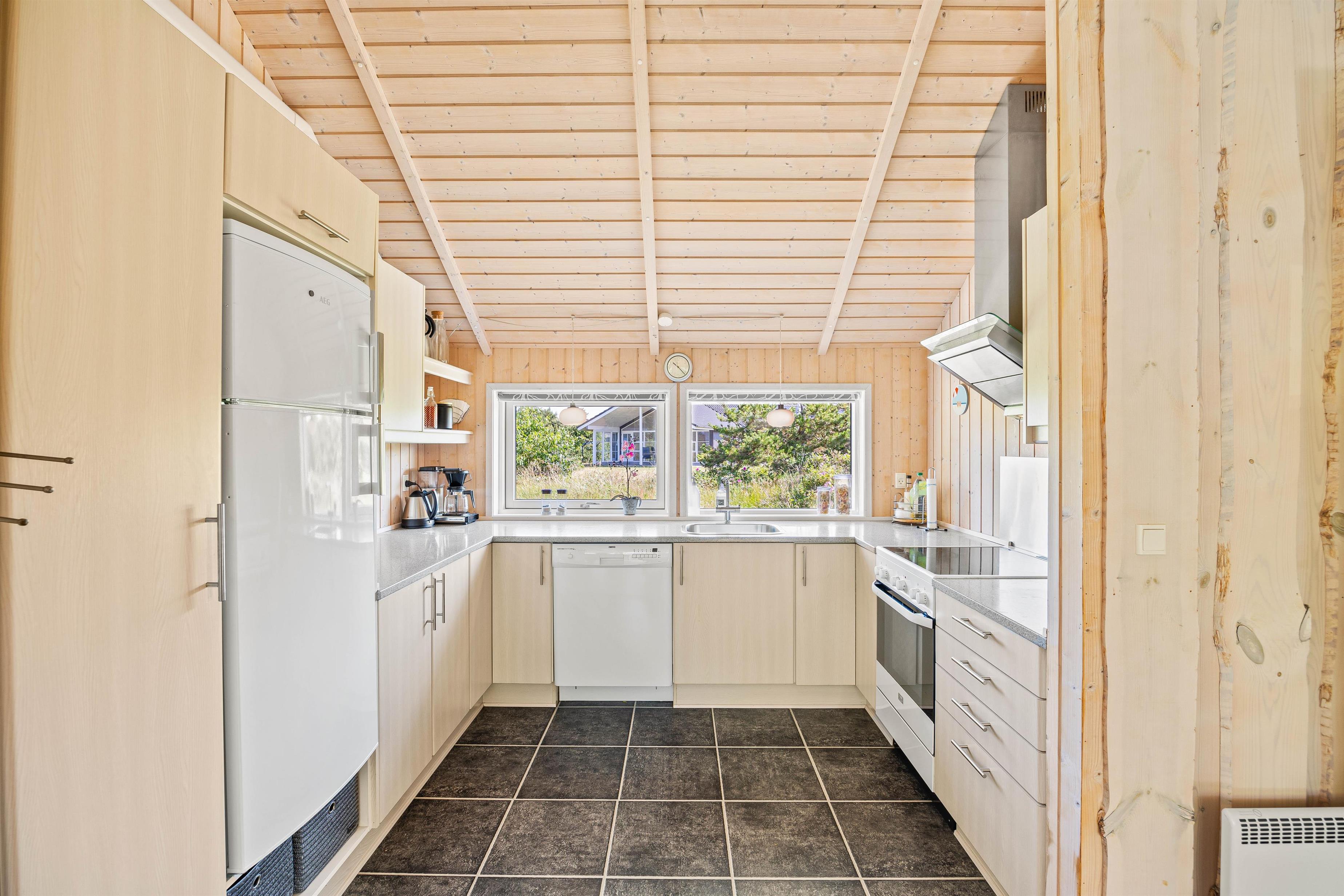 Indendørs møder I et lyst, rummeligt og velmøbleret sommerhus. Med et lyst loft til kip, strømmer der det skønneste lysindfald fra de store vinduer ud i sommerhuset. De mange vinduer giver også rig mulighed for at kigge ud på den enestående natur, som omgiver dette sommerhus. Det veludstyrede køkken ligger i forlængelsen af spisestuen, med både mikroovn og opvaskemaskine. Vaskemaskinen og tørretumbler i entreen er jer behjælpelige med de praktiske opgaver omkring tøjvask, så I vil have endnu mere tid til at slappe af og holde ferie.