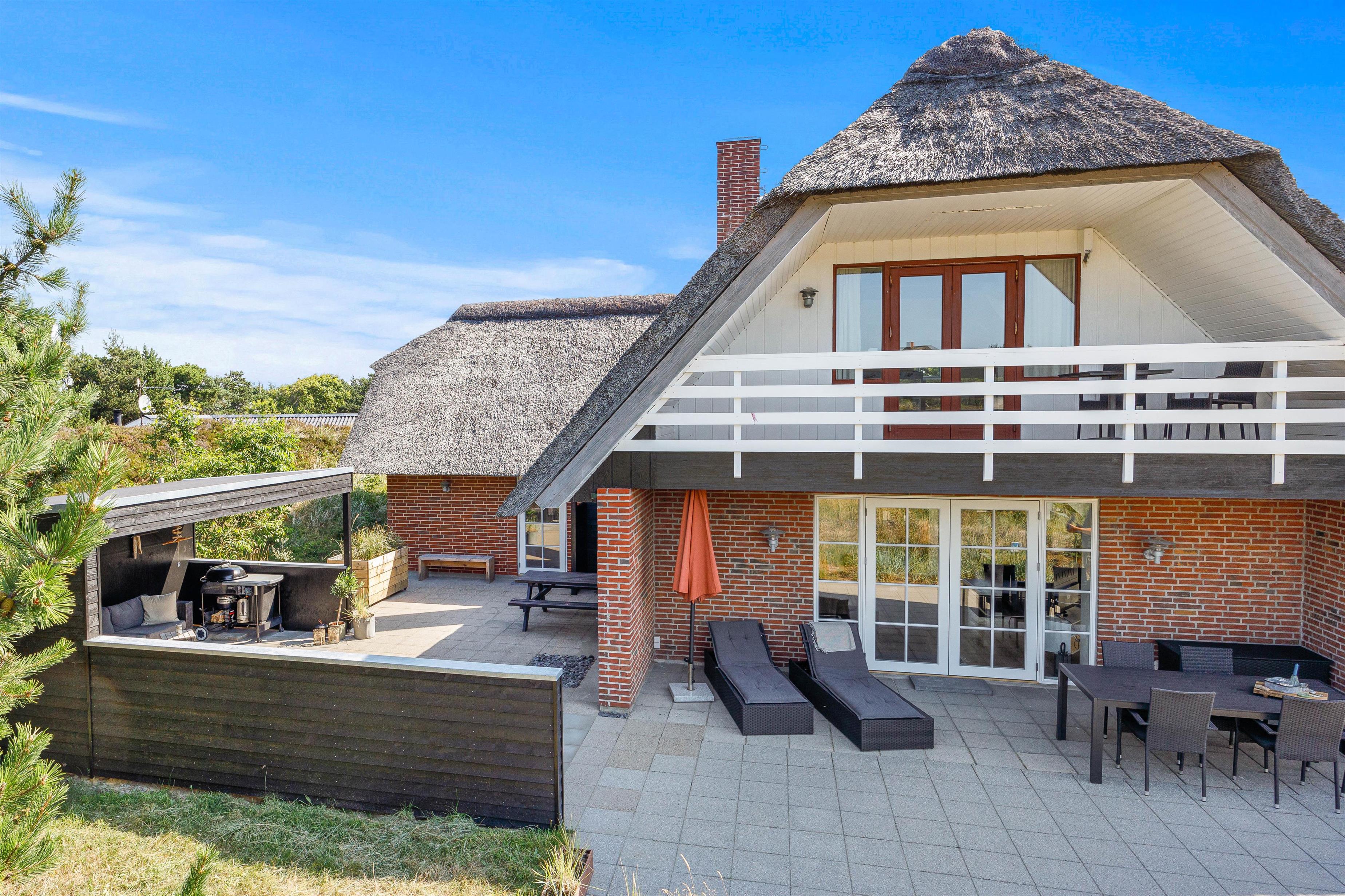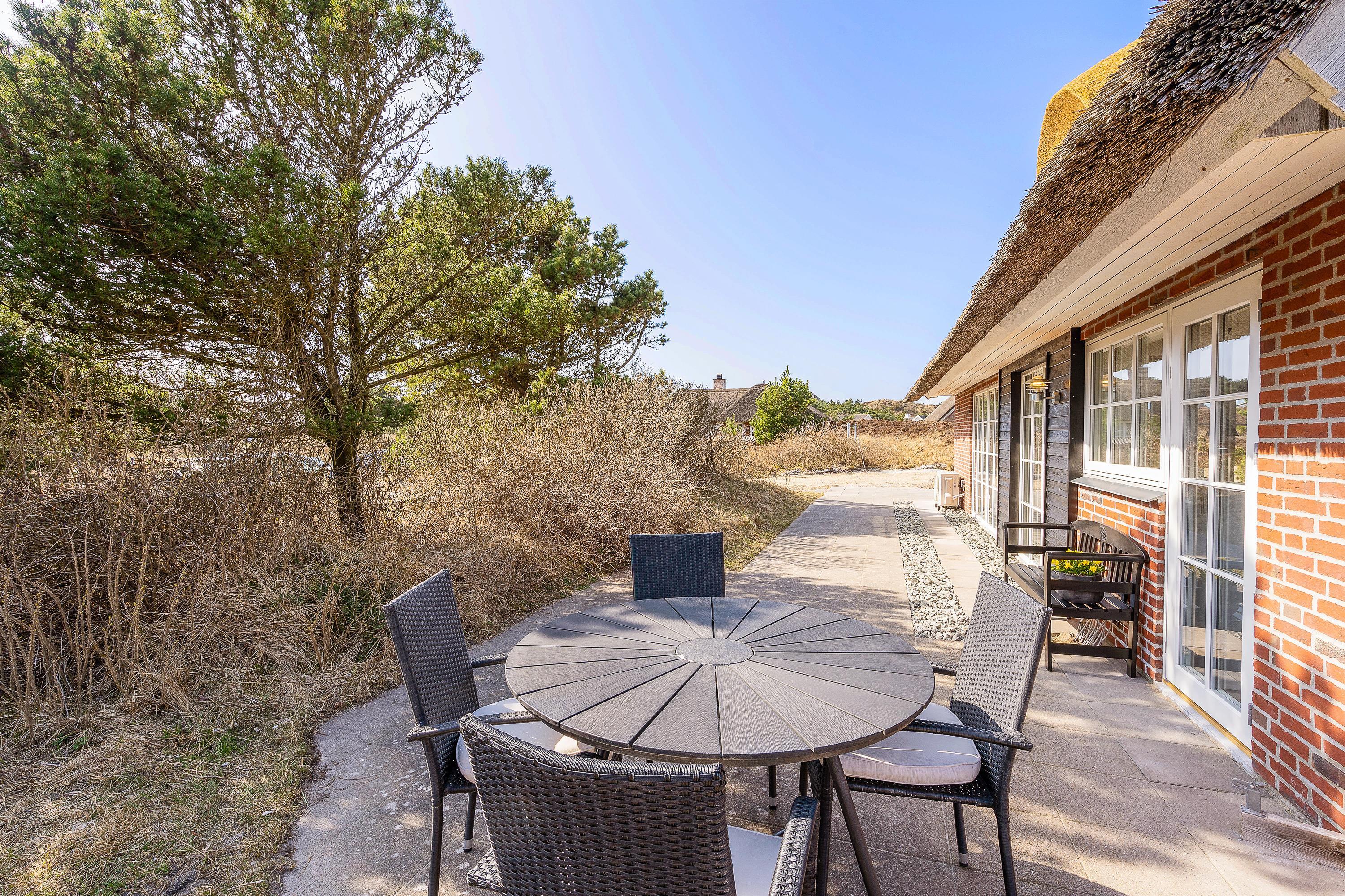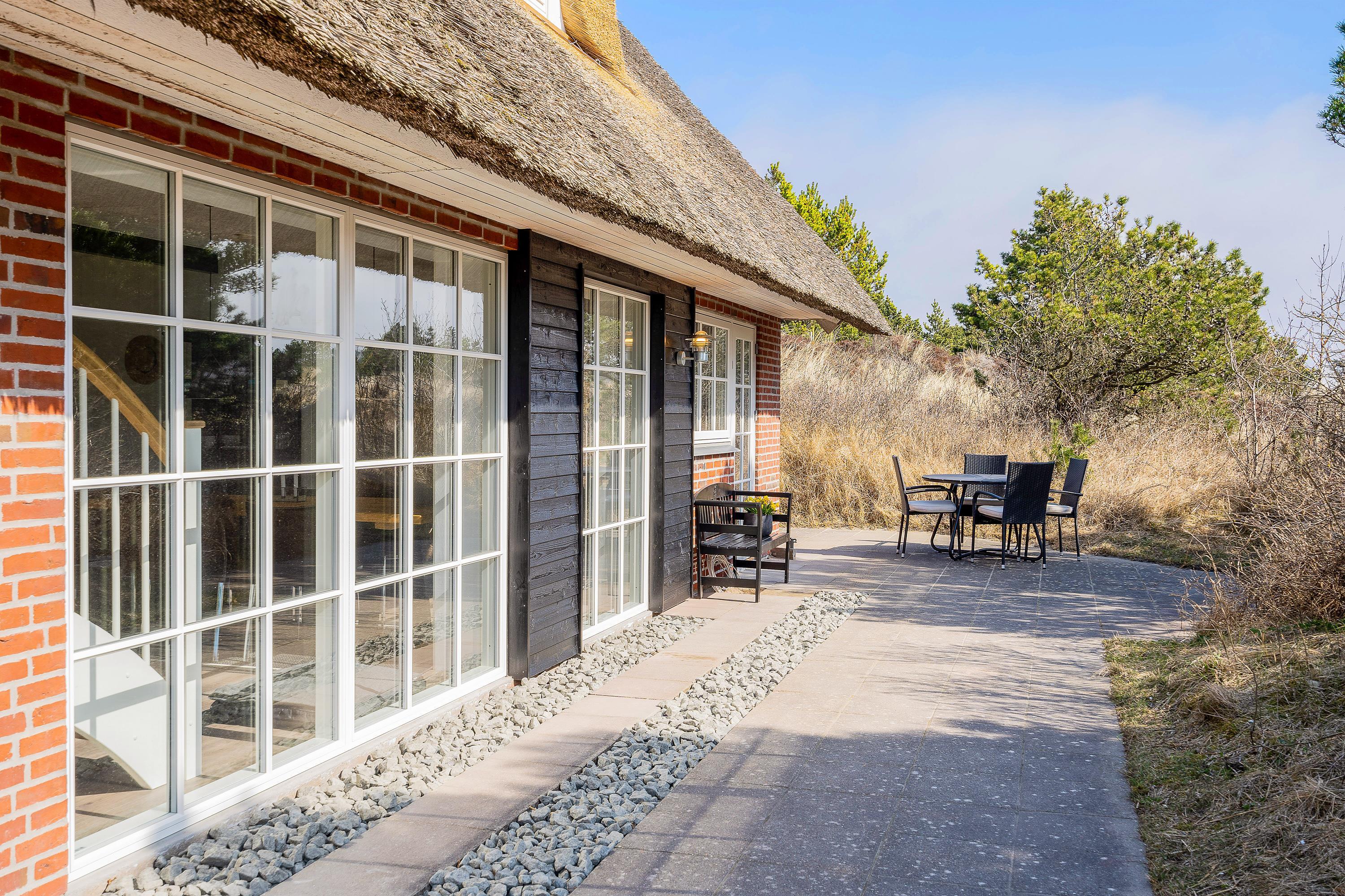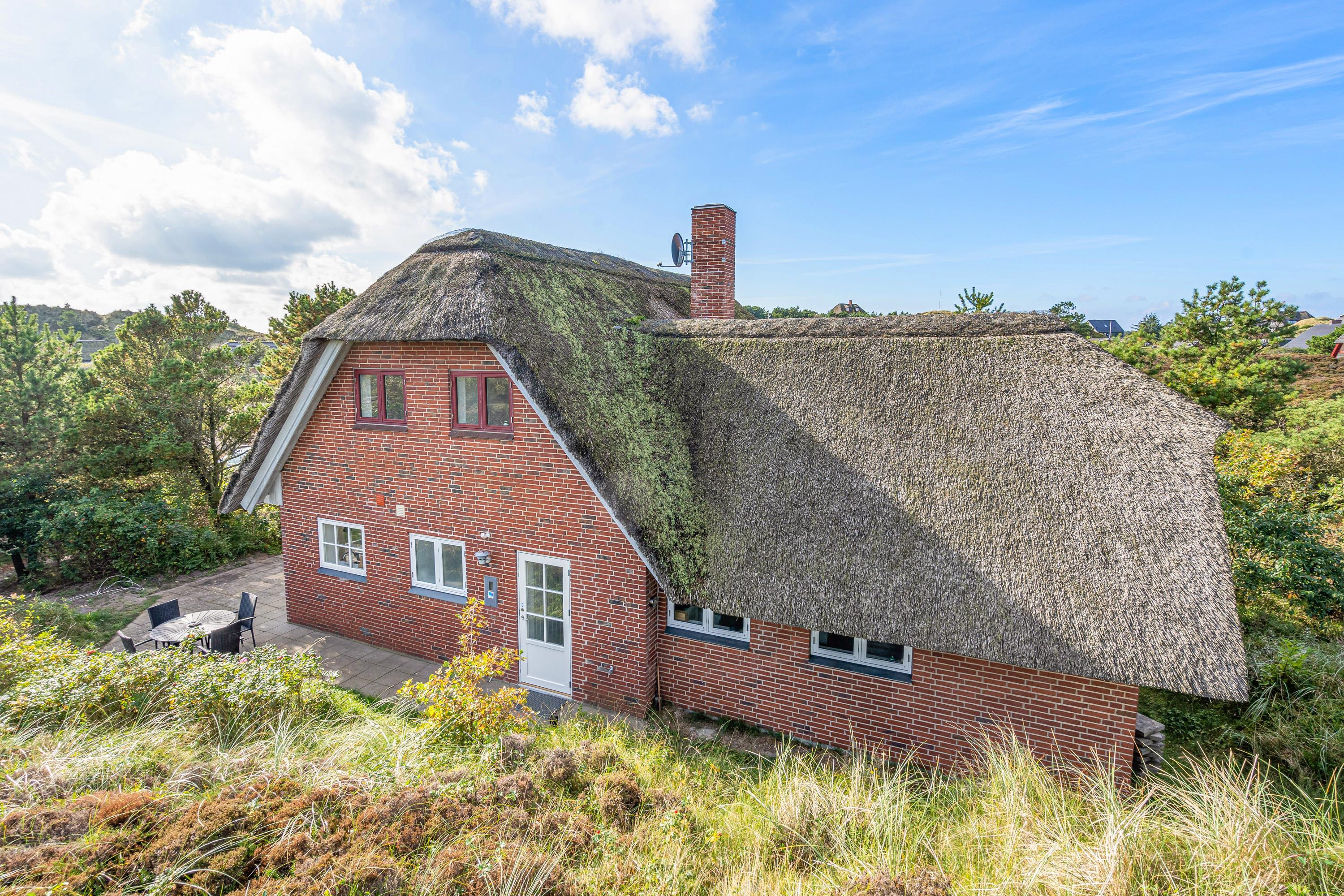 Det røde murstenshus med stråtag, der har gennemgået en stor renovering i 2021 passer så fint ind i landskabet med lyng og fyrretræer. Her er stemningen lagt til en hyggelig og afslappende ferie.