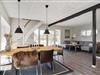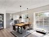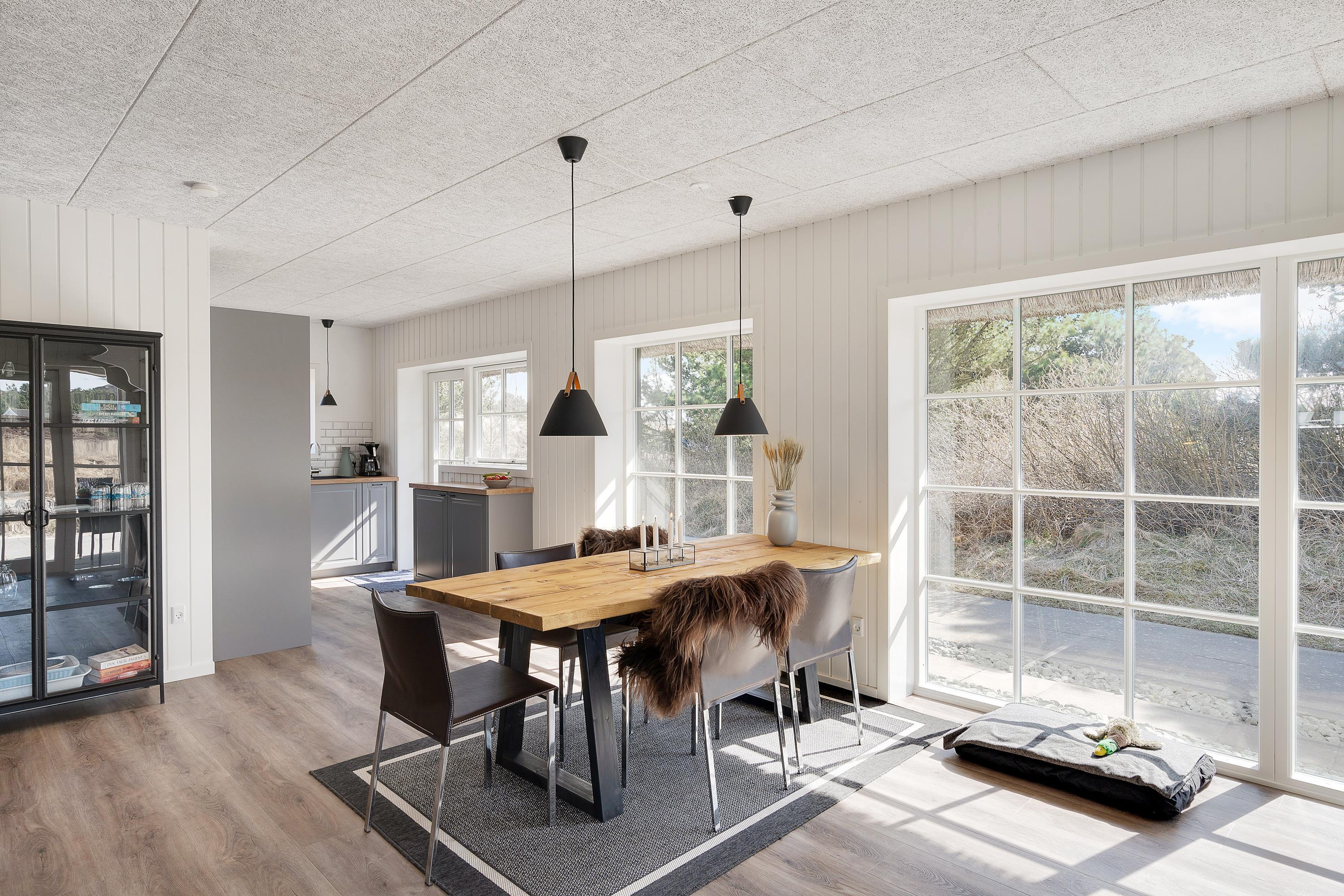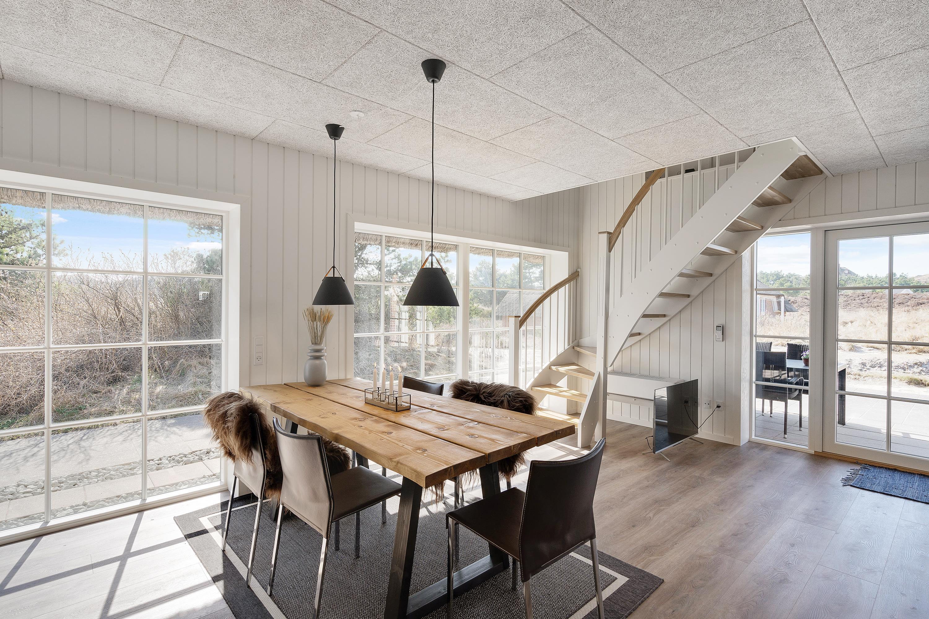 Imens syvsoverne nyder ferieroen på første sal, kan dagen begynde i stueetagen, hvor både køkken og bad samt et stort soverum befinder sig. Det store fællesrum med åbent køkken og opholdsstue med brændeovnen er det oplagte samlingssted for familiehyggetid.
