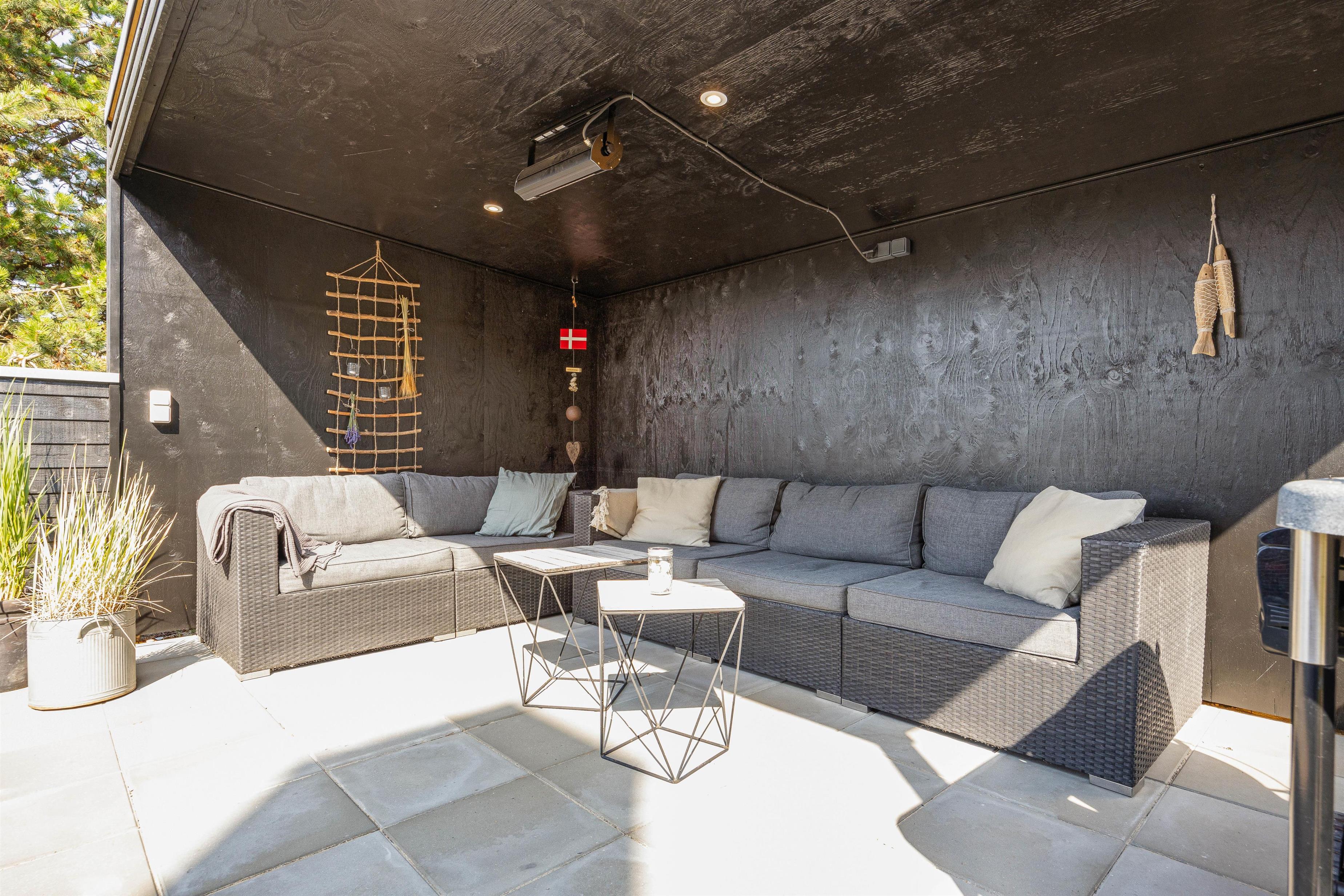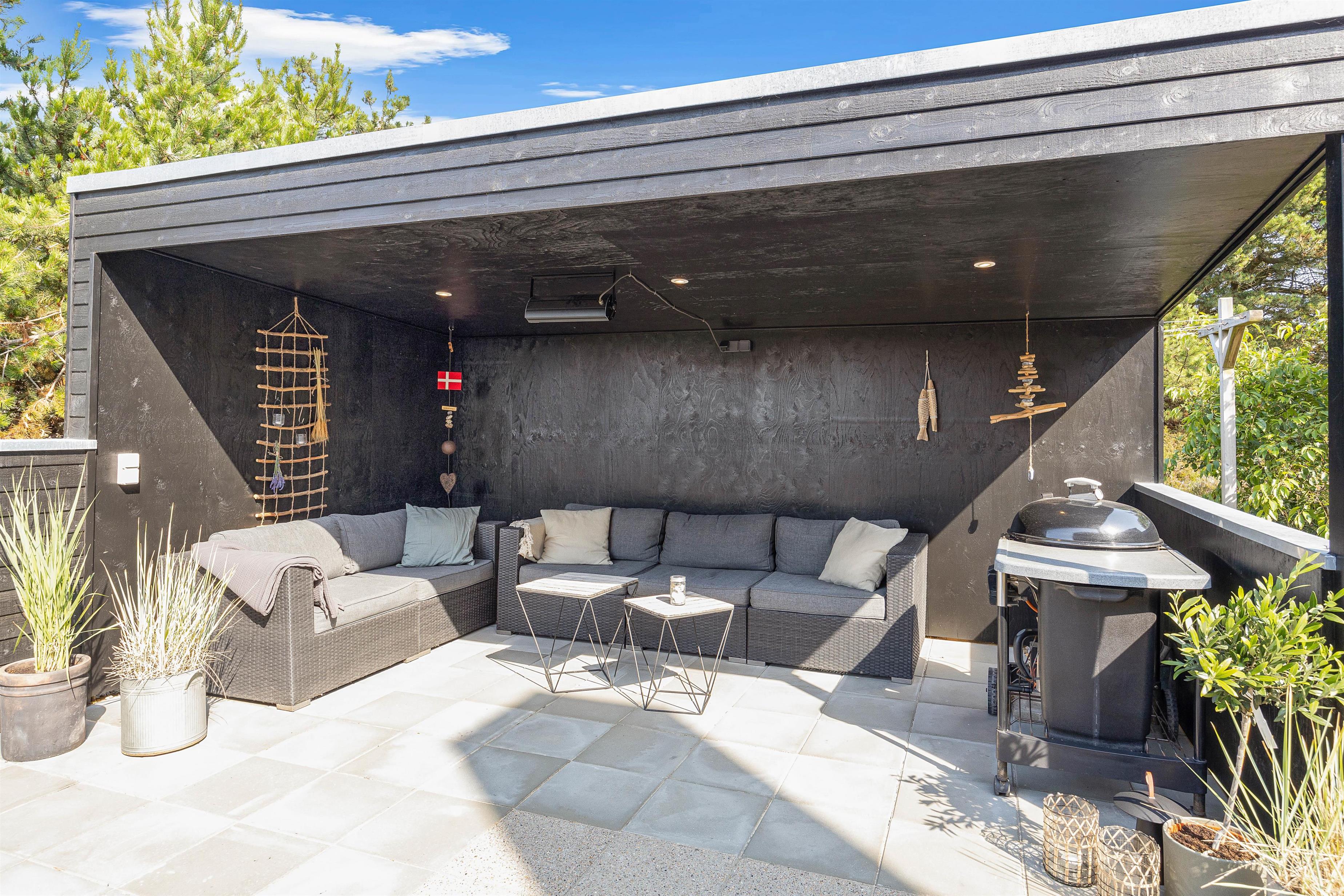 Solvogne og havemøbler står klar til at nyde dagen omkring huset og om aftenen kan I tænde op i grillen og nyde aftenstemningen med lidt god mad.