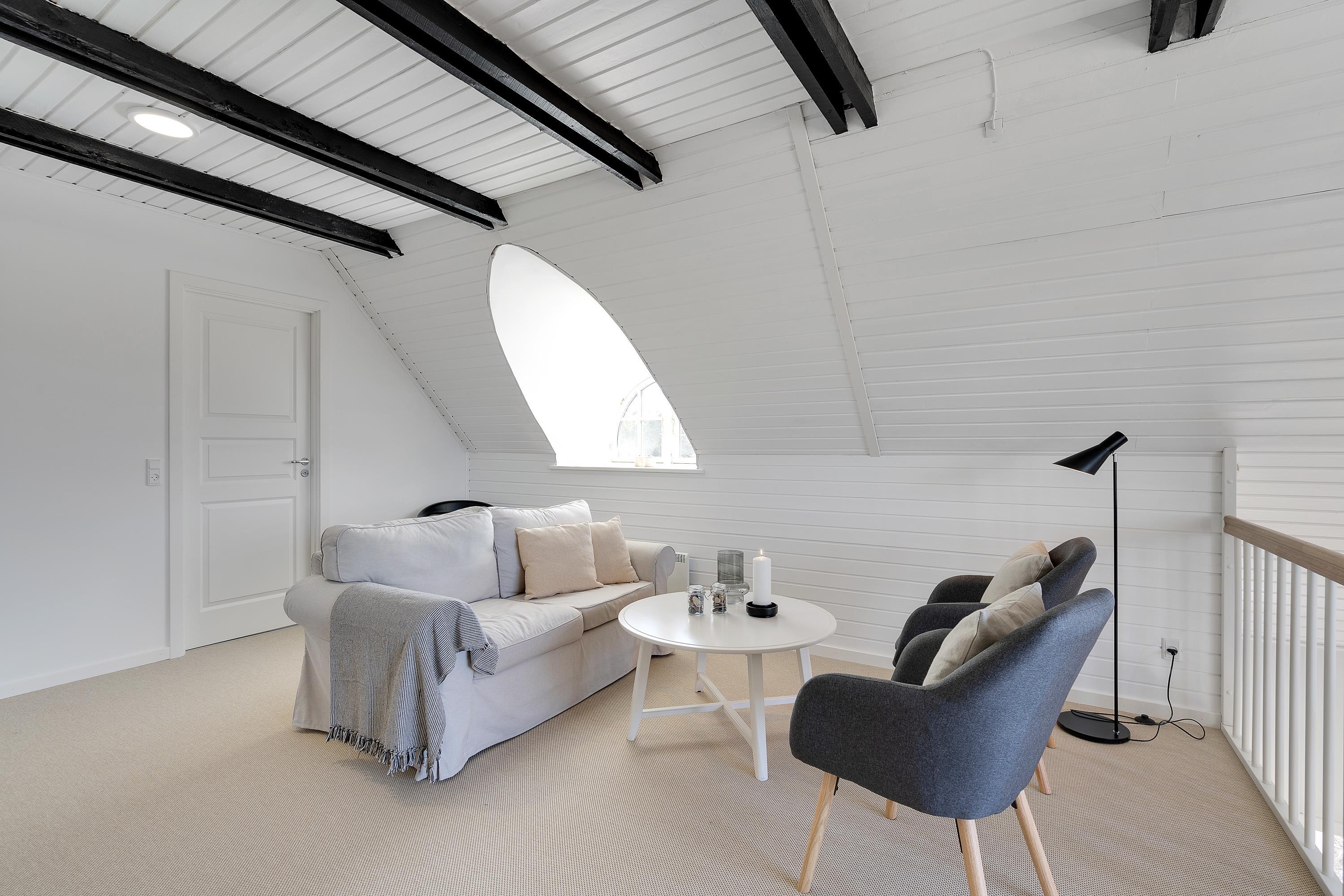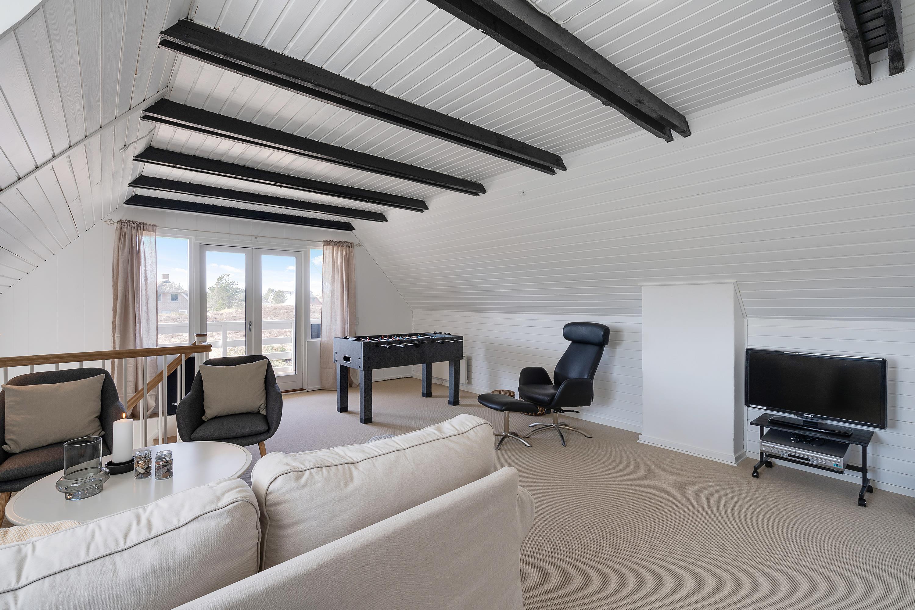 Familien kan fordele sig på to etager. På første sal ligger to soverum og et opholdsrum med tv og bordfodbold– samt en dejlig sydvendt balkon med udsigt over området.
