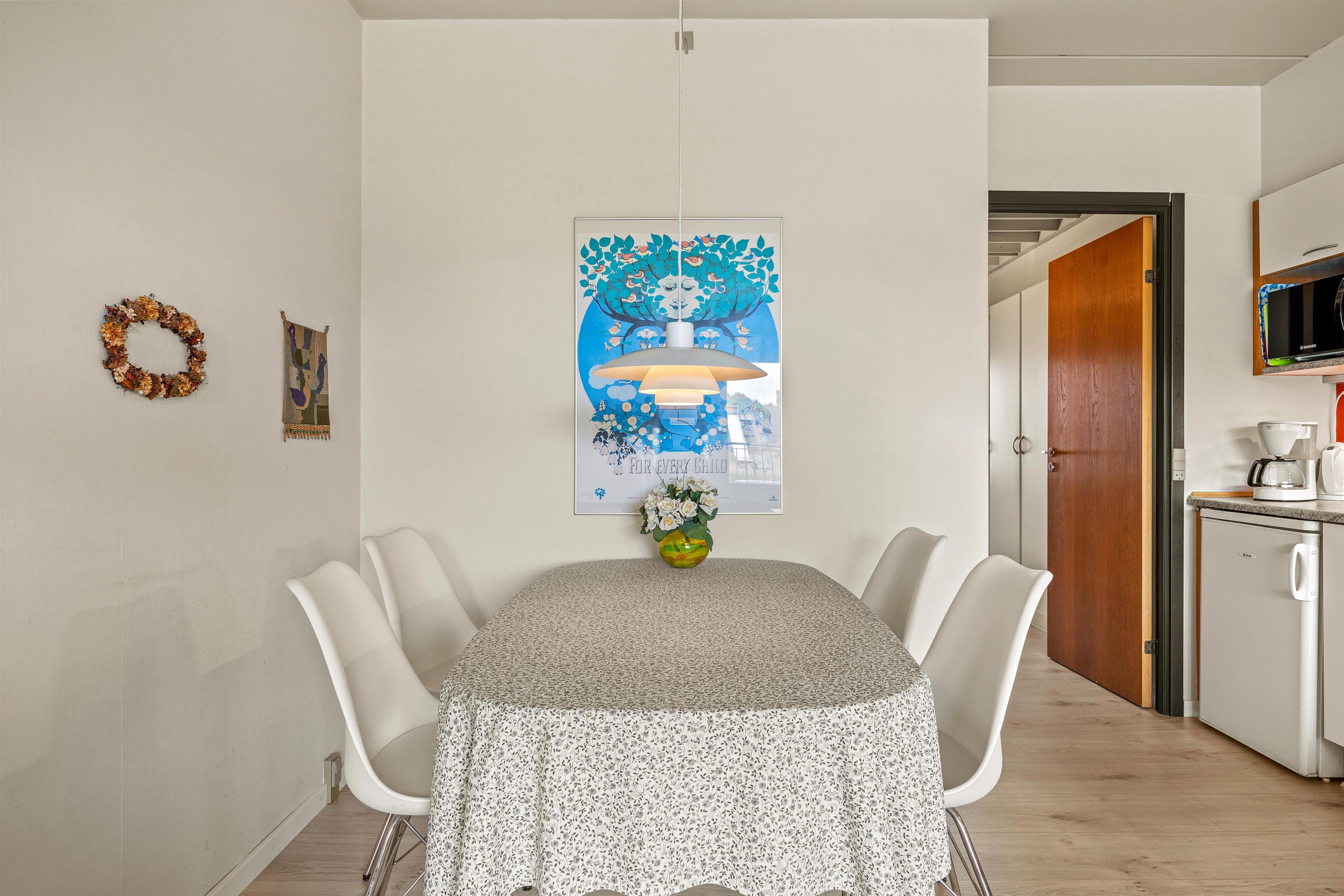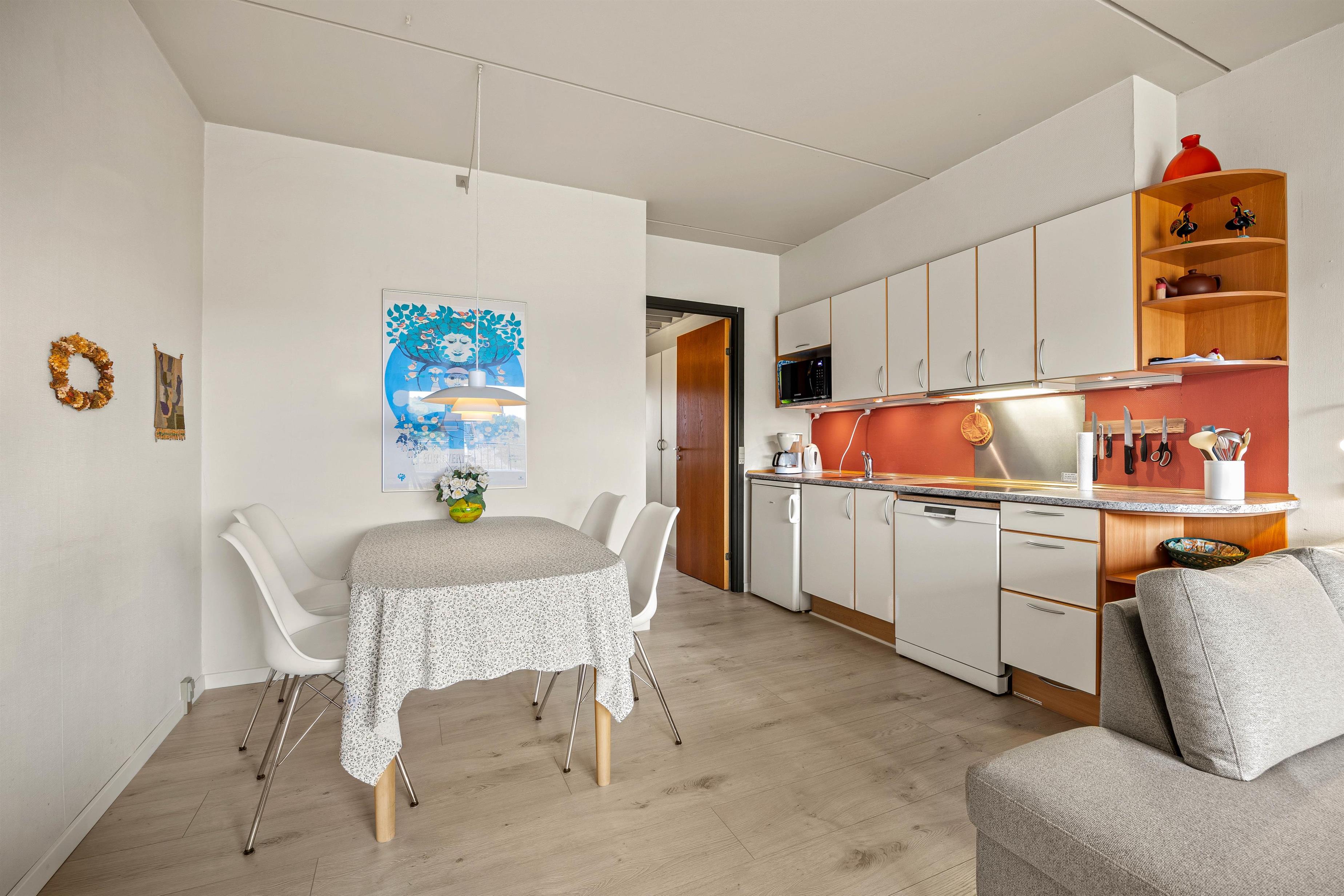 Den velindrettede lejligheden har en åben opholdsstue med integreret køkken og indbyder til samvær og hygge. I sofahjørnet kan I smide benene op for at se en spændende film, og i køkkenet kan I sammen tilberede dagens feriemiddag.