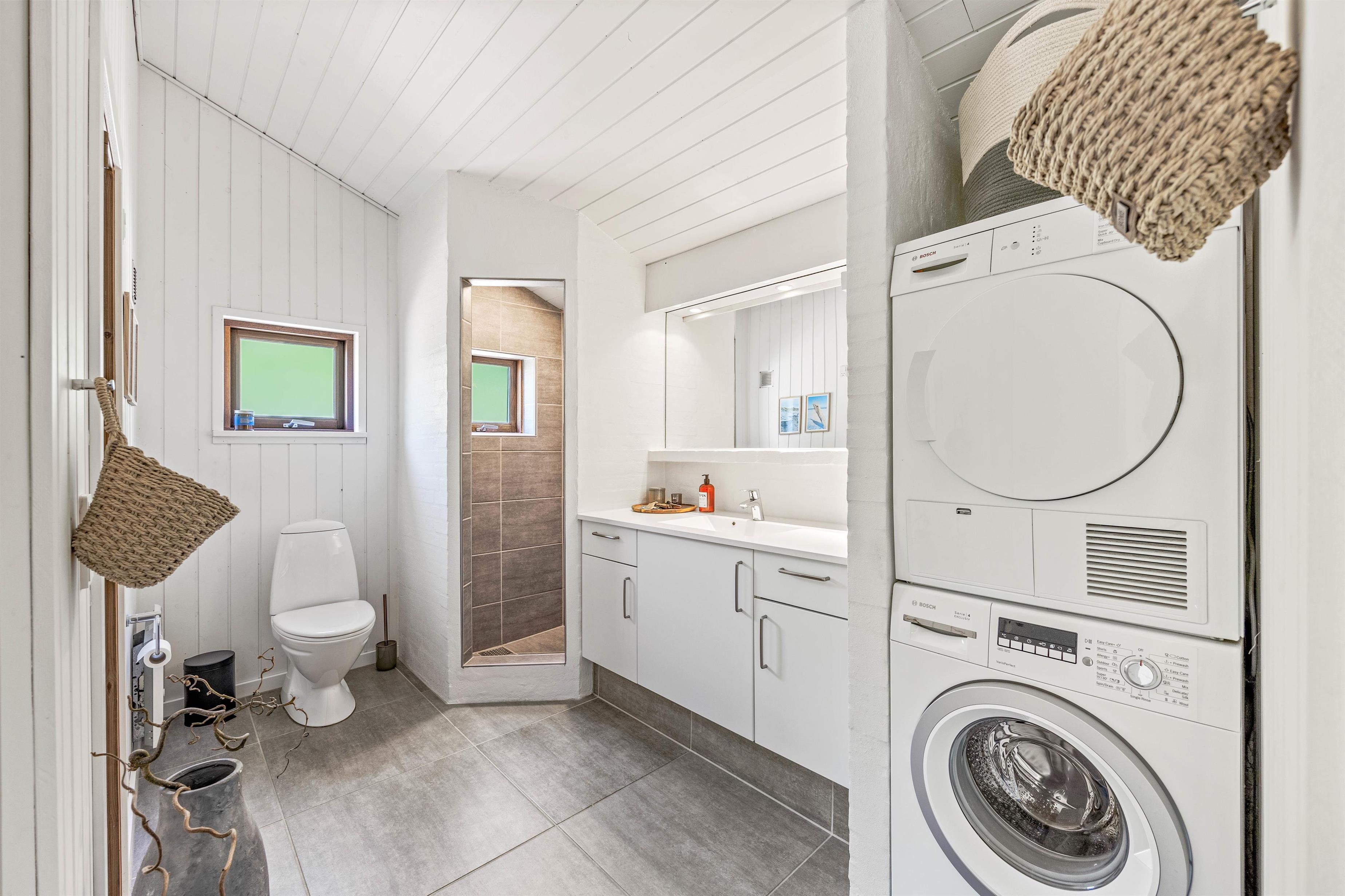 Sommerhuset er udstyret med gode praktiske faciliteter, der hjælper jer med det praktiske husarbejde i løbet af ferien. I køkkenet klarer opvaskemaskinen opvasken efter madlavningen, og på badeværelset hjælper vaskemaskinen og tørretumbleren med tøjvasken.