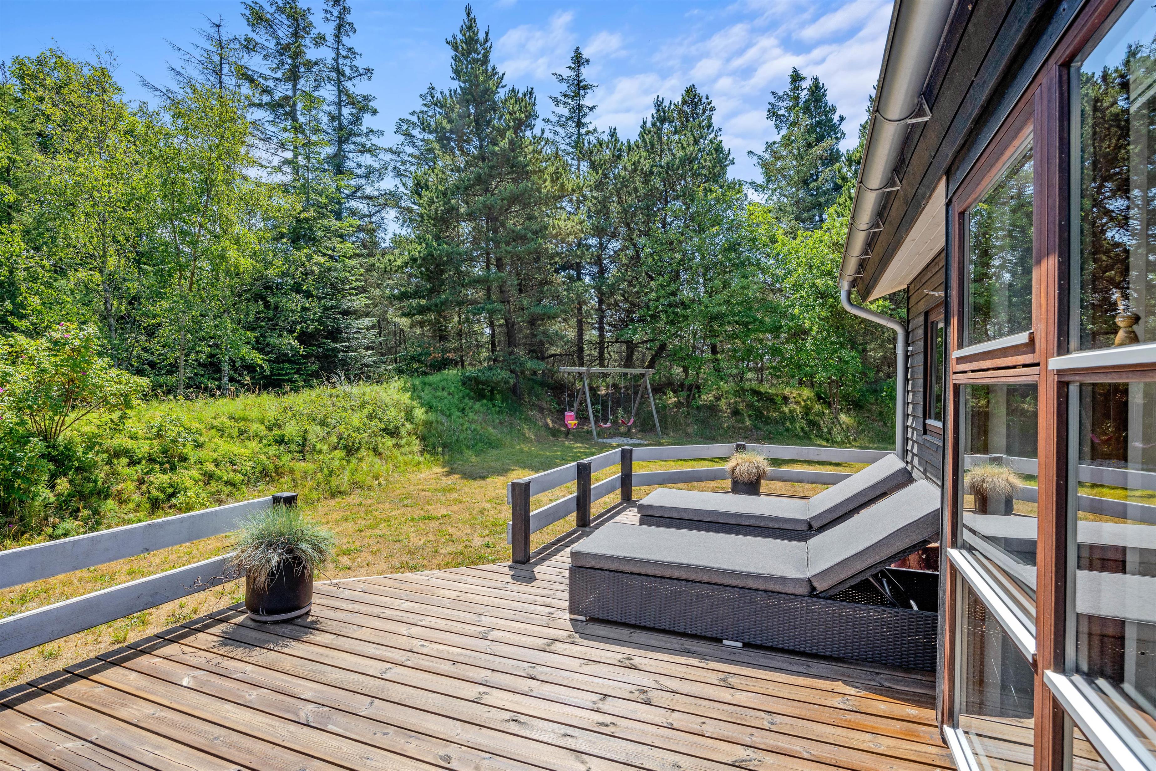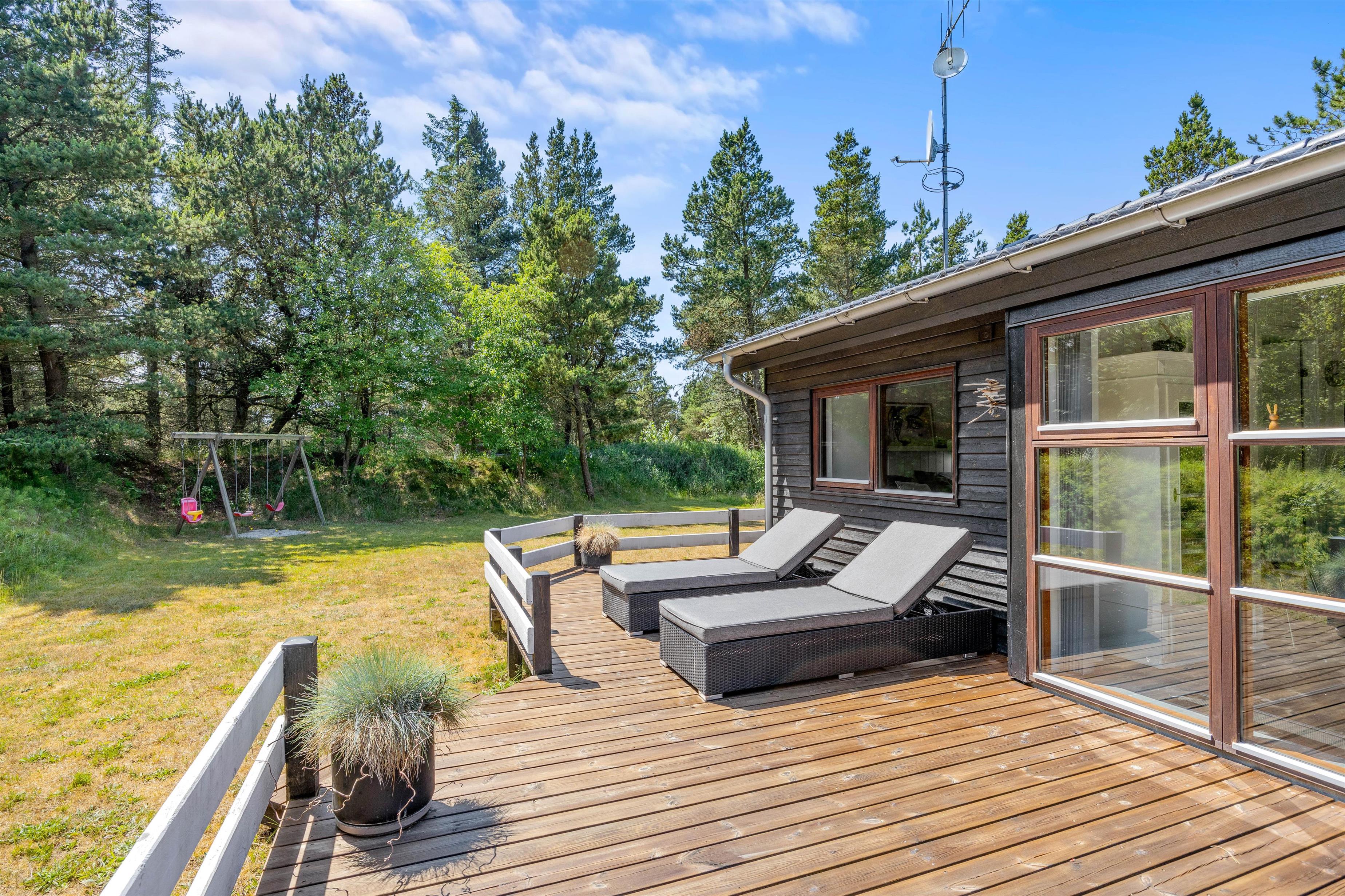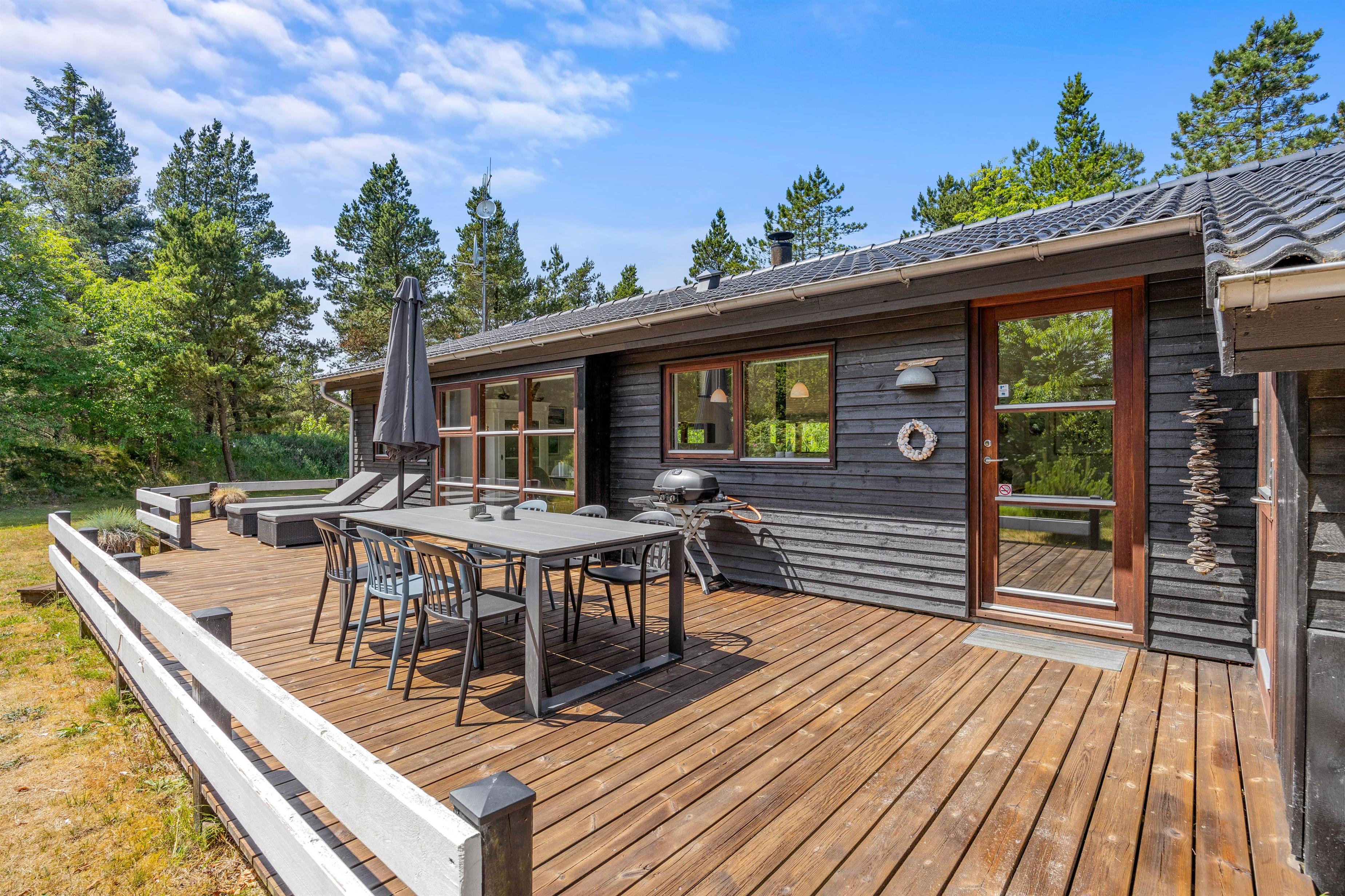 Når vejret er i top, er det selvfølgelig med at komme ud at nyde det – og netop dét kan I gøre på sommerhusets dejlige terrasse, der er delvist overdækket og afskærmet. På terrassen står der havemøbler og liggestole klar til jer, så I kan finde jer godt til rette på en god plads i solen.