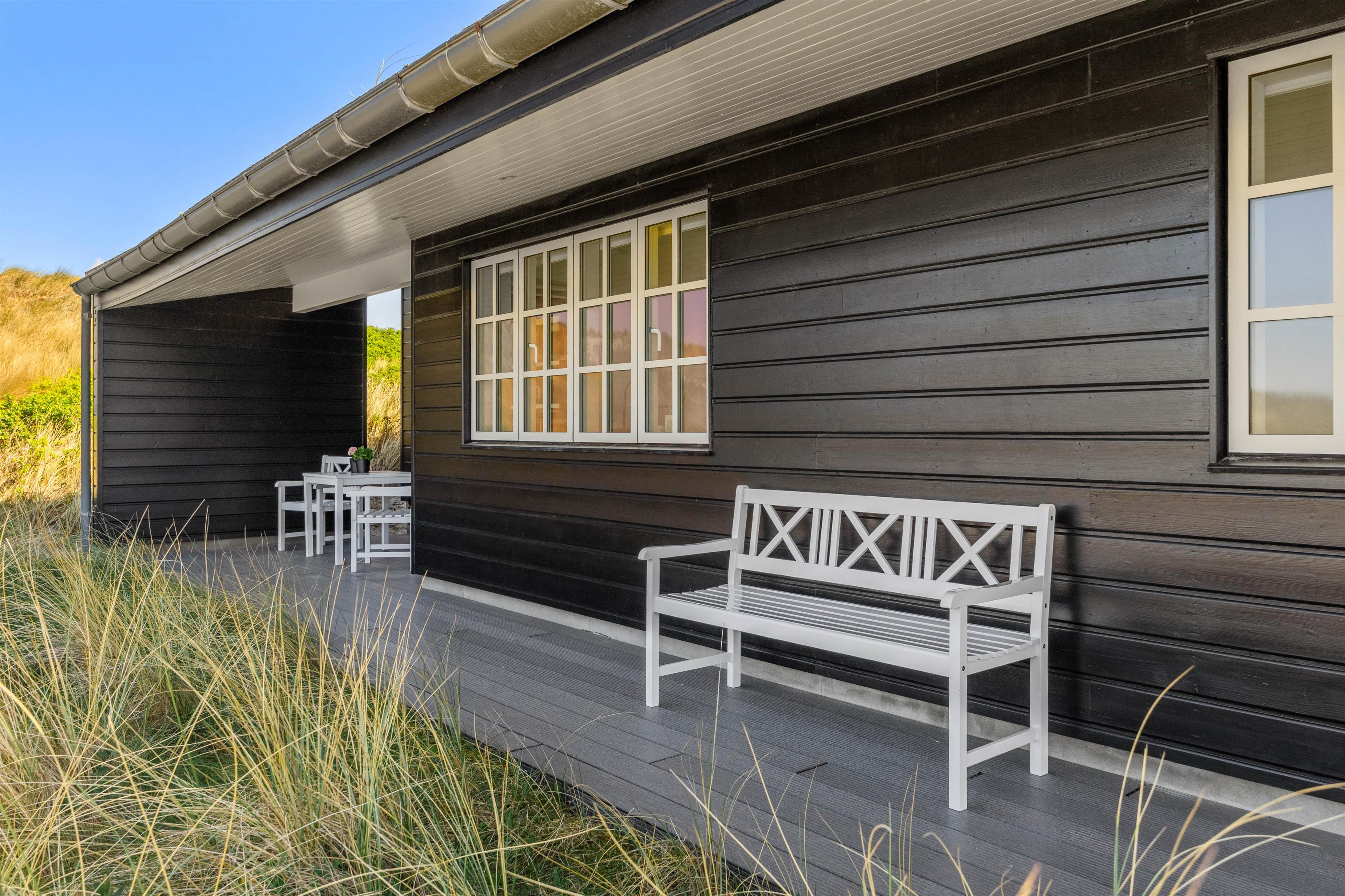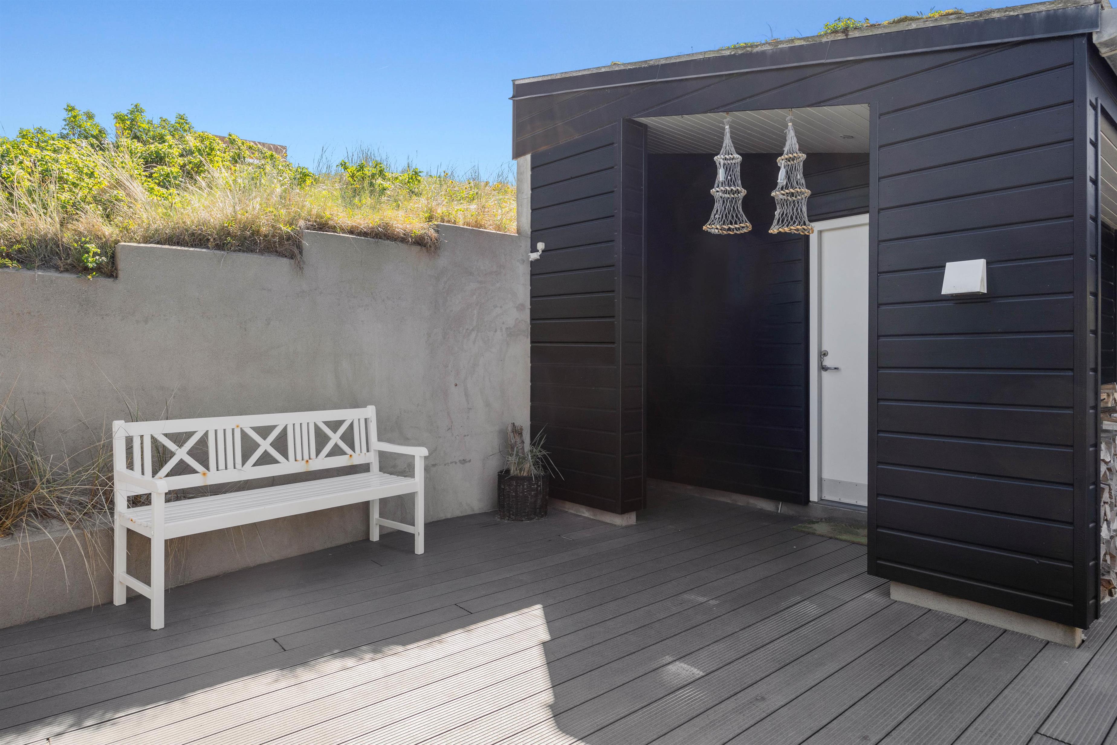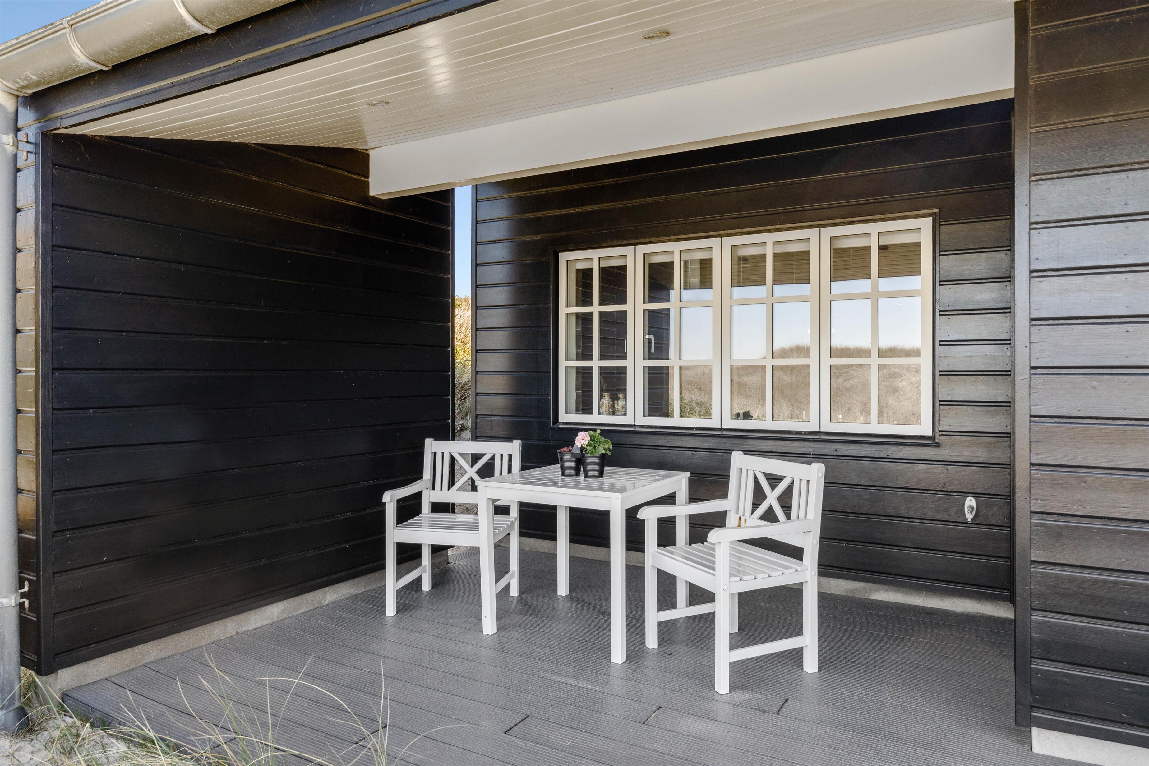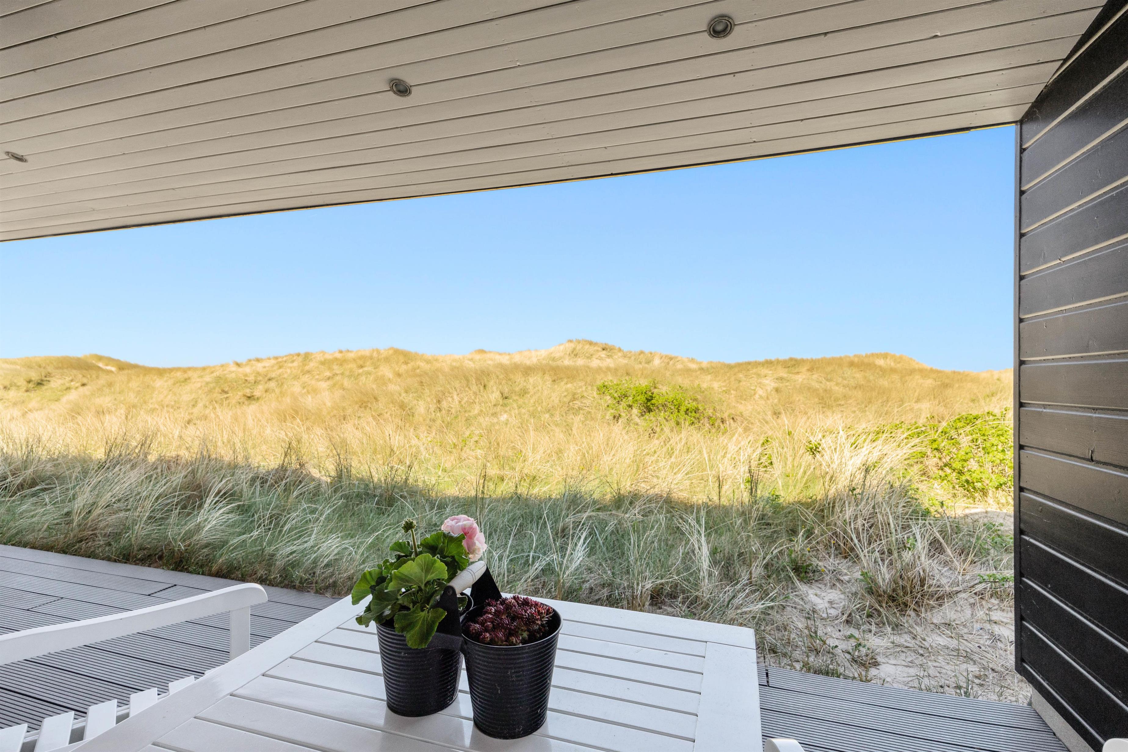 Rundt omkring dette skønne sommerhus findes der adskillige steder på terrassen, hvor I kan nyde en afslappende stund med en bog eller en kop kaffe, mens I læner jer tilbage i enten de komfortable havestole eller på solvognene og nyder den friske luft samt lyden af de brusende bølger. Det smukke Vesterhav kan – enkelte steder - også iagttages herfra.
