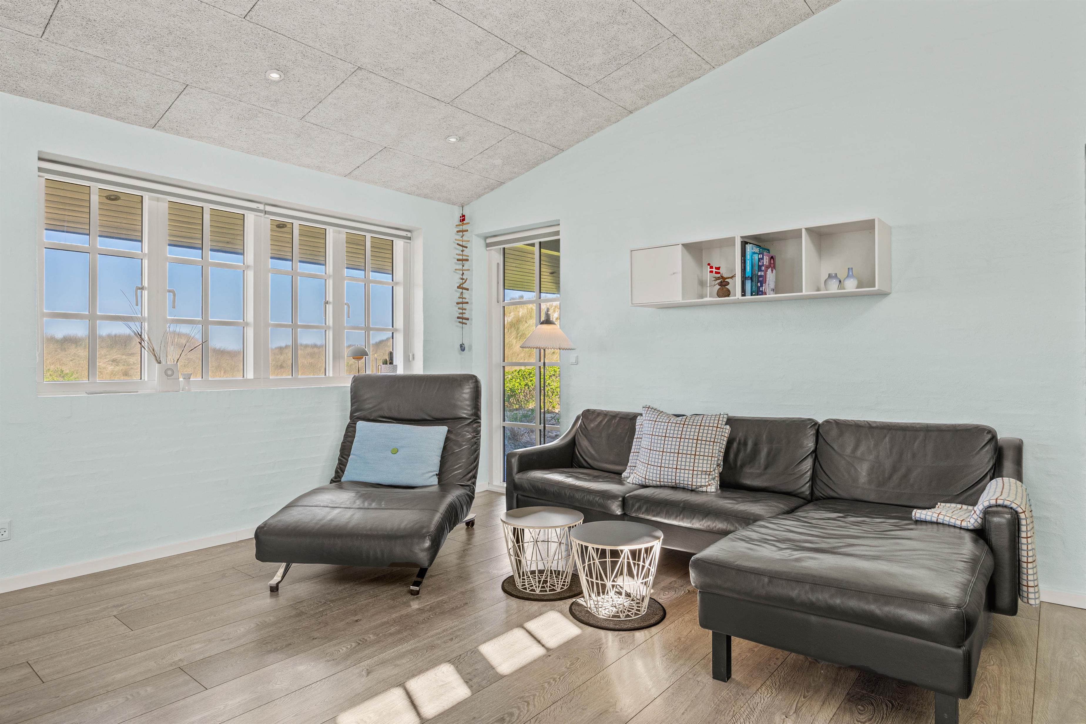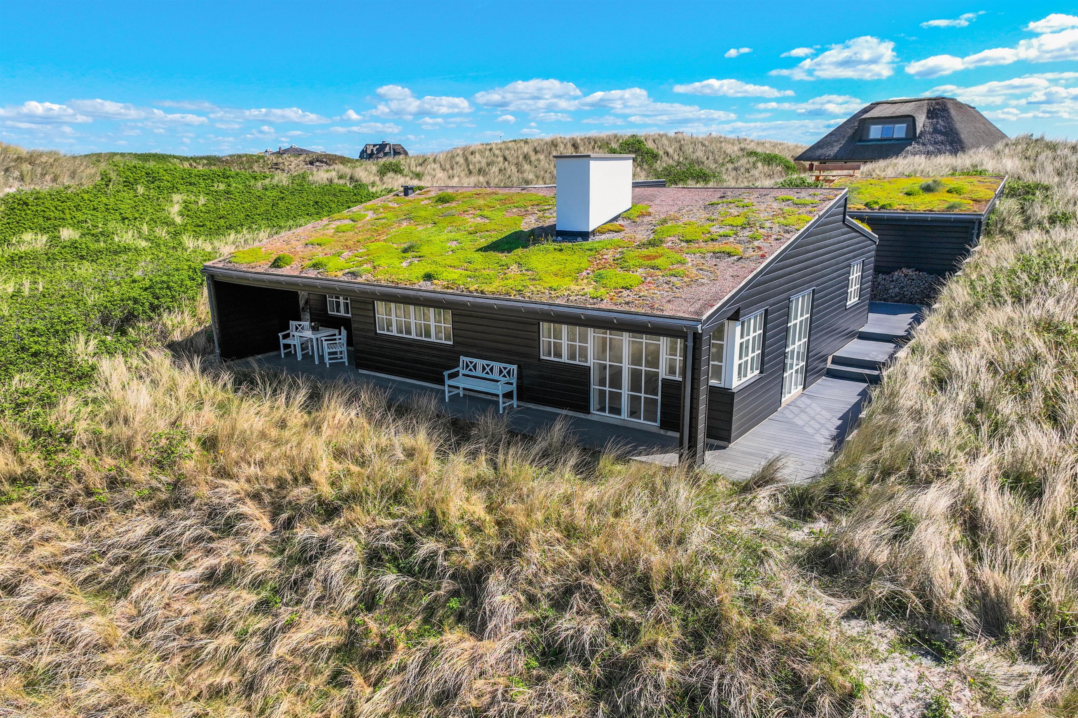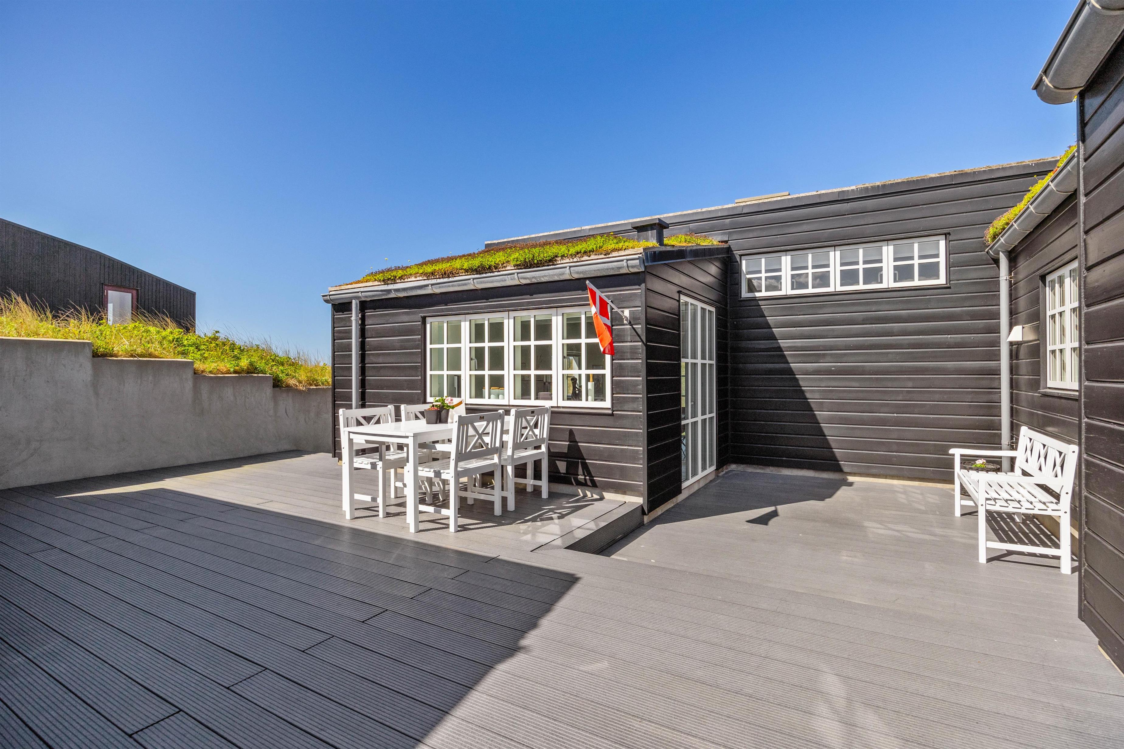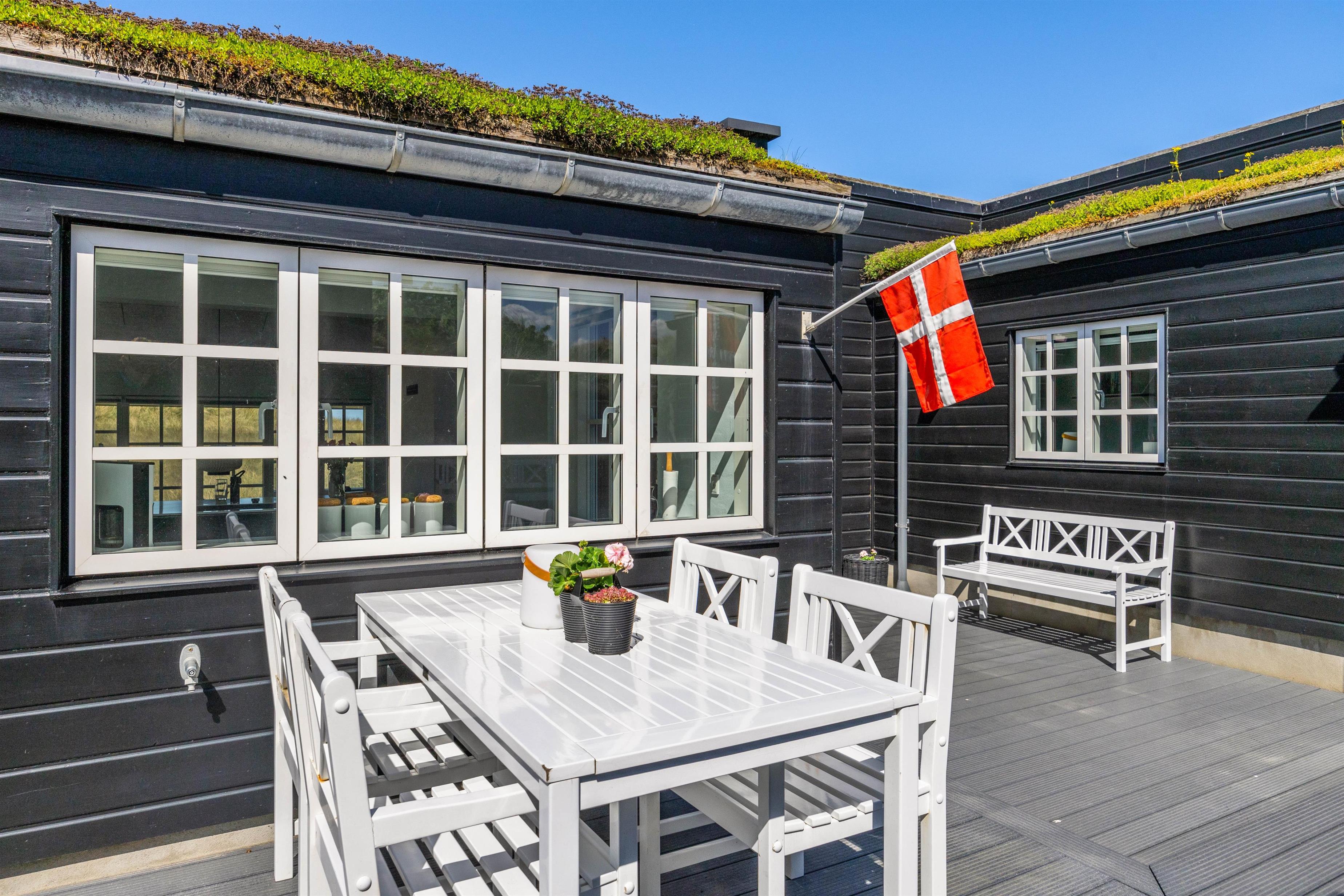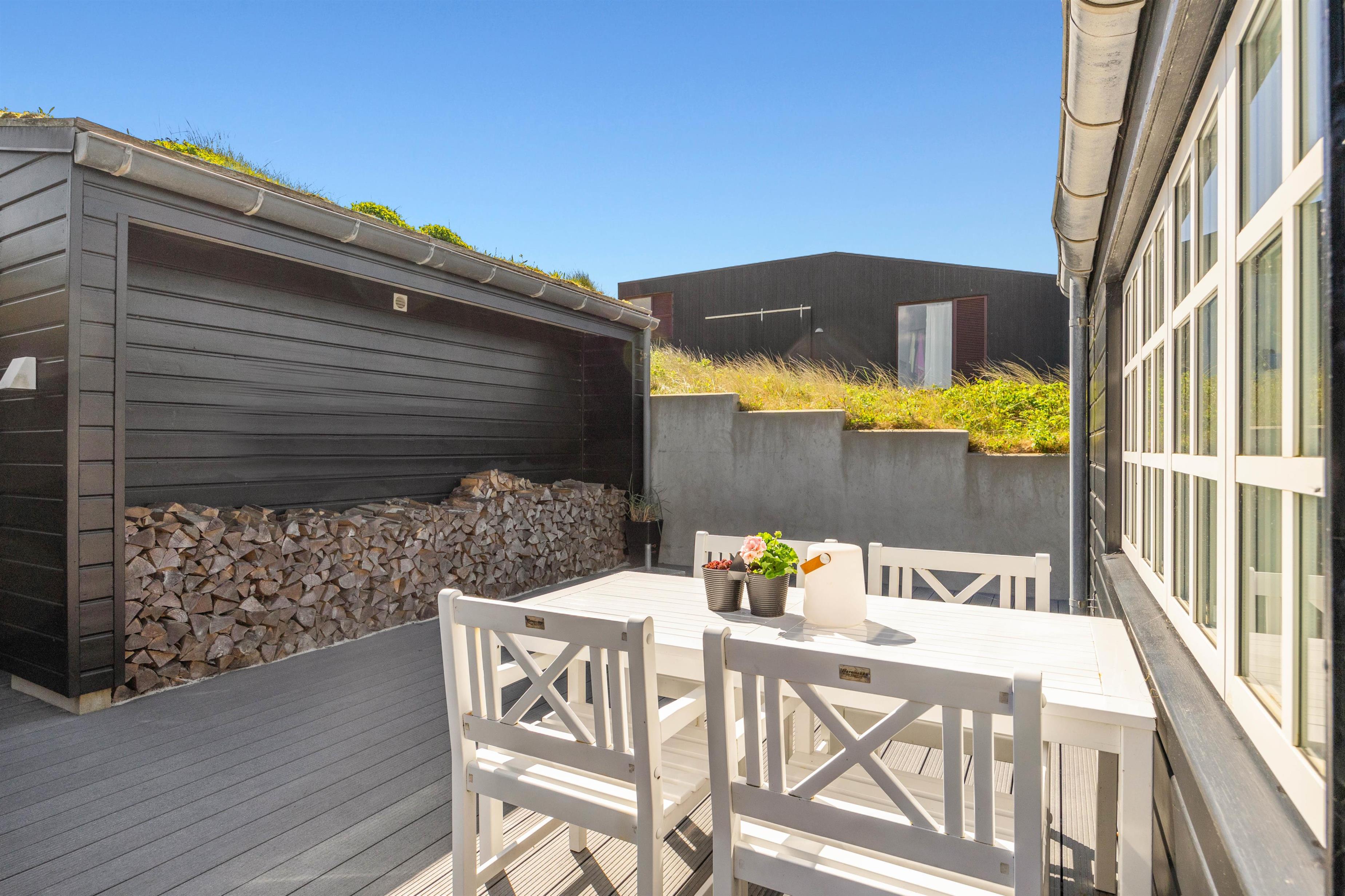 Rundt omkring dette skønne sommerhus findes der adskillige steder på terrassen, hvor I kan nyde en afslappende stund med en bog eller en kop kaffe, mens I læner jer tilbage i enten de komfortable havestole eller på solvognene og nyder den friske luft samt lyden af de brusende bølger. Det smukke Vesterhav kan – enkelte steder - også iagttages herfra.