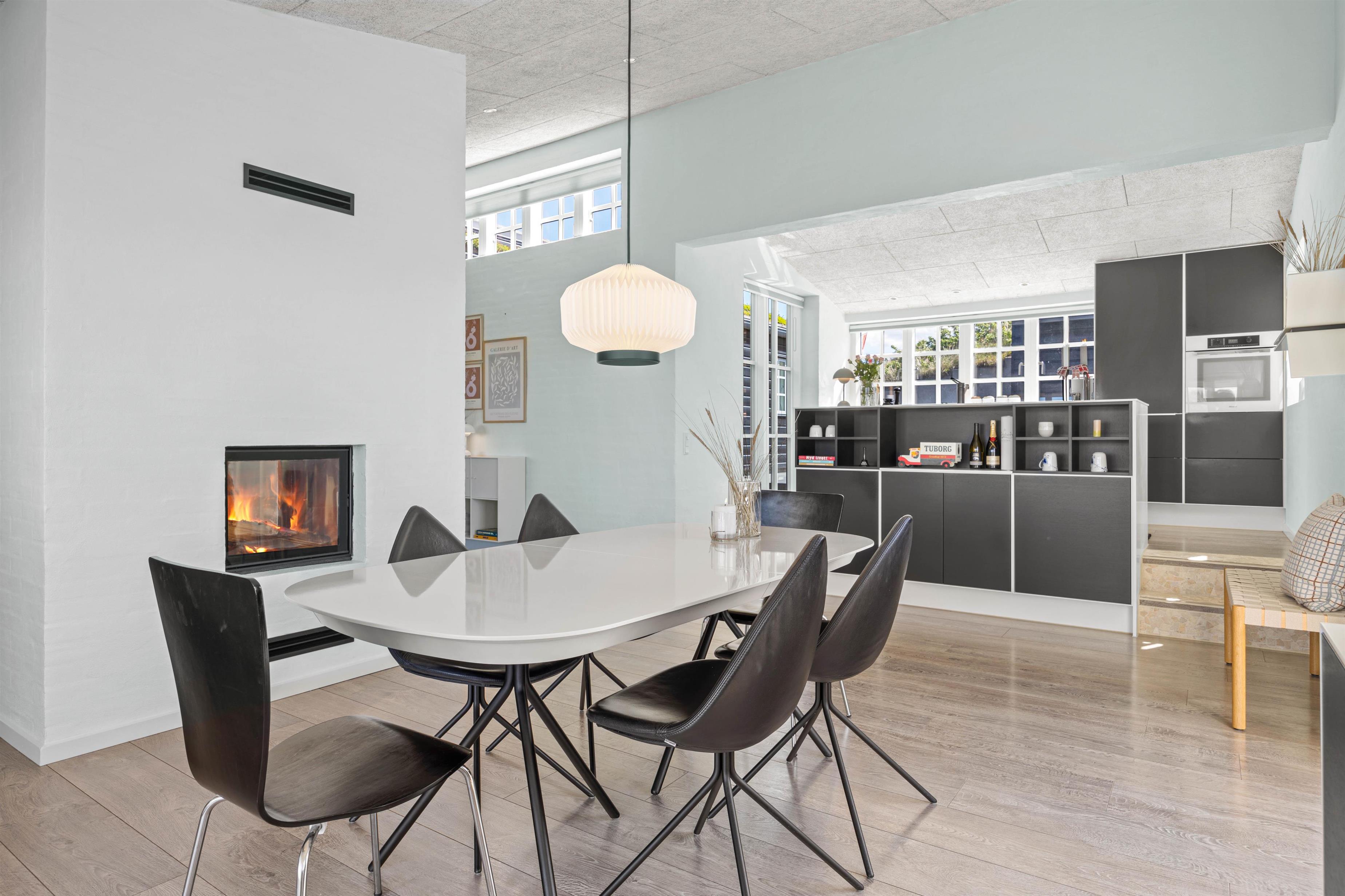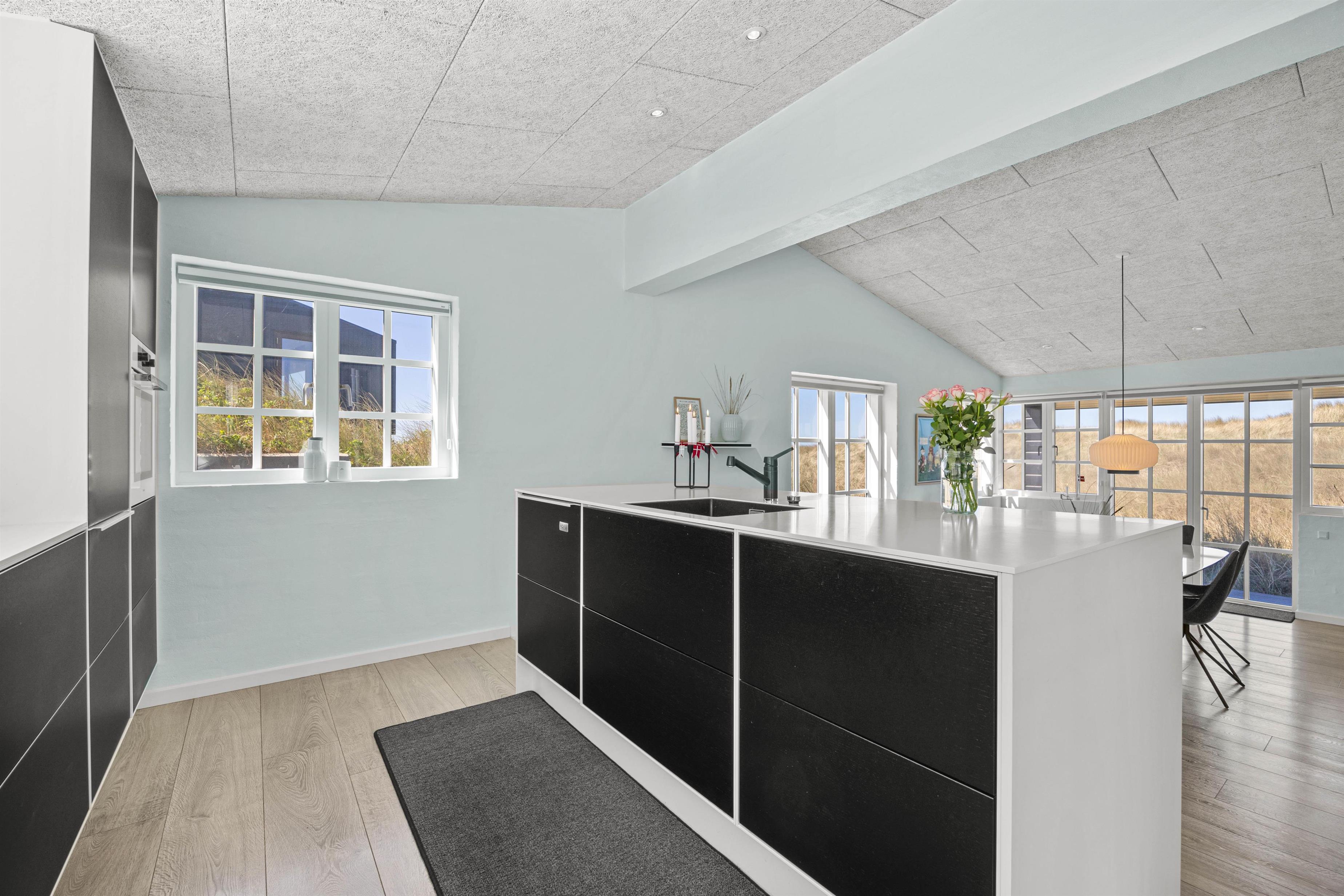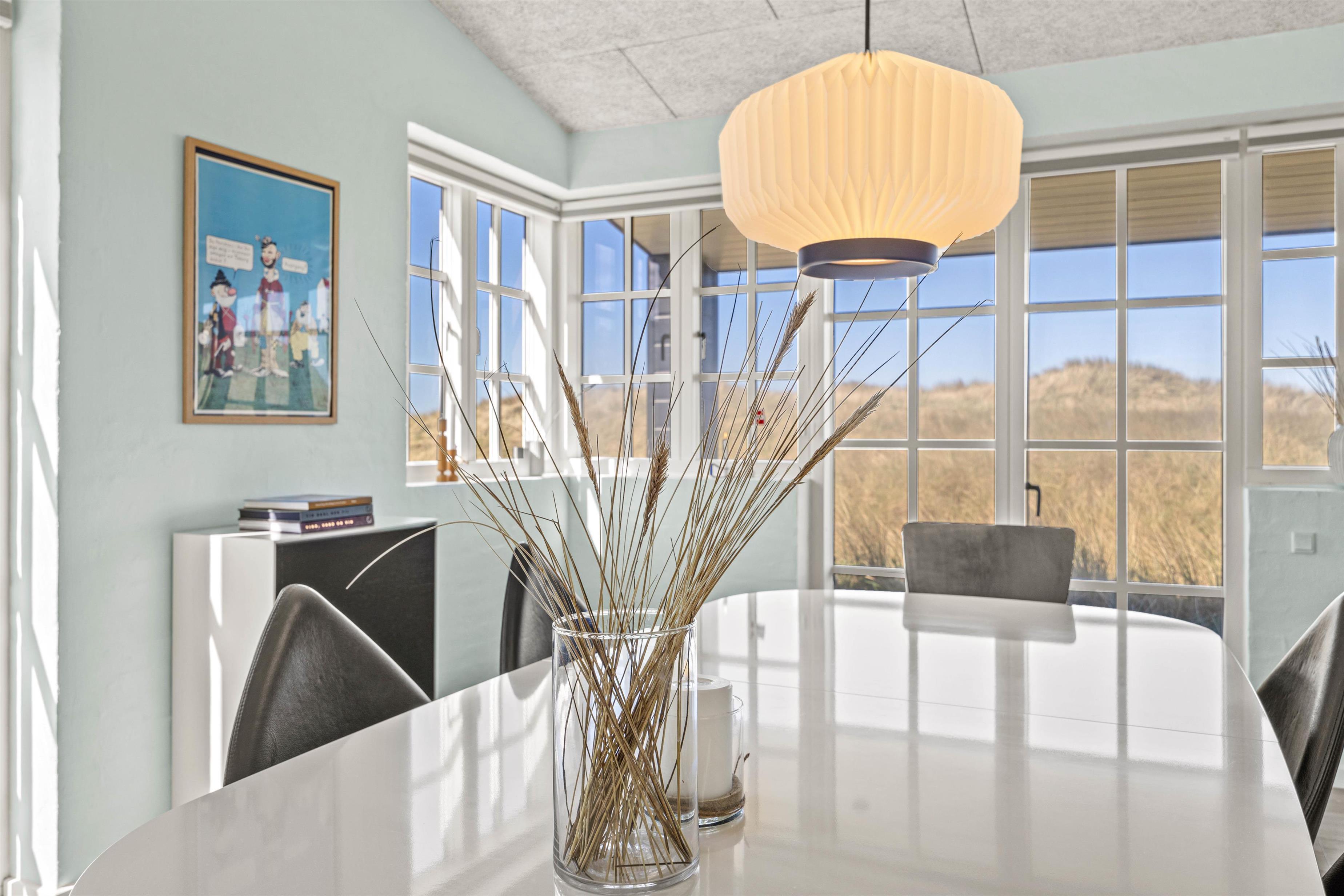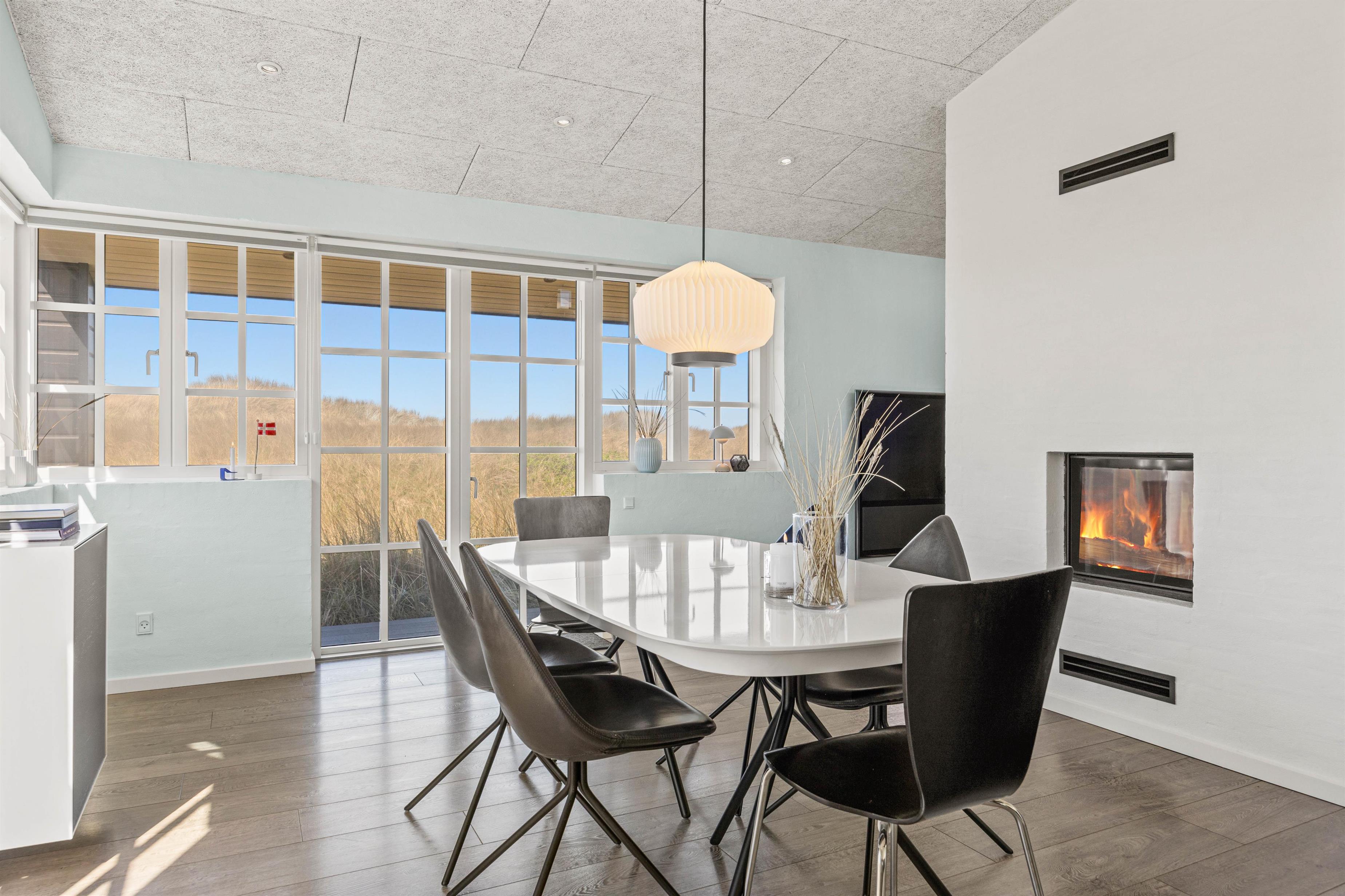 Brændeovnens hyggelige flammer og varme kan nydes fra både sofagruppen og spisestuen. Dagens måltider kan nemt tilberedes oppe i køkkenet, der er veludstyret med bl.a. opvaskemaskine, keramiske kogeplader og emhætte. Herfra, igennem spisestuens store vinduer, kan det smukke klitlandskab nemt beundres.
