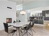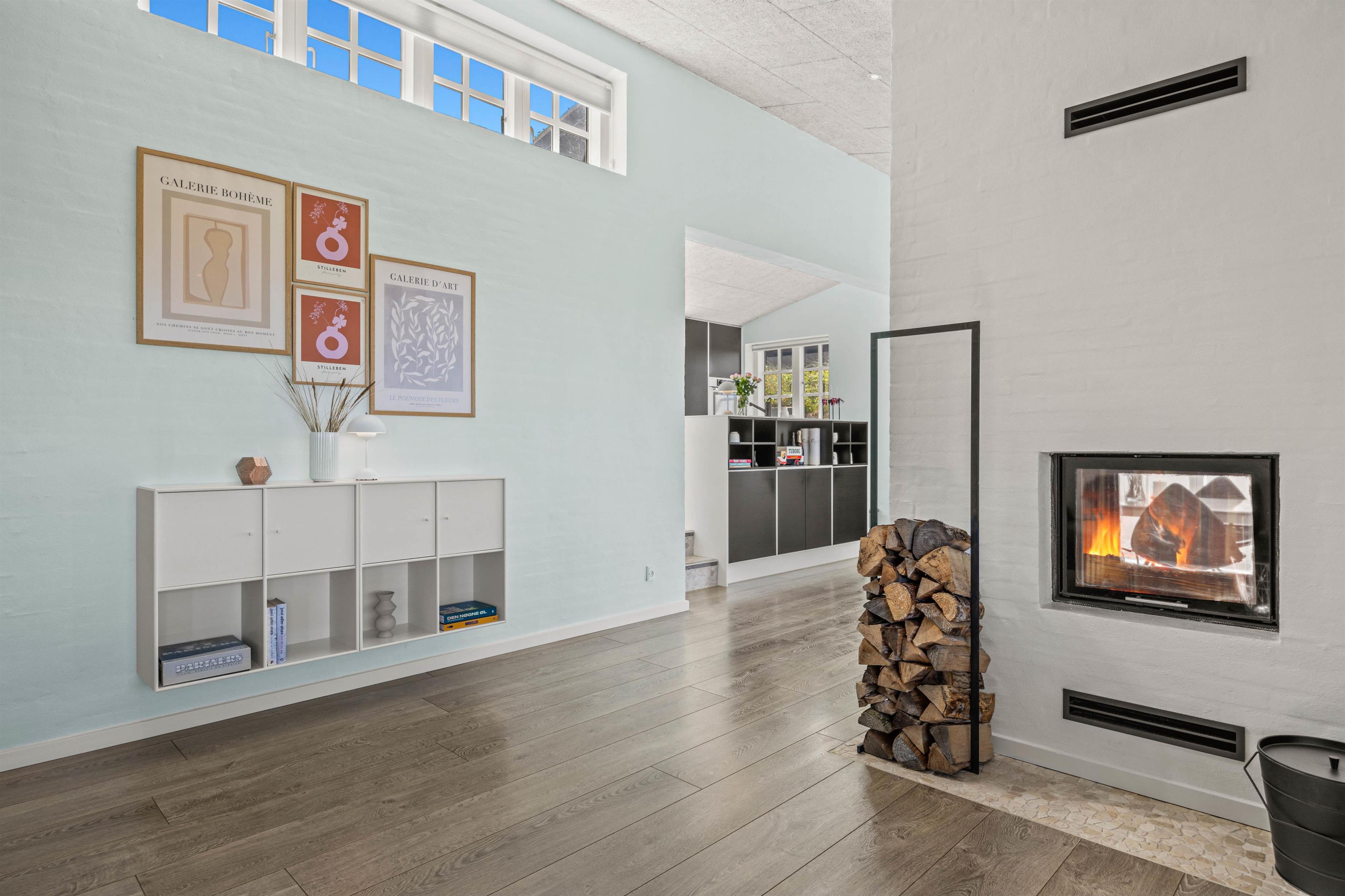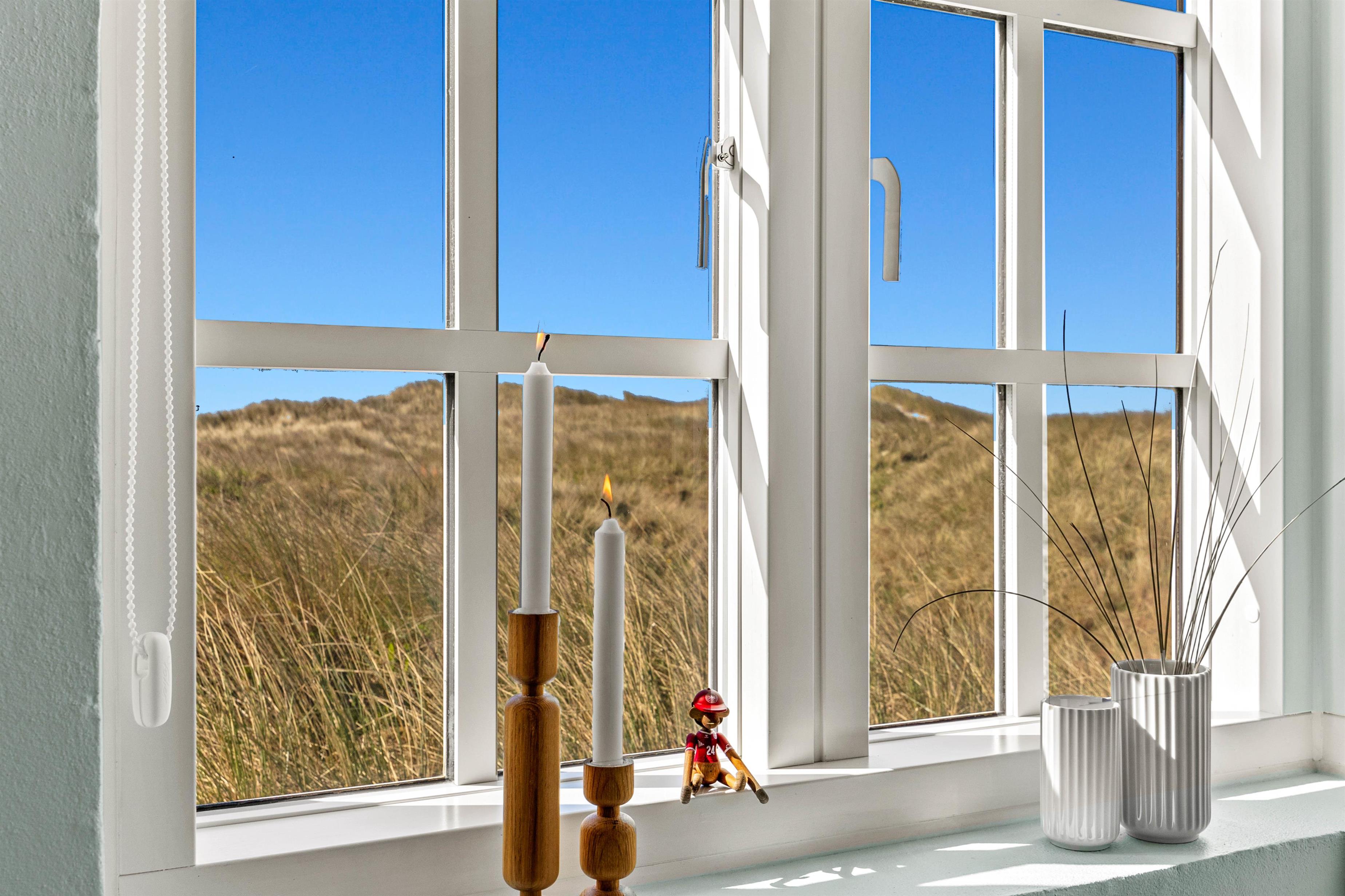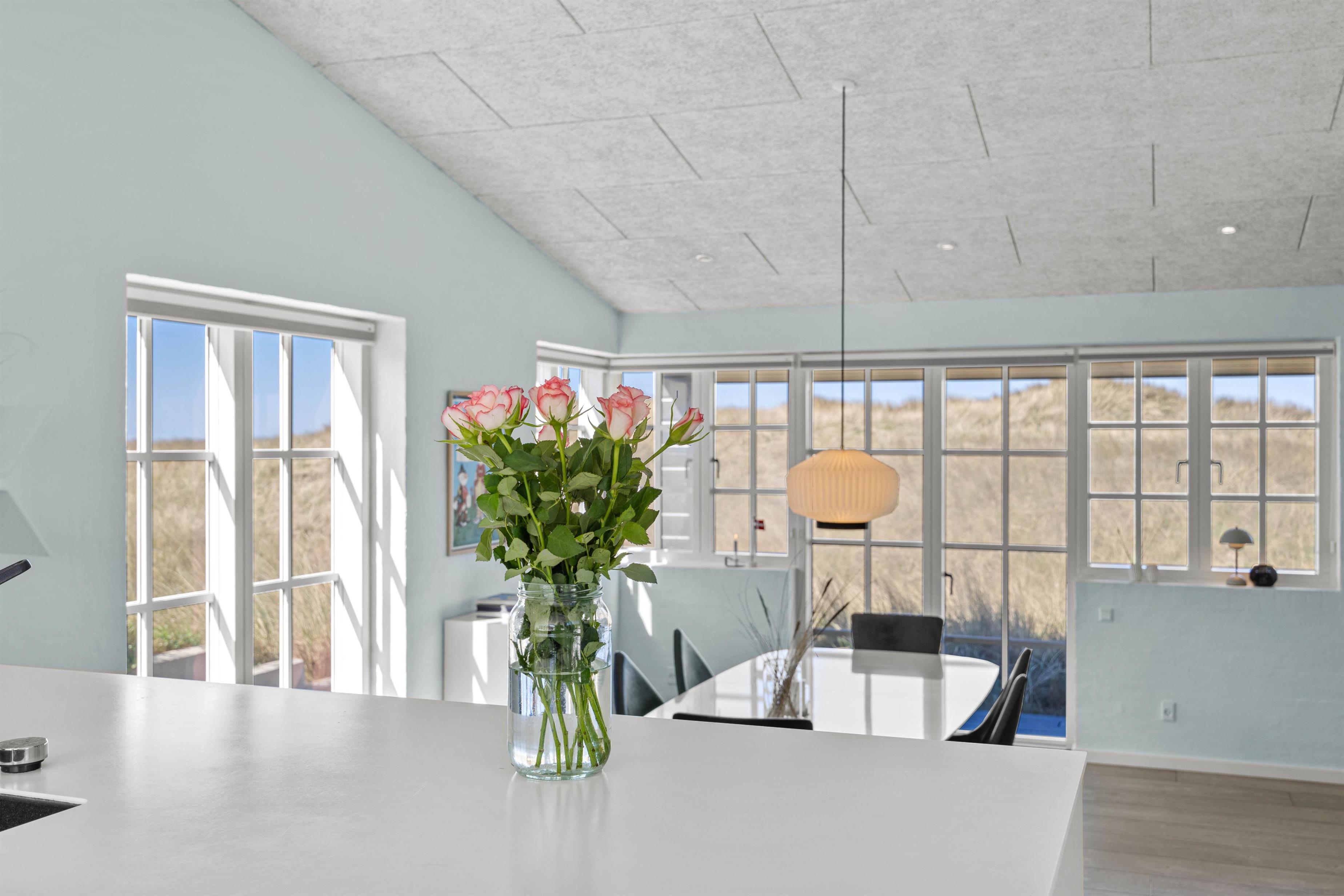 Brændeovnens hyggelige flammer og varme kan nydes fra både sofagruppen og spisestuen. Dagens måltider kan nemt tilberedes oppe i køkkenet, der er veludstyret med bl.a. opvaskemaskine, keramiske kogeplader og emhætte. Herfra, igennem spisestuens store vinduer, kan det smukke klitlandskab nemt beundres.