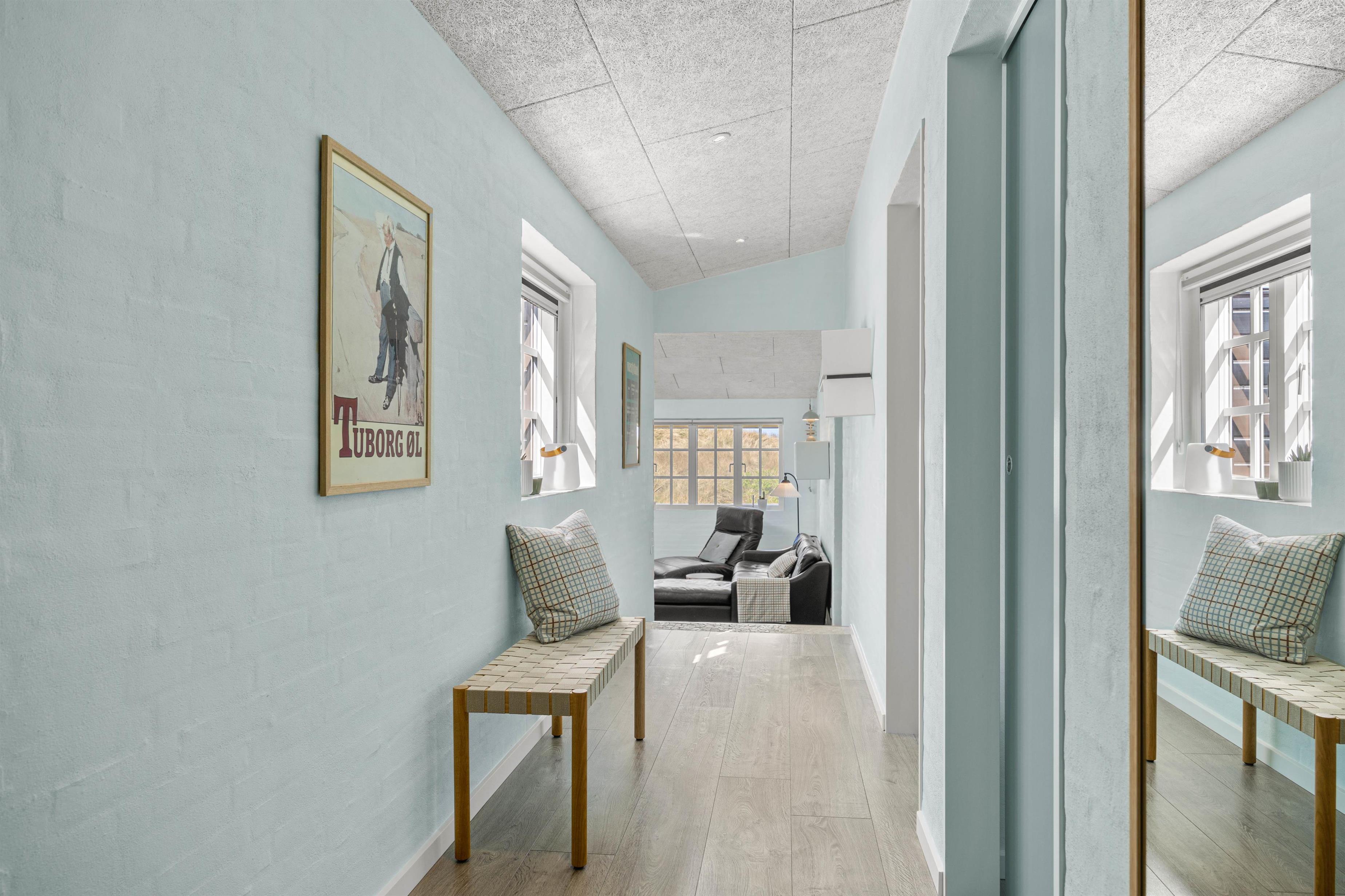 Selve sommerhuset i Henne Strand er indrettet lyst med et moderne touch, og der er i den grad kælet for detaljerne, både hvad indretningen og materialevalg angår. De lyse farver fremhæver rummenes åbenhed og appellerer til afslapning og ro. Derudover er stuen indrettet med et stort B&O fjernsyn, som giver jer et fantastisk billede- og lydkvalitet, så oplevelsen bliver større, når I ser TV.
