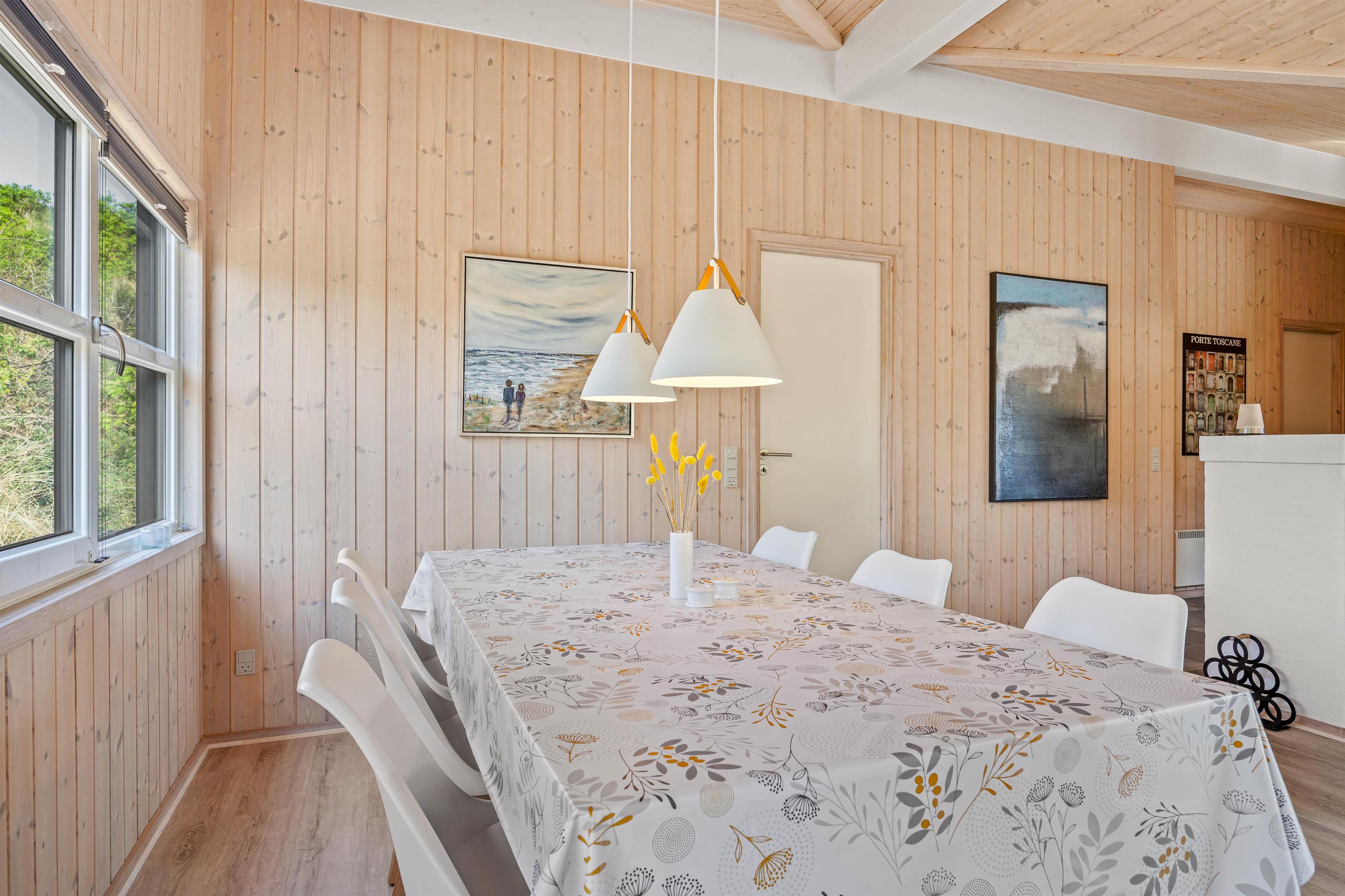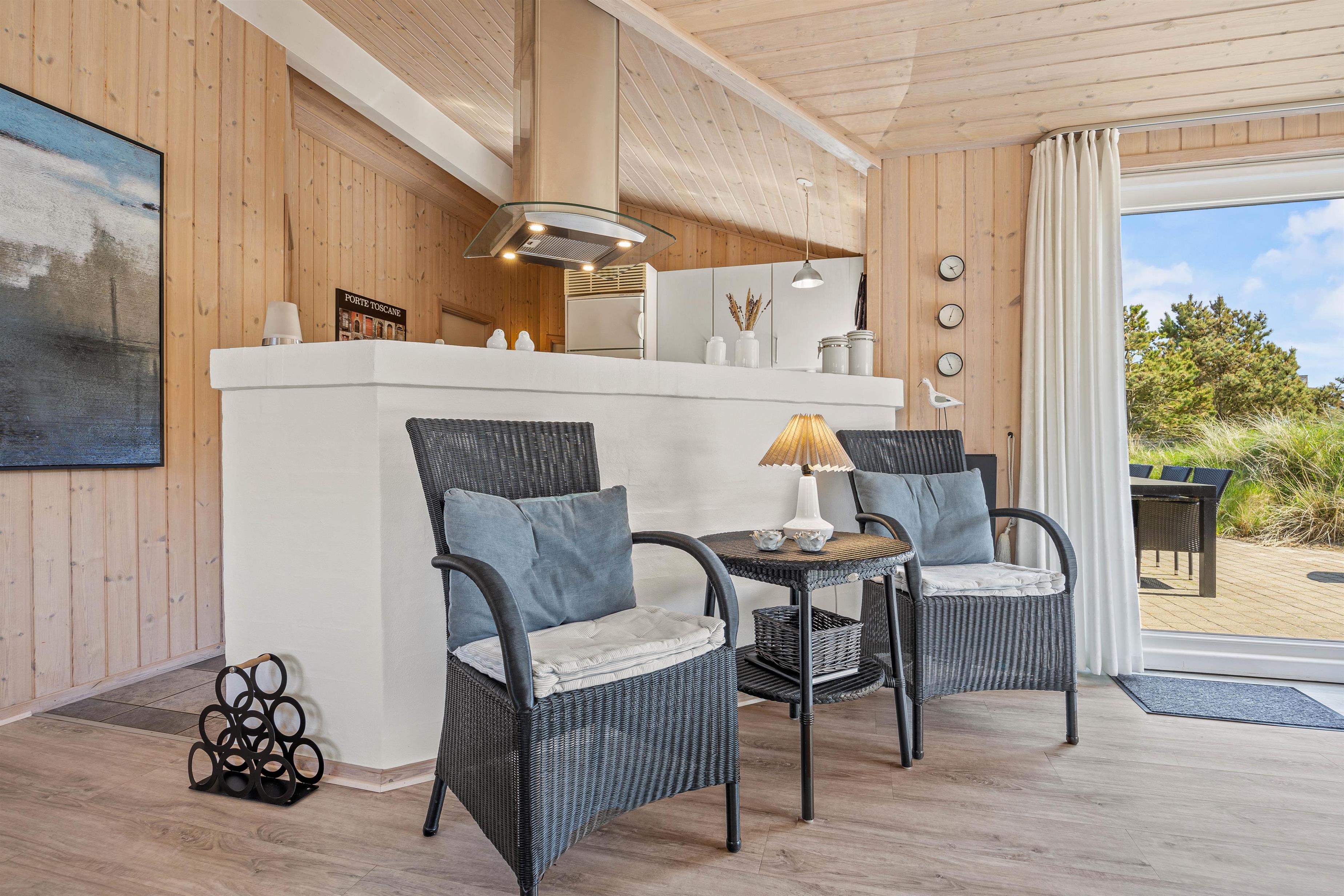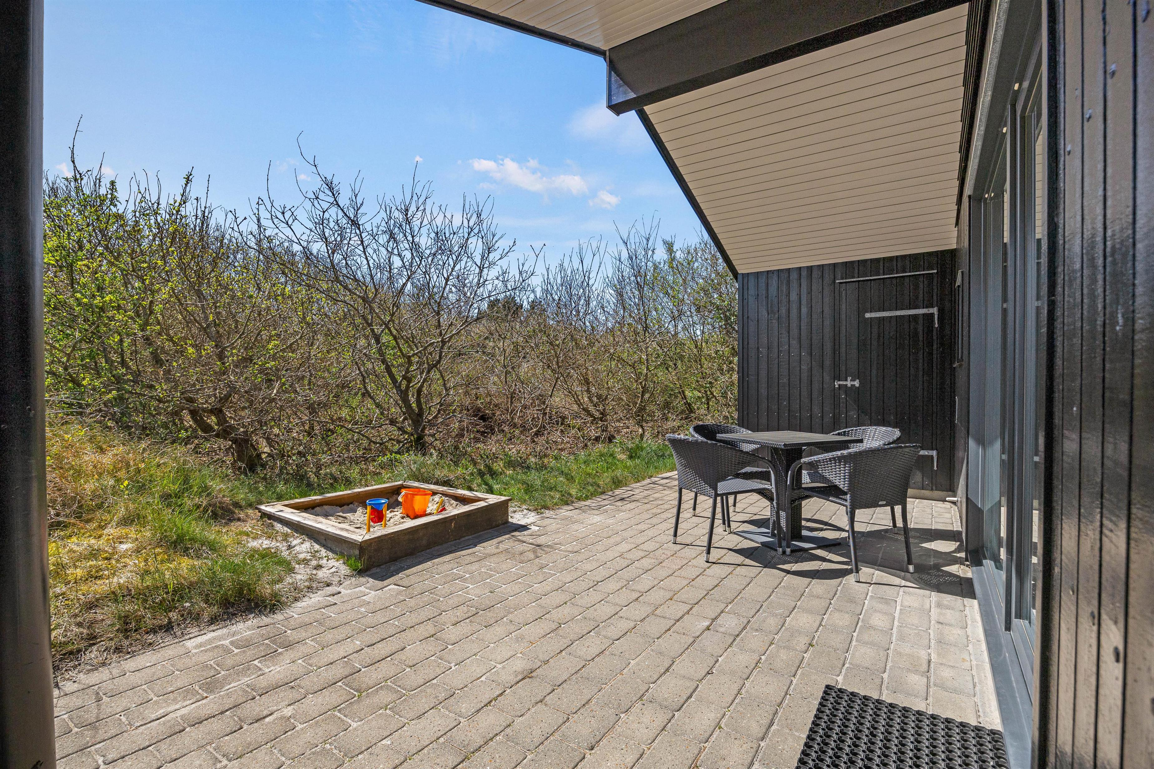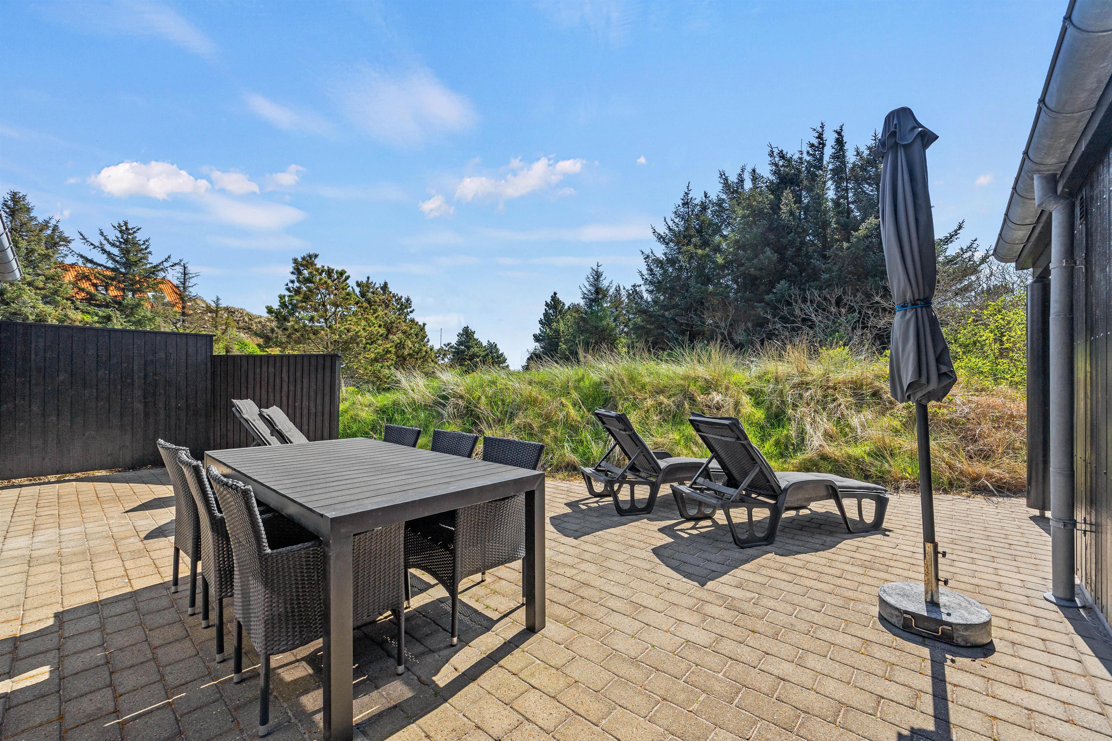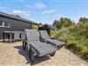 Rundt om hele sommerhuset er der anlagt terrasse, og terrassen kan tilgås fra flere værelser og alrummet. Sommerhuset er beliggende på en naturgrund og de omkringliggende klitter skærmer for vinden. Terrassen er delvist overdækket – perfekt til de lune sommeraftner, hvor der naturligvis skal grilles. En gasgrill står her til rådighed. Tilbered et lækkert måltid og nyd hertil et køligt glas rosé.