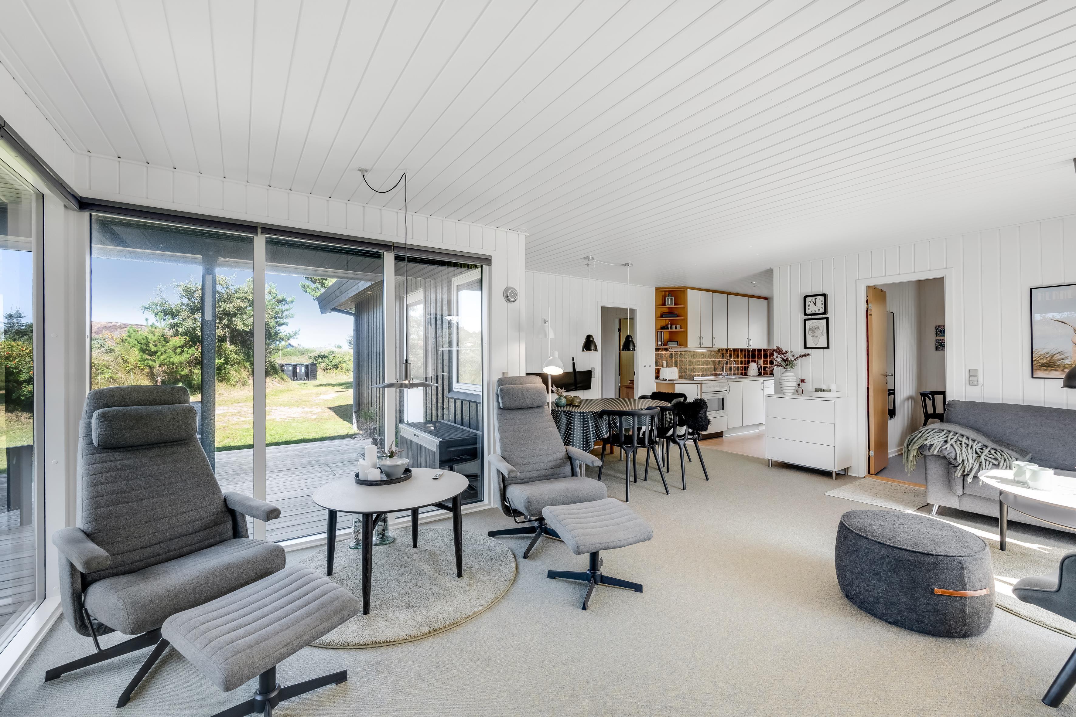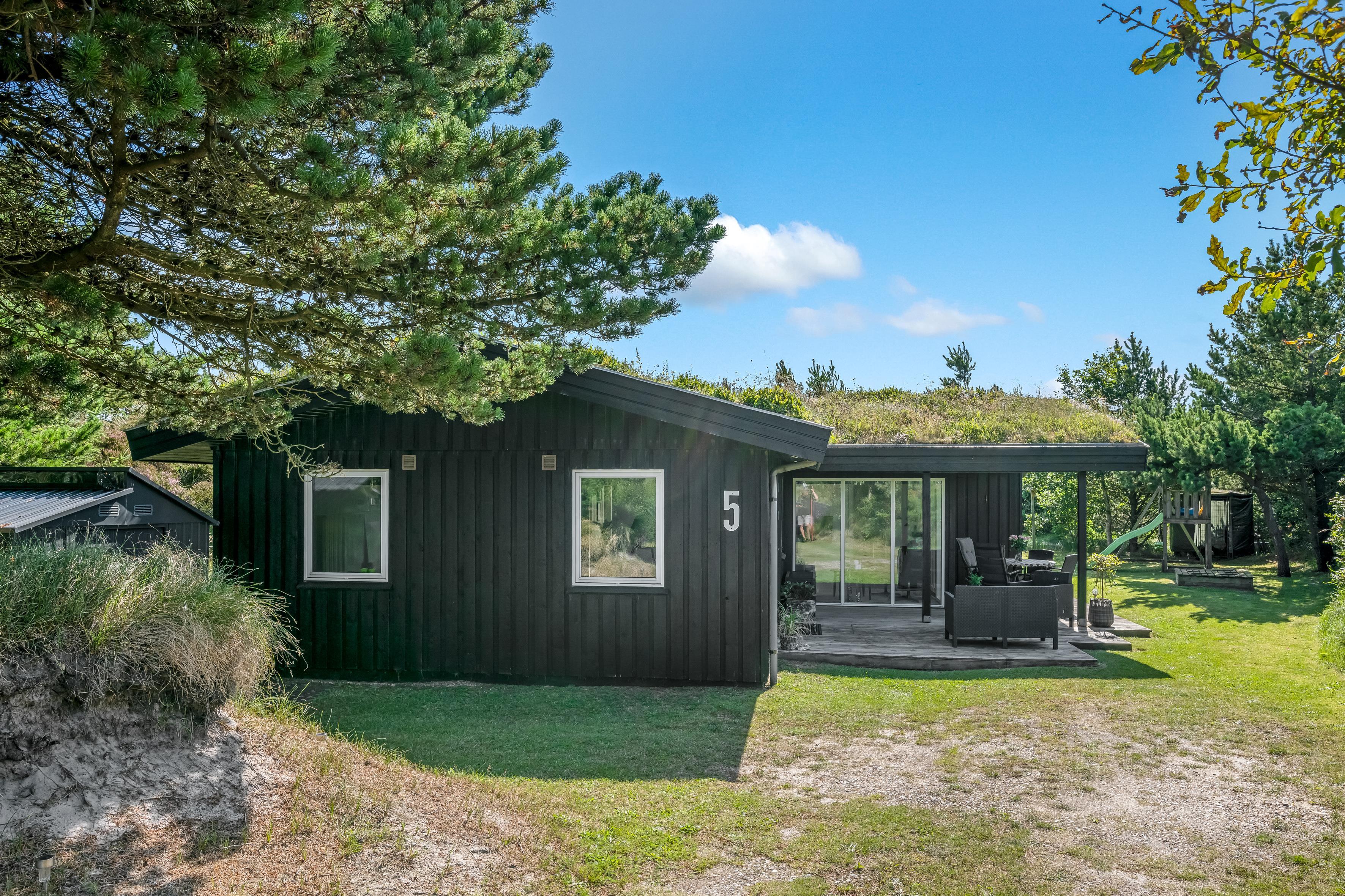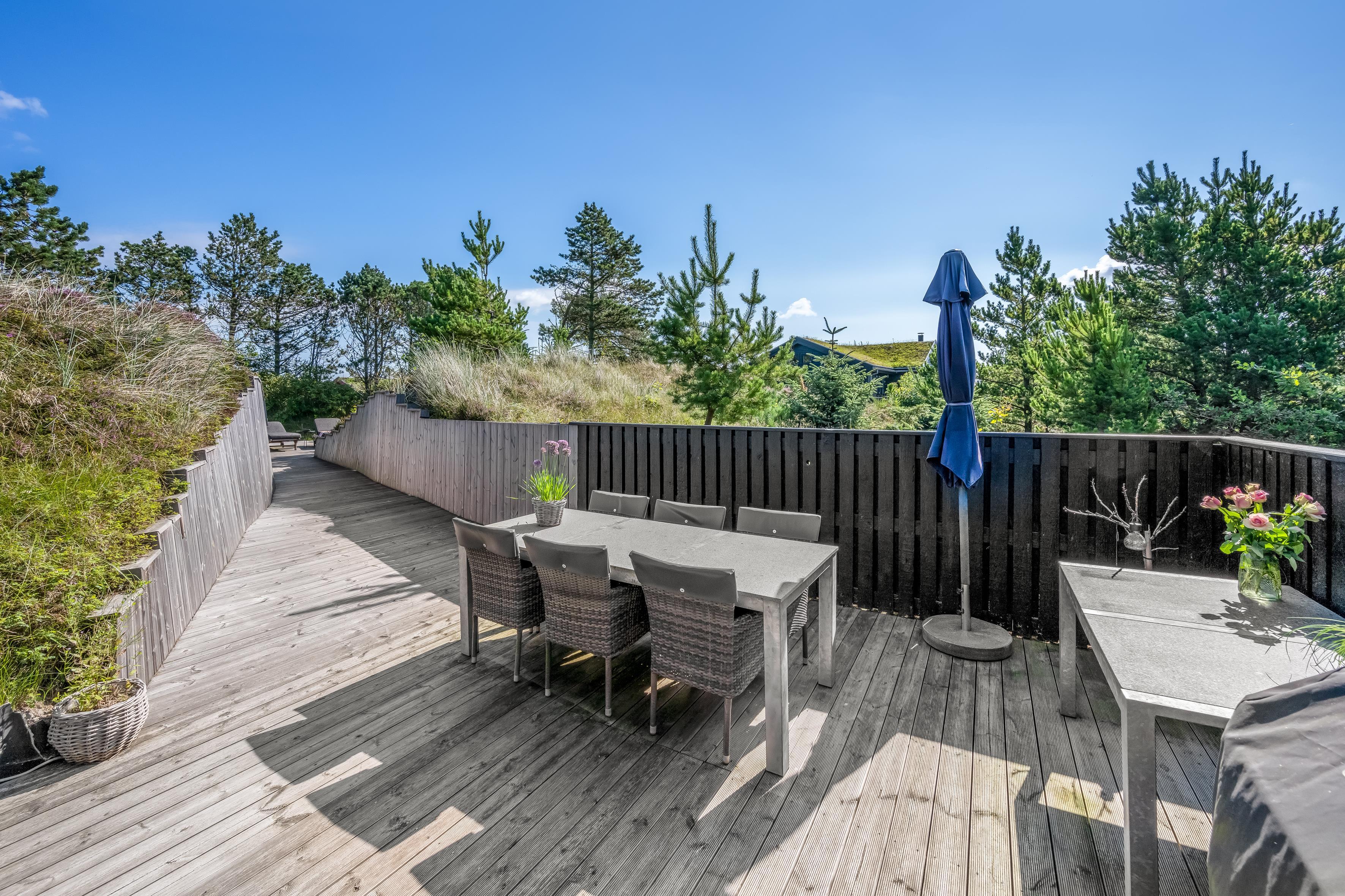 Ferie på Tranebærvej 5 i Henne Strand er også lig med at nyde tiden på en af de skønneste klitgrunde i Danmark. Start dagen med morgenmad på den overdækkede terrasse, eller brug havemøblerne til at slappe af med familien og dele dagens historier på træterrassen omkring huset.