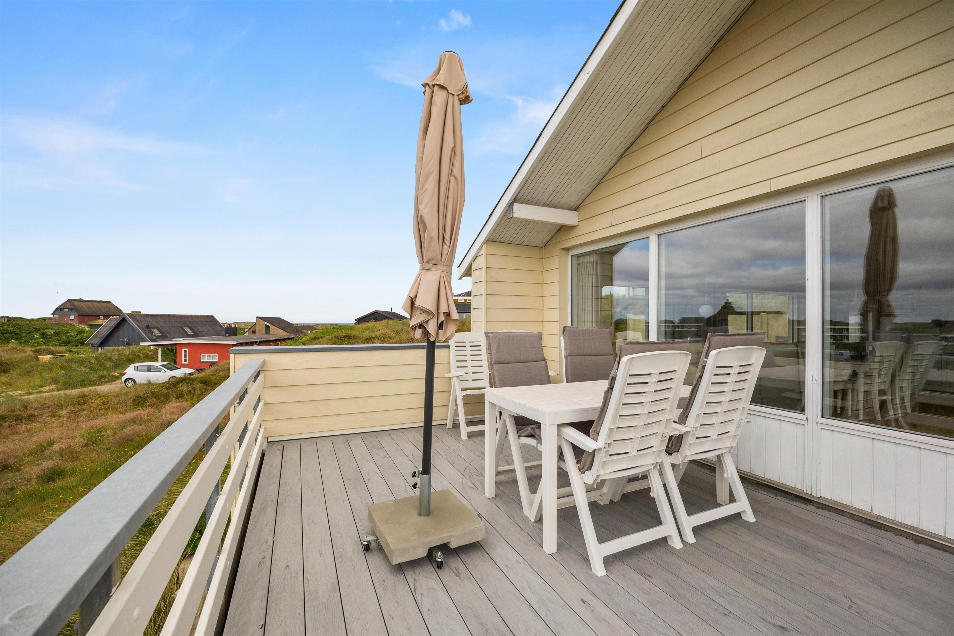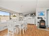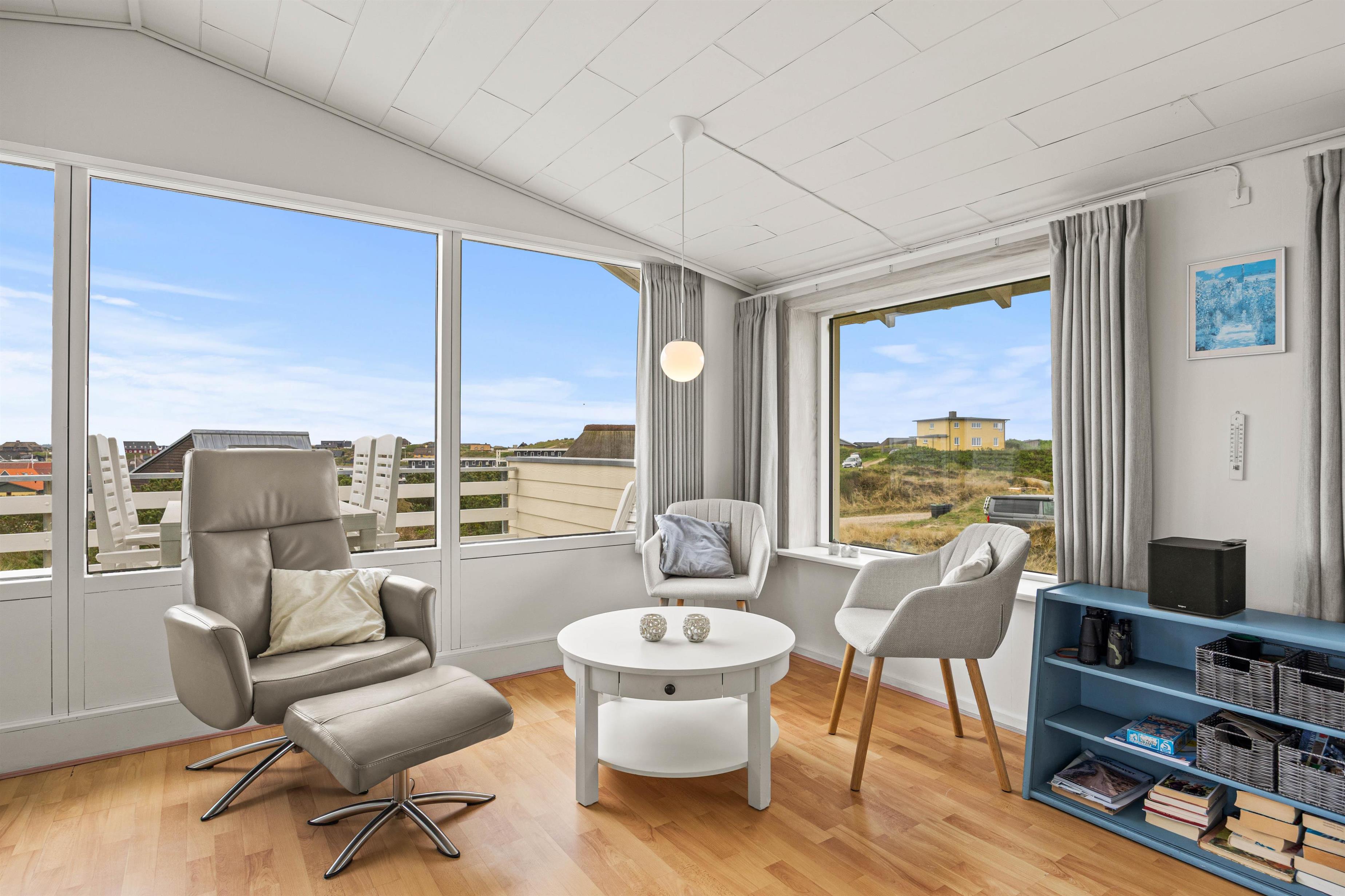 Glem uret og dagligdagens bekymringer og hold ferie i denne tidslomme med den fantastiske udsigt! De store panoramavinduer i stuen går hele vejen rundt og rummet er indrettet med lyse bekvemme møbler, der genspejler det lækre lys, som kun himlen over havet har. Om aftenen, når I er mætte af dagens oplevelser med sol, bølgebrus og vestvind, kan I tænde op i sommerhusets brændeovn. Med den ekstra varme og hyggestemning afrundes en skøn feriedag på perfekt vis.
