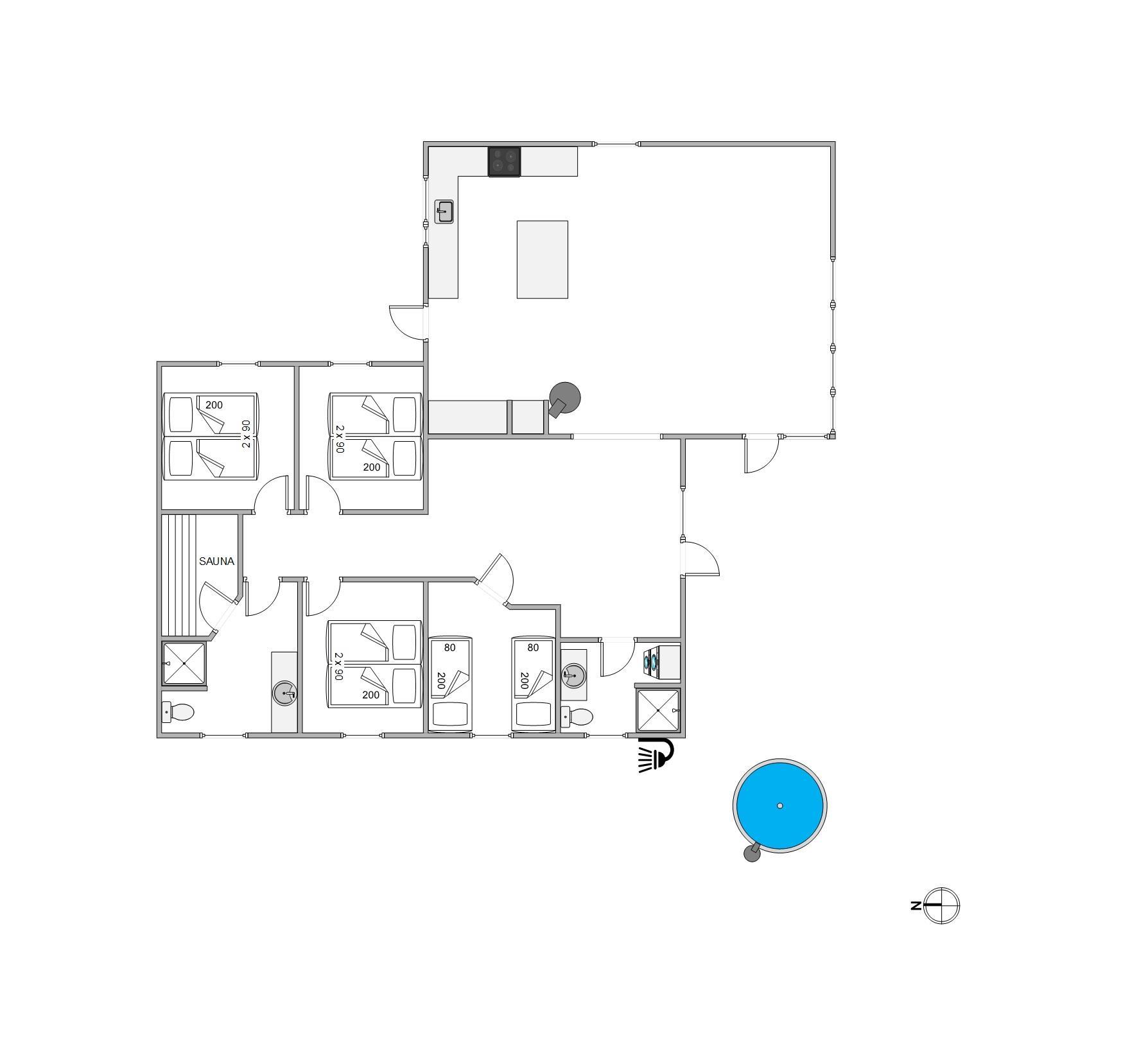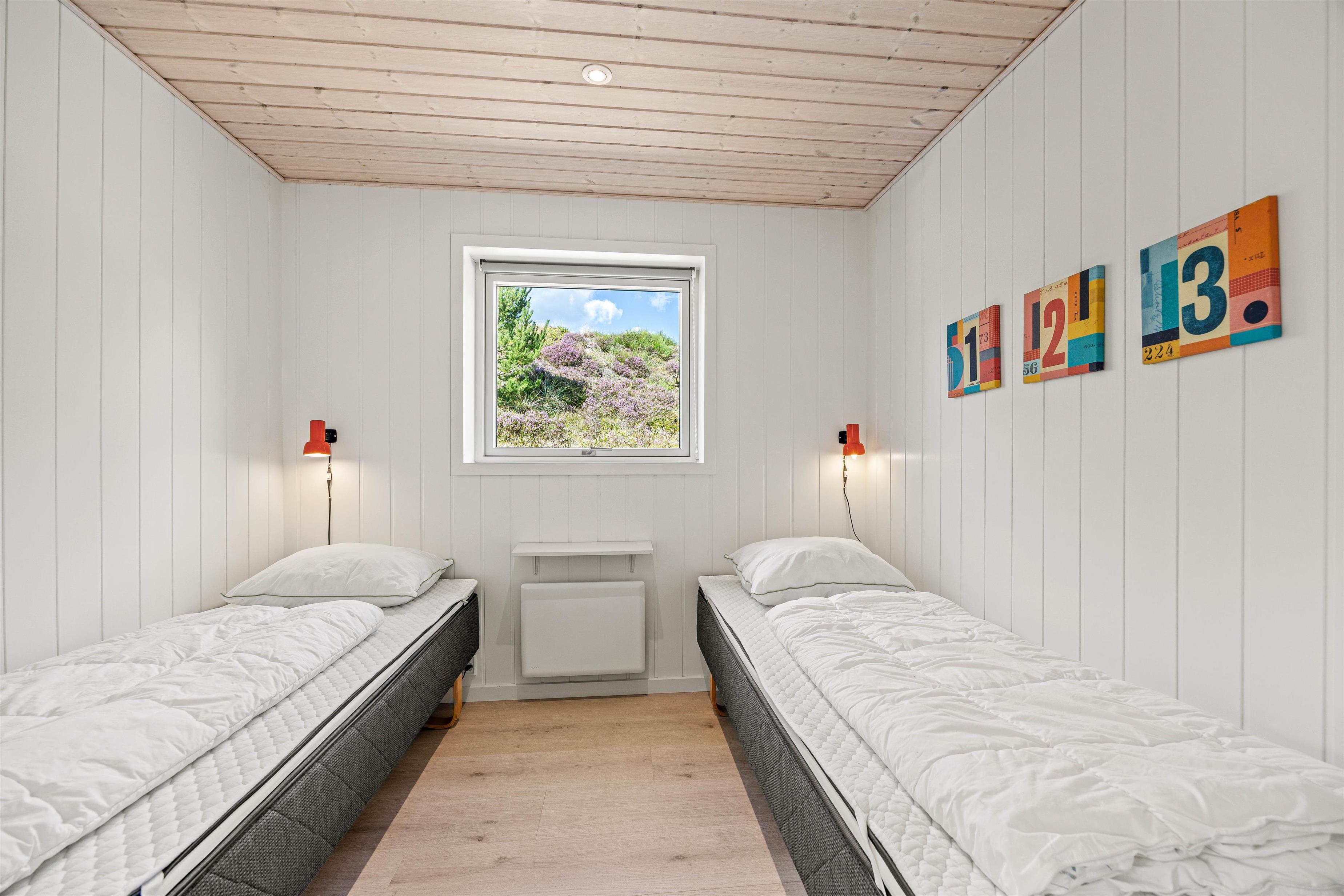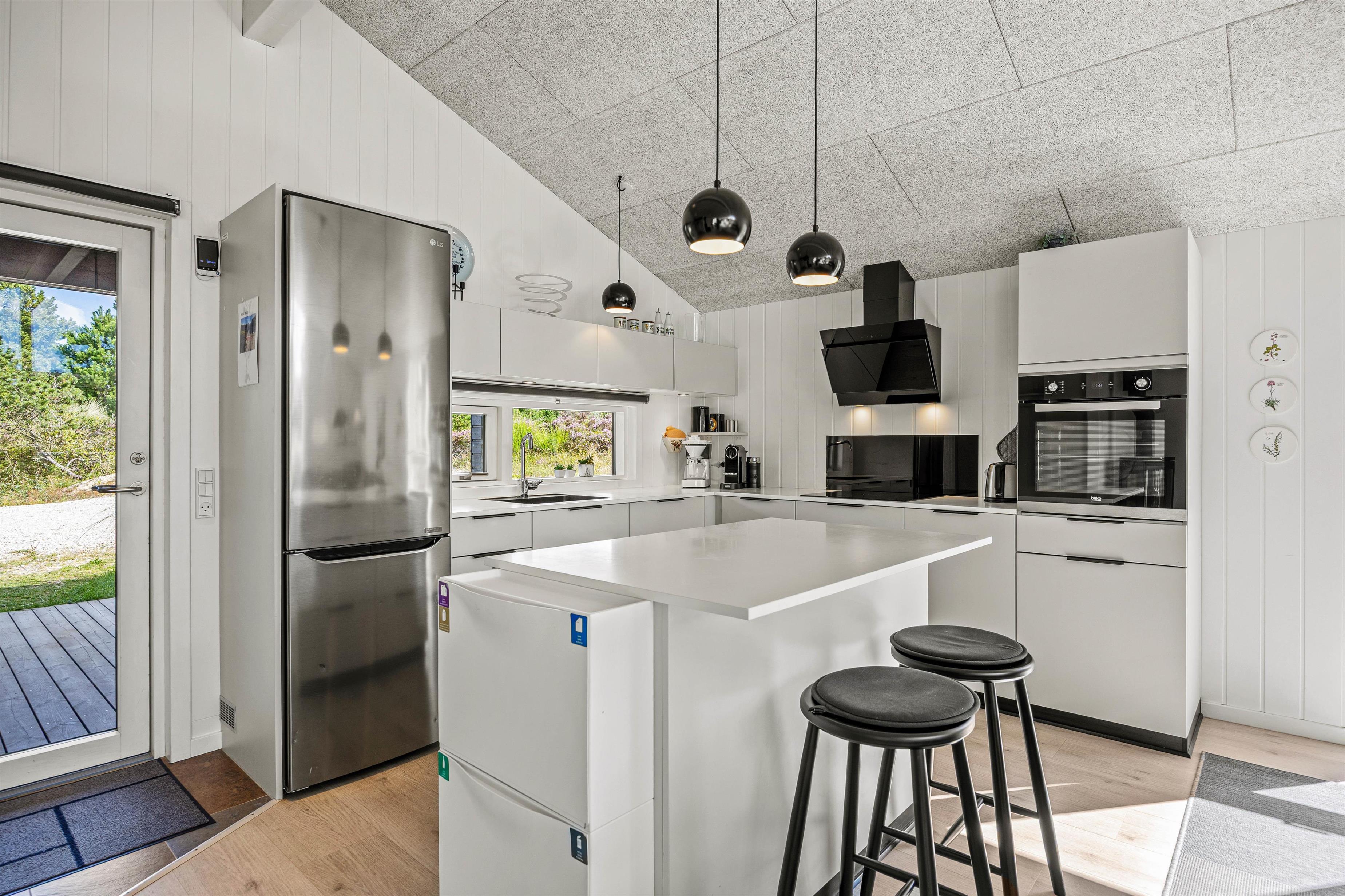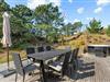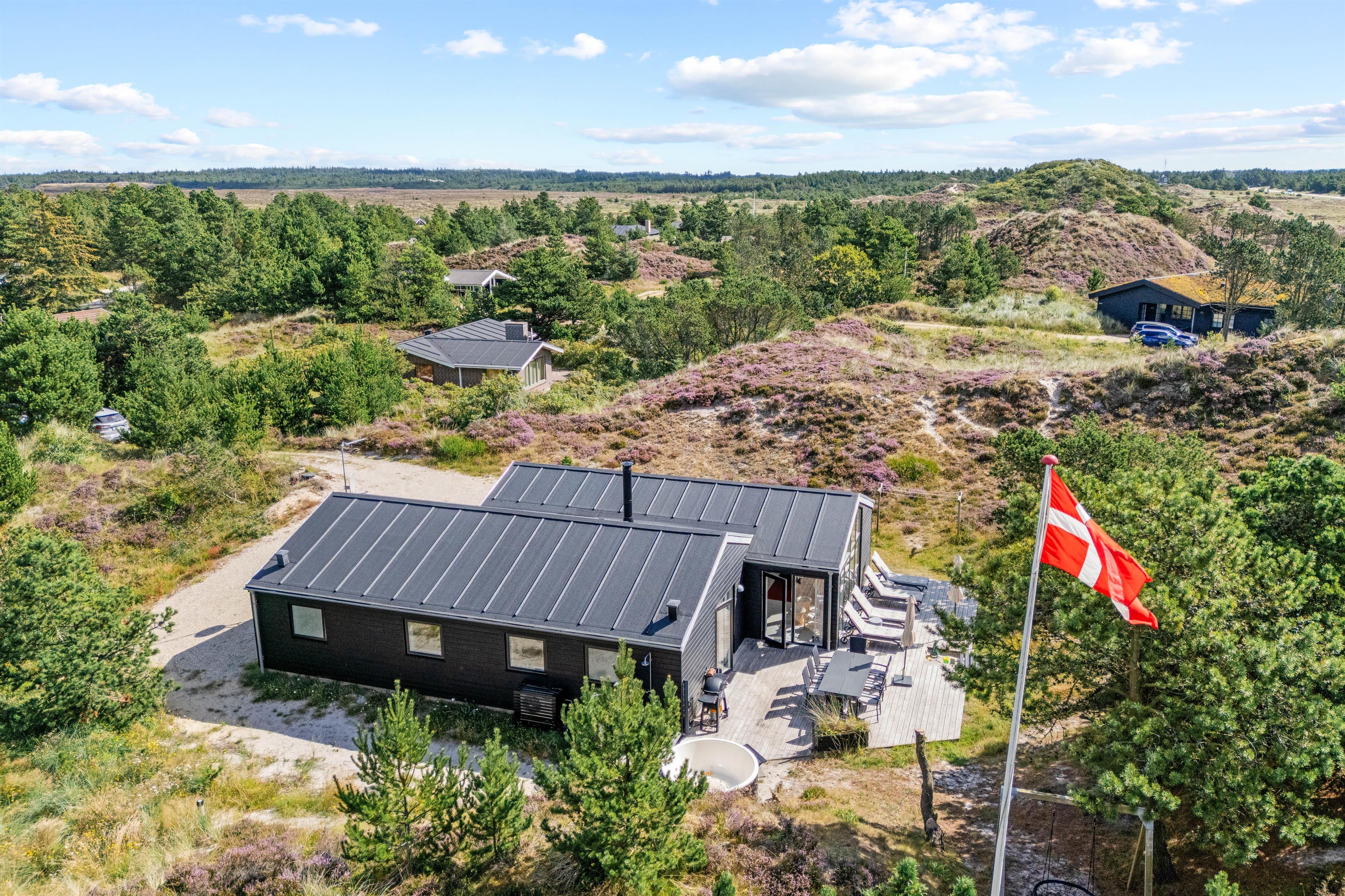 Ro og læ og en duft af lynghede er kendetegnene for beliggenheden. Sommerhuset ligger på en stor naturgrund, gemt bag lyng- og fyrretræsbeklædte klitter med kun nogle få hundrede meter til indkøb. Her er en magisk stille stemning og I kan nemt tilbringe dagen på sommerhusets terrasser, der lover læ og plads til solbadning, grillhygge og et vildmarksbad! Børnene vil elske gyngerne og sandkassen. Trænger I til at få skyllet sand og salt af huden efter en tur på stranden, eller blot trænger at køle af, kan I nemt bruge udebruseren* til dette.