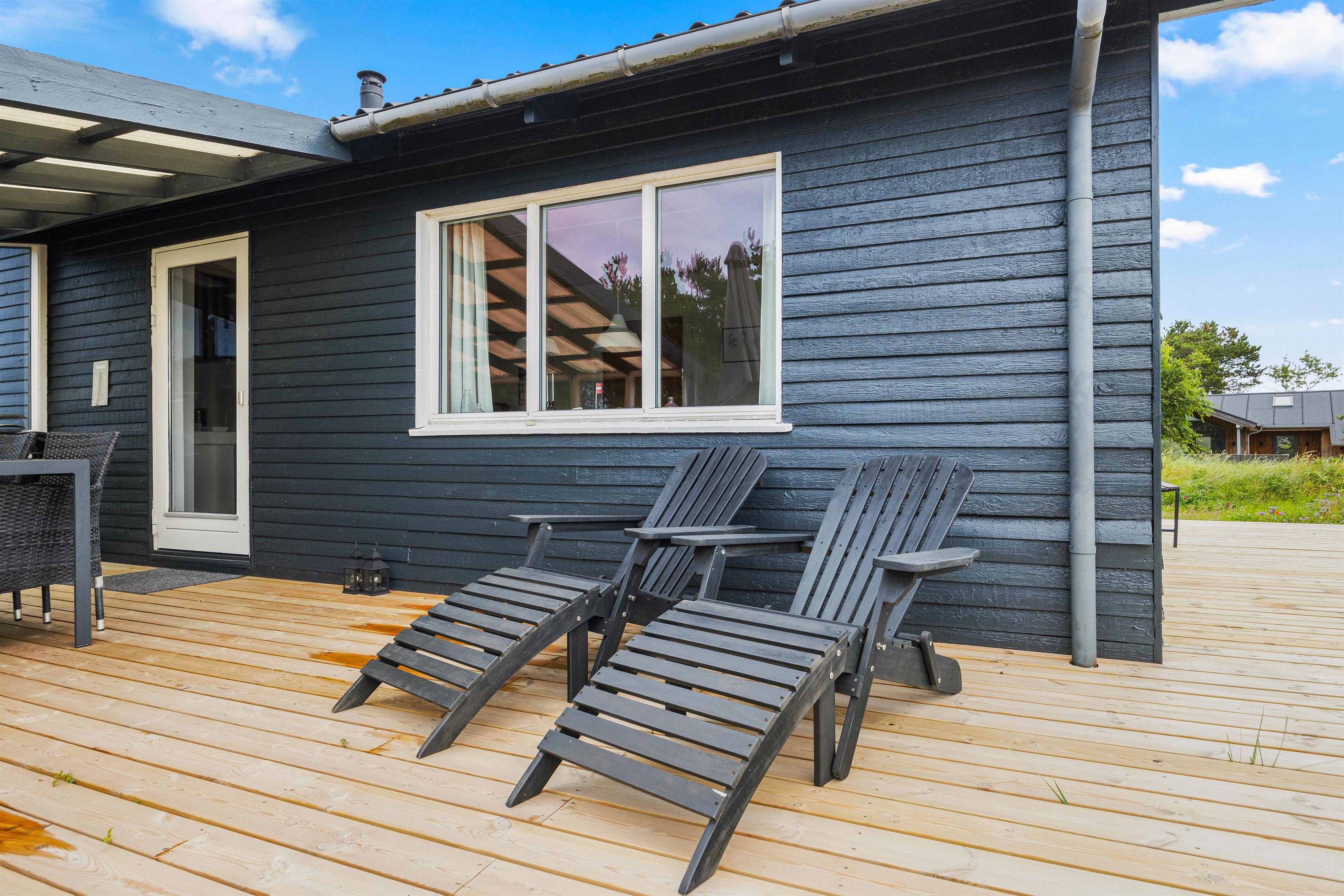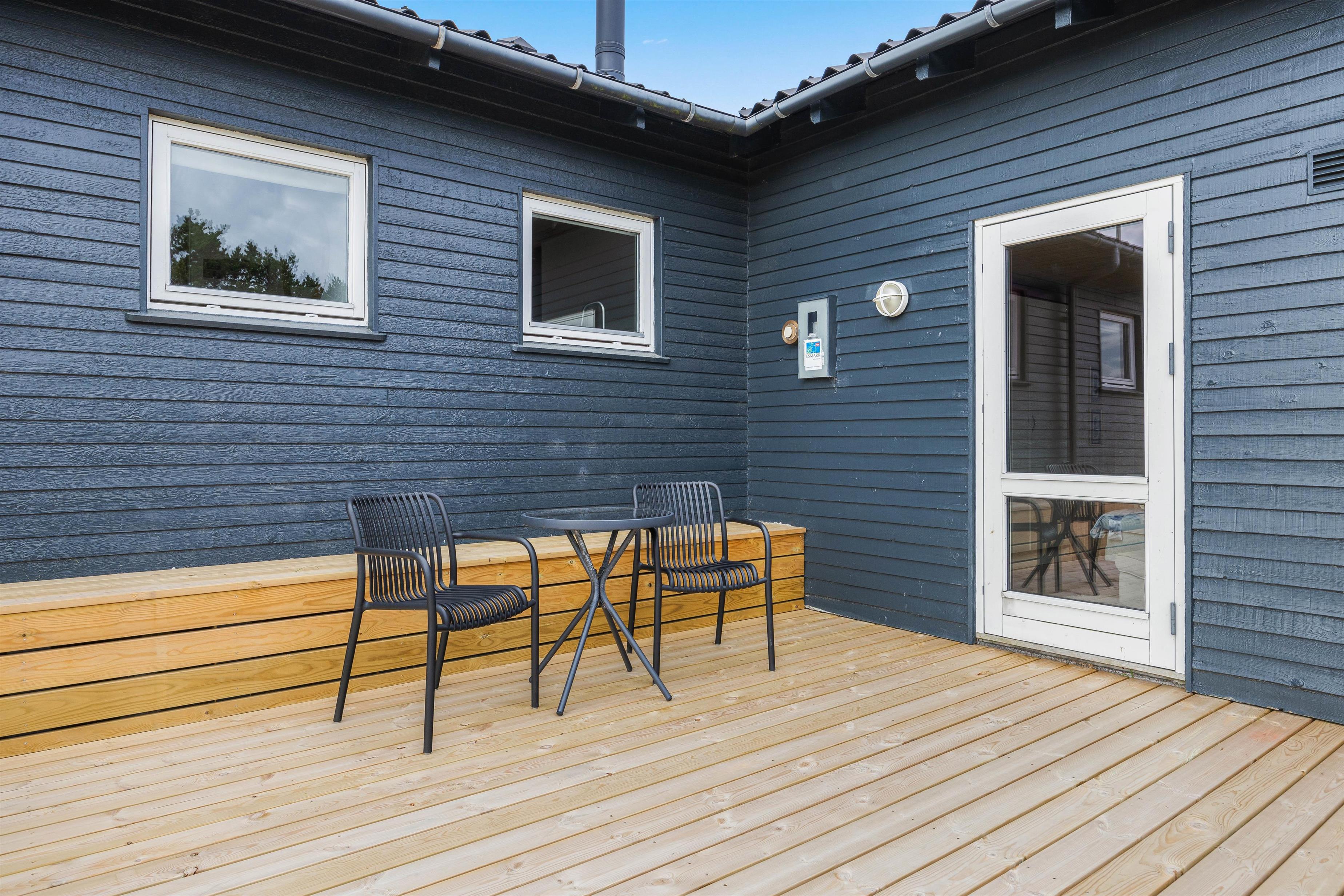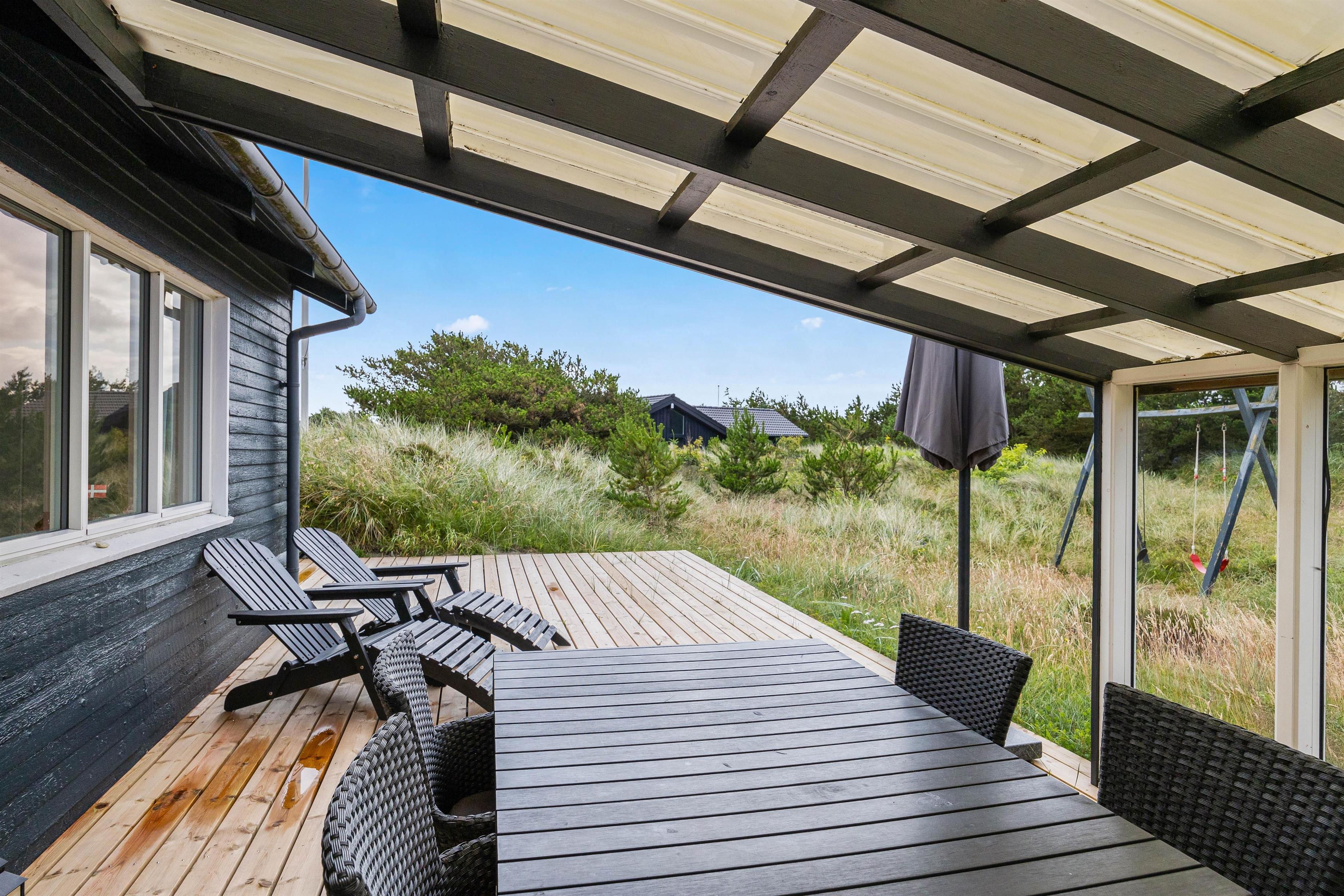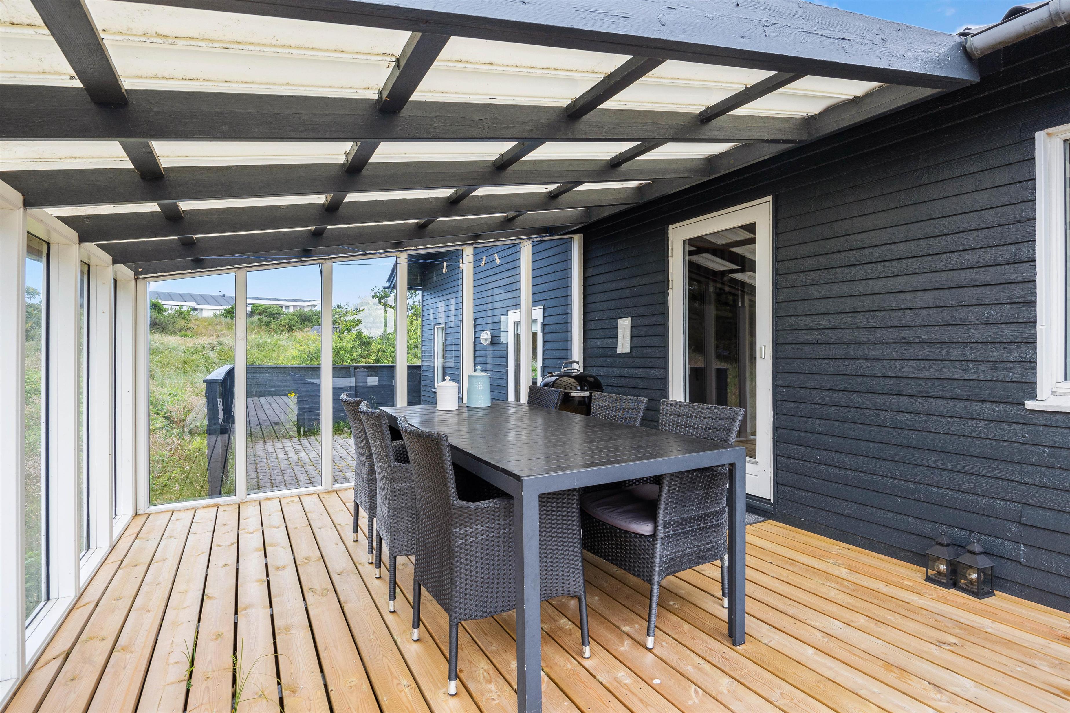 Fra spisestuen kommer I ud på den lukkede og delvist overdækkede terrasse. Her er der masser af små hyggekroge, og den overdækkede og afskærmede del gør det muligt at sidde i både læ og ly og nyde den friske havluft hele året rundt. På grunden er der opsat et gyngestativ, til stor glæde for de mindste.