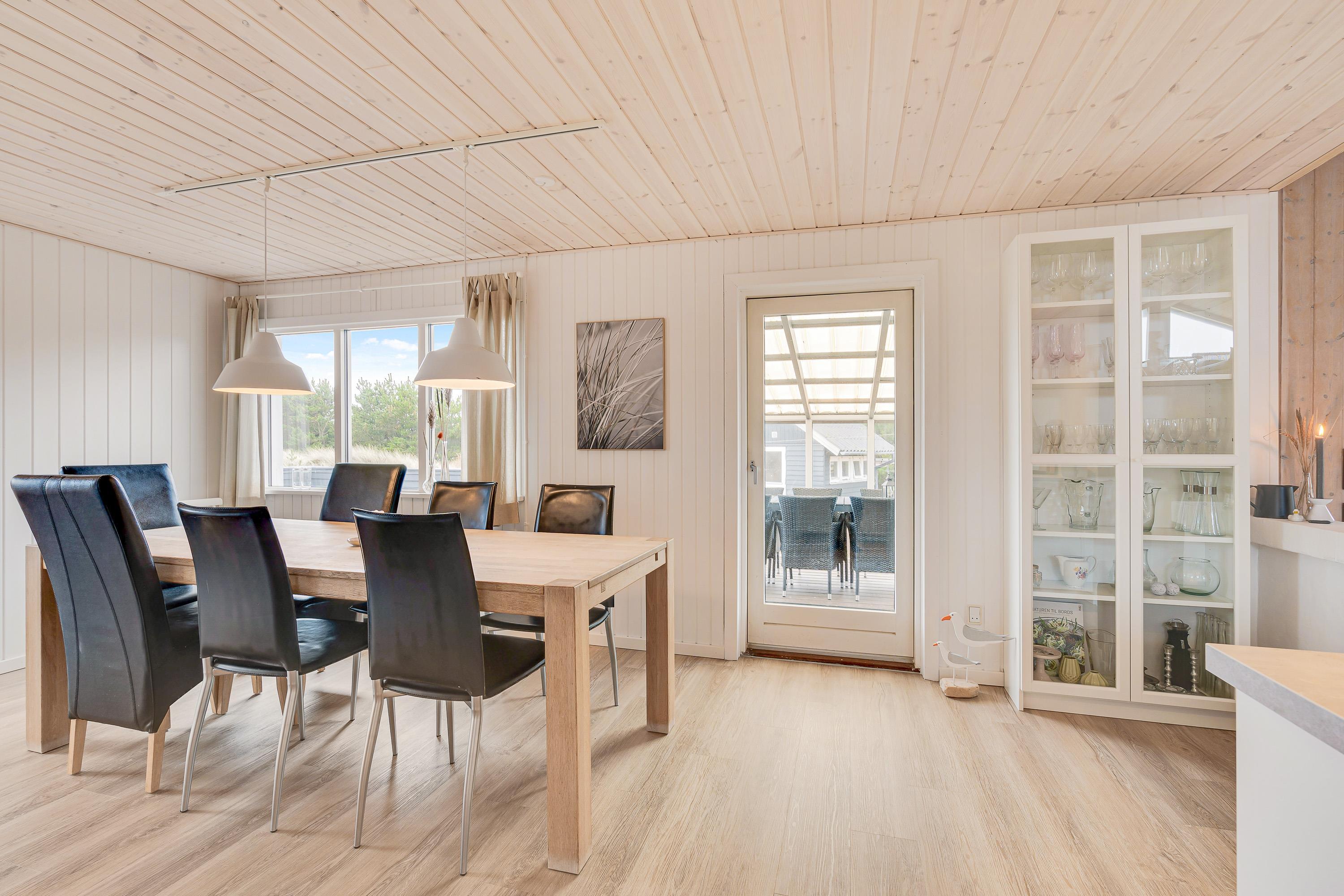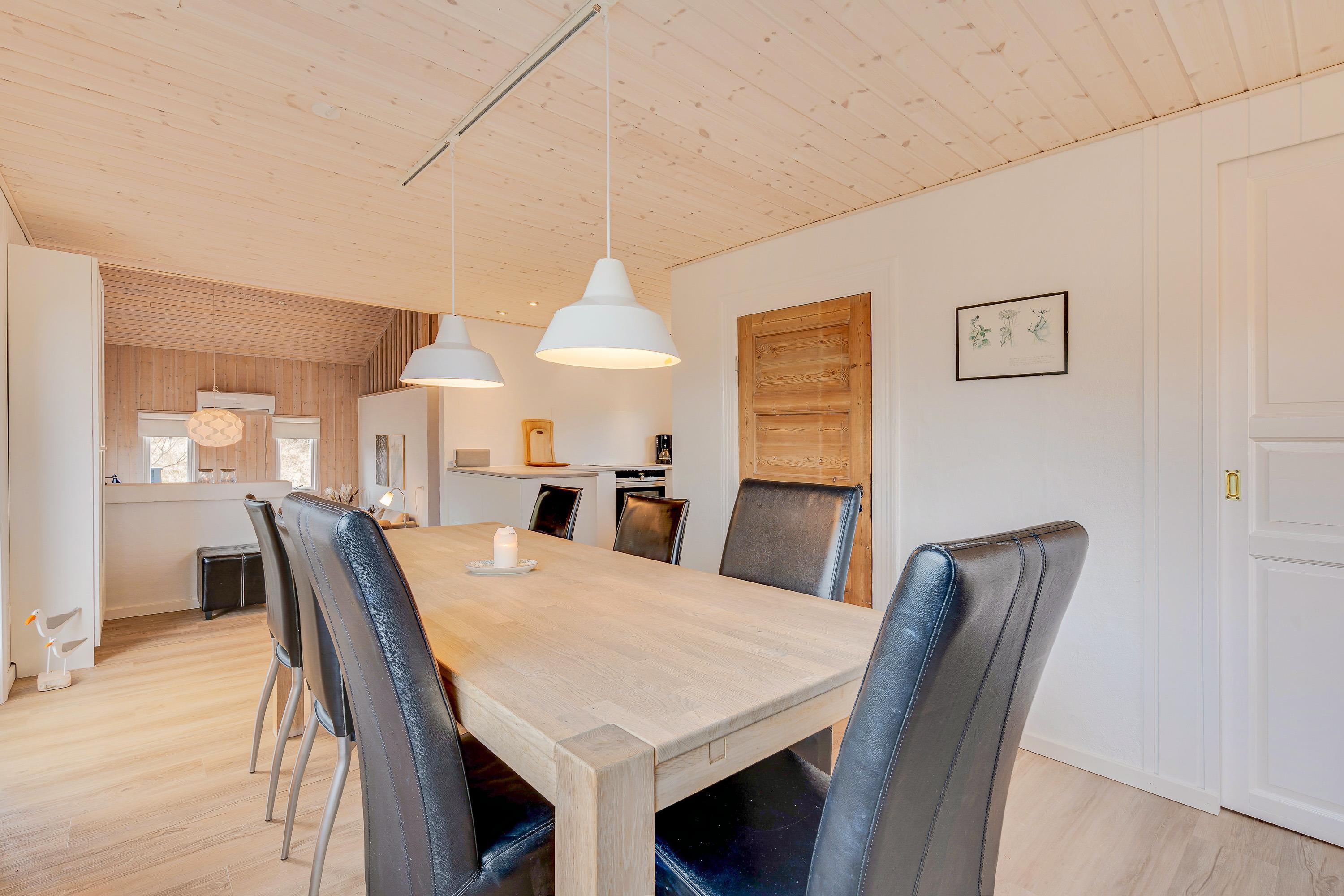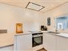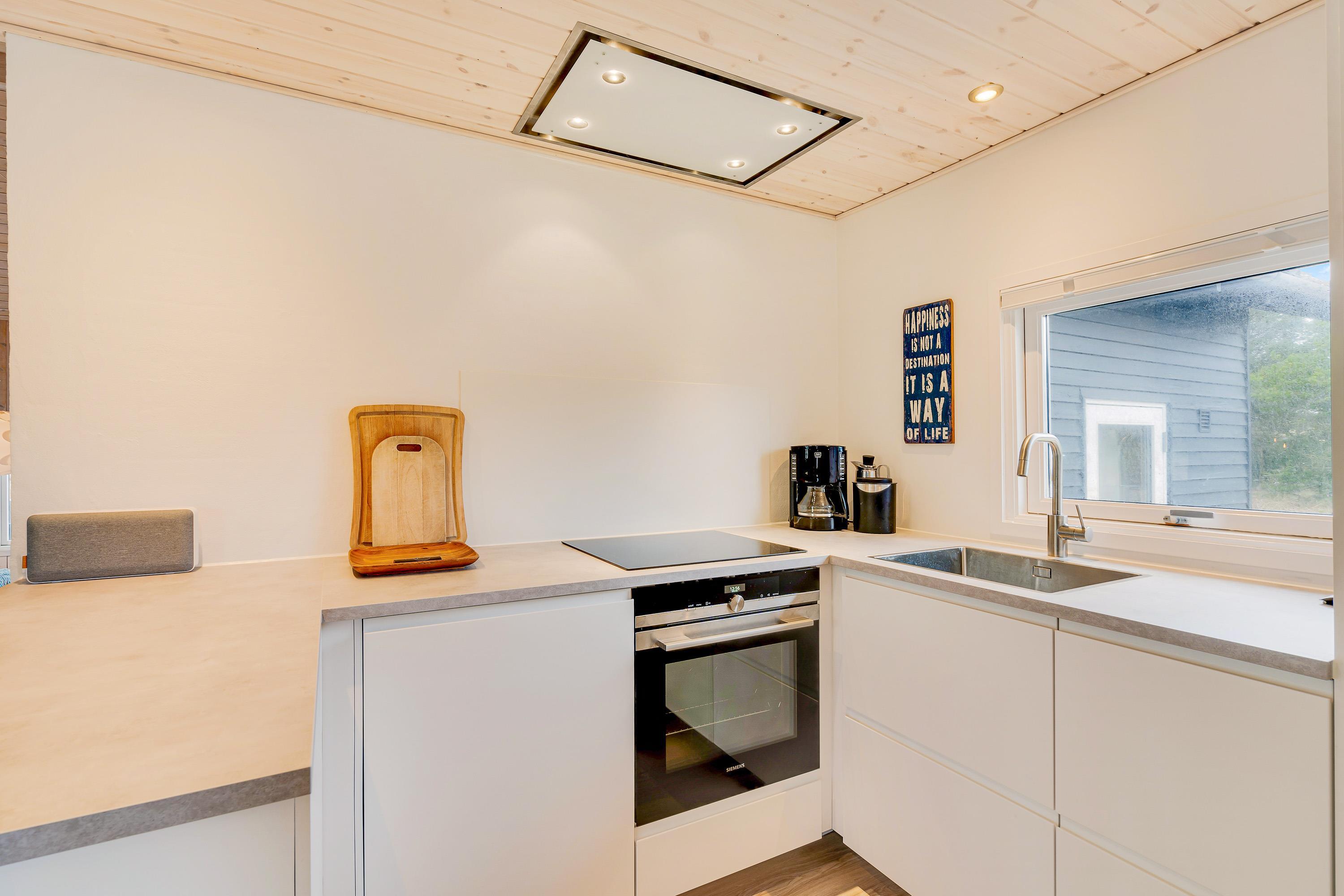 Det stilrene og moderne køkken er i åben forbindelse til spisestuen. Her kan i tilberede en lækker middag og i kan hurtigt få ryddet op, da opvaskemaskinen klarer opvasken for jer.
