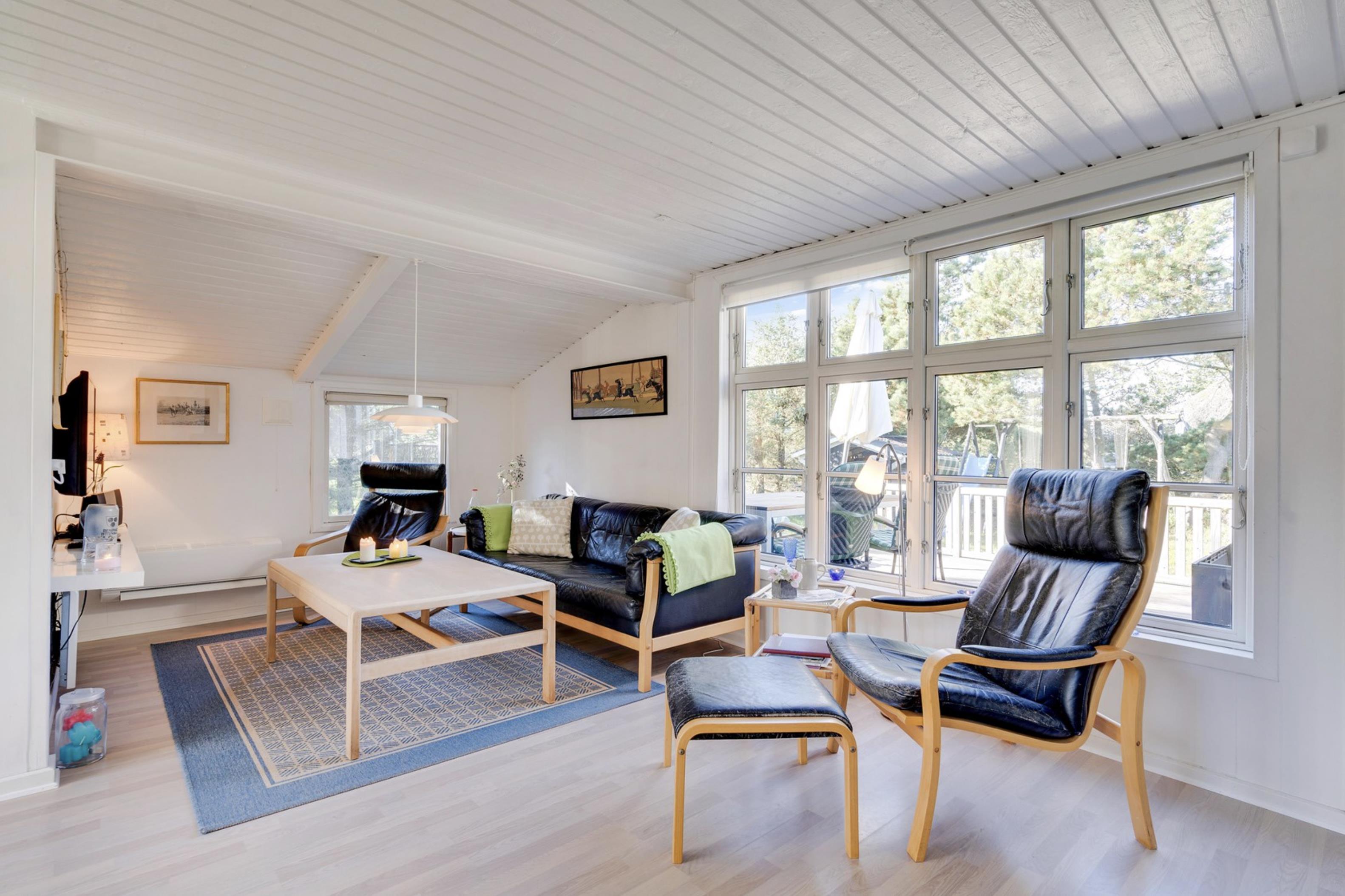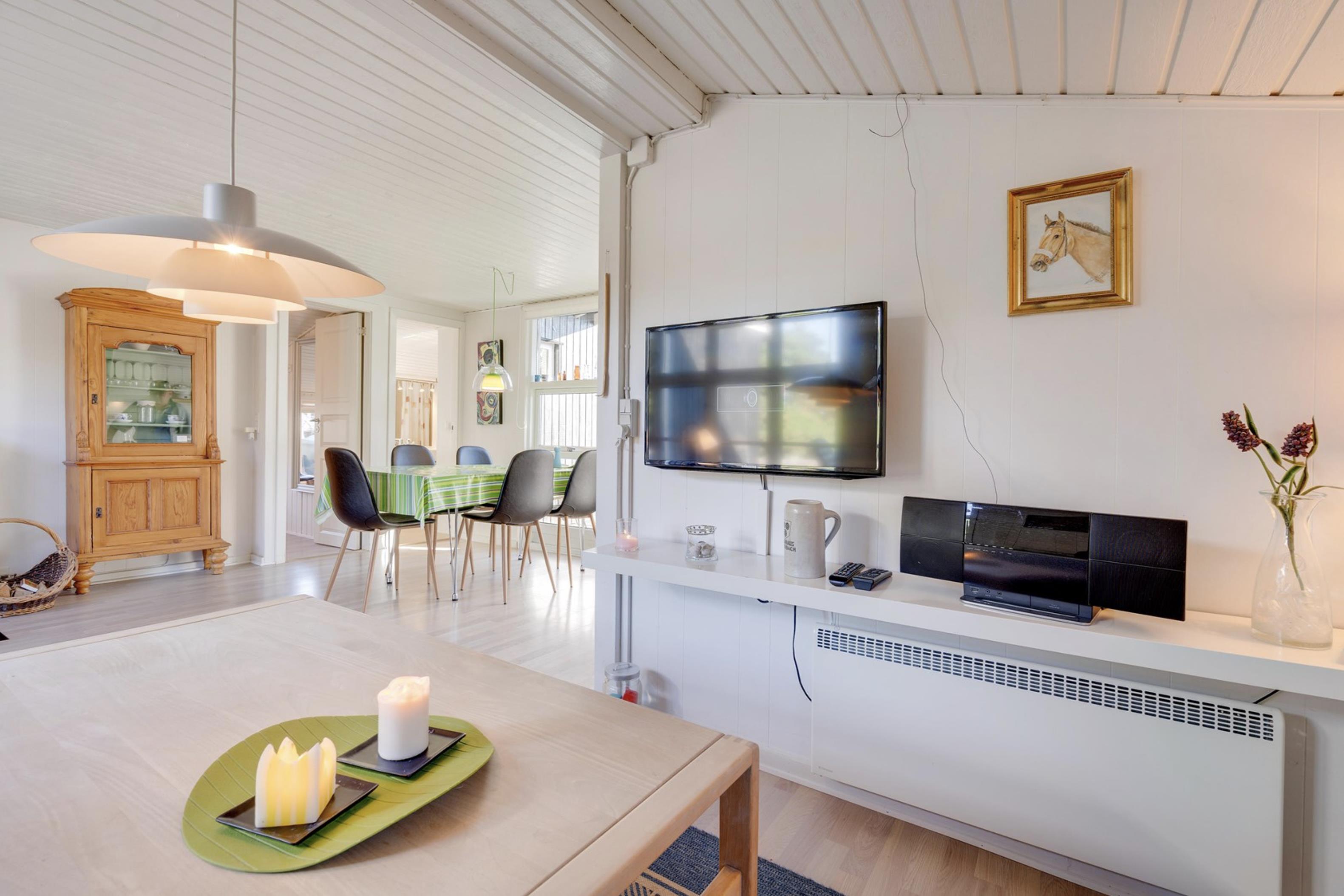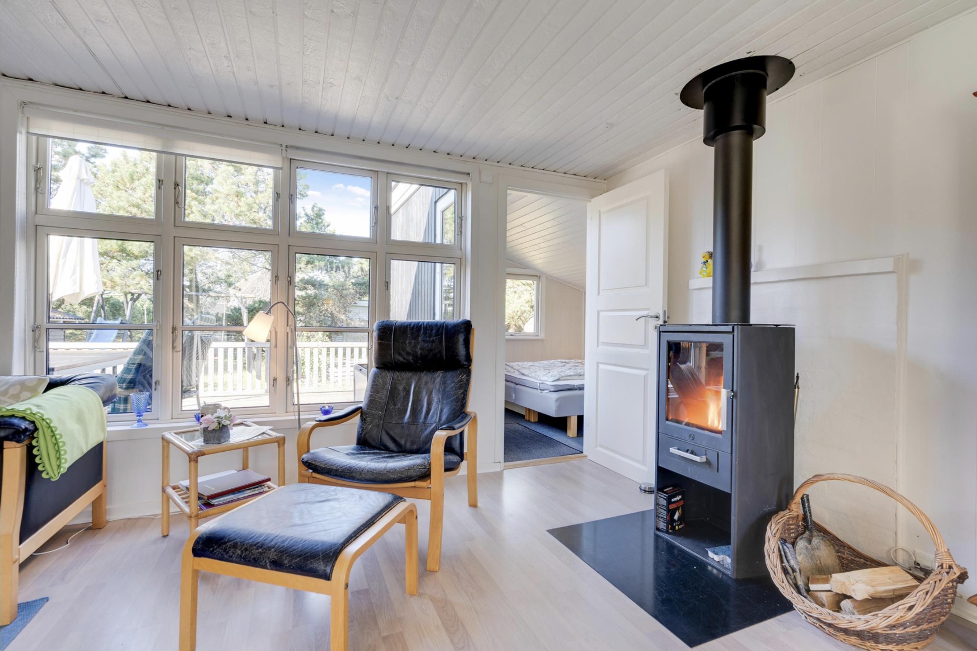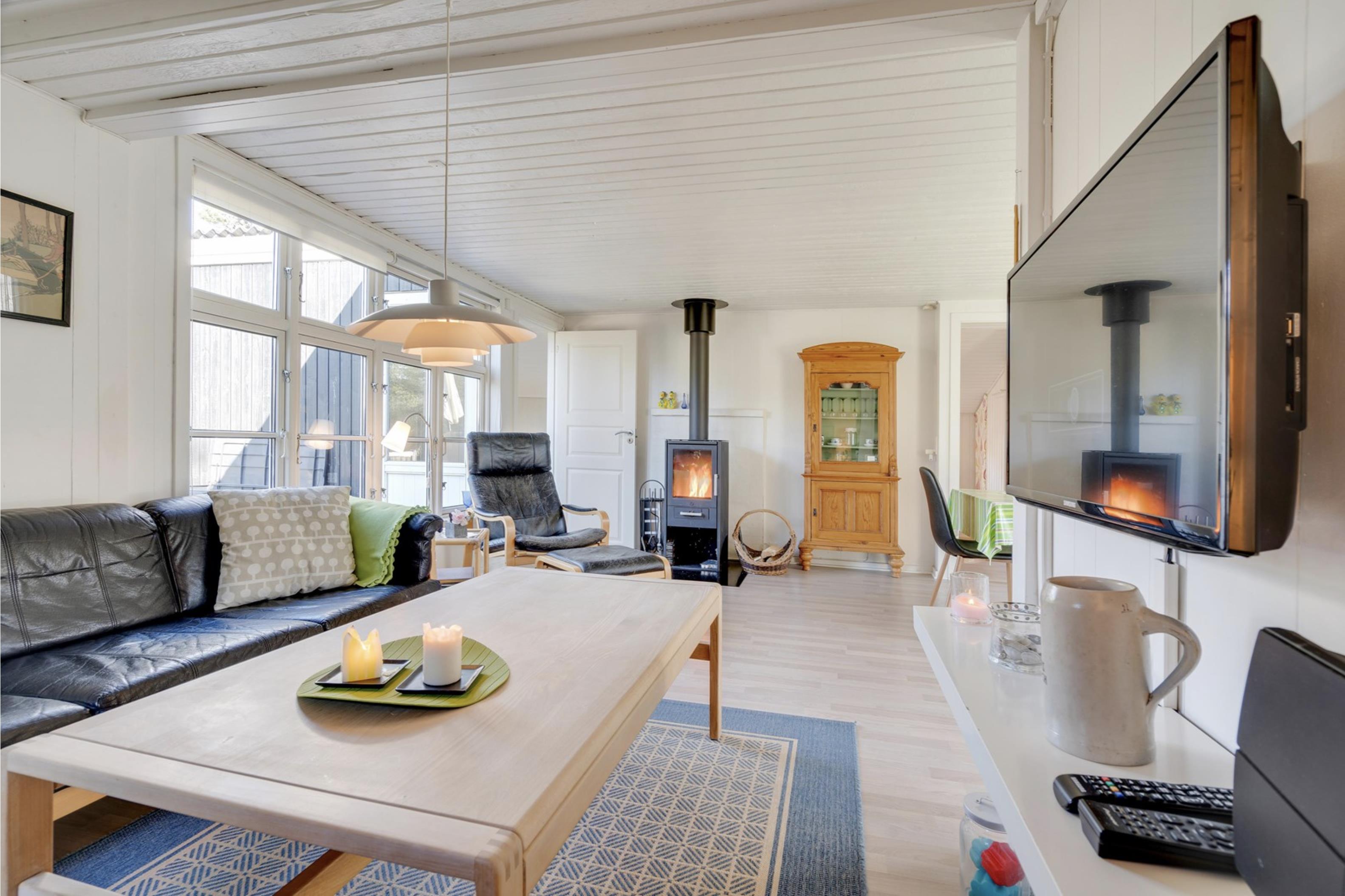 Sommerhusets lyse og moderne indretning gør, at I straks vil føle jer godt tilpas. Den lyse og velindrettede stue ligger i forlængelse af den fine spisestue. Sommerhusets køkken er veludstyret, og her er både opvaskemaskine samt et praktisk køleskab med fryseboks. Den hyggelige pejs vil sprede feriehygge og varme, imens den energibesparende varmepumpe sørger for en behagelig temperatur i alle sommerhusets rum.