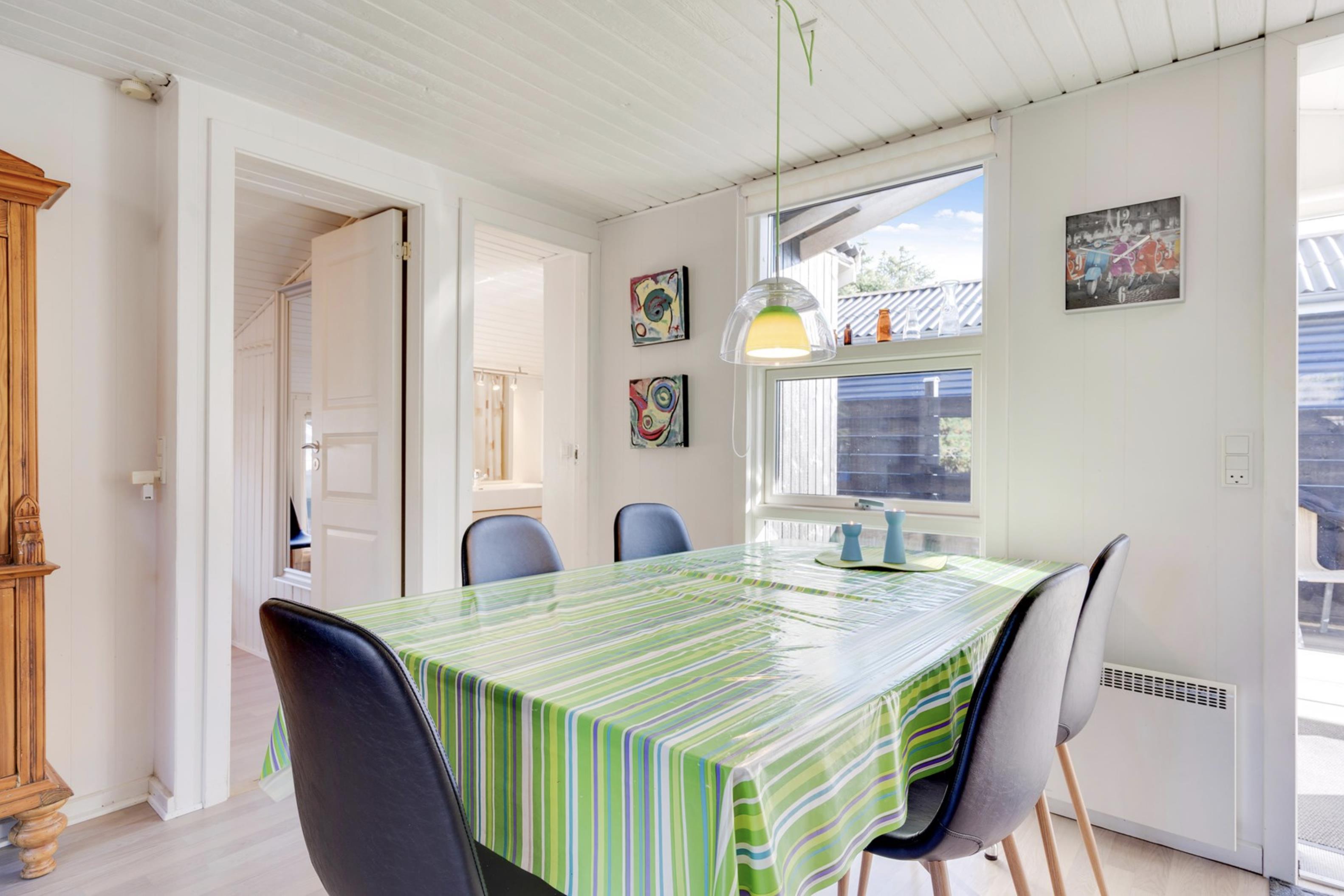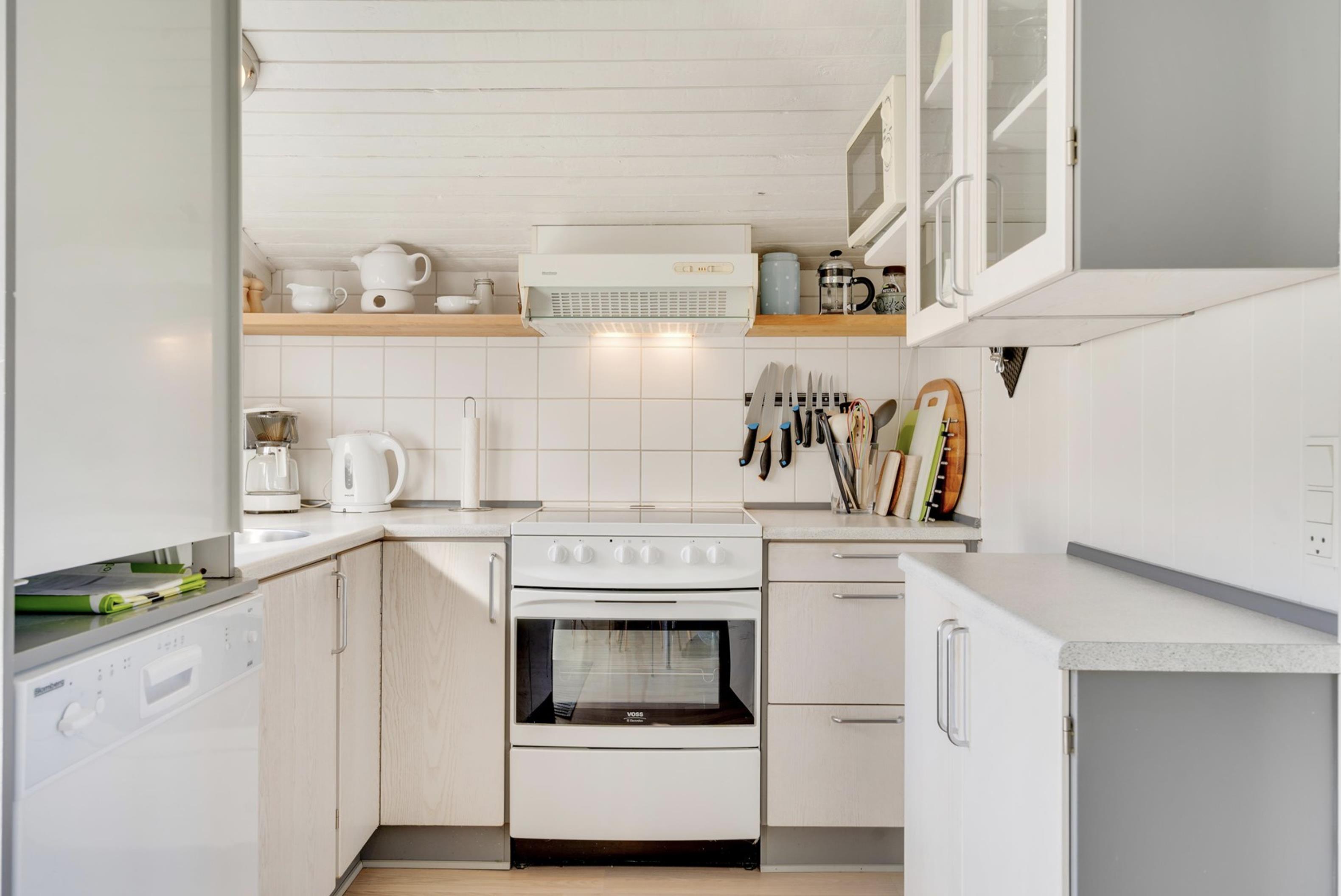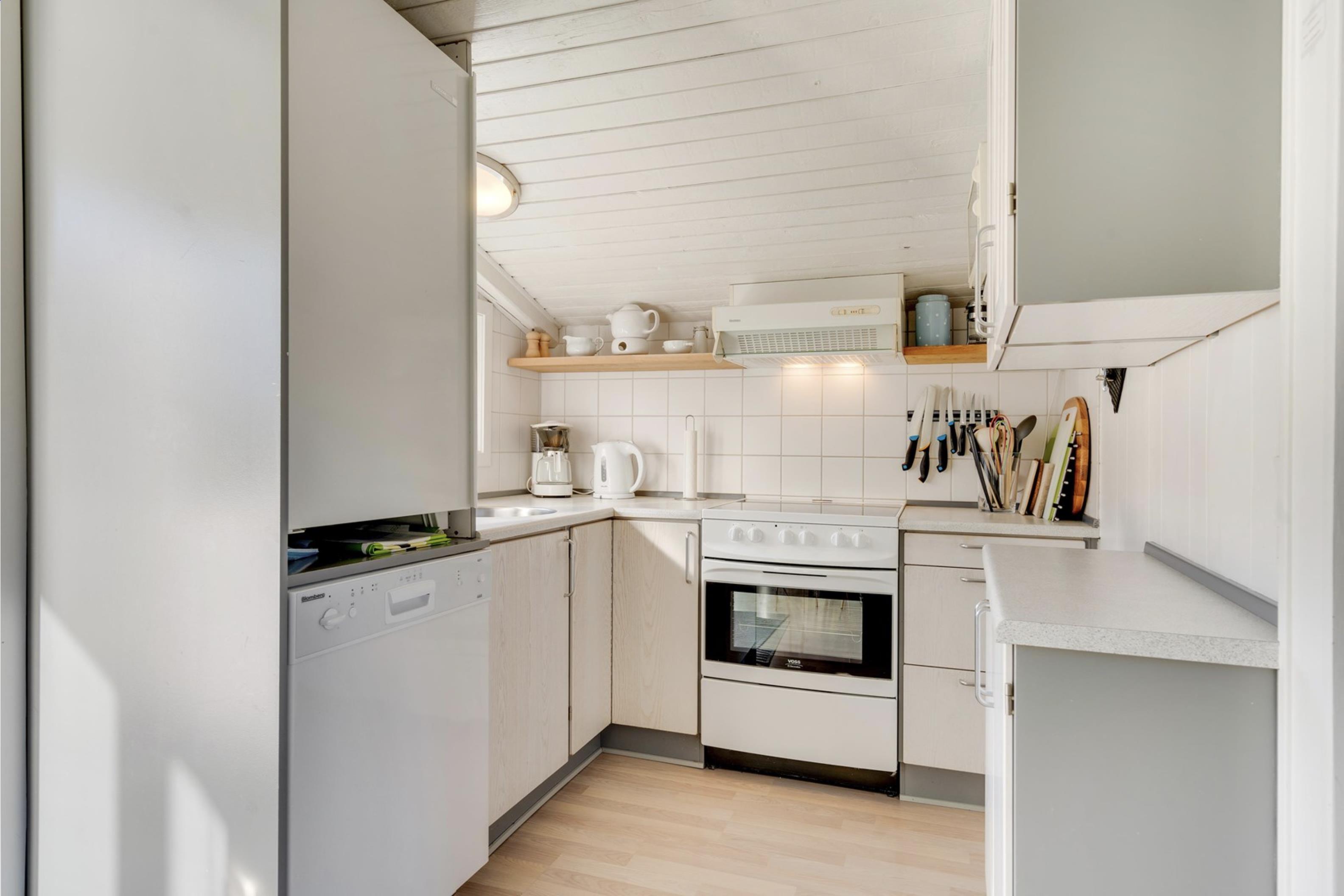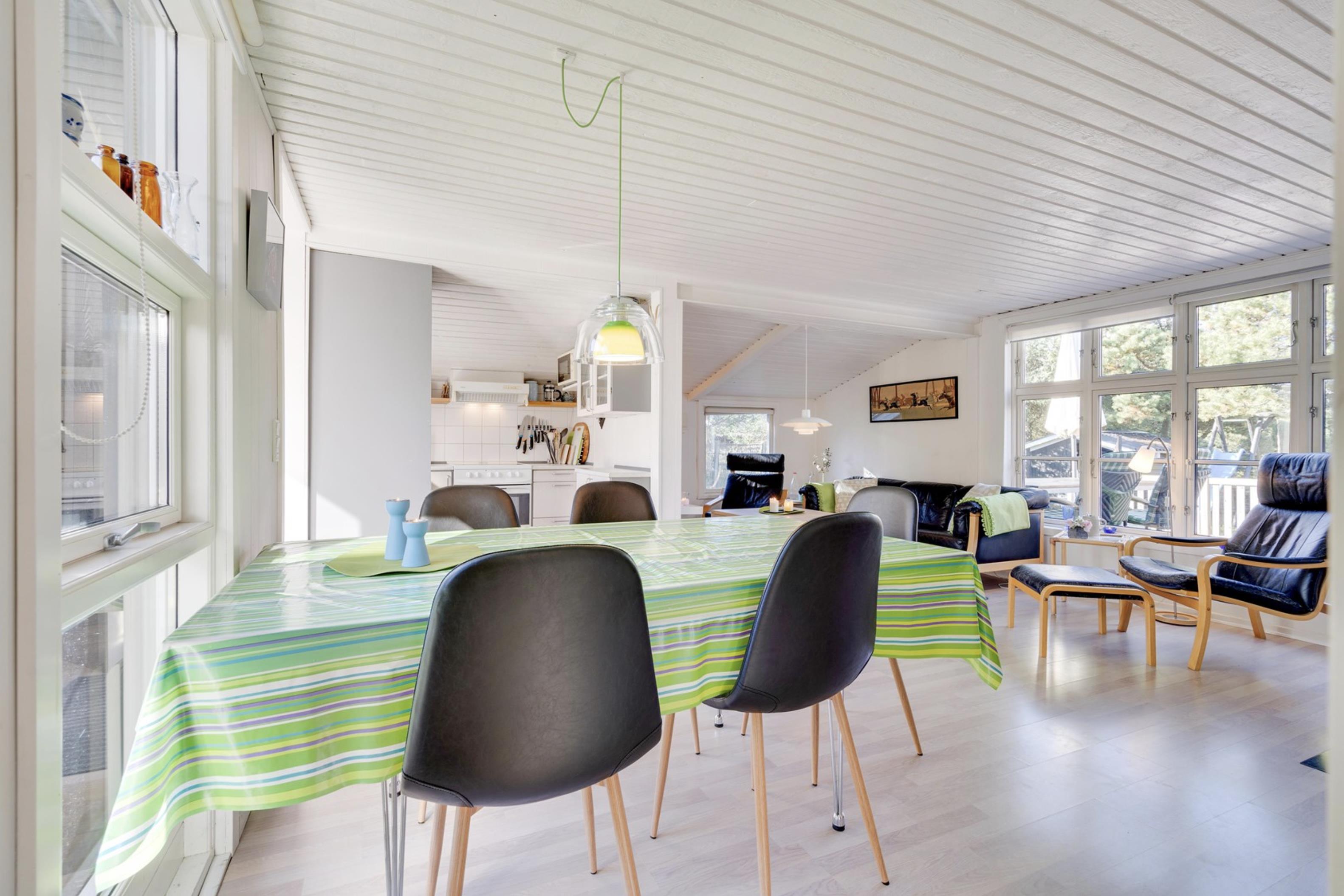 Sommerhusets lyse og moderne indretning gør, at I straks vil føle jer godt tilpas. Den lyse og velindrettede stue ligger i forlængelse af den fine spisestue. Sommerhusets køkken er veludstyret, og her er både opvaskemaskine samt et praktisk køleskab med fryseboks. Den hyggelige pejs vil sprede feriehygge og varme, imens den energibesparende varmepumpe sørger for en behagelig temperatur i alle sommerhusets rum.