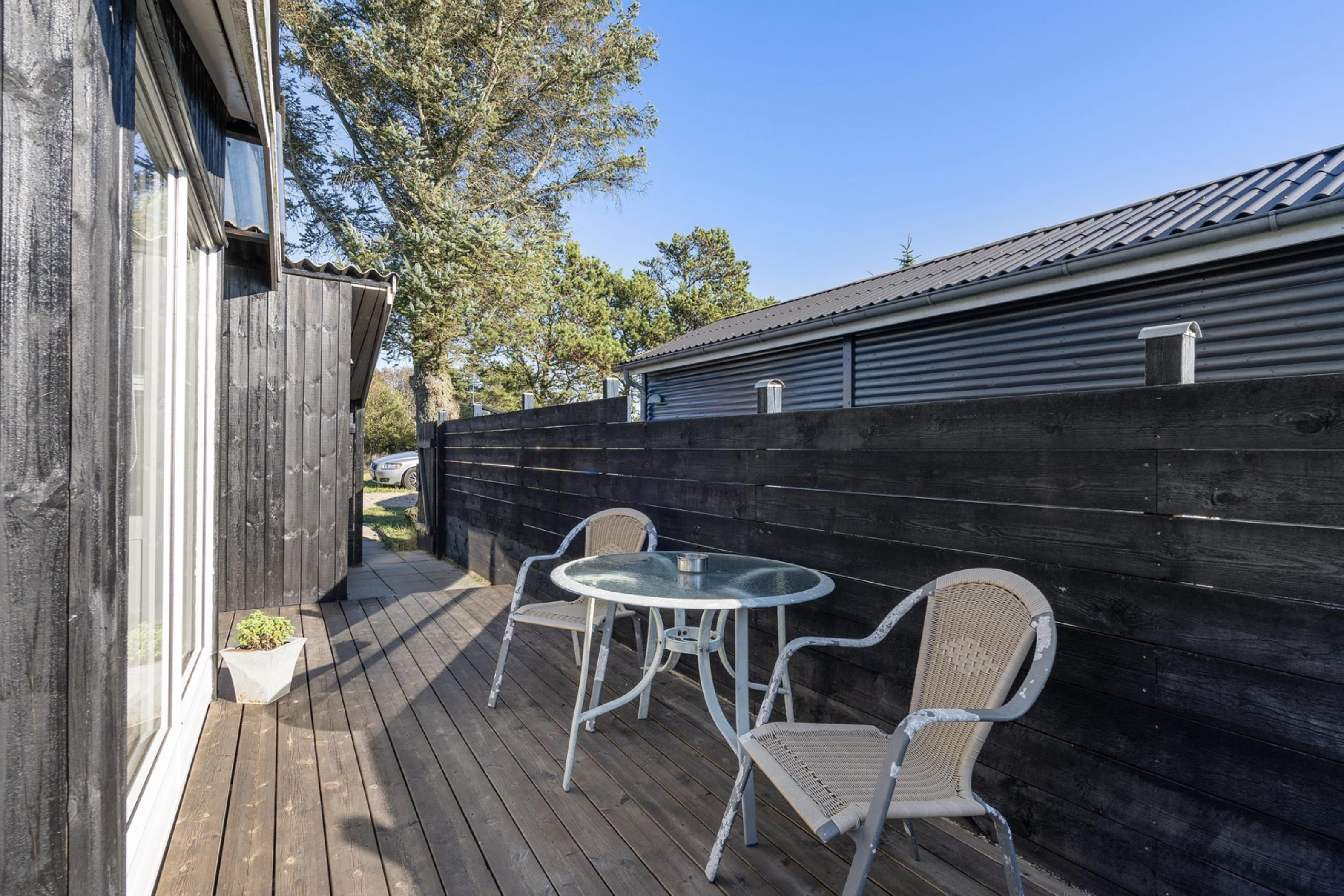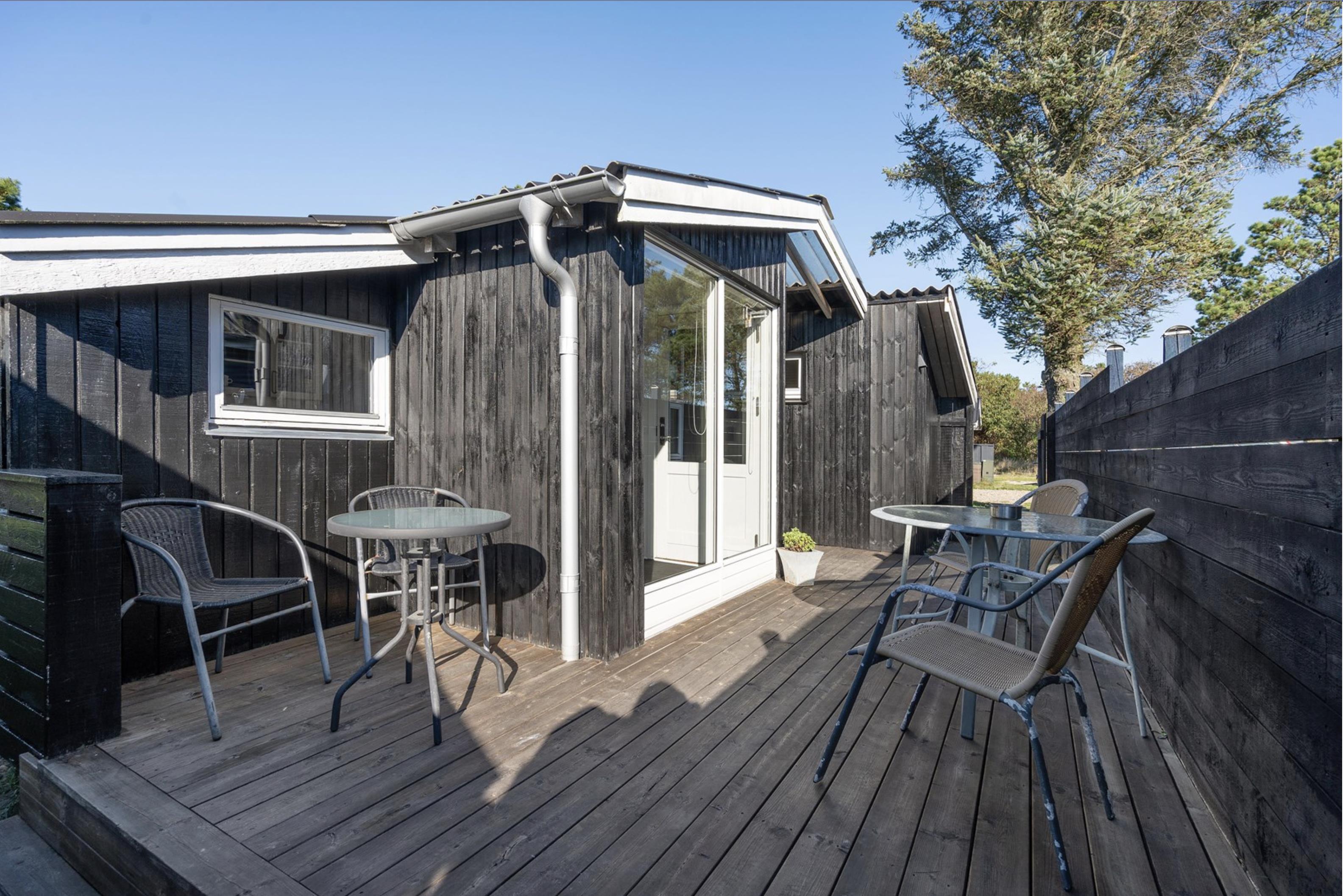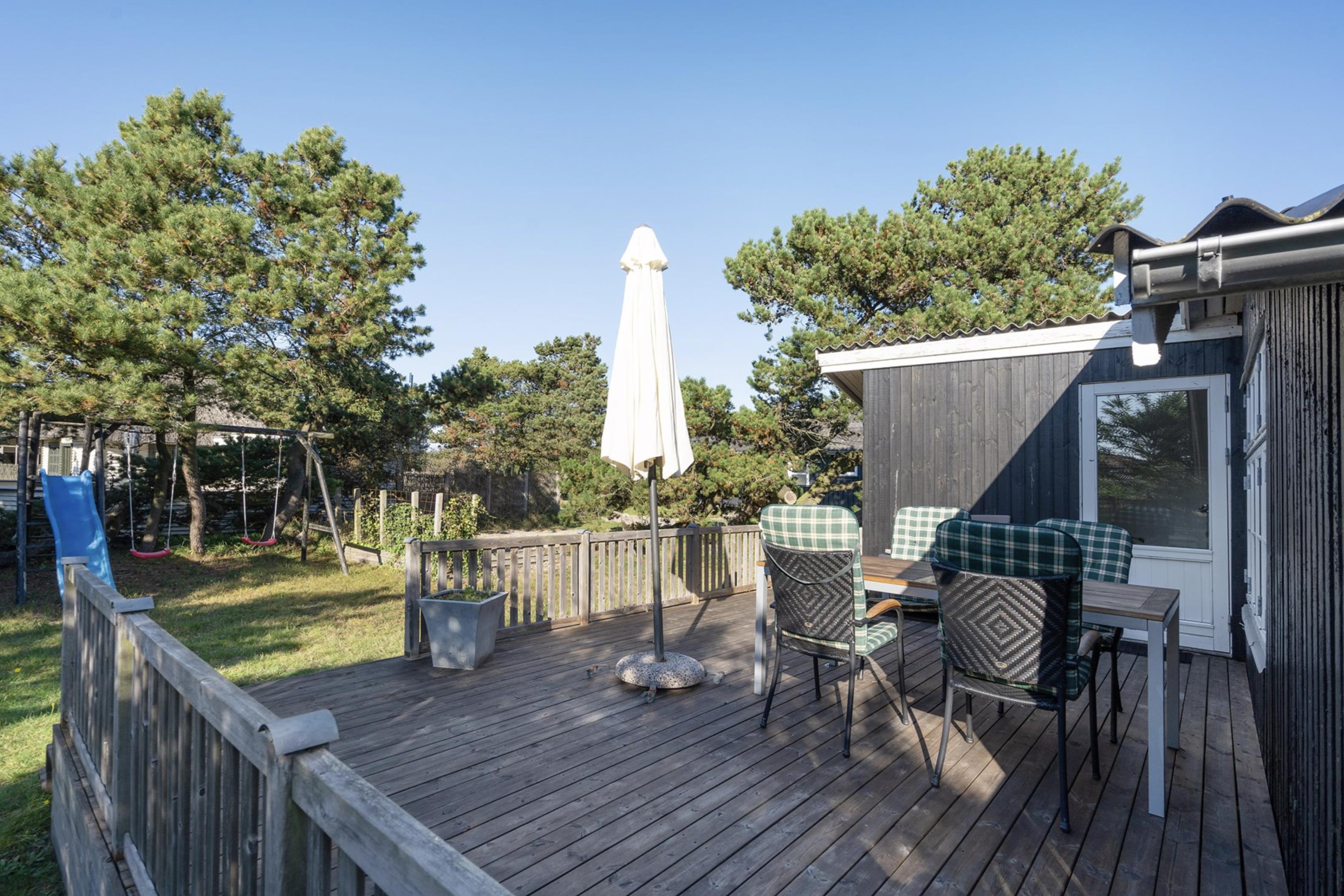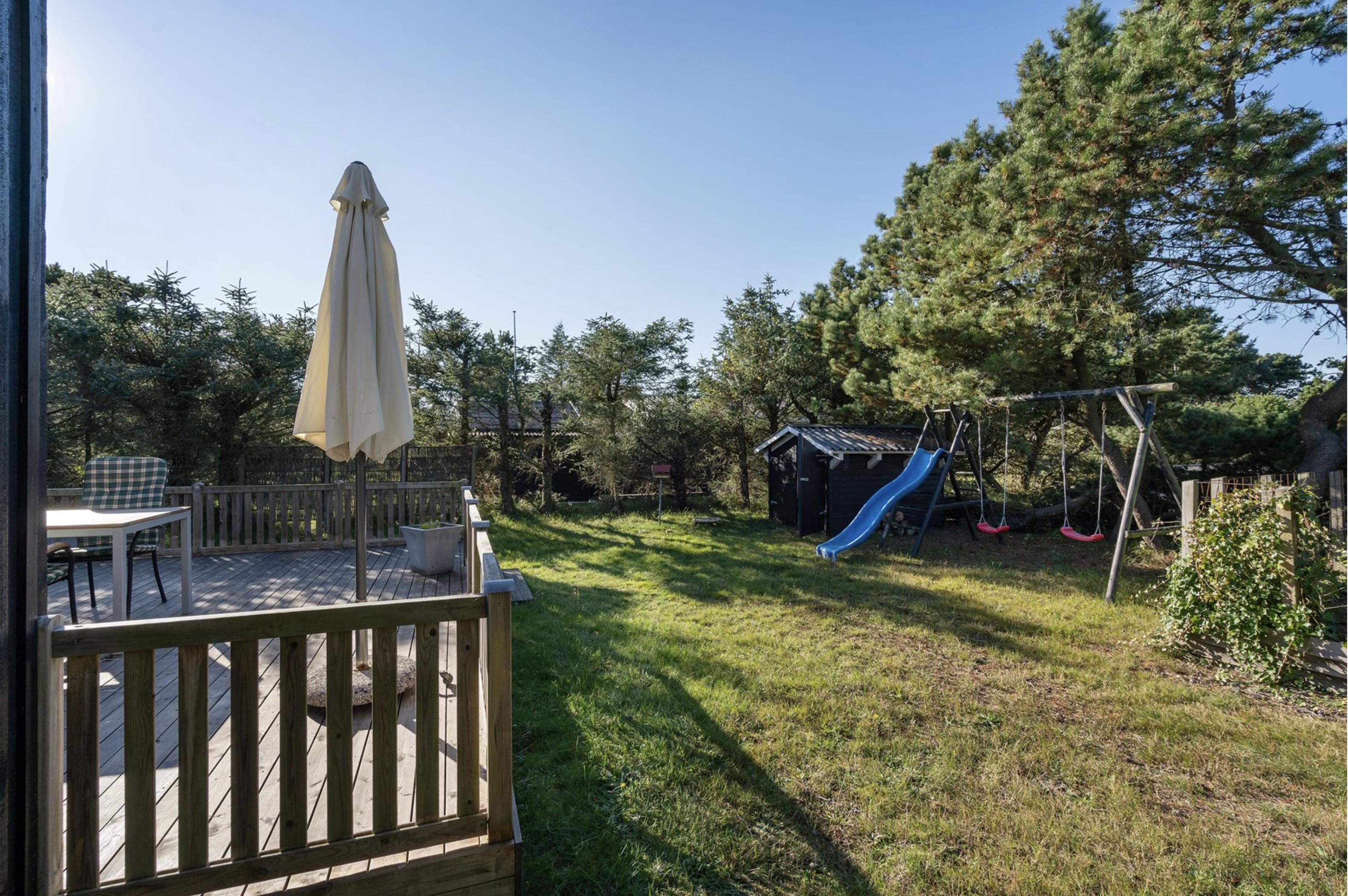 Fra stuen er der mulighed for at træde ud på den skønne sydvendte terrasse, hvor I om morgenen kan starte jeres feriedage med nybagte rundstykker og friskbrygget kaffe. Mens dagen går, kan I flytte til de komfortable havestole, der står til rådighed på de andre terrasser rundt omkring dette skønne sommerhus. Og imens de voksne nyder den friske (hav)luft fra terrassen, kan de små hygge sig med gyngerne, rutsjebanen og sandkassen, der er placeret i den ene ende af sommerhusets naturgrund.