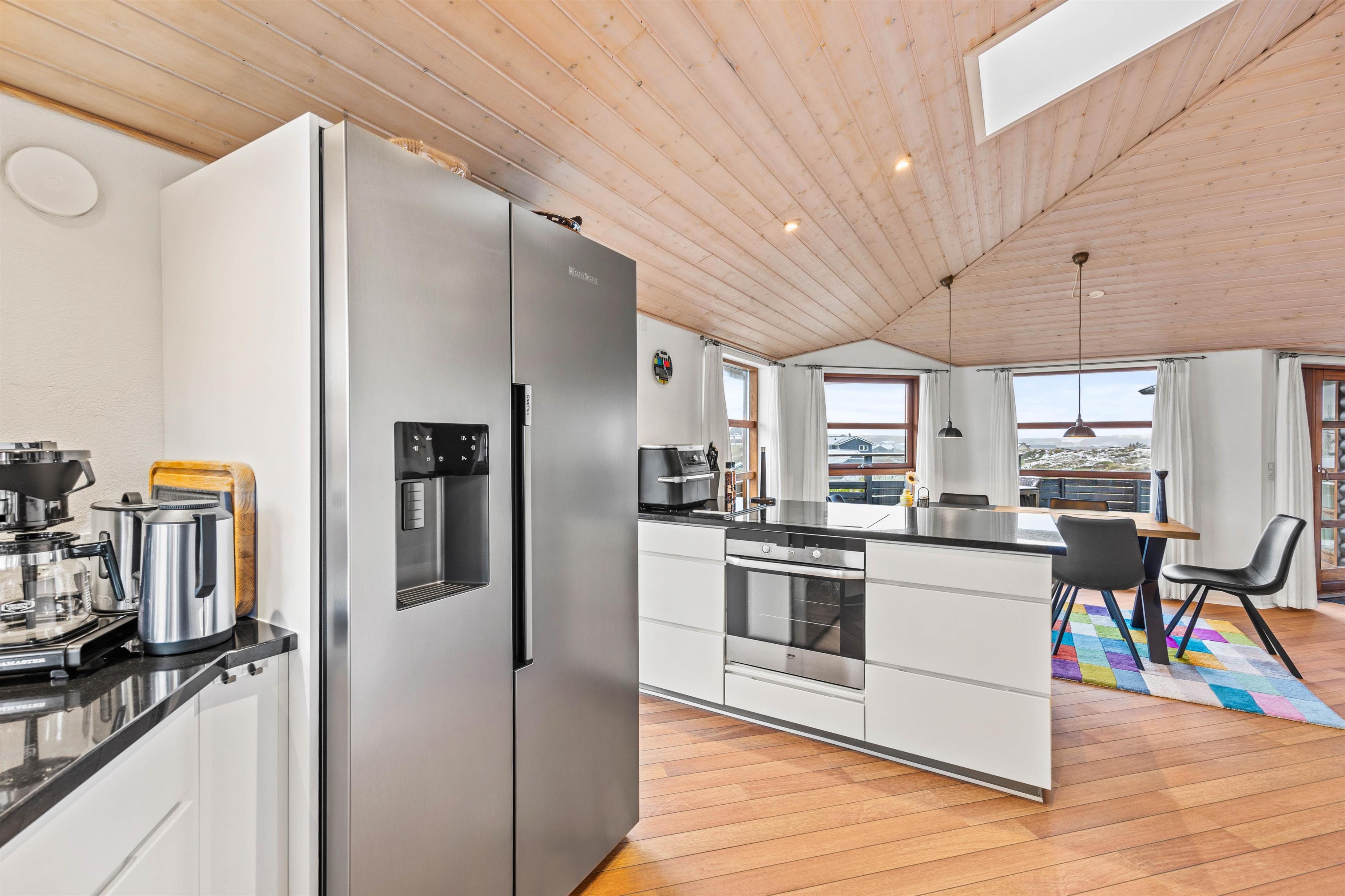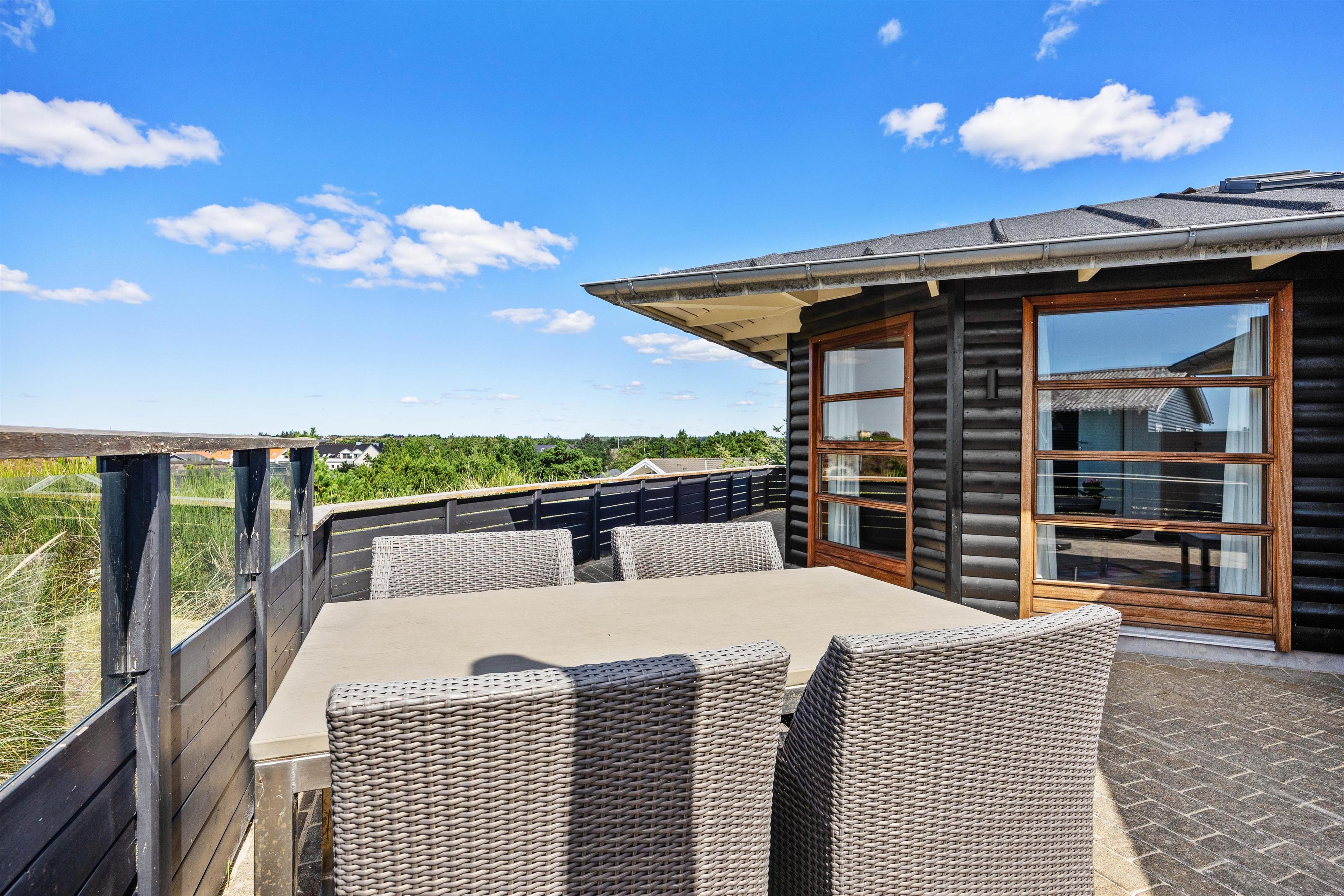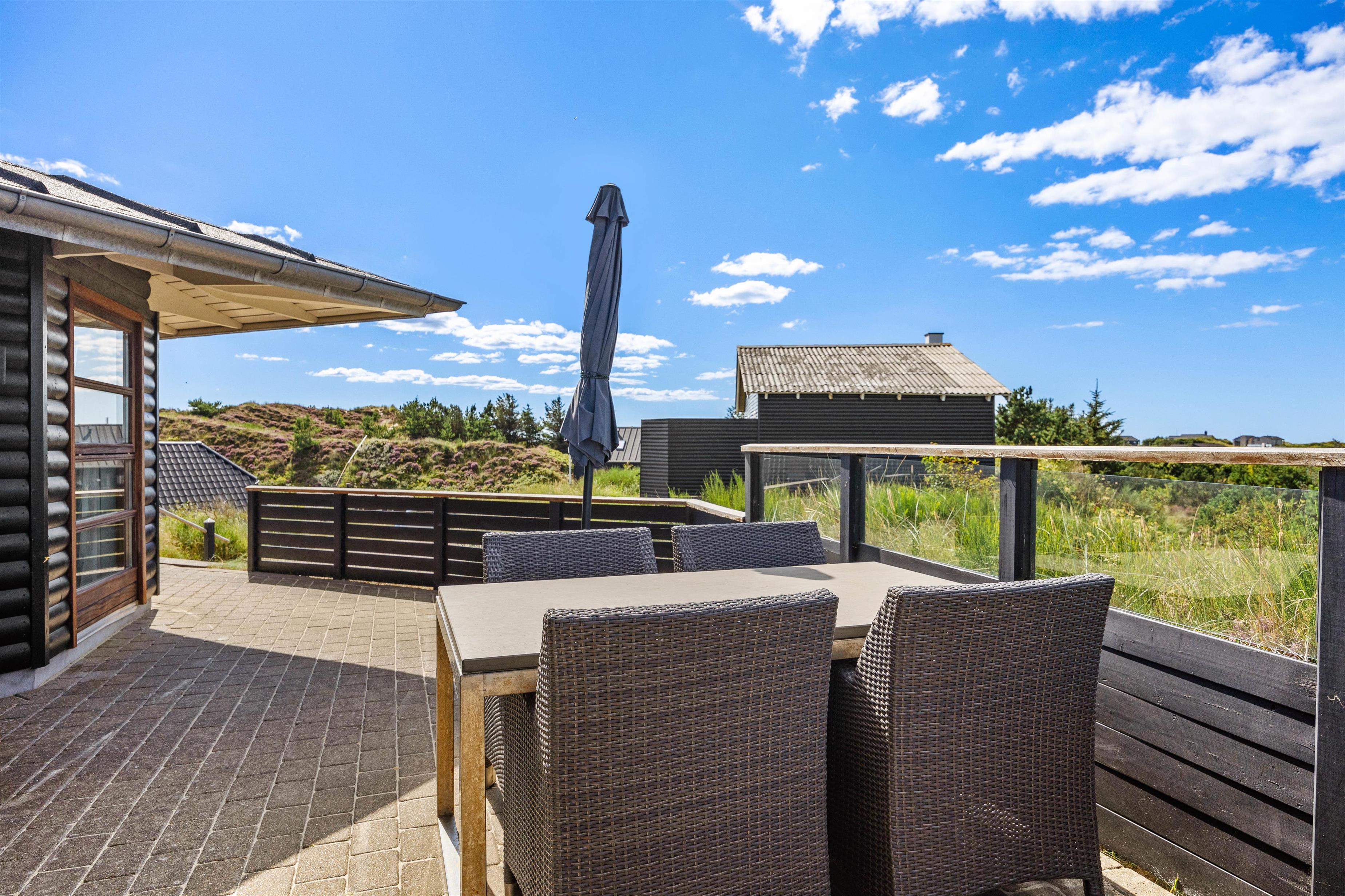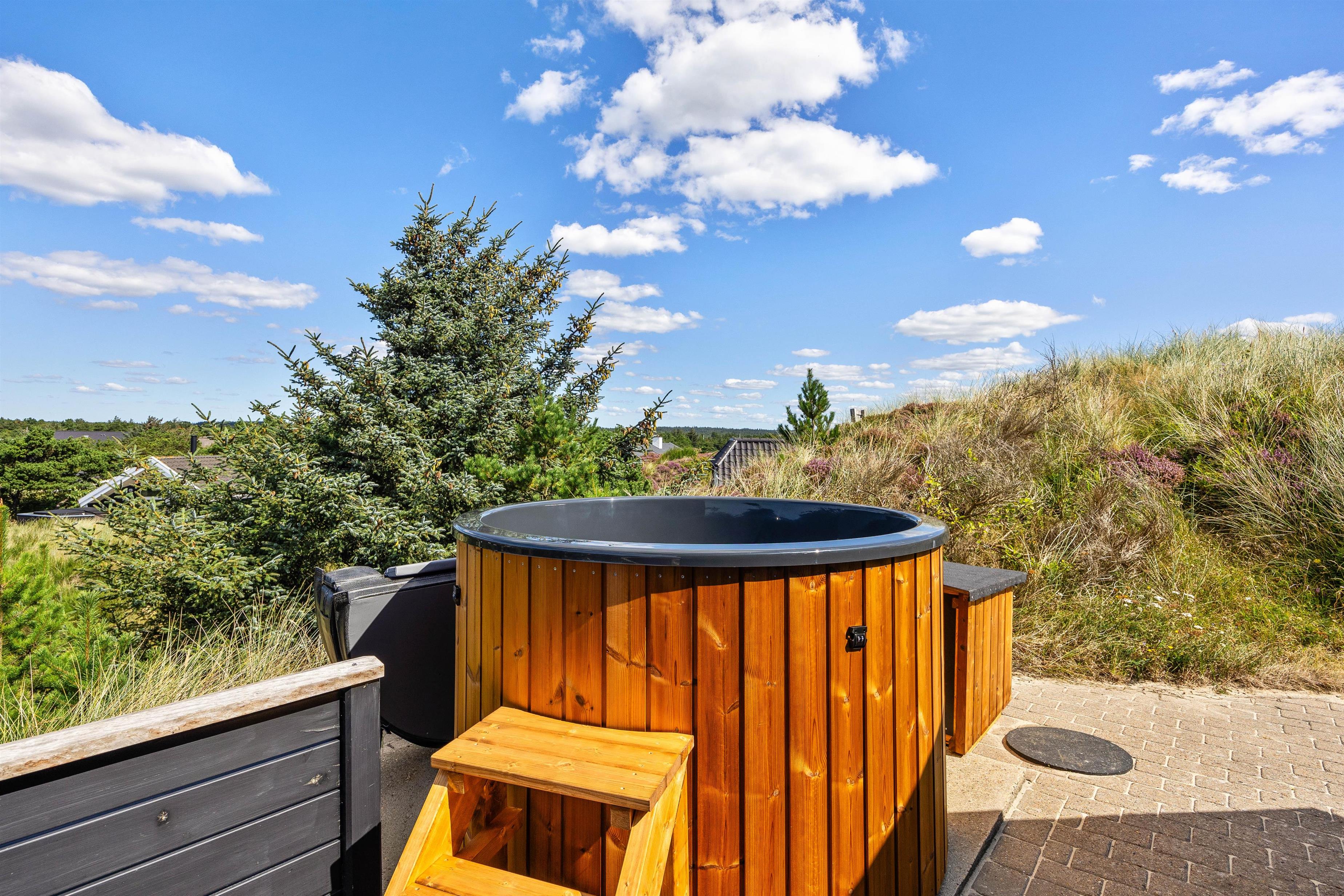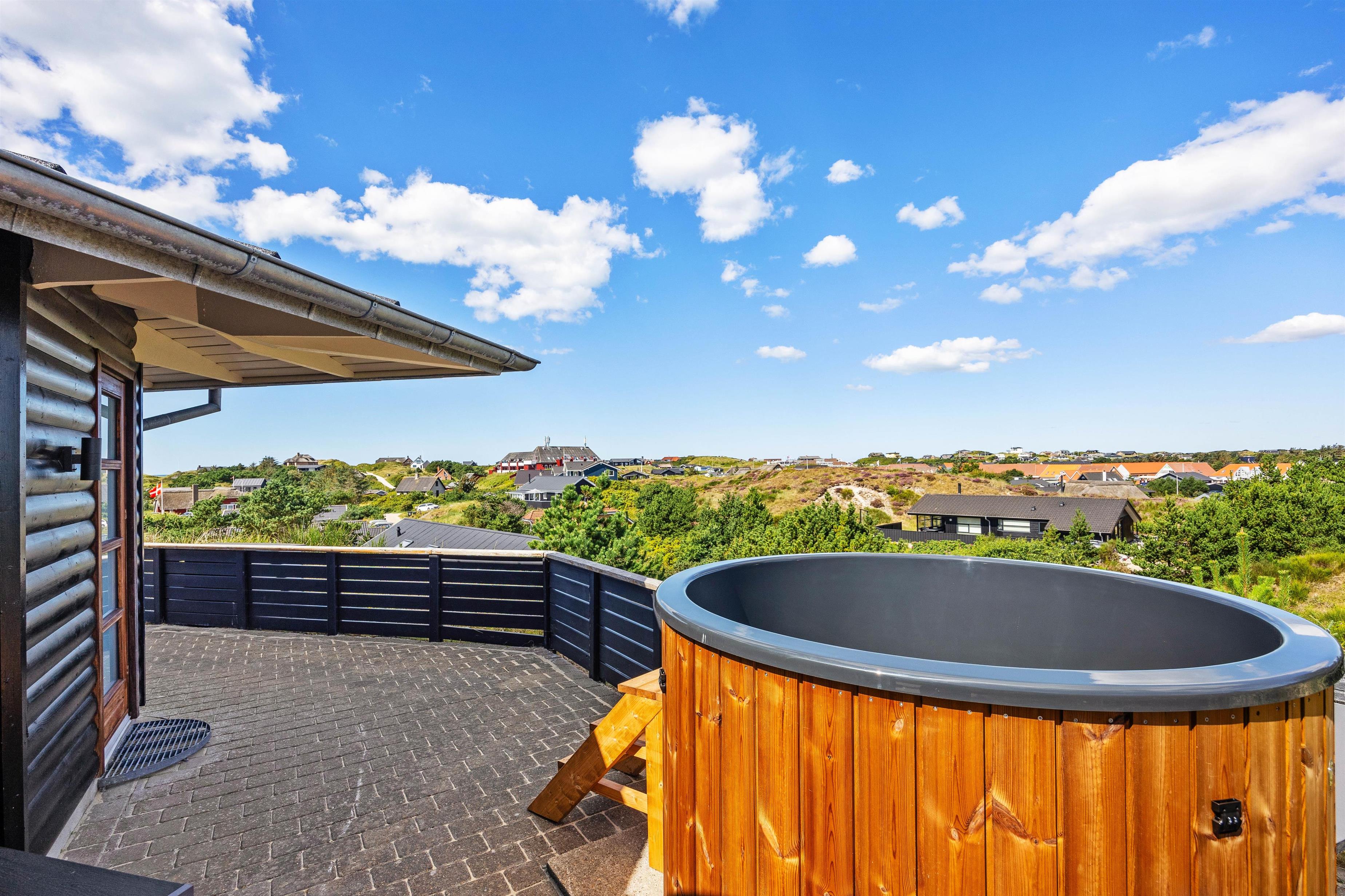 Fra sommerhuset kan I nyde den spektakulære panoramaudsigt over klitgrunden og havet – enten fra de skønne vinduer, som også lukker det skønne og naturlige dagslys ind – eller fra terrasserne i de komfortable havemøbler, der er placeret flere steder rundt om sommerhuset: her kan I nemt finde en solrig plet eller et sted i læ, mens I nyder afslappede stunder med morgenkaffen eller en god bog, og bølgerne fra havet kan høres i det fjerne. Et af feriehusets absolutte highlights er vildmarksbadet, som indbyder til masser af afslapning.