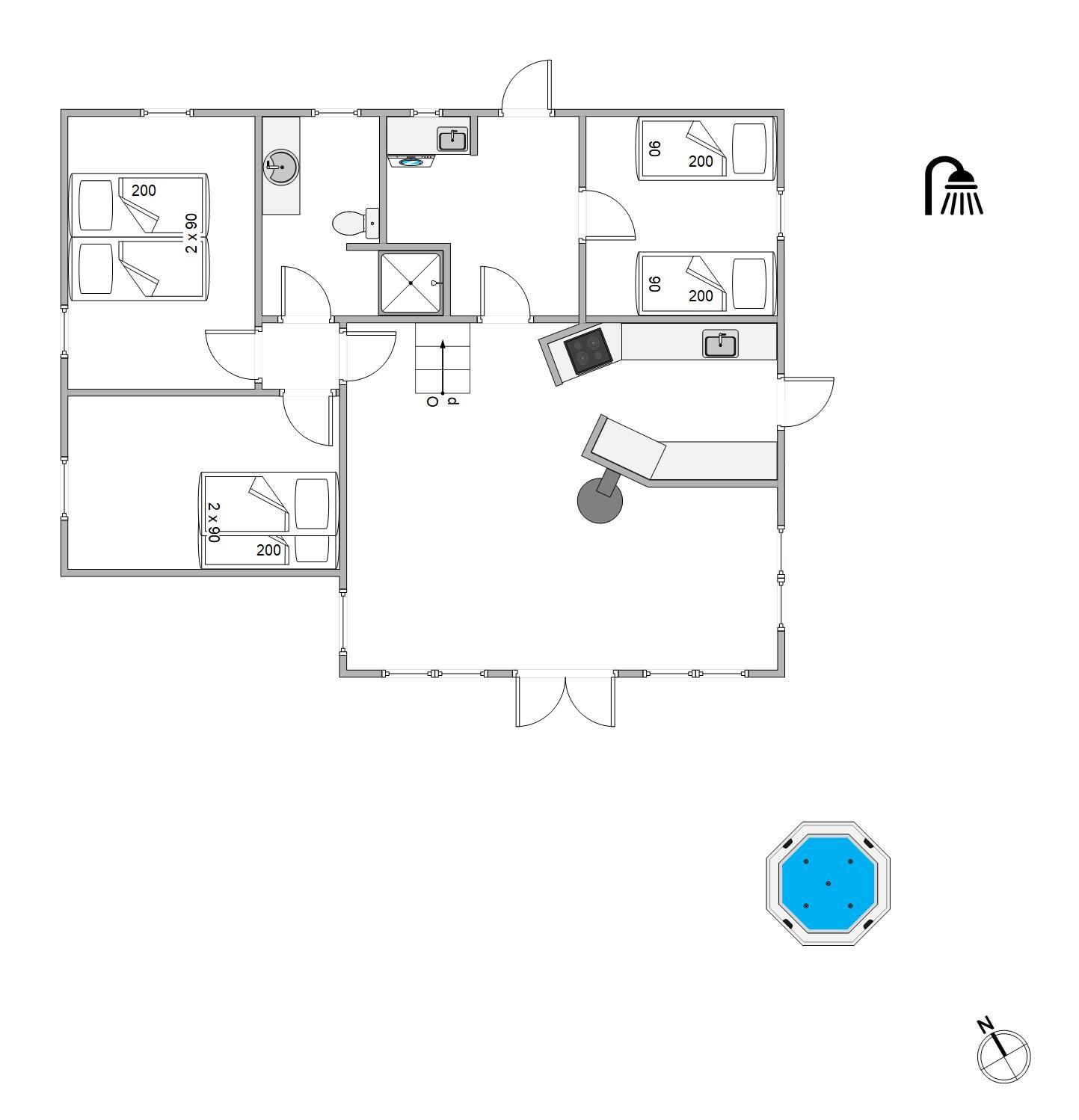 Sommerhuset har, både ude og inde, den gennemførte stil og træet kommer virkelig til sin ret. De mørke træstammer skaber en hyggelig atmosfære, hvor I får lyst til at putte jer i sofaen med en god bog. Stue og køkken er forbundet, og her får I helt sikkert nogle skønne stunder. I midten af rummet er den murede brændeovn, hvorfra varmen og hyggen breder sig. Tilbered en skøn simreret og glem ikke den gode rødvin. Udover brændeovnen er her også en energibesparende varmepumpe, som sørger for et behageligt indeklima.