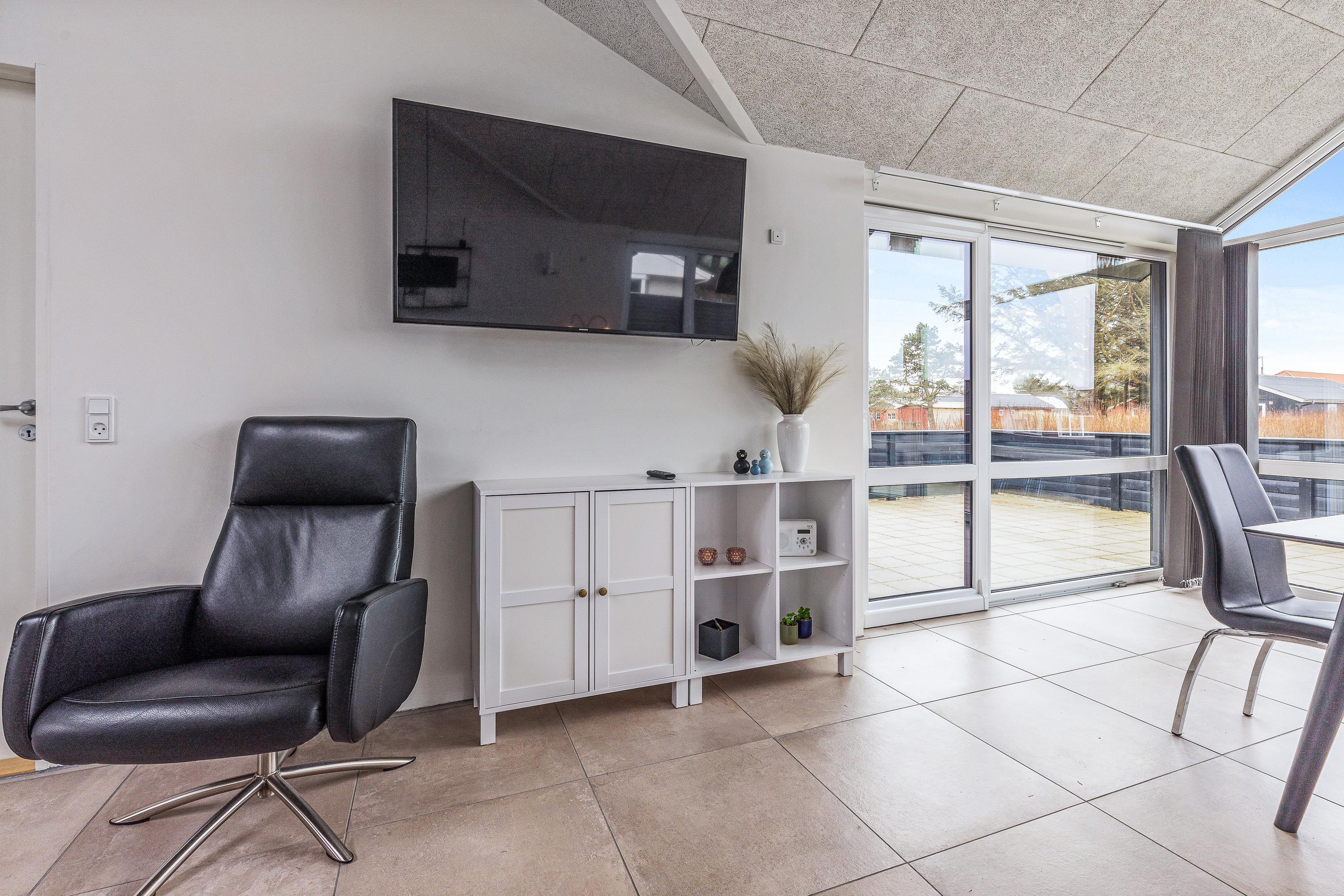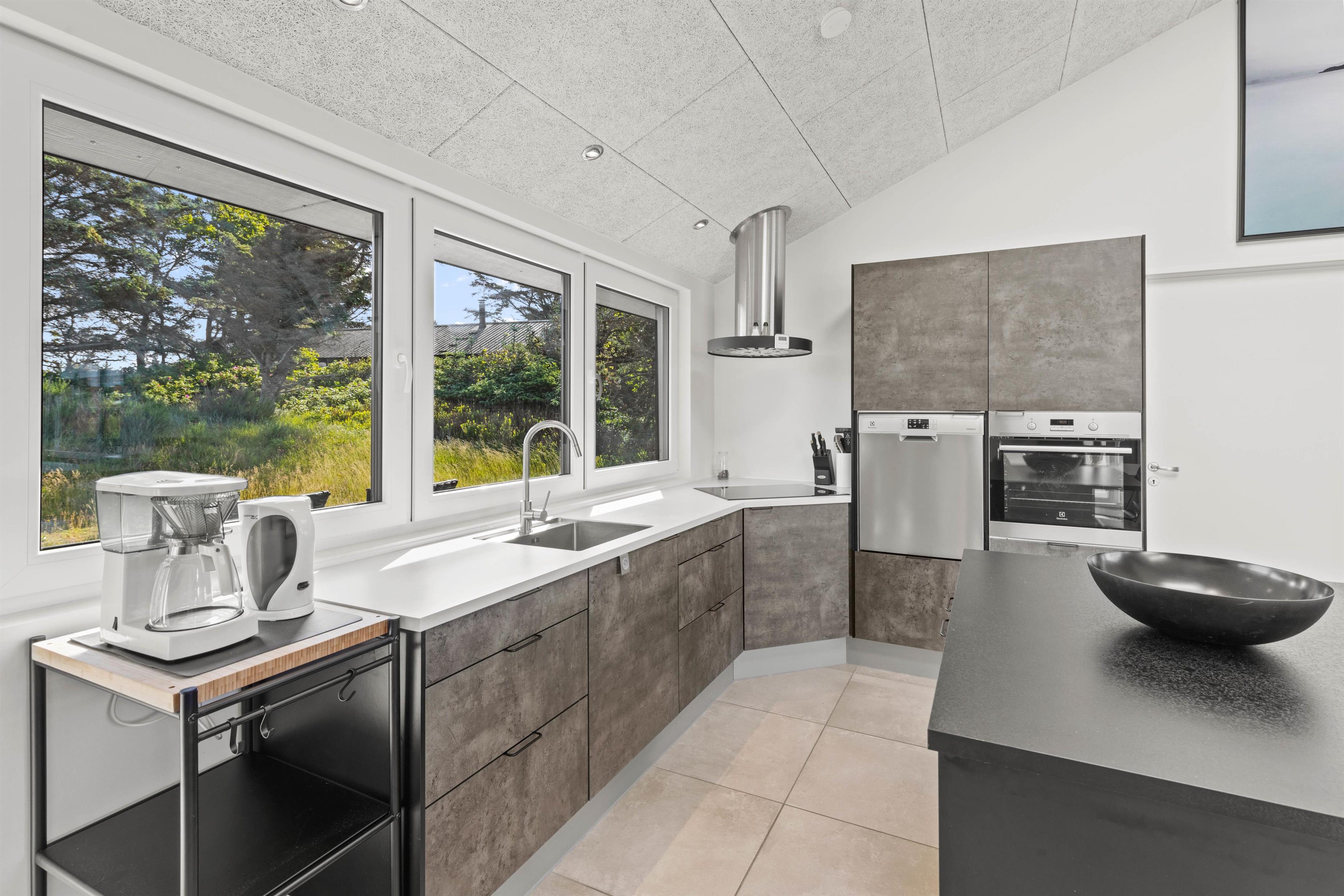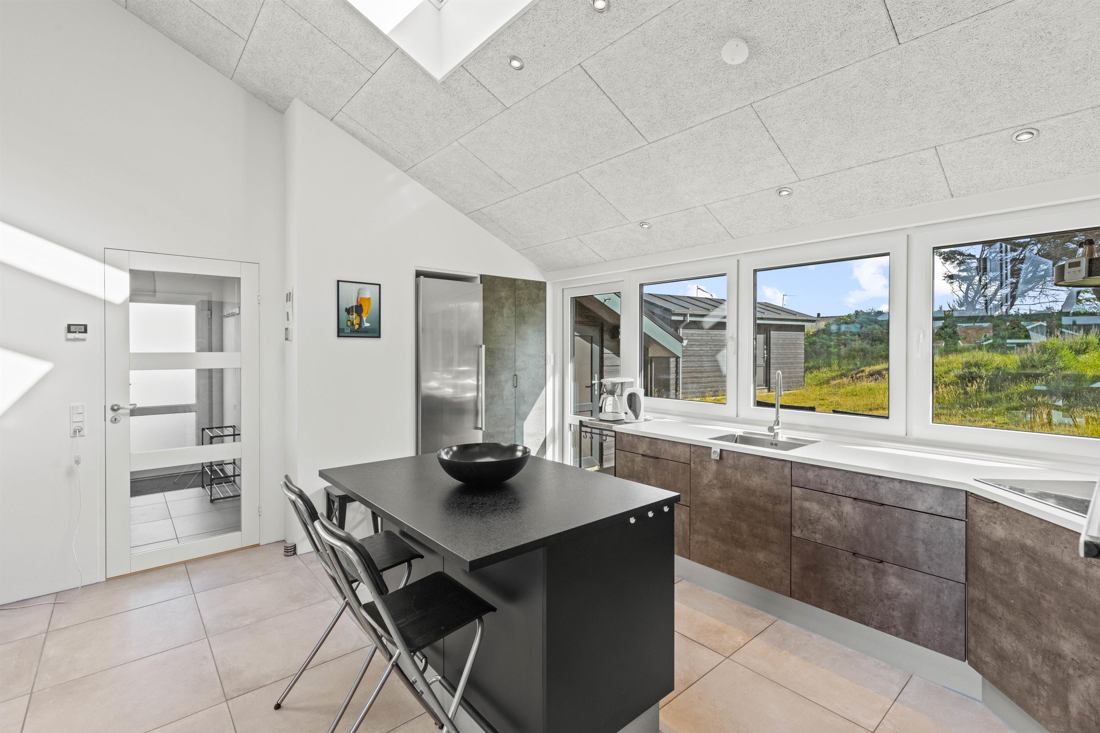 På Rylevej 16 bor I i skønne og bekvemme omgivelser. Sommerhuset er velindrettet med bekvemme møbler, mørke fliser og elementer, som er fint afstemt til de lyse vægge og store vinduespartier, der giver masser af lysindfald.