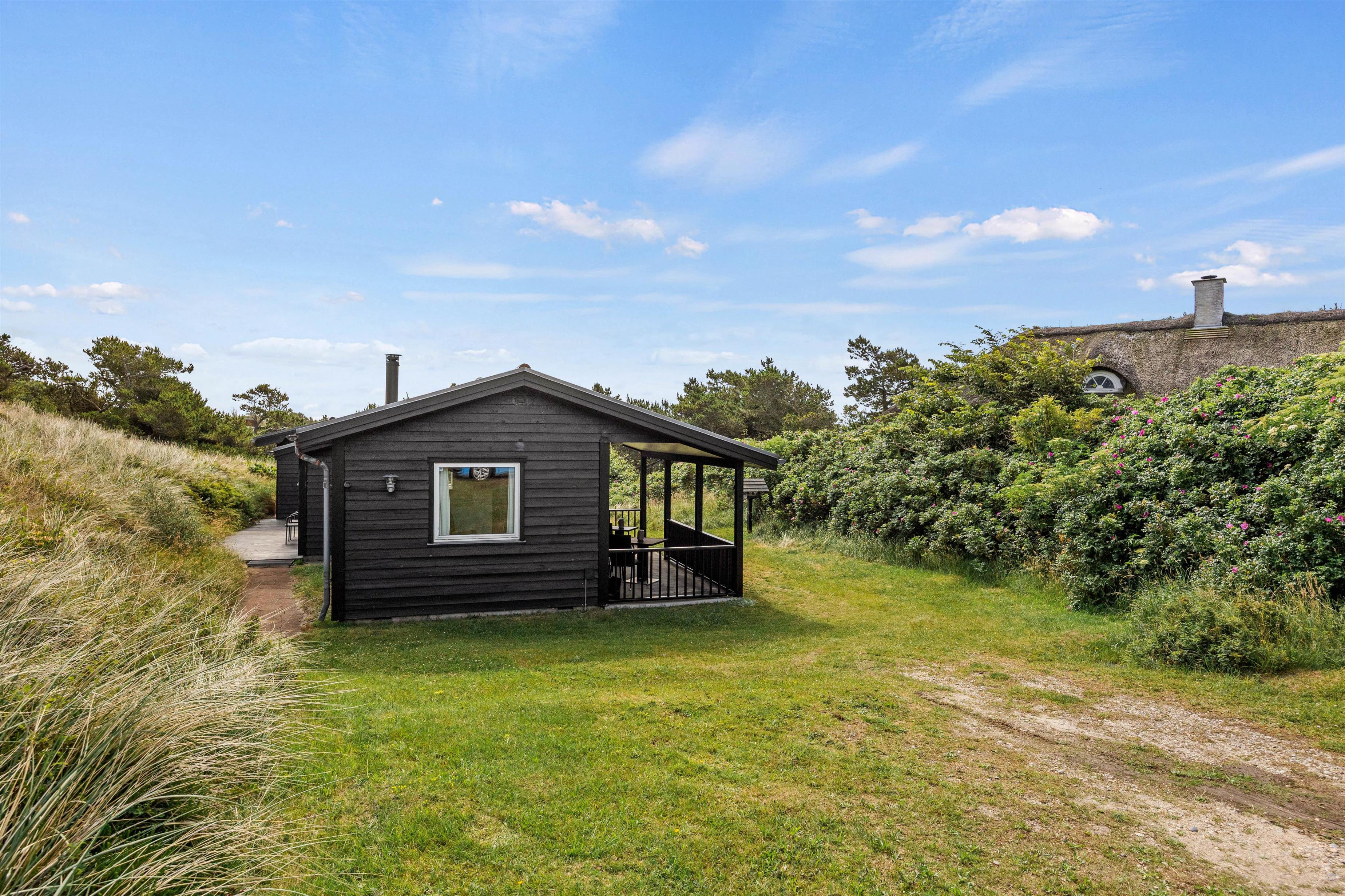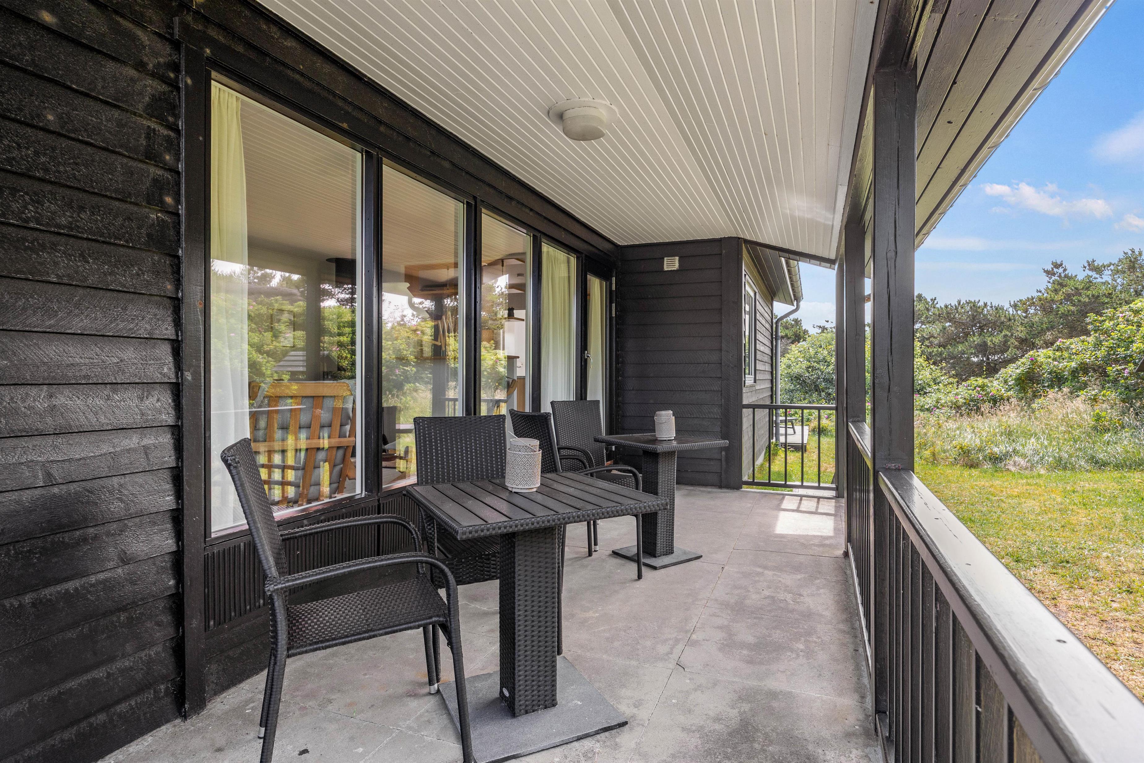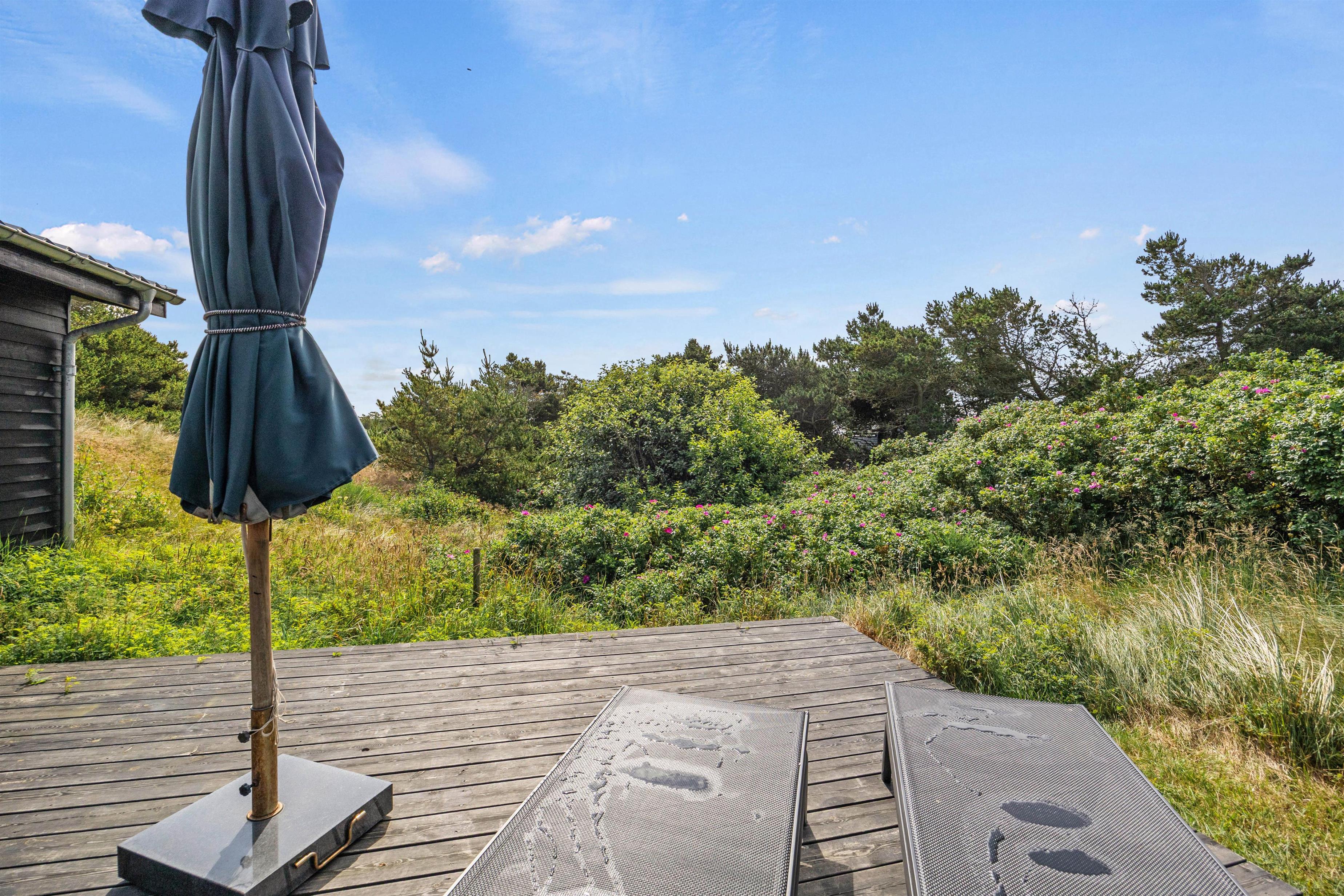 Udenfor inviterer den åbne såvel som den overdækkede terrasse til mange skønne grillaftener, hvor I kan nyde sommerens varme i fulde drag. Med havemøbler til rådighed kan I sidde og nyde morgenkaffen, mens I kigger ud over klitgrunden.