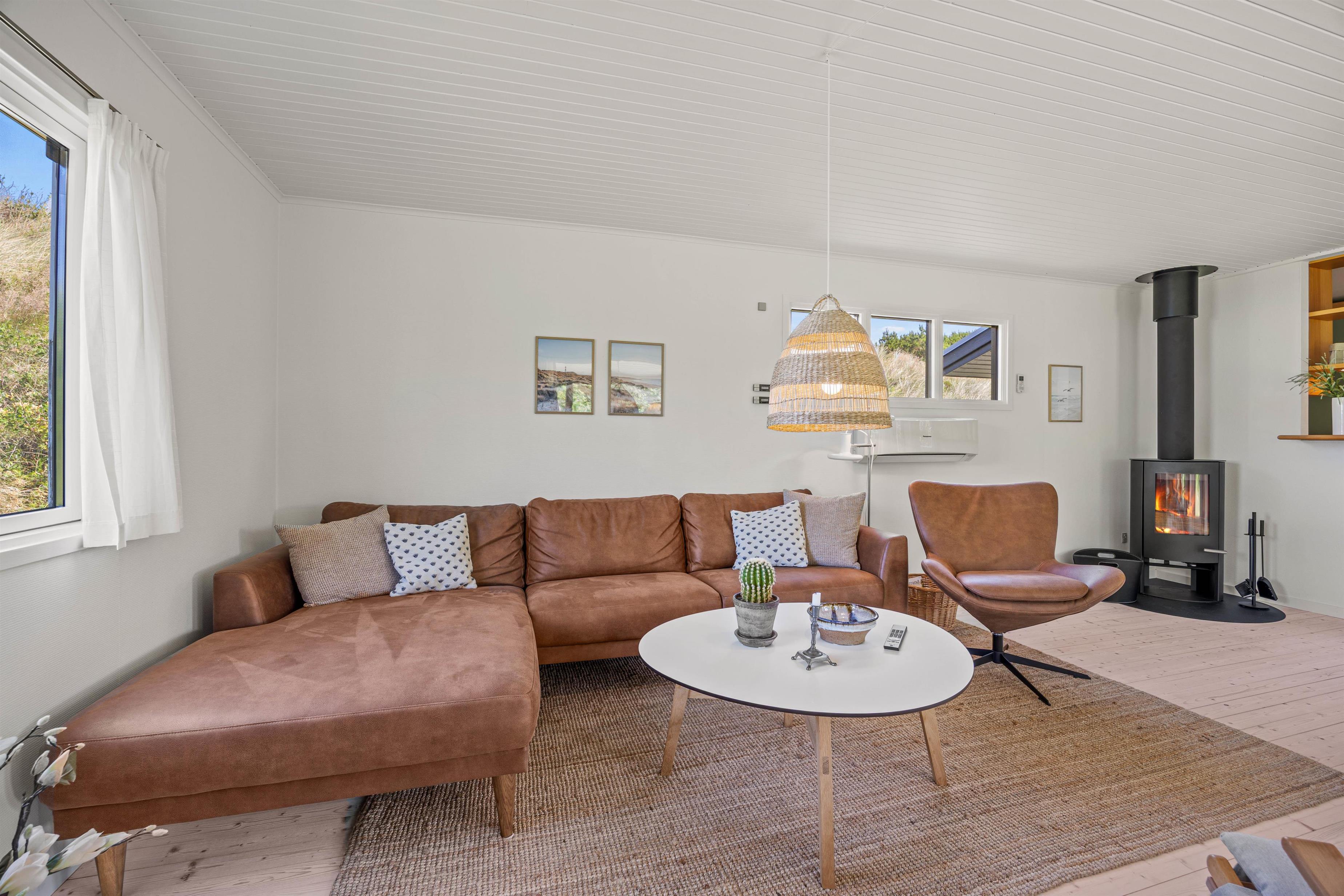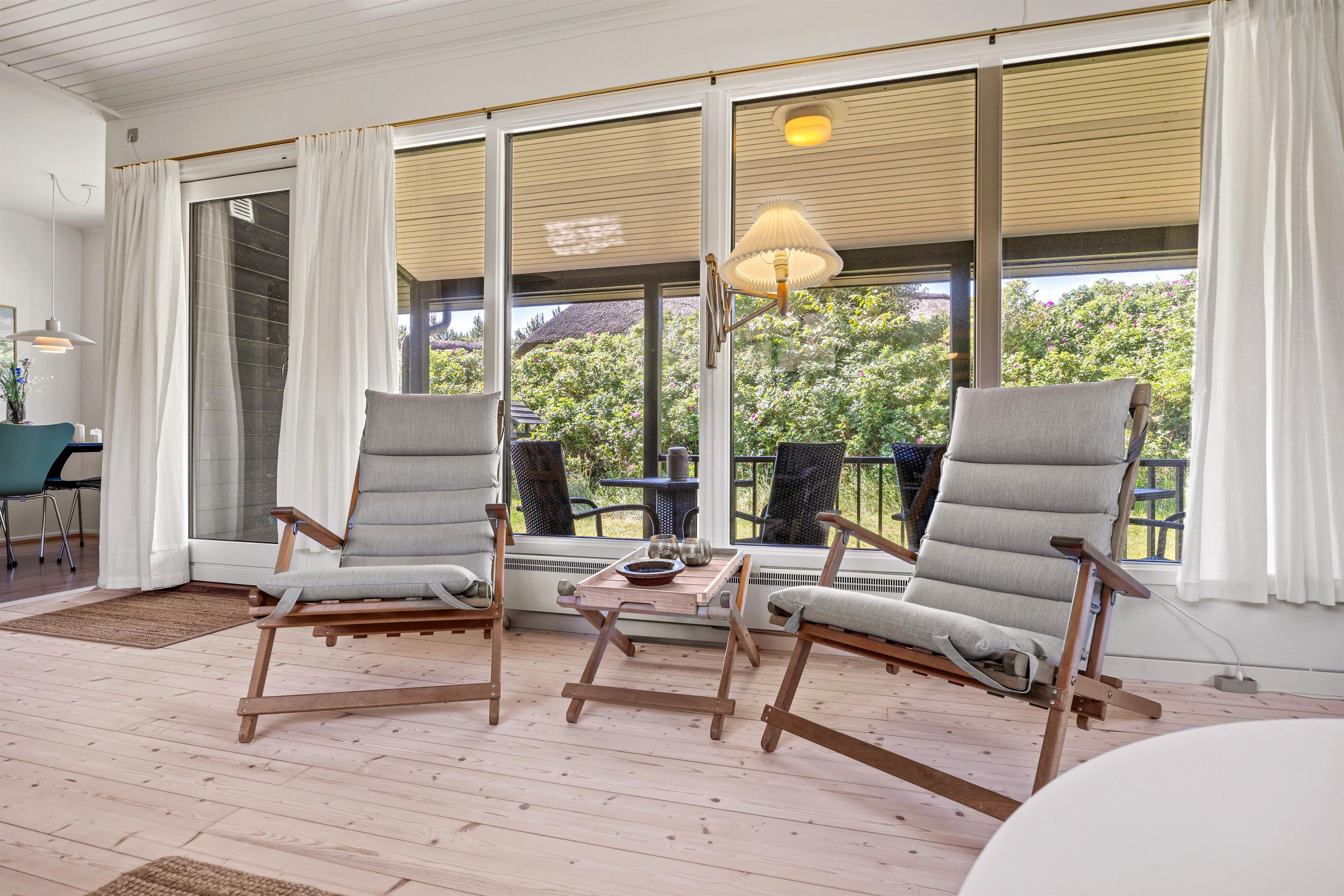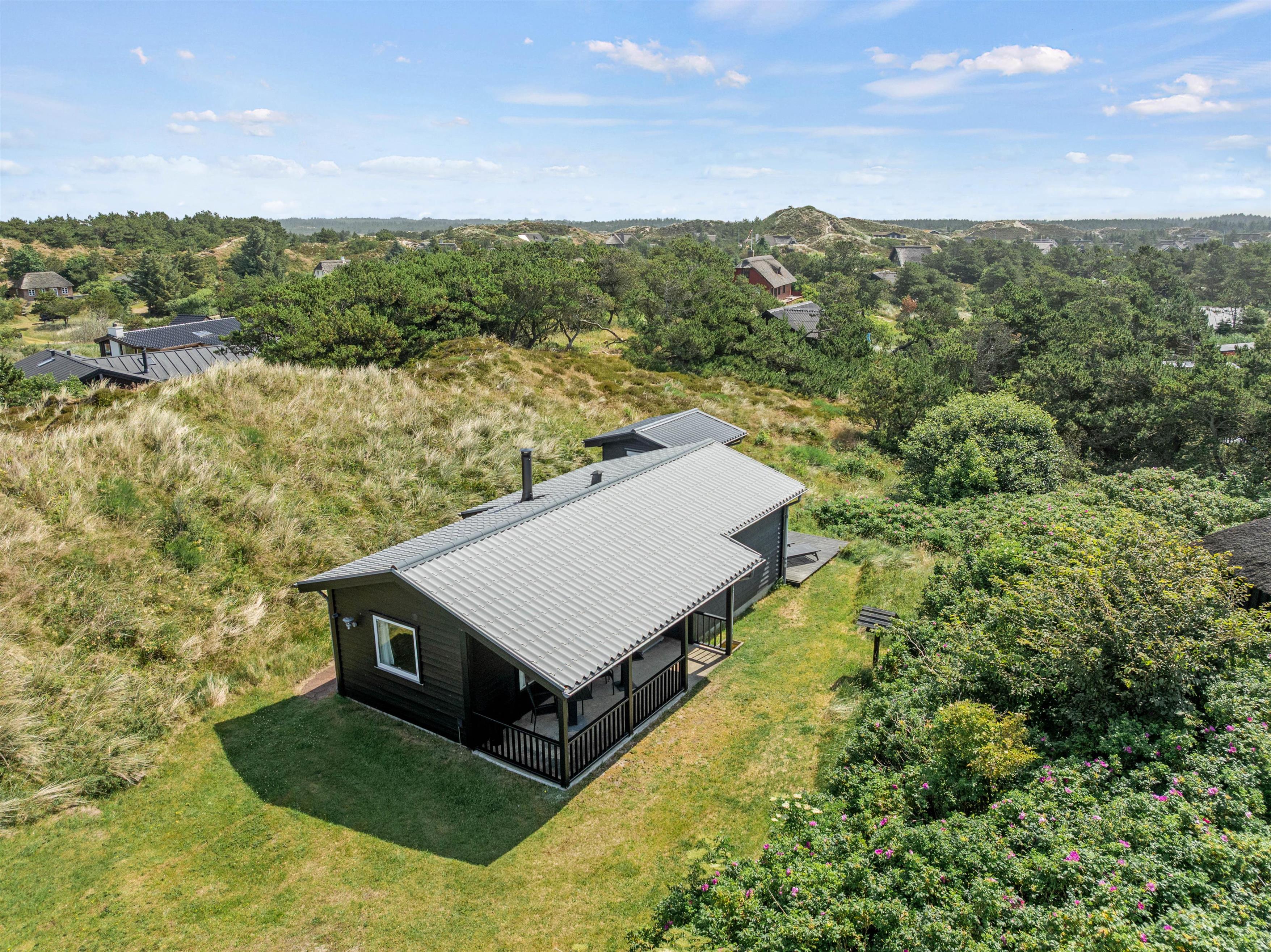 Udenfor inviterer den åbne såvel som den overdækkede terrasse til mange skønne grillaftener, hvor I kan nyde sommerens varme i fulde drag. Med havemøbler til rådighed kan I sidde og nyde morgenkaffen, mens I kigger ud over klitgrunden.