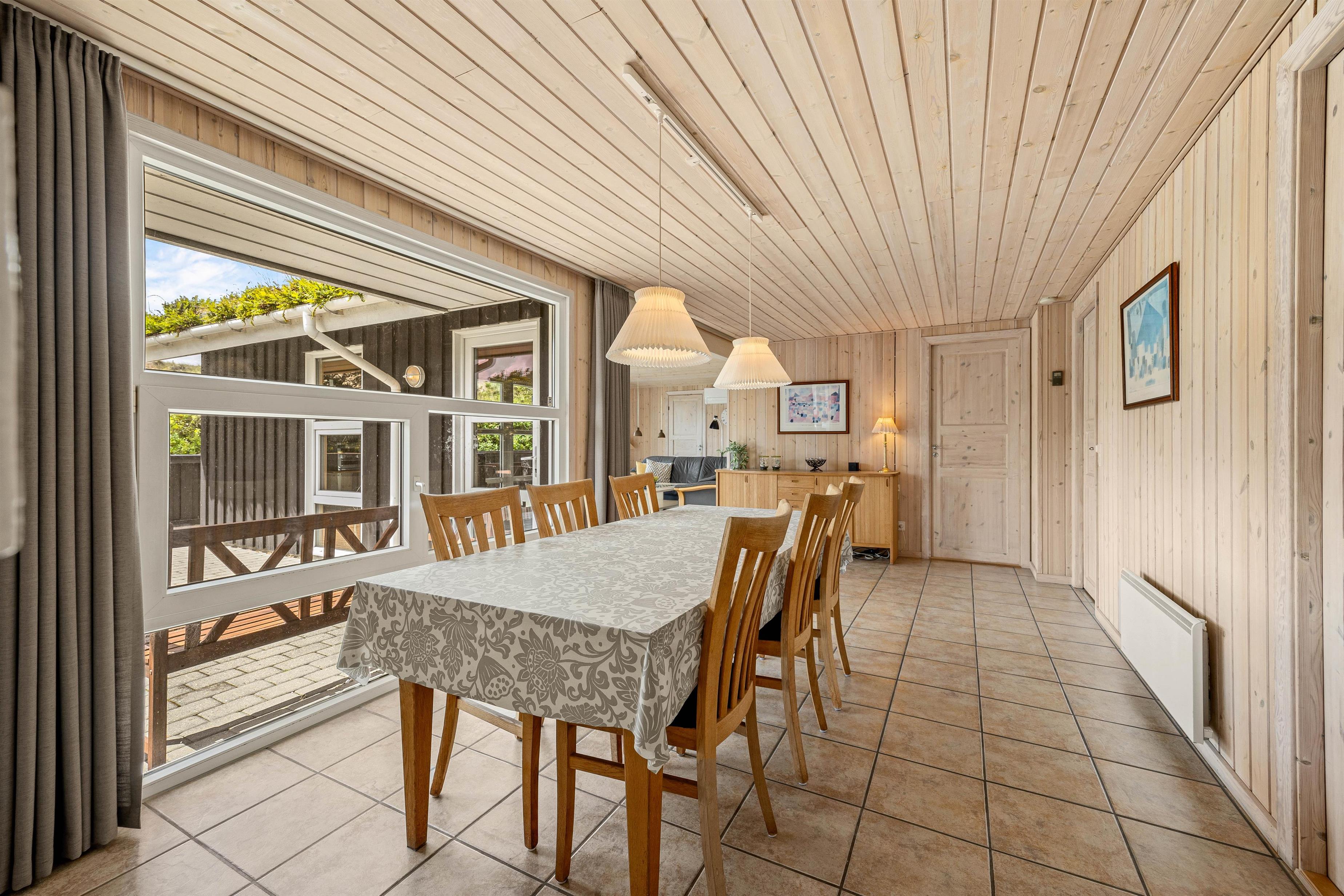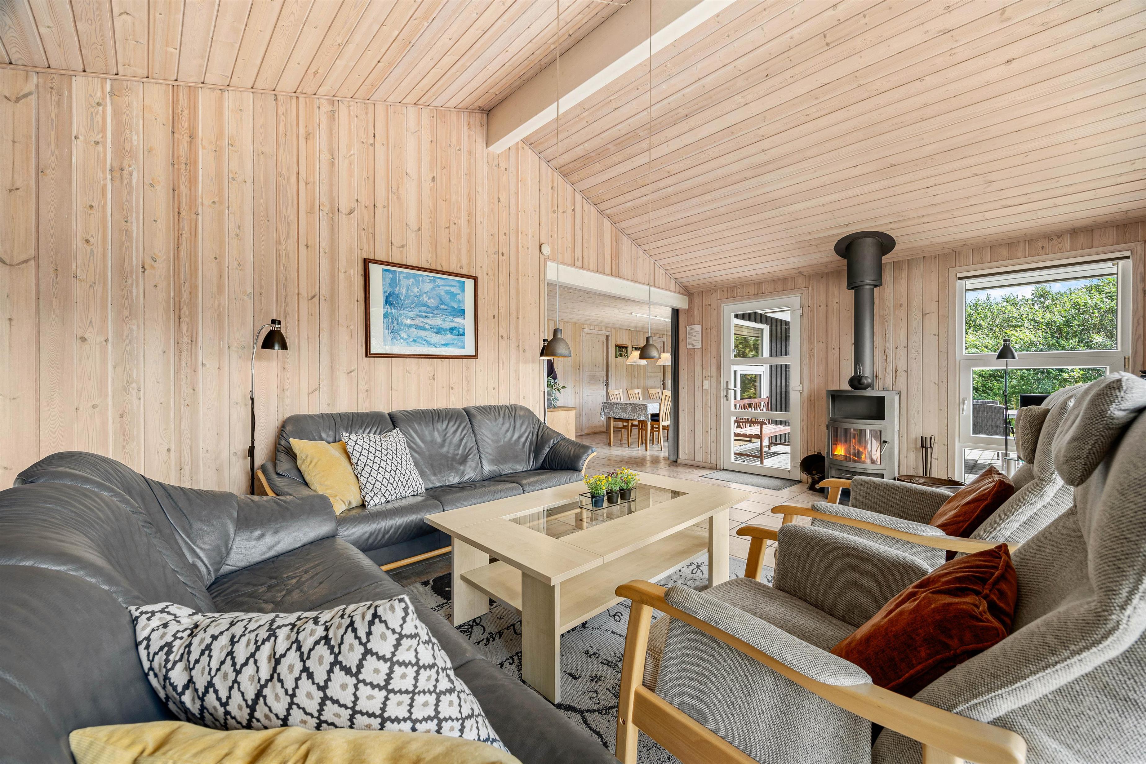 Når I har parkeret bilen foran det træbeklædte feriehus, træder I indenfor i et lyst og venligt sommerhus. Her skaber de gode vinduer, træpanelerne og stue/køkken den rette feriestemning, hvor I hurtigt kan forestille jer at familien er samlet. Her er god plads til familielivet – både om I skal lave dejlige retter, spille brætspil eller helt tredje. Praktisk er her en energivenlig varmepumpe, gulvvarme samt en brændeovn, der spreder varme og hygge i hjemmet.