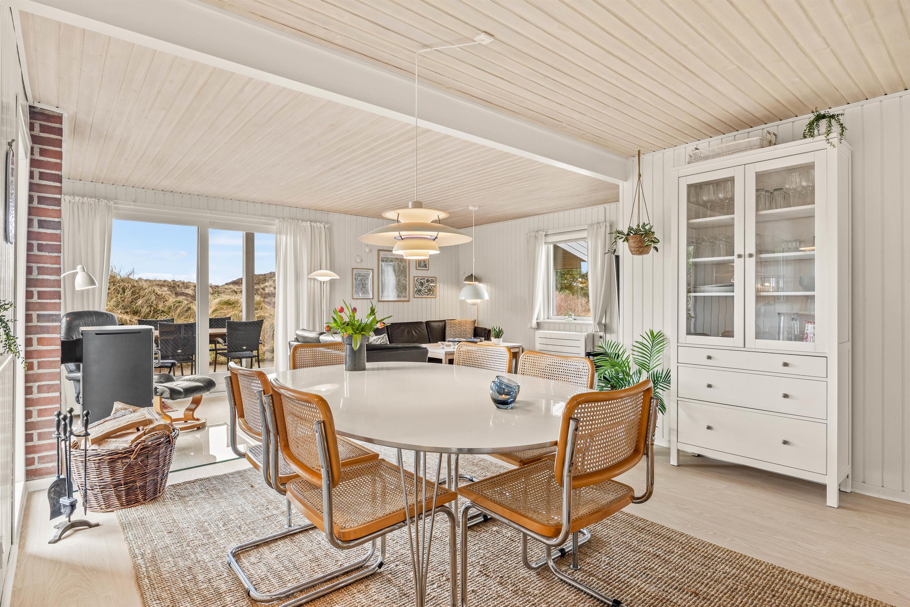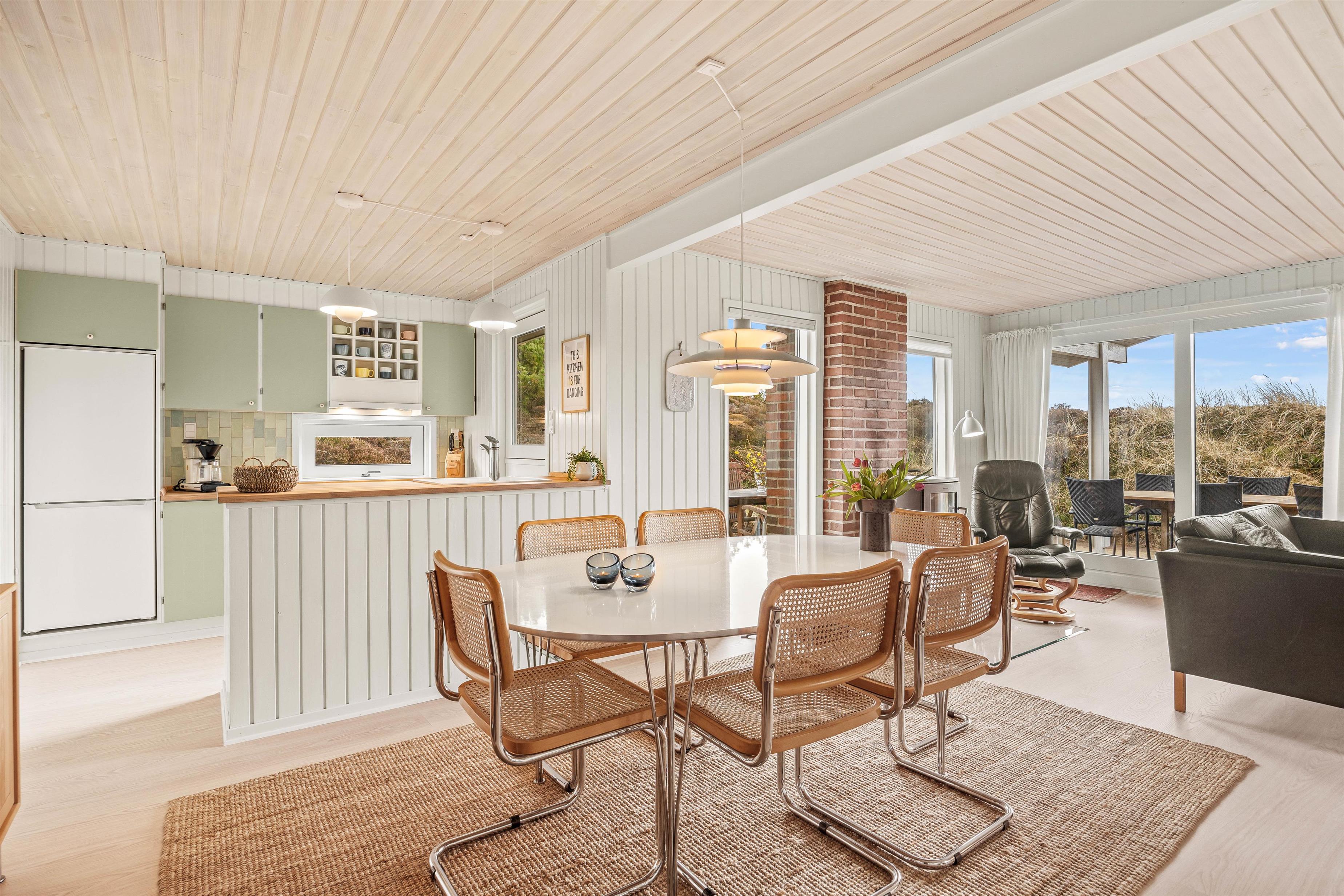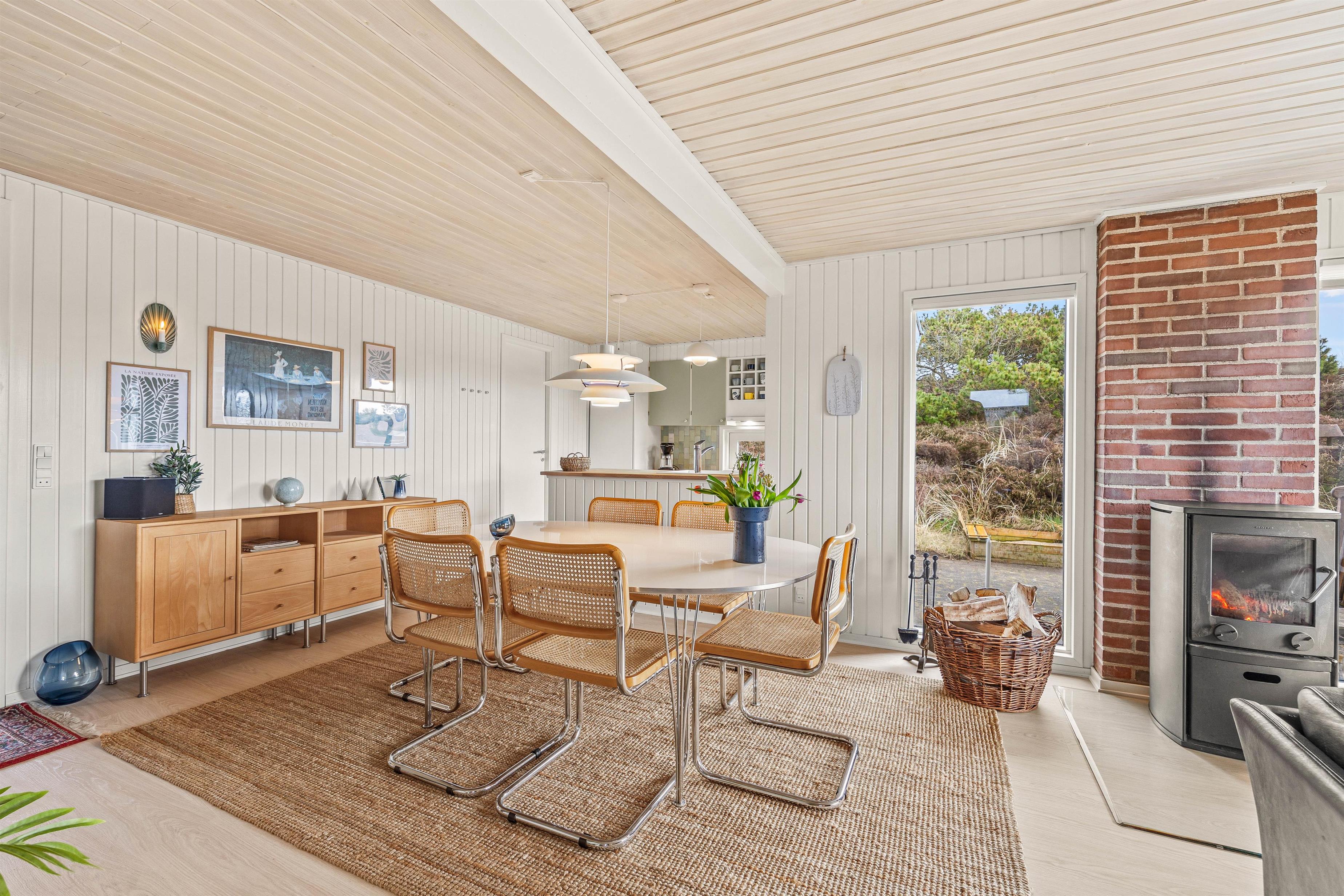 Den hyggelige spise- og opholdsstue med integreret køkken fungerer som husets hjerte og bliver udgangspunkt for masser af skønne ferieminder med sene aftener på sofaen, hjemmelavede feriemåltider og underholdende kortspil foran den knitrende brændeovn.